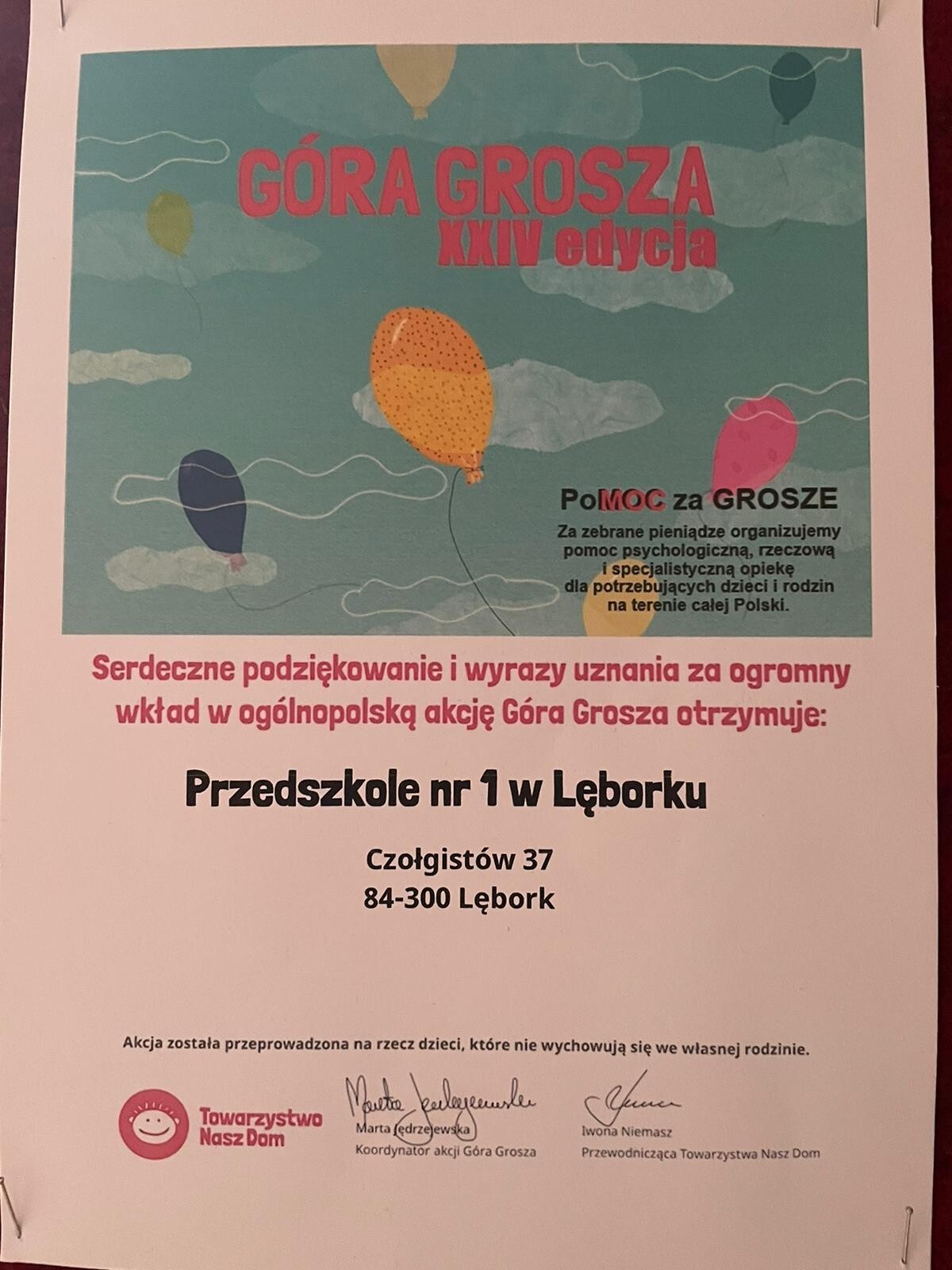 W naszym przedszkolu prowadzona była akcja "GÓRA GROSZA", której głównym organizatorem akcji było TOWARZYSTWO "NASZ DOM".