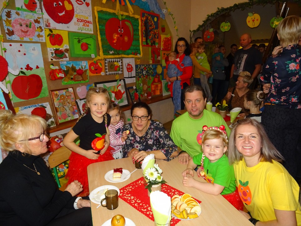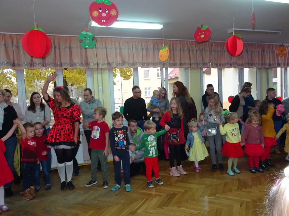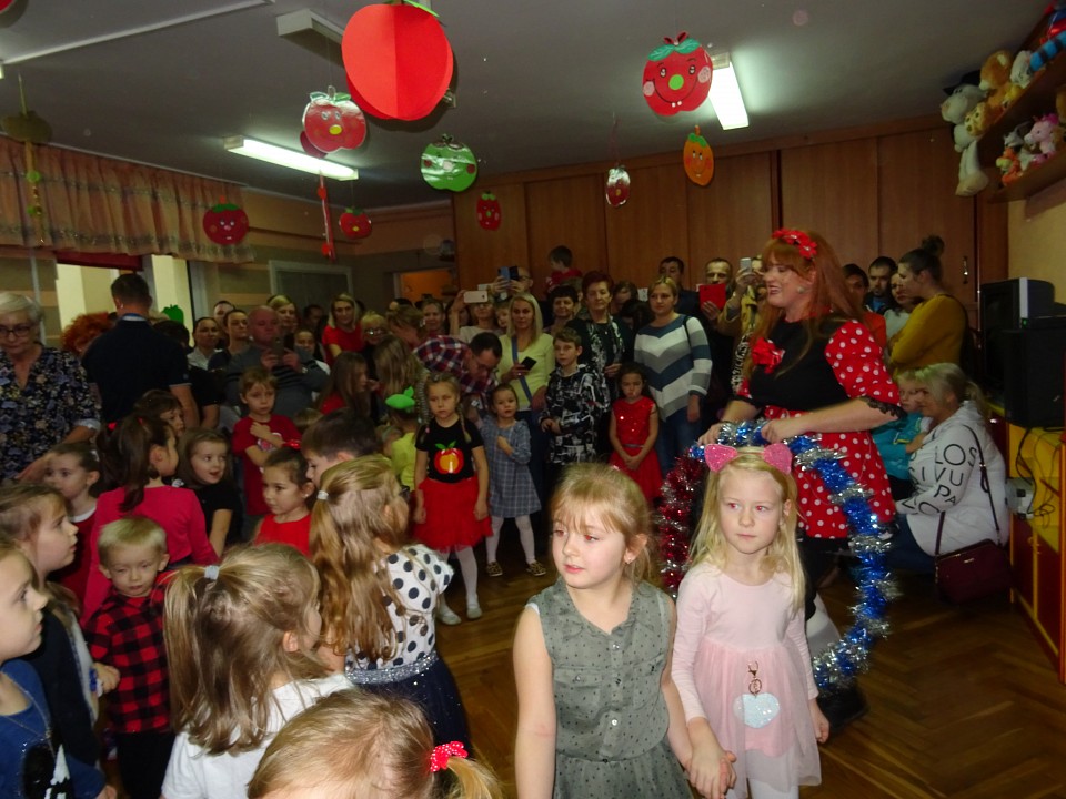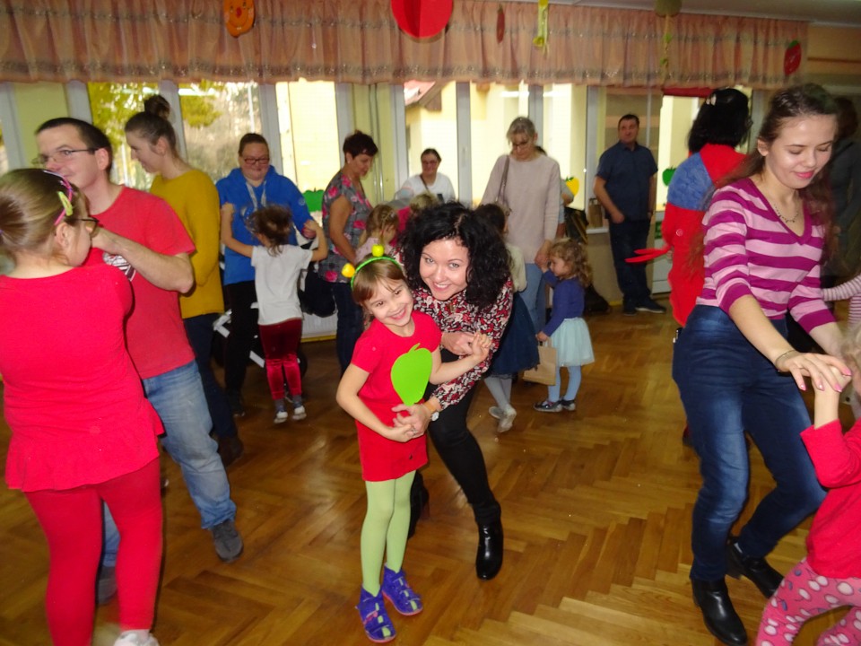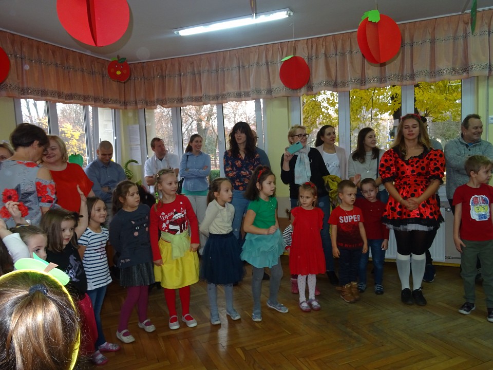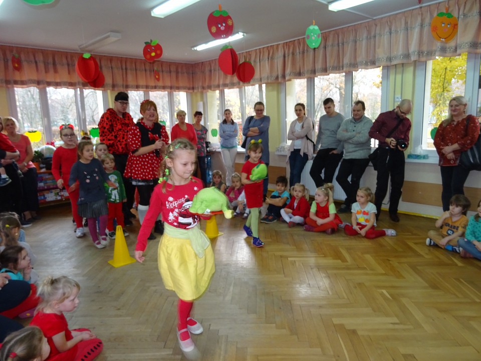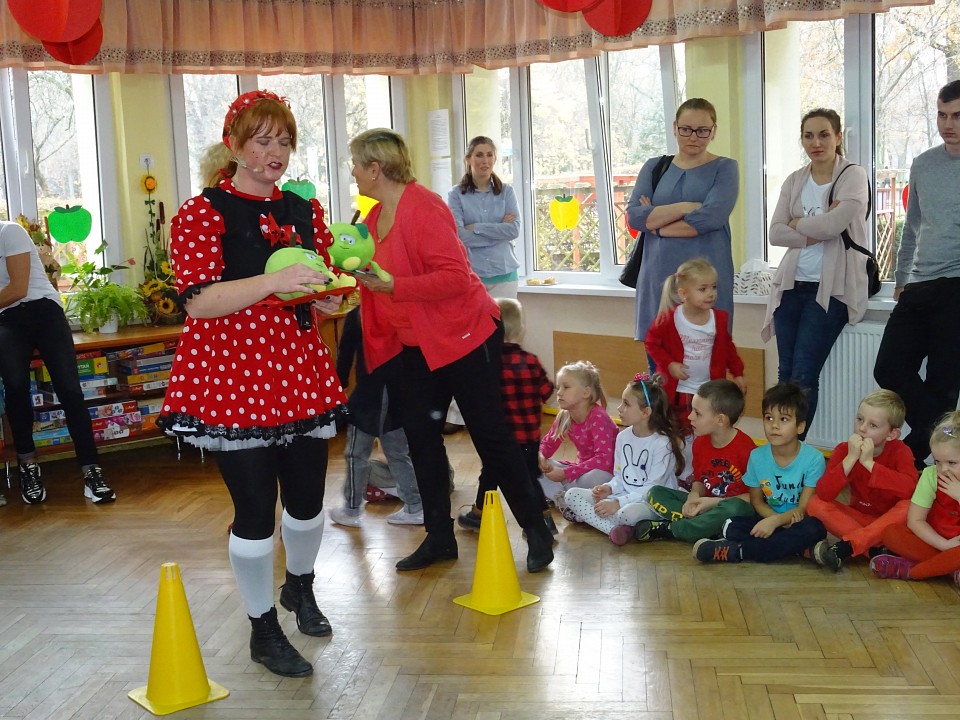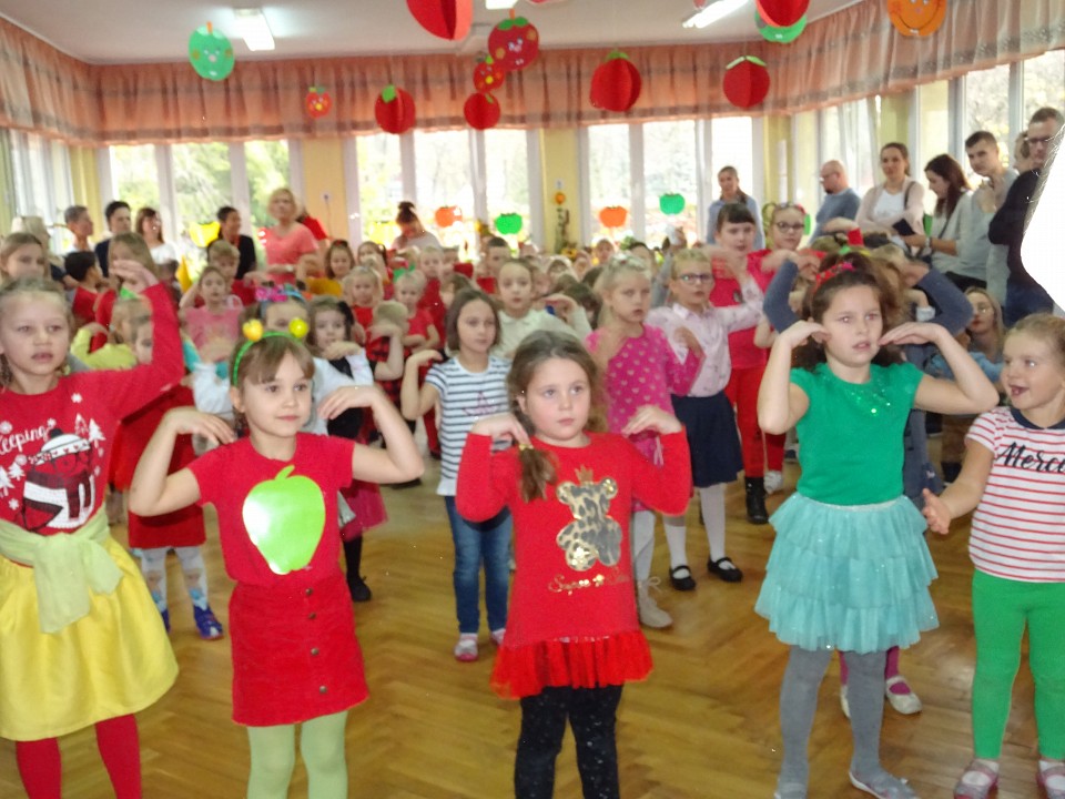 W programie były zabawy integracyjne przy muzyce, poprowadzone przezanimatorów - MYSIĘ ZDROWISIĘ, KROPKĘ i KROPKA, którzy w bardzo ciekawy sposób zachęcali dzieci i rodziców do czynnego udziału w imprezie. Sprawiło to wszystkim wiele radości i pozwoliło na bliższe poznanie się wszystkich uczestników. Były również konkursy, zdjęcia z jabłuszkiem oraz kiermasz wypieków jabłkowych przygotowany przez nasze kuchareczki i rodziców. Można było również skosztować pieczonego jabłka i pysznego soku jabłkowego. Prawdziwą atrakcją było wręczenie nagród dzieciom za udział w konkursie plastycznym pod hasłem JABŁKO NA PORTRECIE.