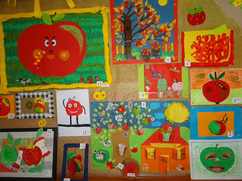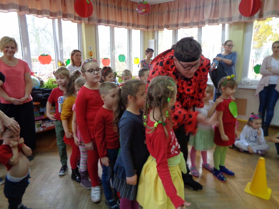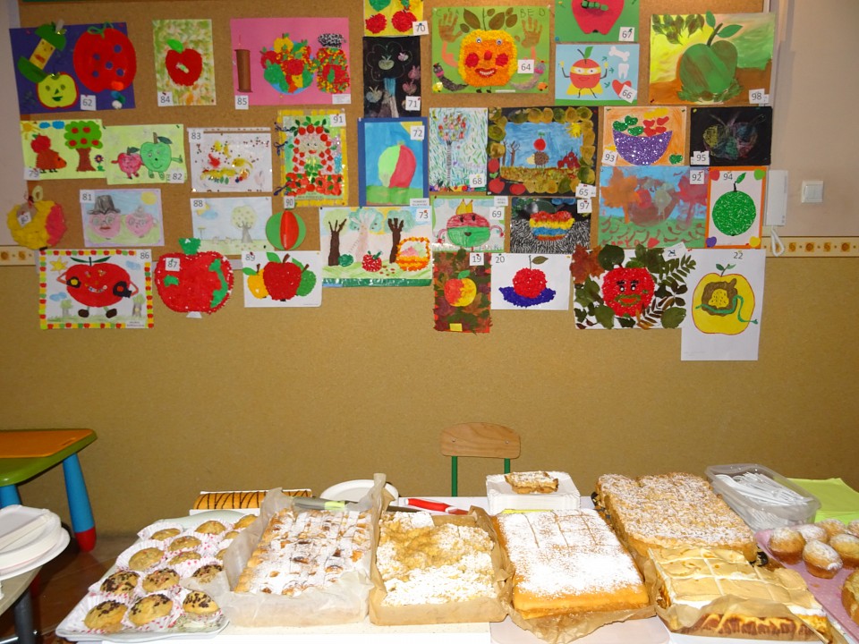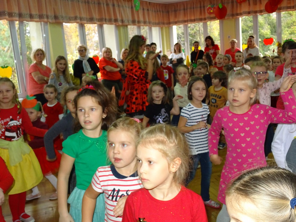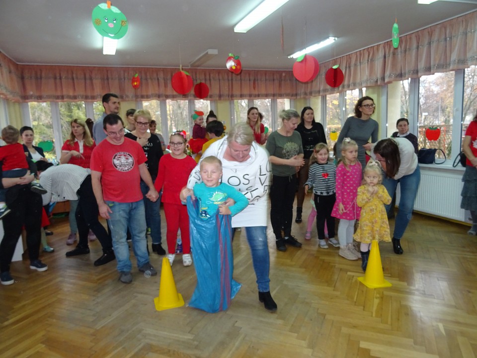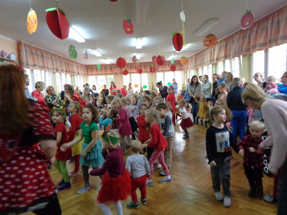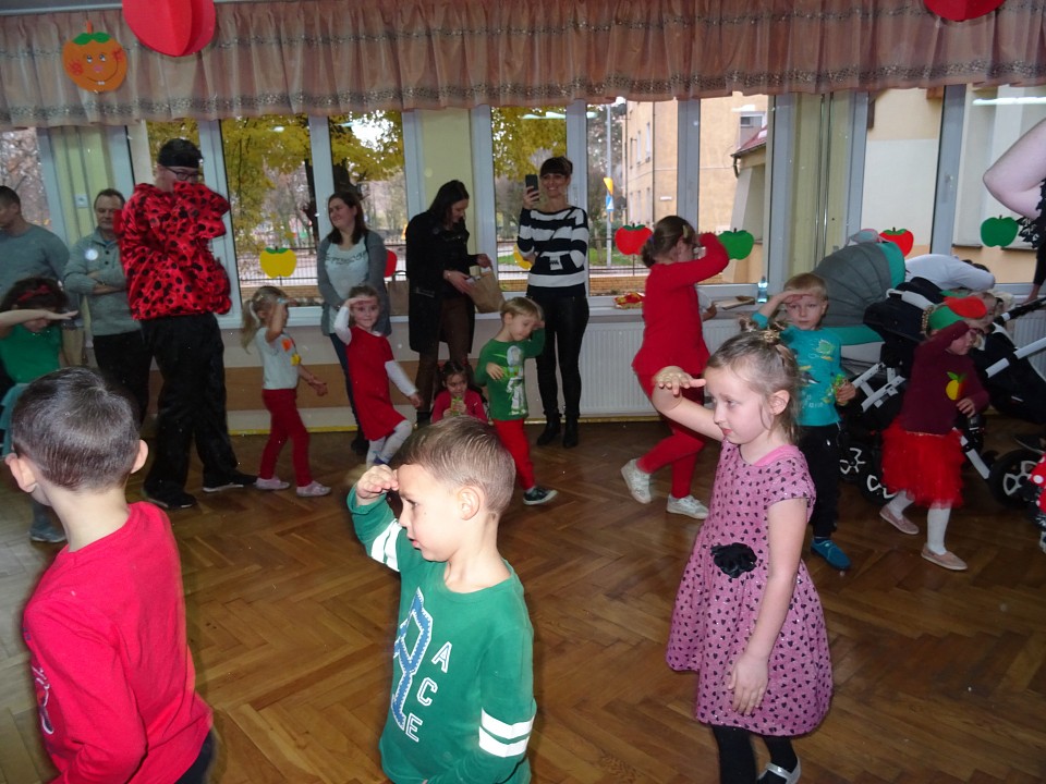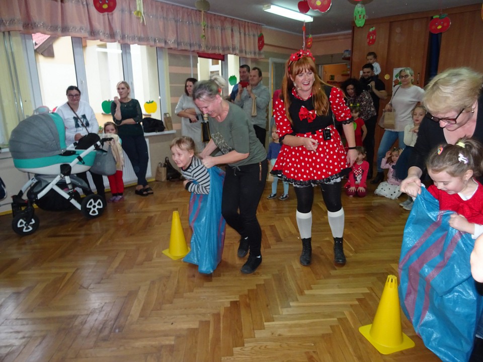 W programie były zabawy integracyjne przy muzyce, poprowadzone przezanimatorów - MYSIĘ ZDROWISIĘ, KROPKĘ i KROPKA, którzy w bardzo ciekawy sposób zachęcali dzieci i rodziców do czynnego udziału w imprezie. Sprawiło to wszystkim wiele radości i pozwoliło na bliższe poznanie się wszystkich uczestników. Były również konkursy, zdjęcia z jabłuszkiem oraz kiermasz wypieków jabłkowych przygotowany przez nasze kuchareczki i rodziców. Można było również skosztować pieczonego jabłka i pysznego soku jabłkowego. Prawdziwą atrakcją było wręczenie nagród dzieciom za udział w konkursie plastycznym pod hasłem JABŁKO NA PORTRECIE.