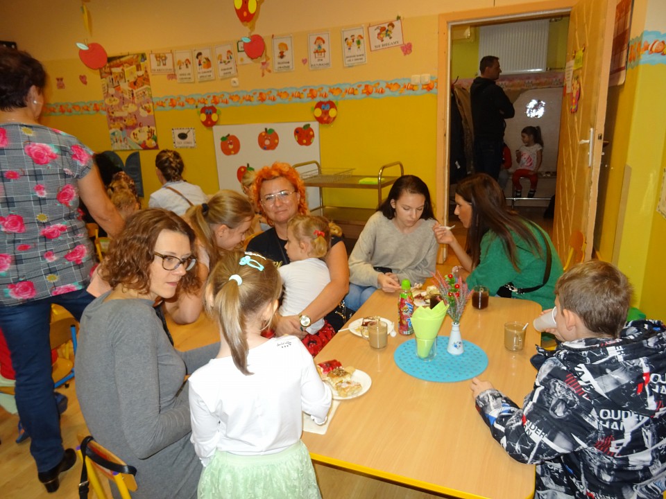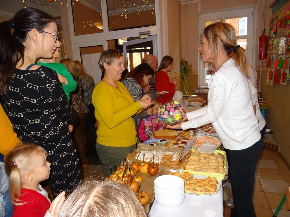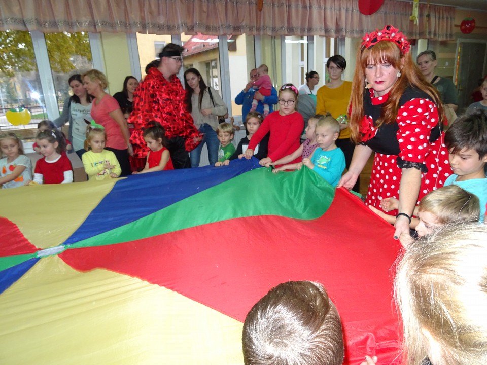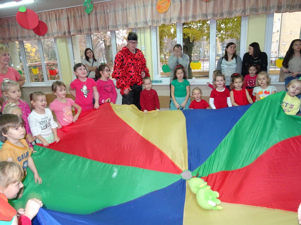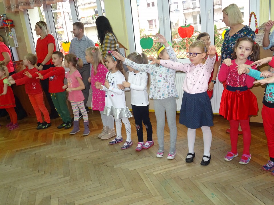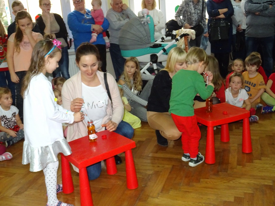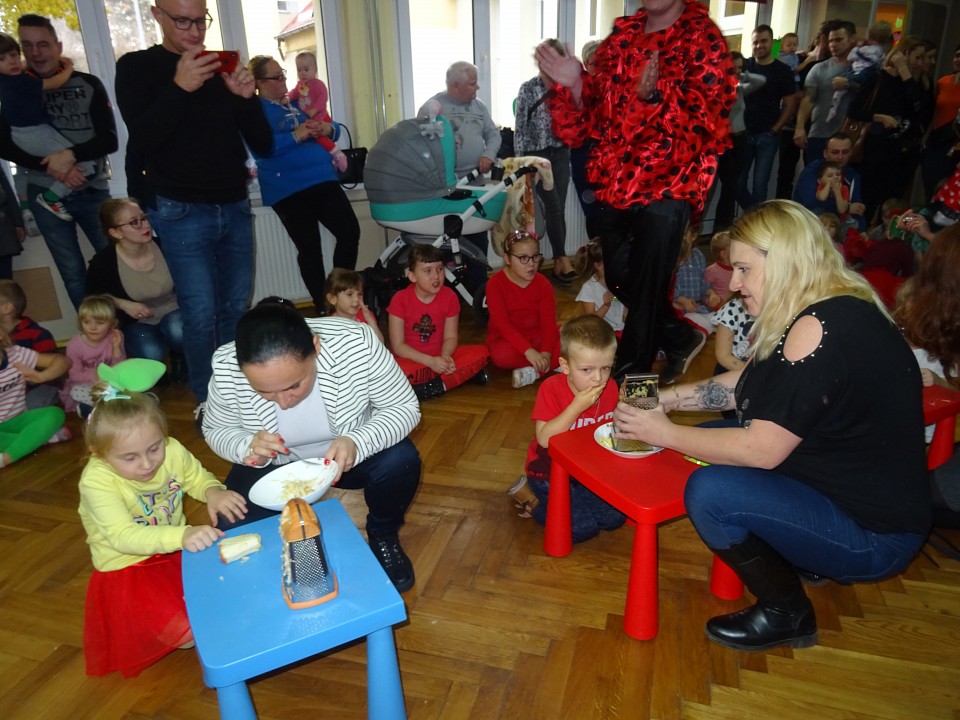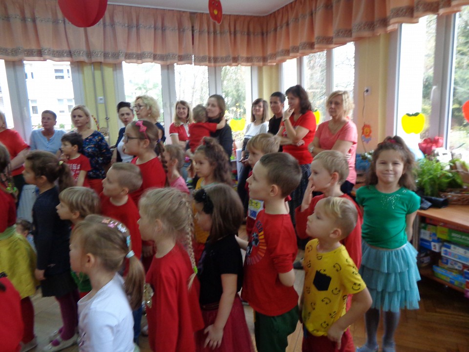 W programie były zabawy integracyjne przy muzyce, poprowadzone przezanimatorów - MYSIĘ ZDROWISIĘ, KROPKĘ i KROPKA, którzy w bardzo ciekawy sposób zachęcali dzieci i rodziców do czynnego udziału w imprezie. Sprawiło to wszystkim wiele radości i pozwoliło na bliższe poznanie się wszystkich uczestników. Były również konkursy, zdjęcia z jabłuszkiem oraz kiermasz wypieków jabłkowych przygotowany przez nasze kuchareczki i rodziców. Można było również skosztować pieczonego jabłka i pysznego soku jabłkowego. Prawdziwą atrakcją było wręczenie nagród dzieciom za udział w konkursie plastycznym pod hasłem JABŁKO NA PORTRECIE.