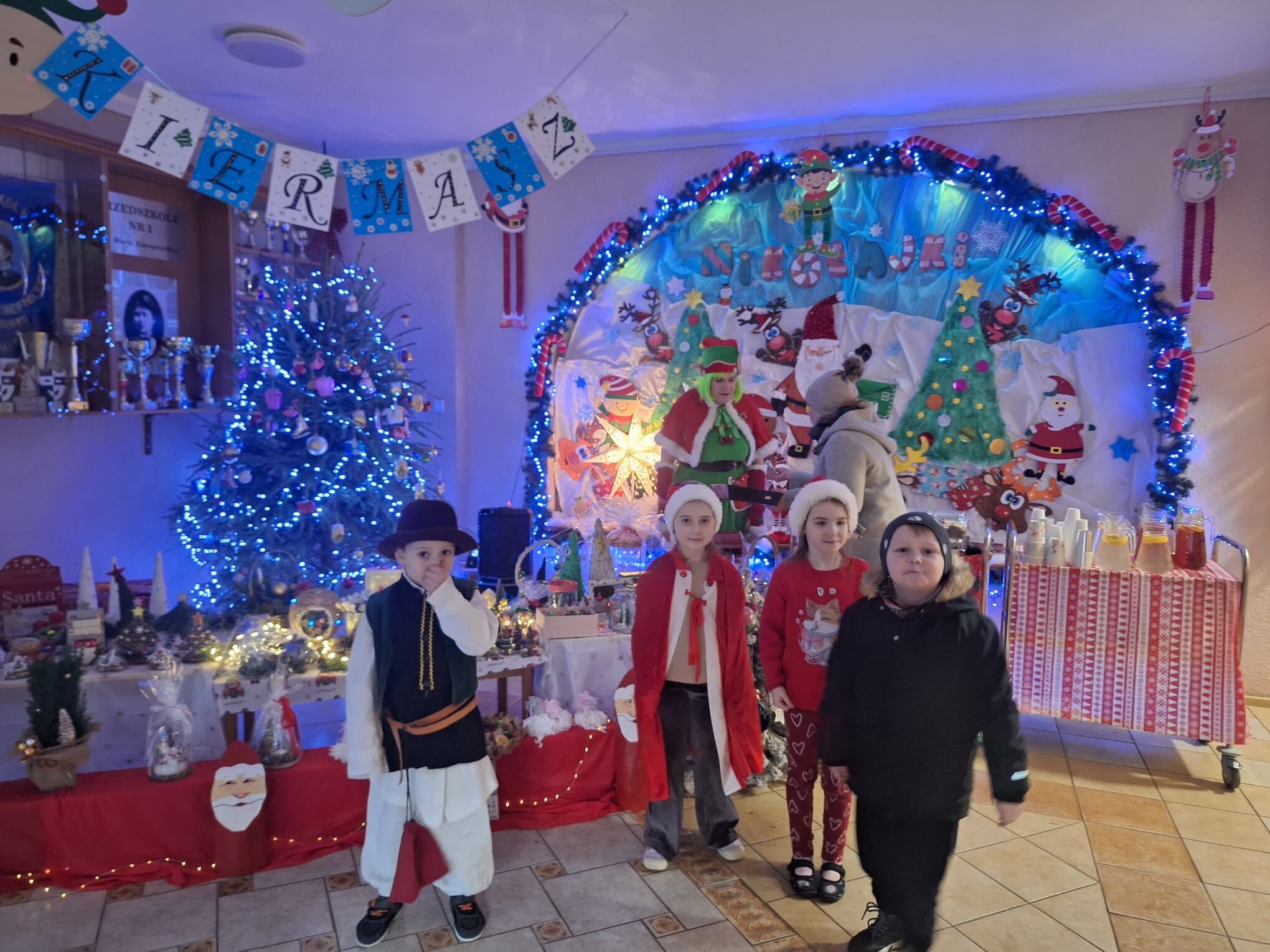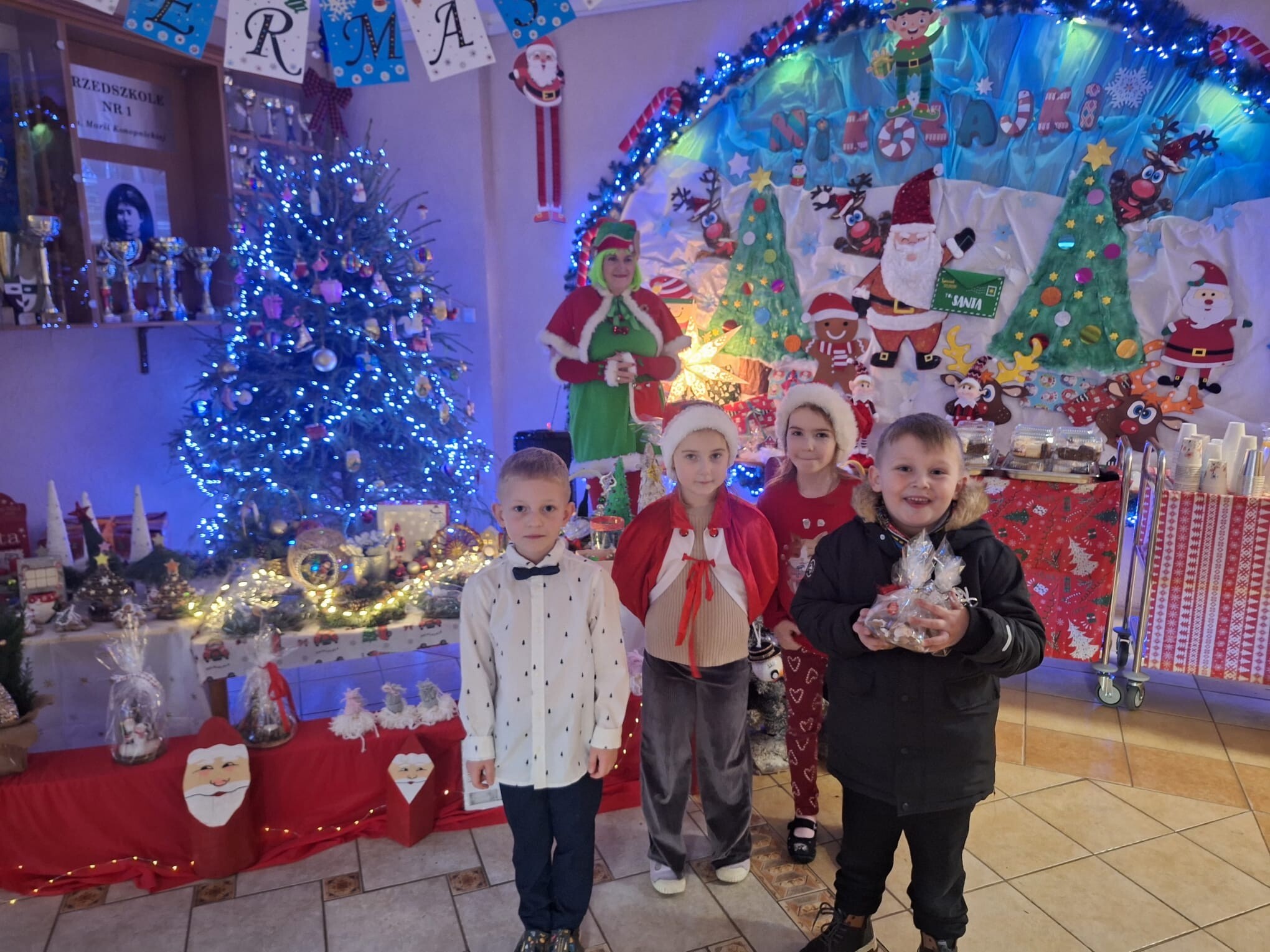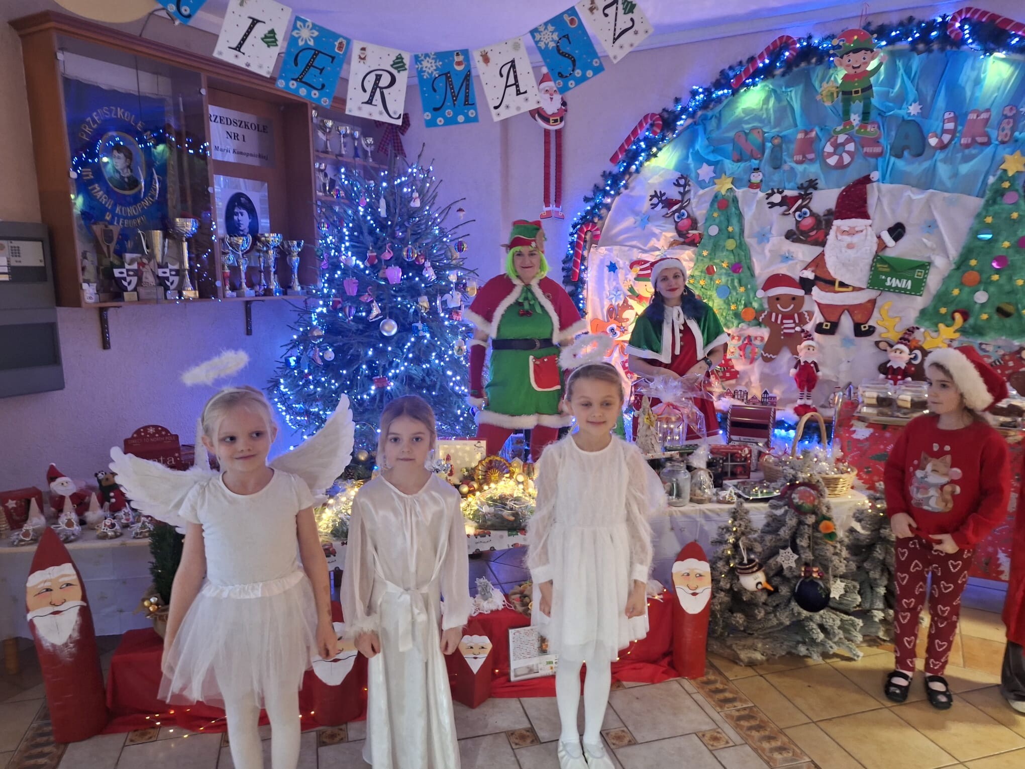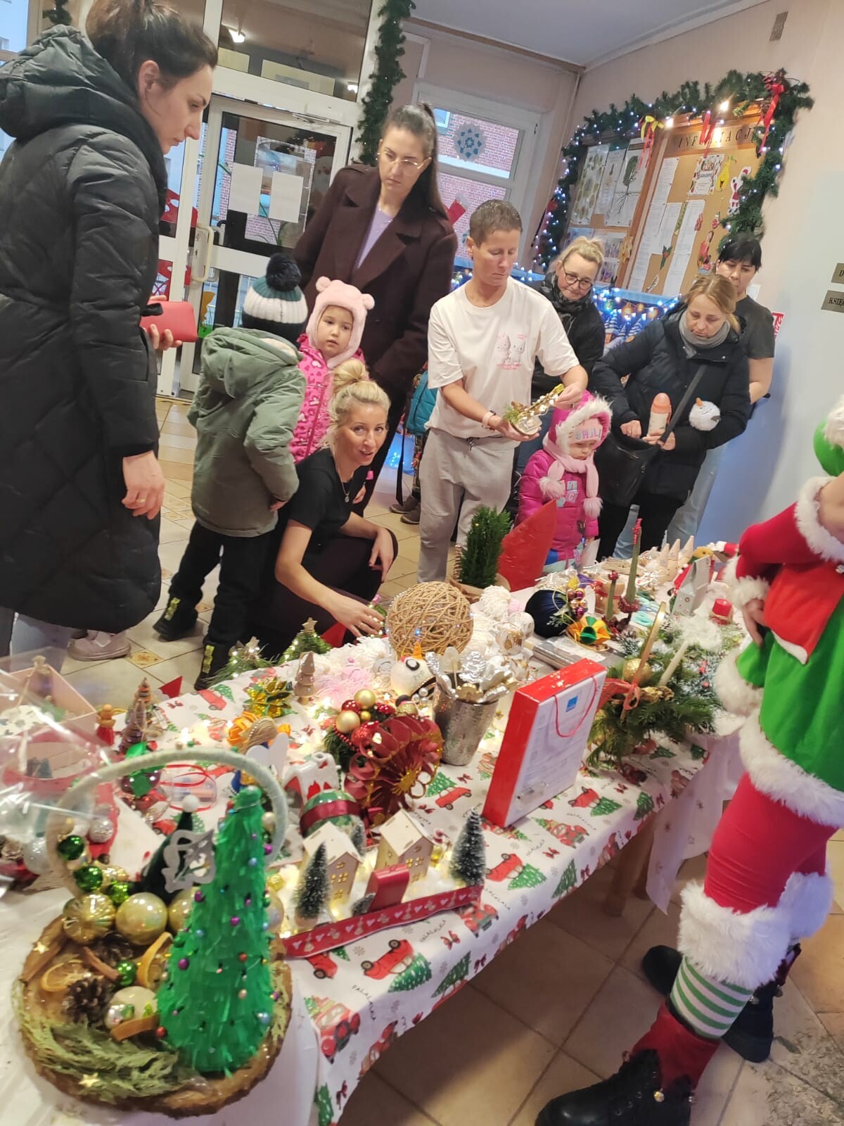 Na kilka dni przed Świętami Bożego Narodzenia w naszym przedszkolu odbył się kiermasz ozdób świątecznych. Na specjalnie przygotowanych stoiskach znalazły się wykonane przez przedszkolaków oraz ich bliskich bożonarodzeniowe dekoracje, choinki, stroiki, gwiazdeczki, aniołki, a także pyszne, domowe wypieki, lukrowane pierniczki i lemoniada. Kiermasz wzbudził wielkie zainteresowanie rodziców, jak i samych przedszkolaków. Ozdoby były bardzo pomysłowe i kolorowe. Dzięki hojności i zaangażowaniu rodziców udało nam się zebrać dosyć dużą kwotę pieniążków, które przeznaczymy na zabawki dla dzieci.