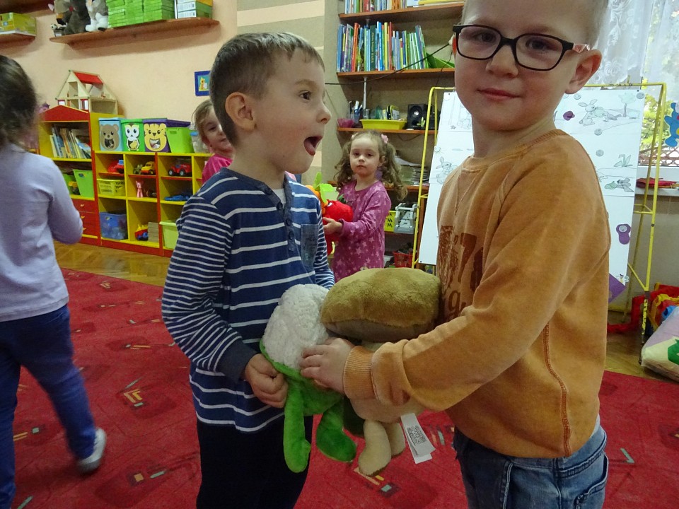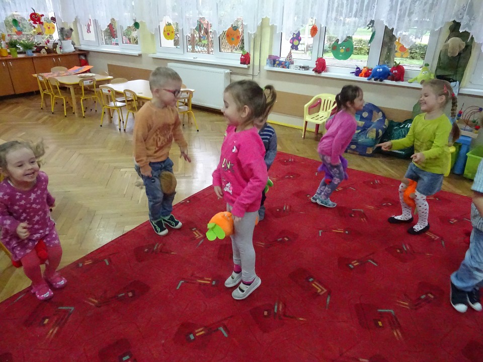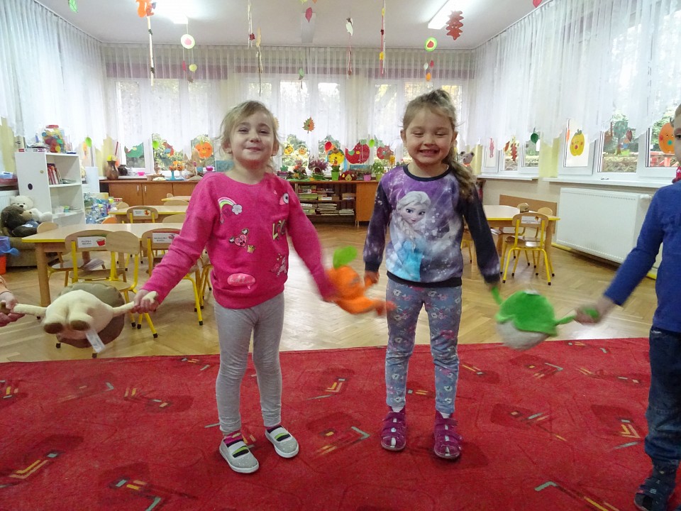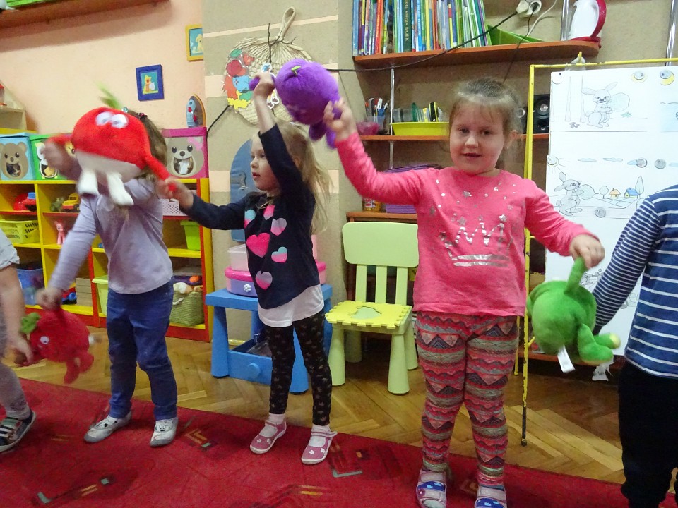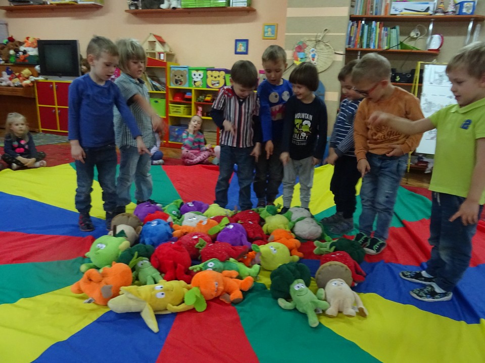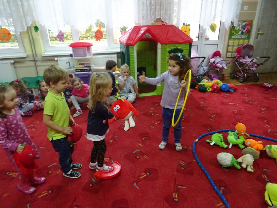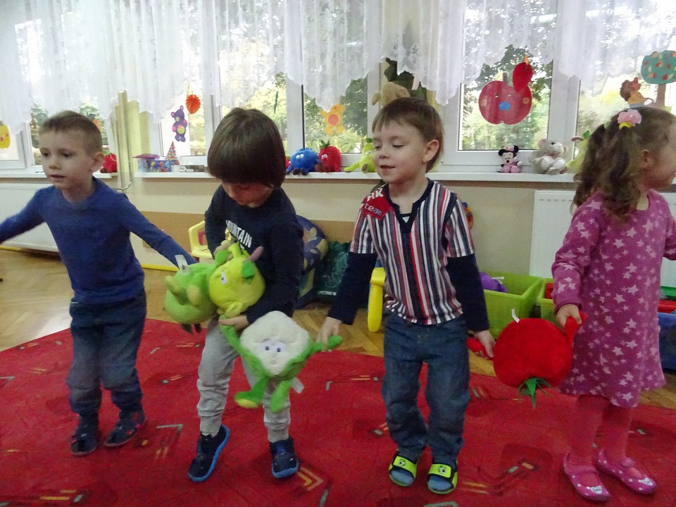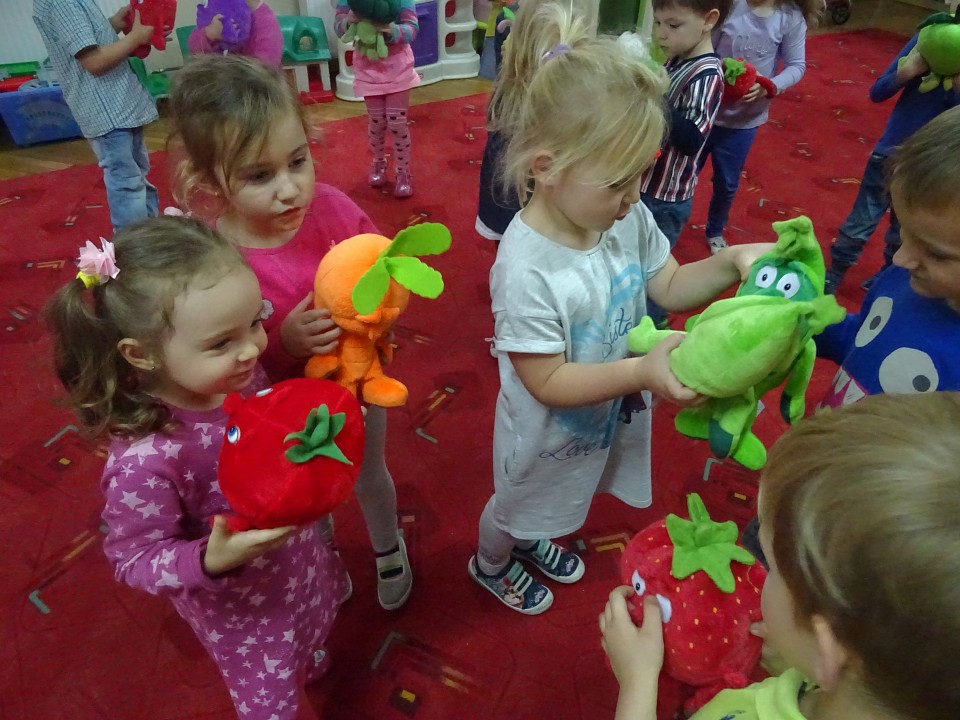 Wszyscy dobrze wiedzą, jak bogate w witaminy są owoce i warzywa. Dlatego MISIAKI chętnie przyniosły w czwartek 12 pażdziernika wszystkie swoje ulubione warzywno - owocowe pluszaki. Poprzez zabawy ze zgromadzonymi Świeżakami, bardziej uświadomiły sobie konieczność dbania o zdrowe odżywianie. Wspólnie z naszymi przyjaciółmi dzieci śpiewały, tańczyły, podskiwały radośnie z chustą Klanza, a także ćwiczyły. Było mnóstwo przytulania, radości i uśmiechu.