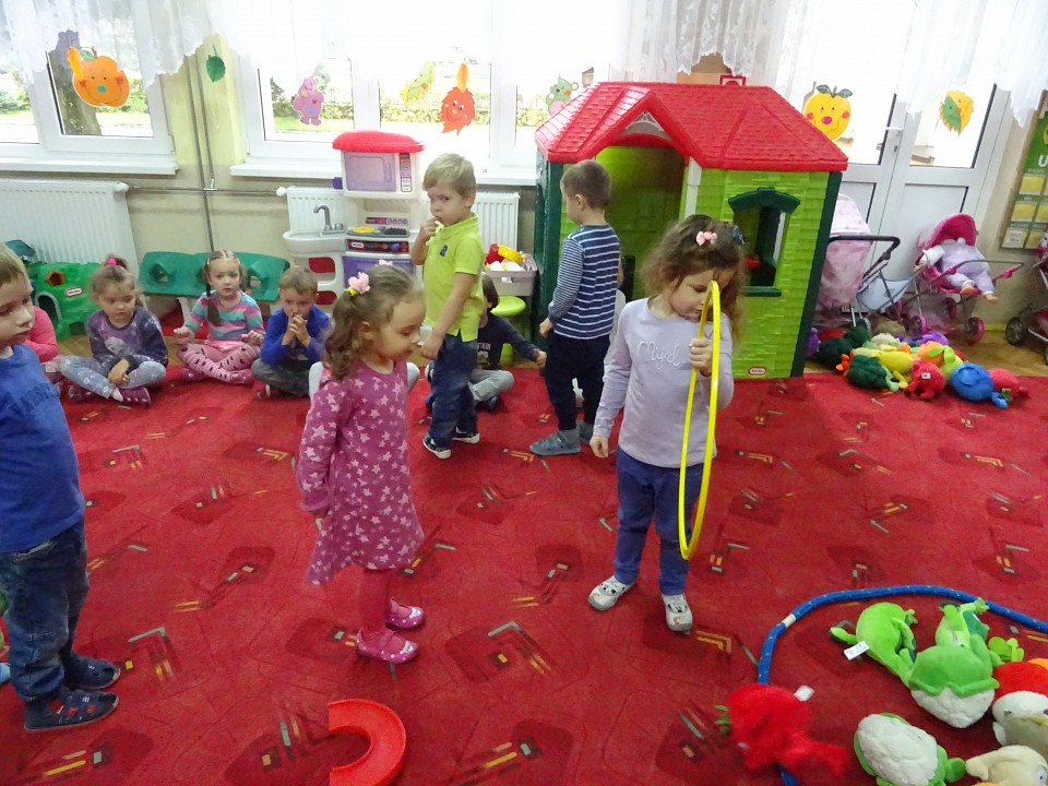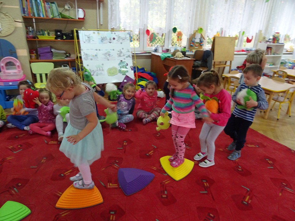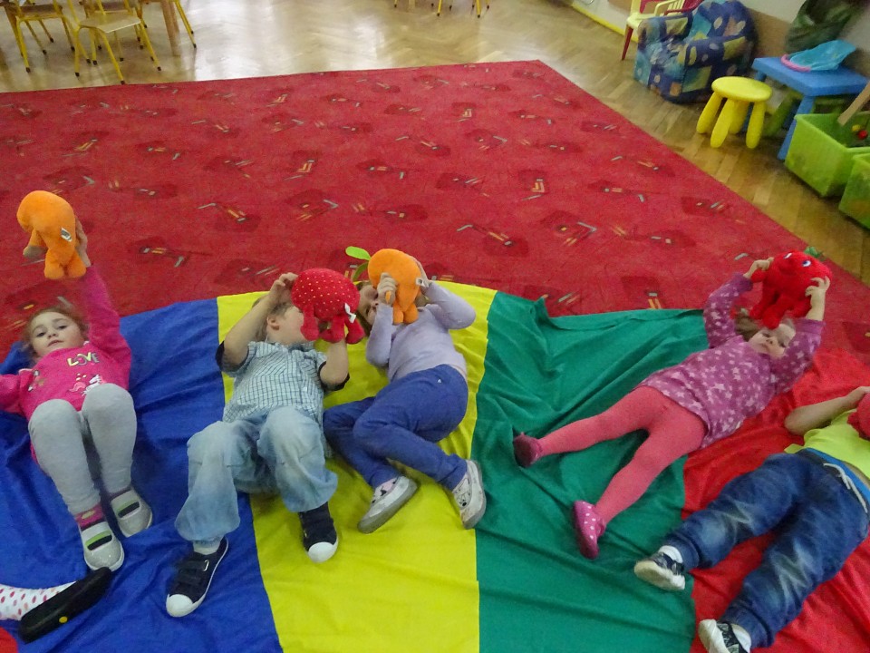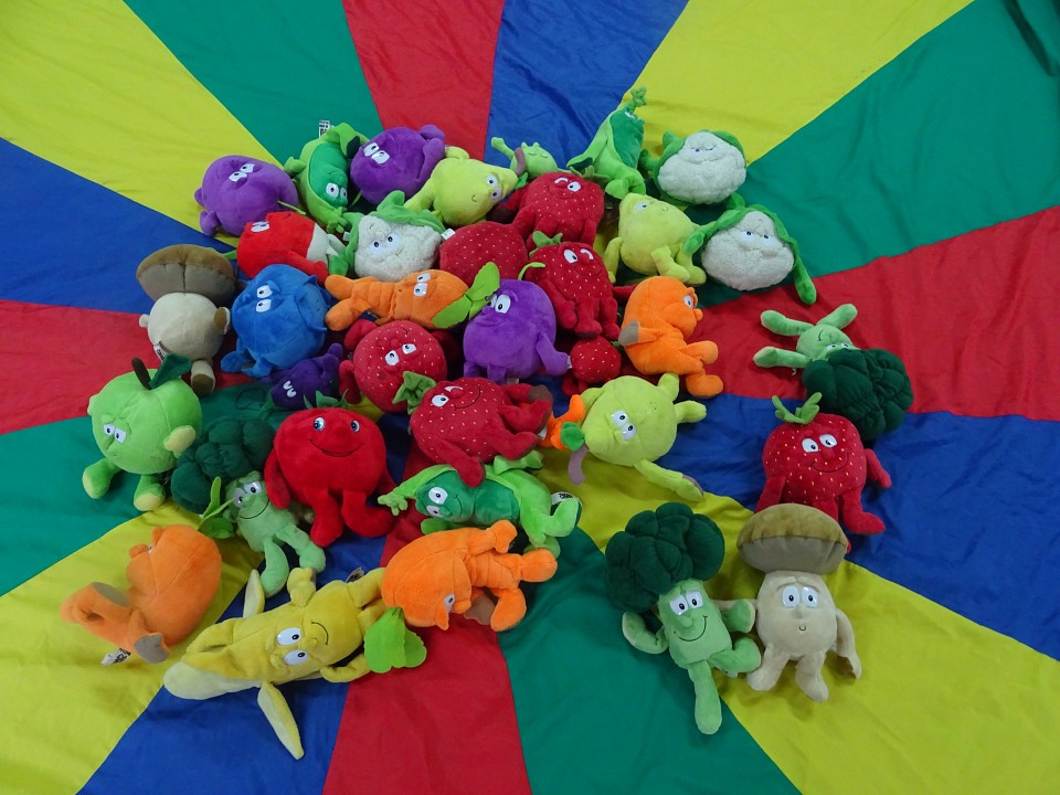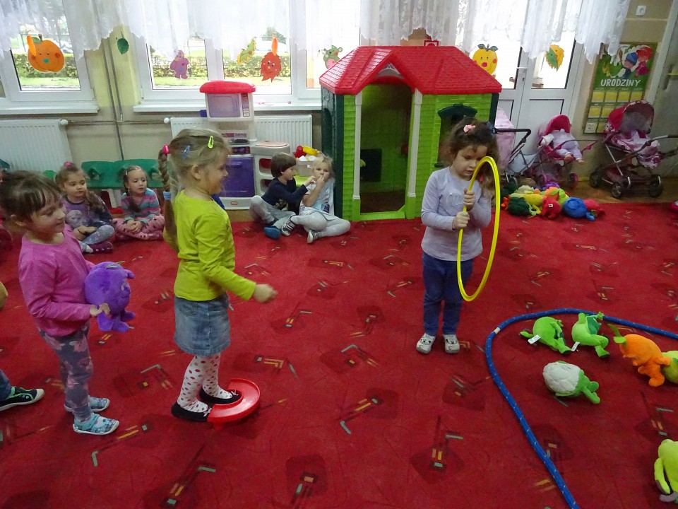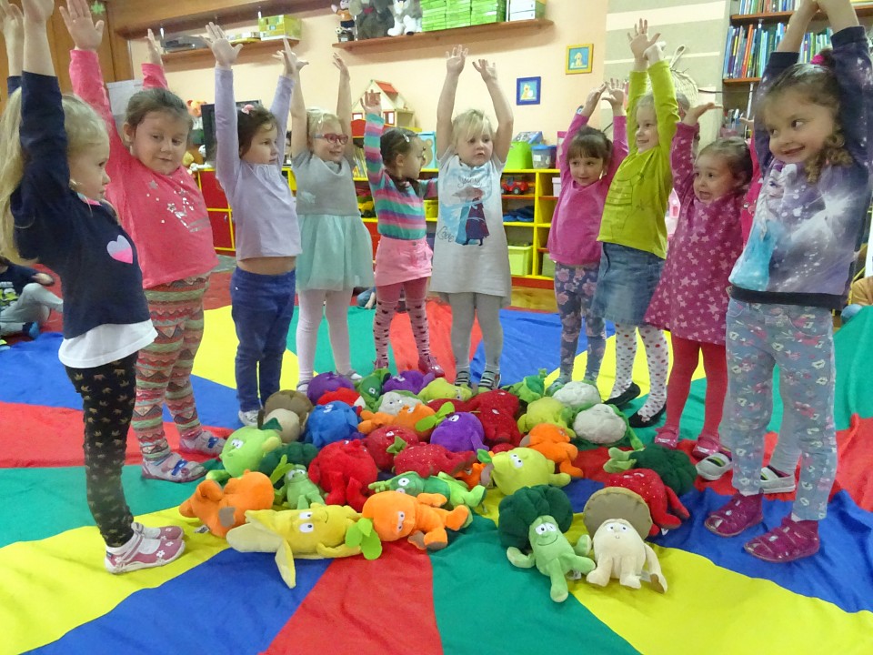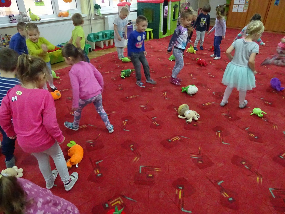 Wszyscy dobrze wiedzą, jak bogate w witaminy są owoce i warzywa. Dlatego MISIAKI chętnie przyniosły w czwartek 12 pażdziernika wszystkie swoje ulubione warzywno - owocowe pluszaki. Poprzez zabawy ze zgromadzonymi Świeżakami, bardziej uświadomiły sobie konieczność dbania o zdrowe odżywianie. Wspólnie z naszymi przyjaciółmi dzieci śpiewały, tańczyły, podskiwały radośnie z chustą Klanza, a także ćwiczyły. Było mnóstwo przytulania, radości i uśmiechu.