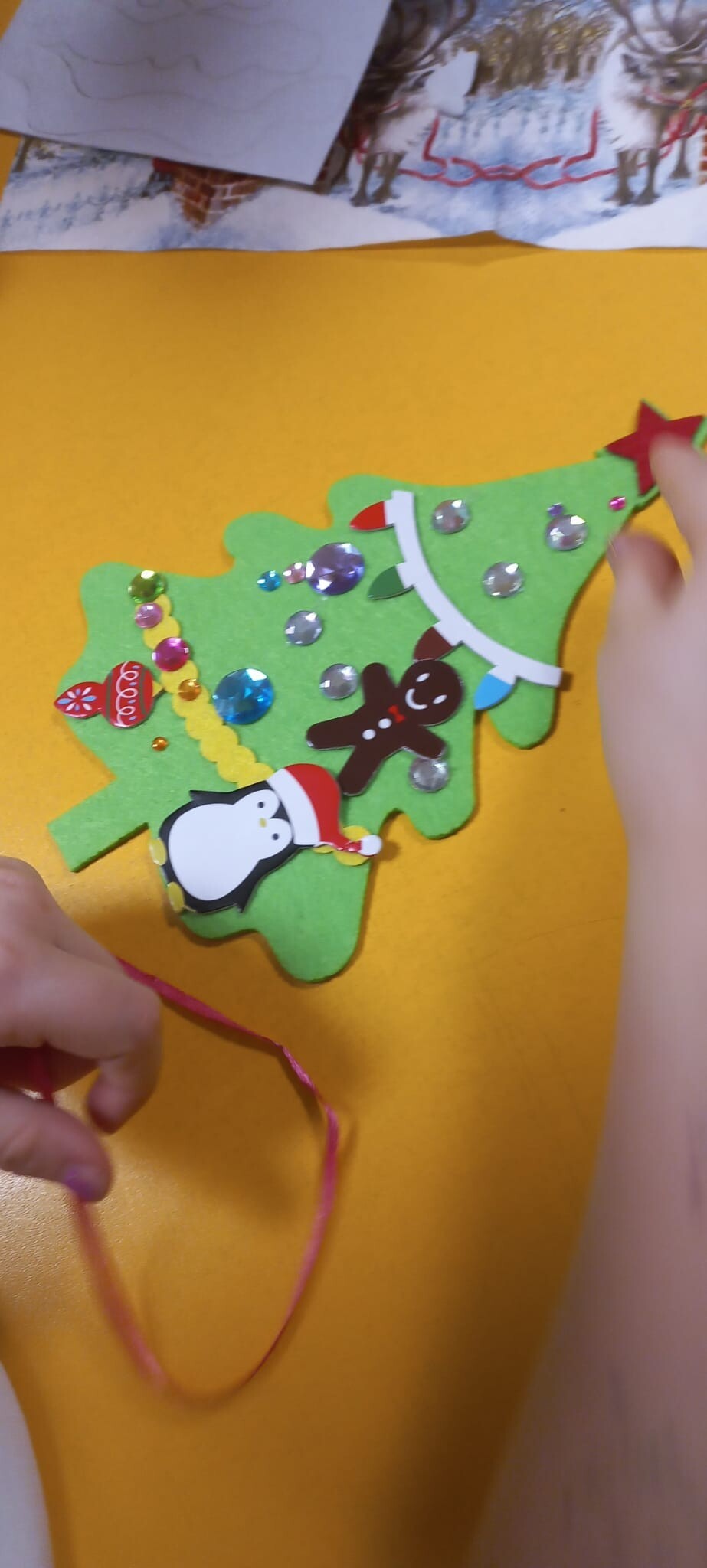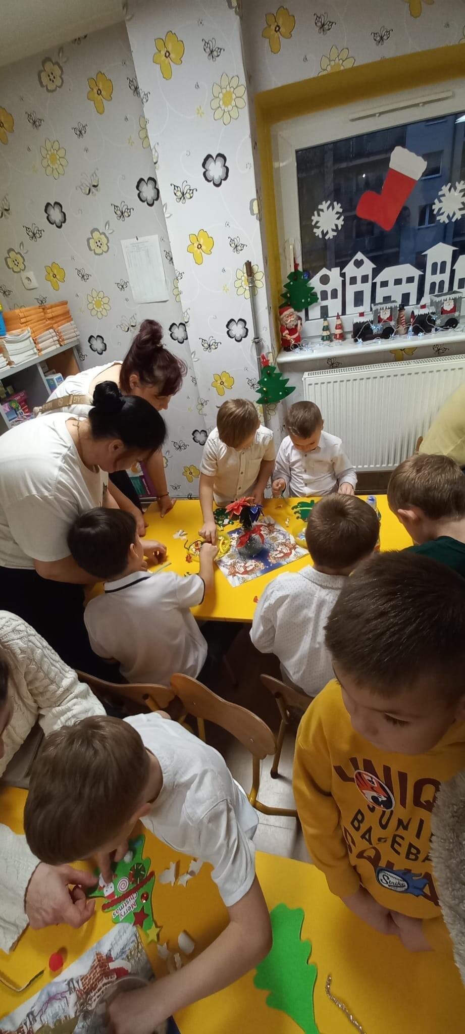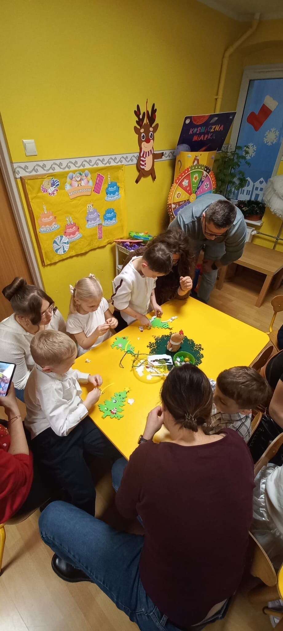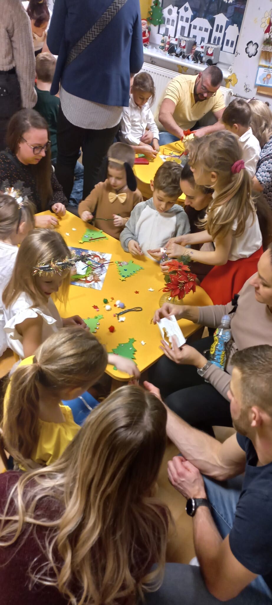 Po występach dzieci wraz z rodzicami wzięły udział w części warsztatowej, podczas której wspólnie ozdabiały filcowe choinki według własnych pomysłów. Gotowe prace dzieci zabrały do domu jako świąteczną pamiątkę.