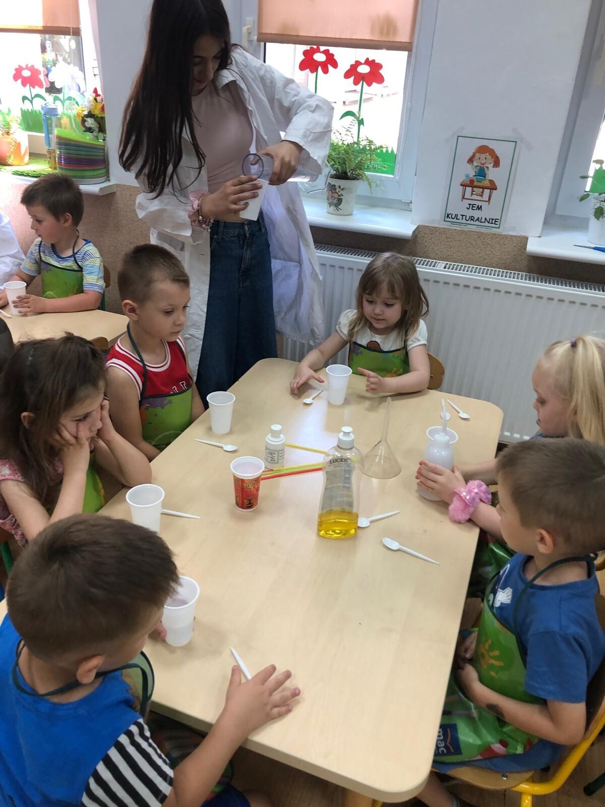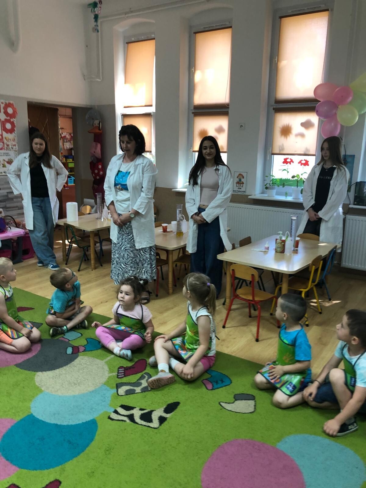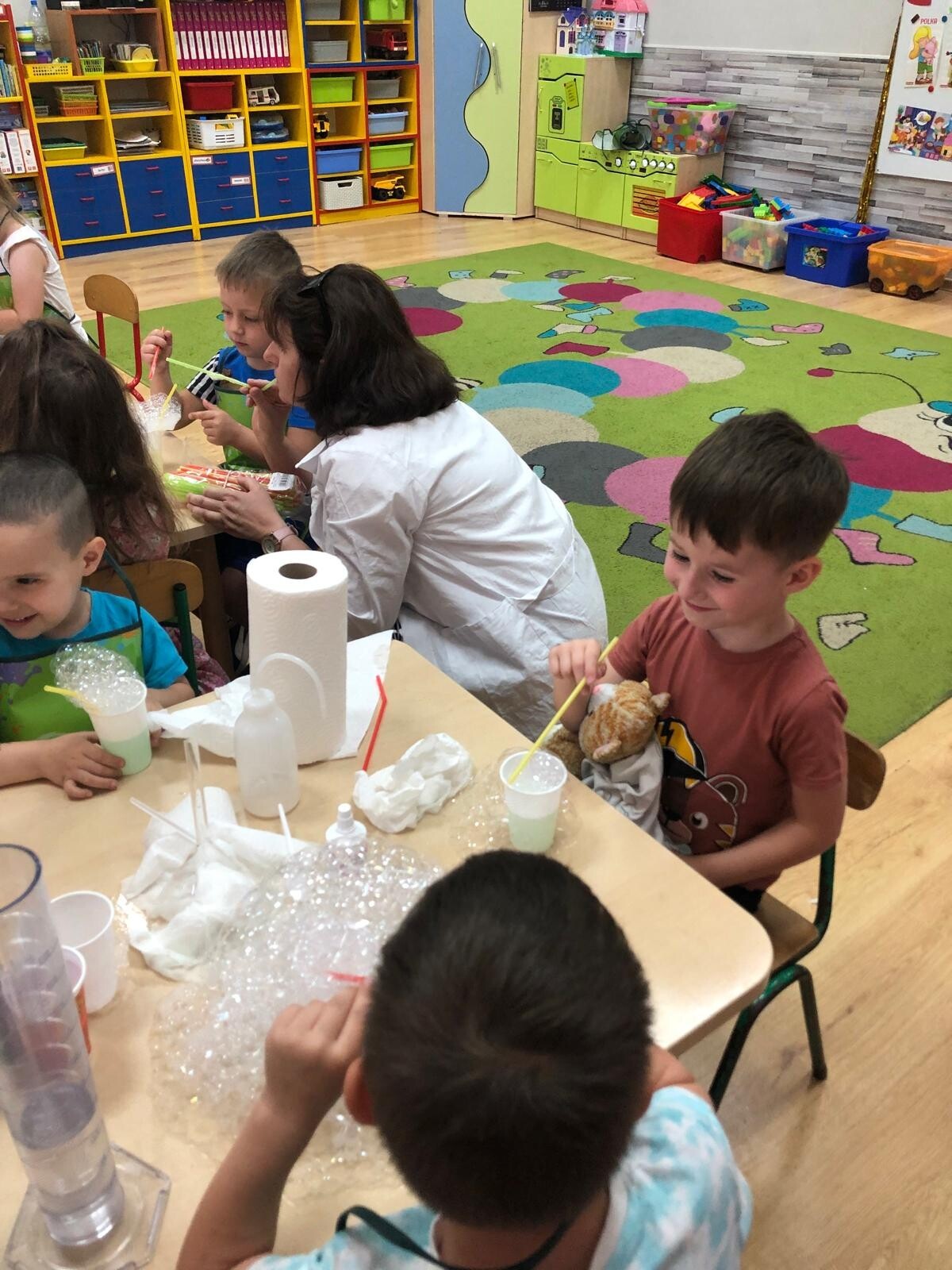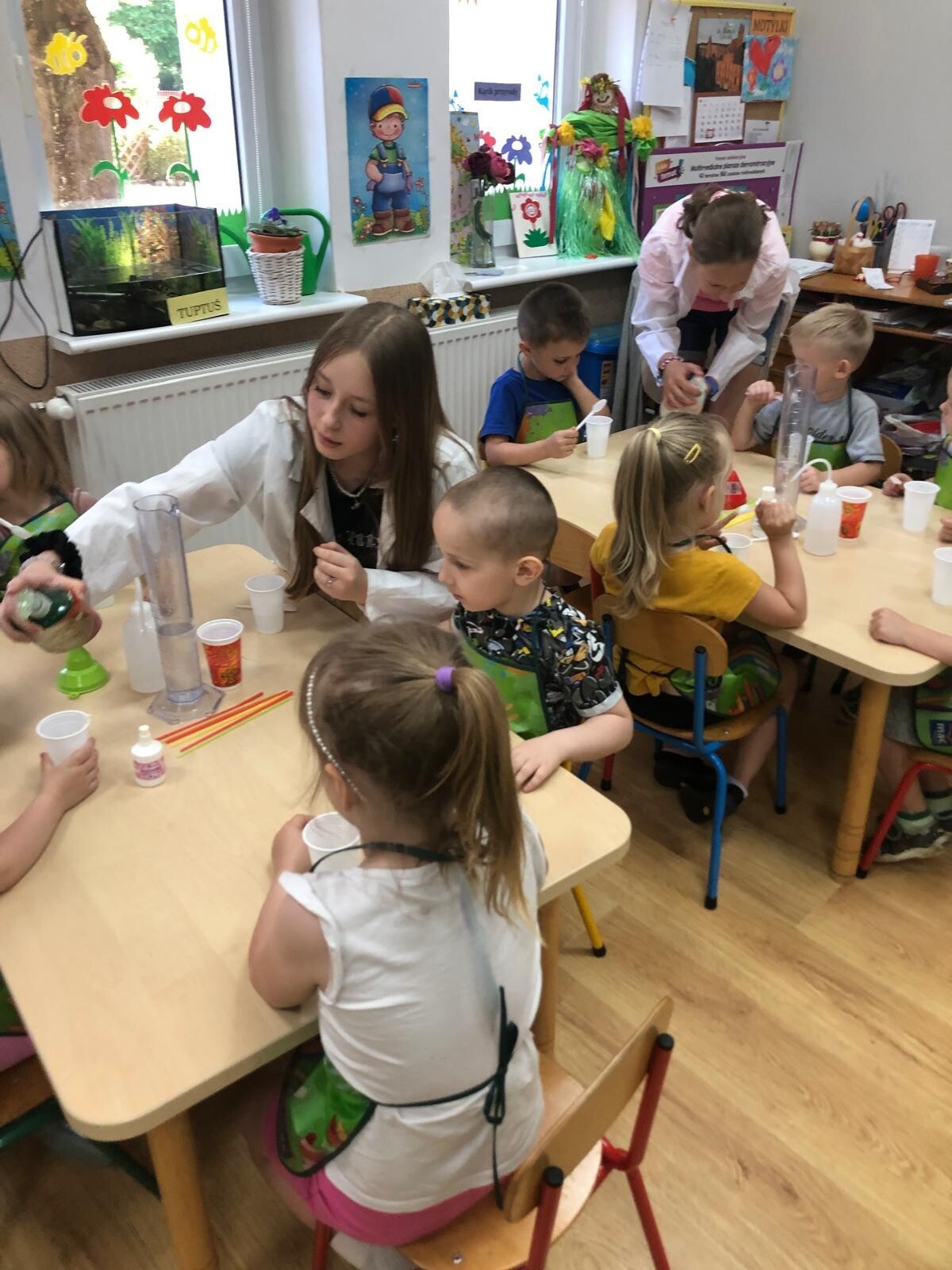 Dzieci z grupy Motylków i Kotków uczestniczyły w zabawach badawczych zorganizowanych przez mamę Adasia i Piotrusia Panią Agnieszkę oraz uczennice ze Szkoły nr8 w Lęborku. Dzieci mogły poczuć się prawdziwymi odkrywcami podczas zabaw badawczych. Mieszały mikstury, z zainteresowaniem obserwowały, zadawały pytania. Mali badacze byli niezwykle zainteresowani wszystkimi działaniami, była to dla nich ciekawa zabawa i przygoda. Wykonane eksperymenty z pewnością były okazją do pogłębienia wiedzy o fascynującym świecie.