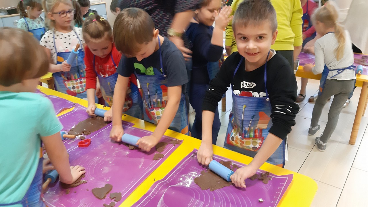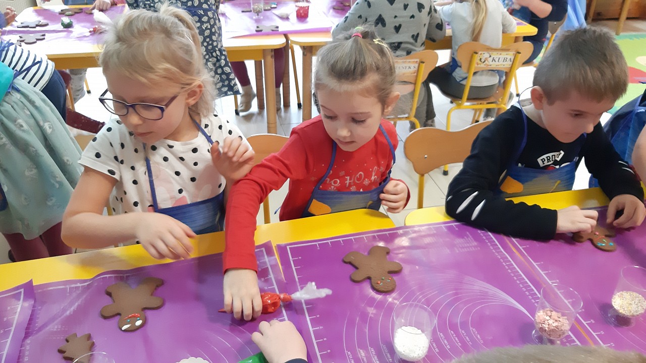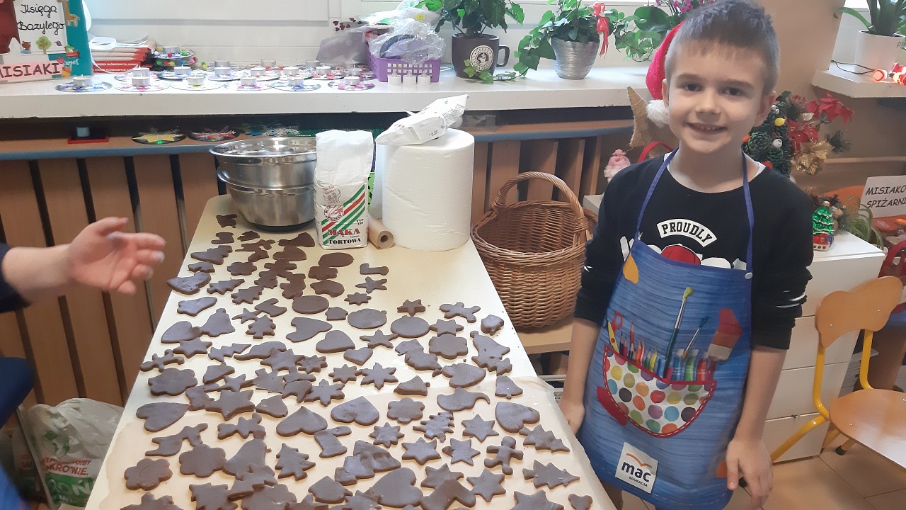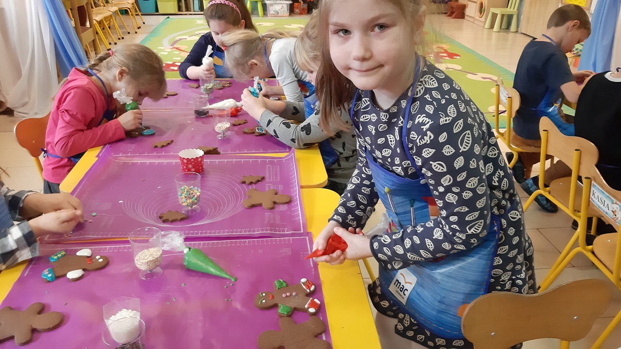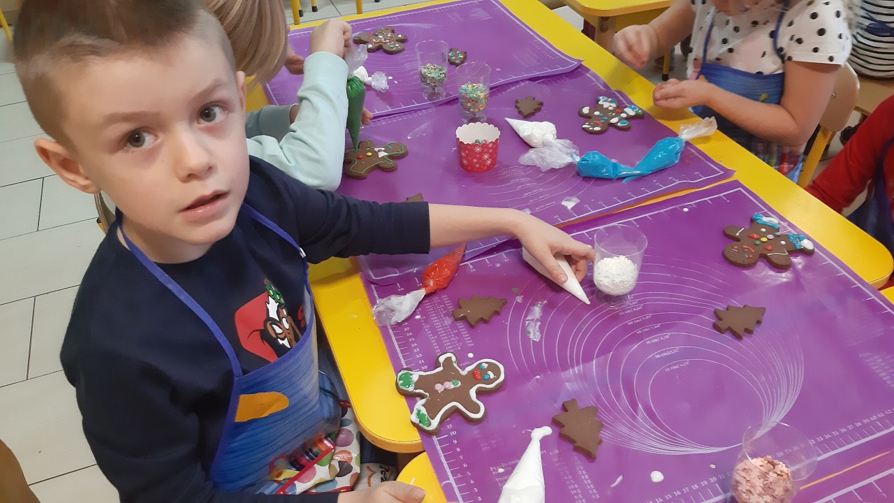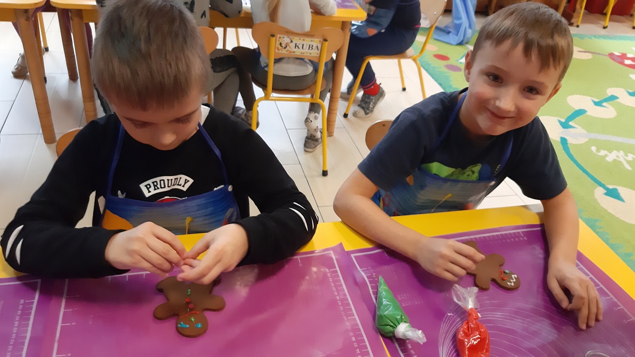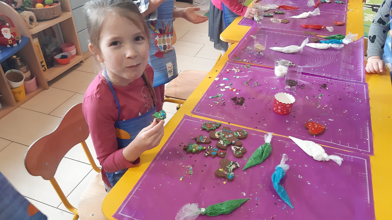 Aby poczuć magię nadchodzących świąt, MISIAKI we wtorek urządziły sobie wielkie pieczenie pierniczków świątecznych. A to wszystko dzięki mamie Majeczki Brodalskiej ze SŁODKIEGO ZAKĄTKA, która przyniosła już gotowe ciasto piernikowe. Największą frajdę sprawiło dzieciom wałkowanie ciasta i wycinanie różnych kształtów foremkami. Później nasze pierniczki zostały upieczone, a ich aromatyczny zapach roznosił się po całym przedszkolu. Pozostało jeszcze je ozdobić lukrem oraz kolorowymi posypkami i gotowe. Zabawa była doskonała, a udekorowane pierniczki wyglądały bardzo ładnie i pysznie.