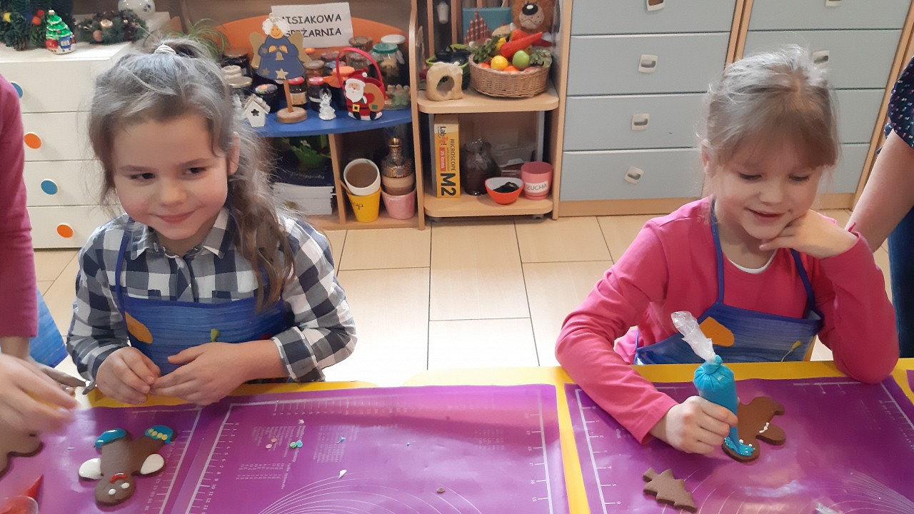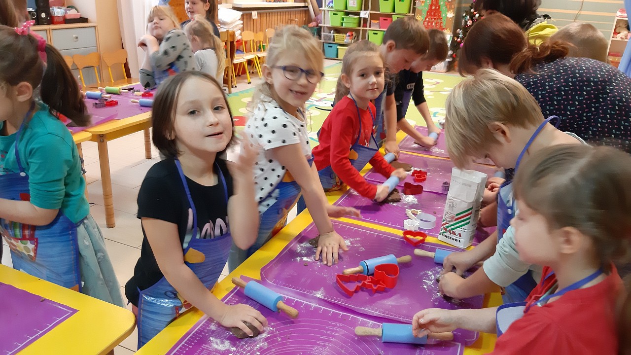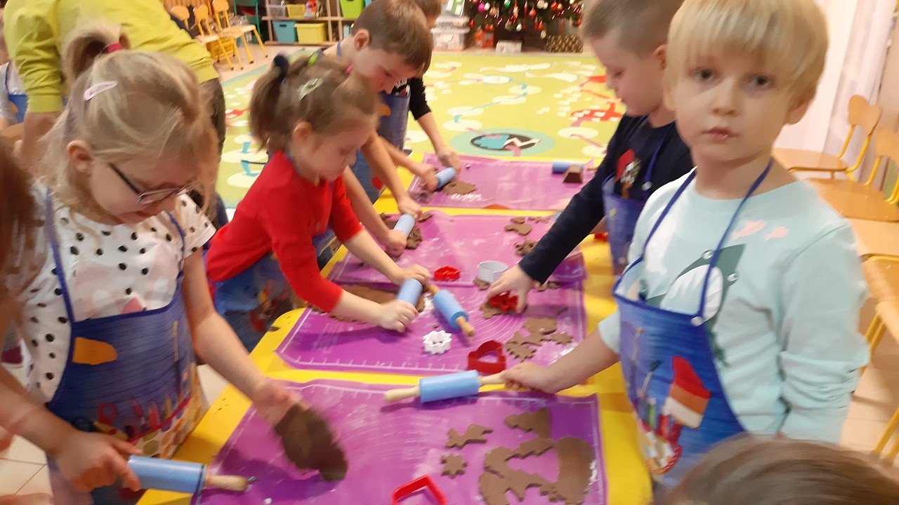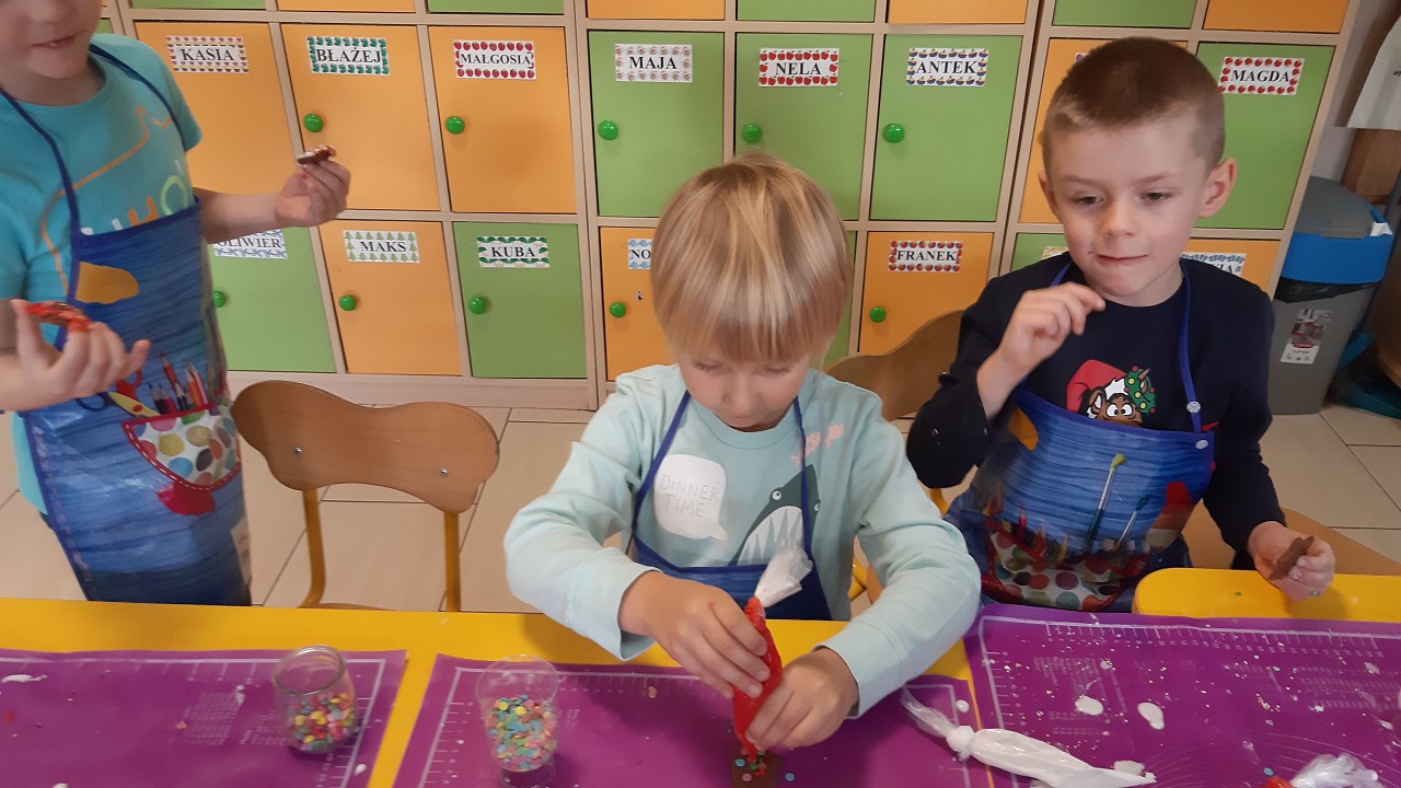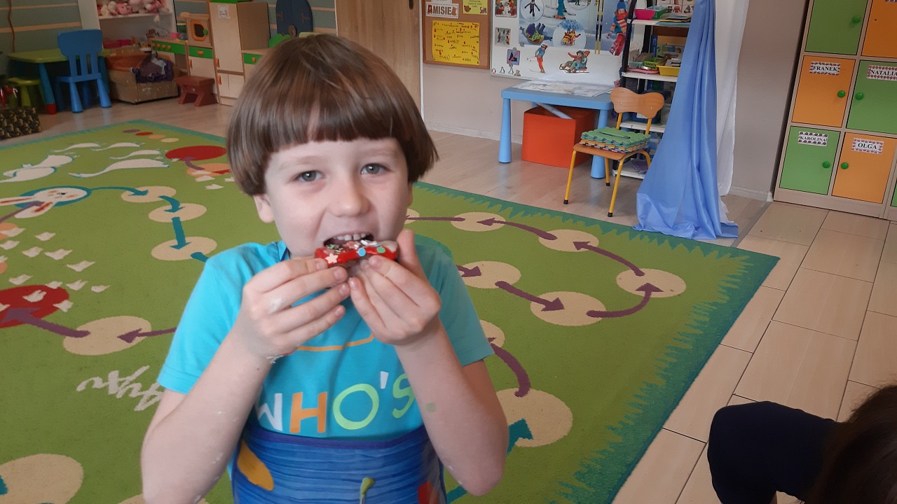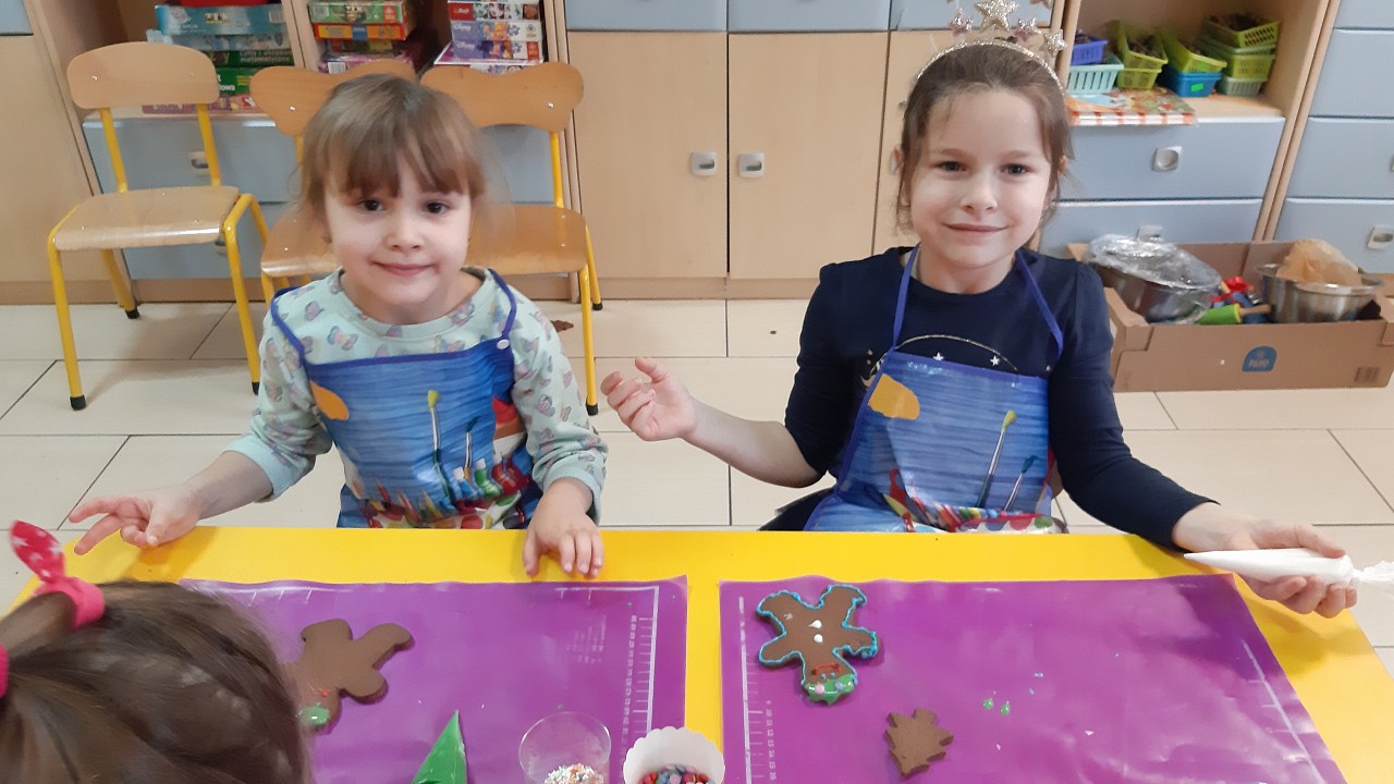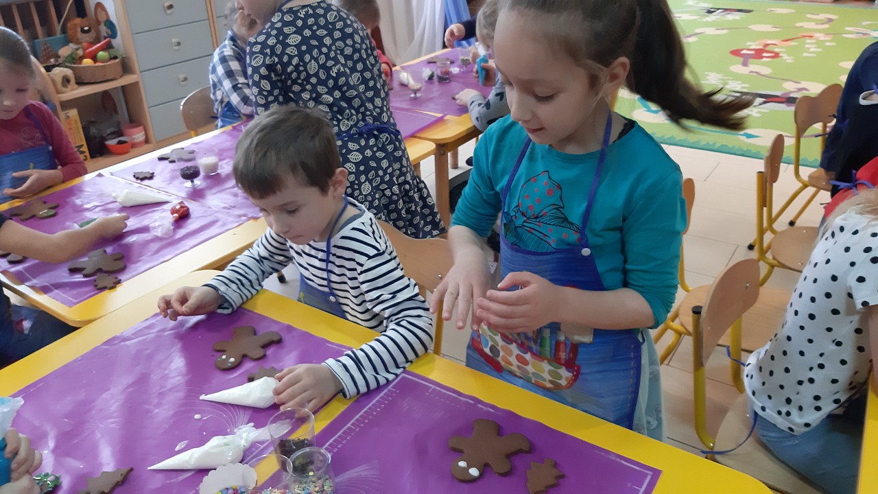 Aby poczuć magię nadchodzących świąt, MISIAKI we wtorek urządziły sobie wielkie pieczenie pierniczków świątecznych. A to wszystko dzięki mamie Majeczki Brodalskiej ze SŁODKIEGO ZAKĄTKA, która przyniosła już gotowe ciasto piernikowe. Największą frajdę sprawiło dzieciom wałkowanie ciasta i wycinanie różnych kształtów foremkami. Później nasze pierniczki zostały upieczone, a ich aromatyczny zapach roznosił się po całym przedszkolu. Pozostało jeszcze je ozdobić lukrem oraz kolorowymi posypkami i gotowe. Zabawa była doskonała, a udekorowane pierniczki wyglądały bardzo ładnie i pysznie.