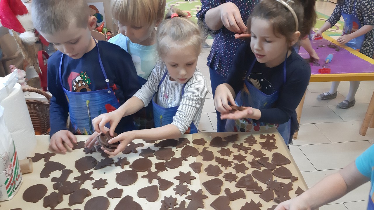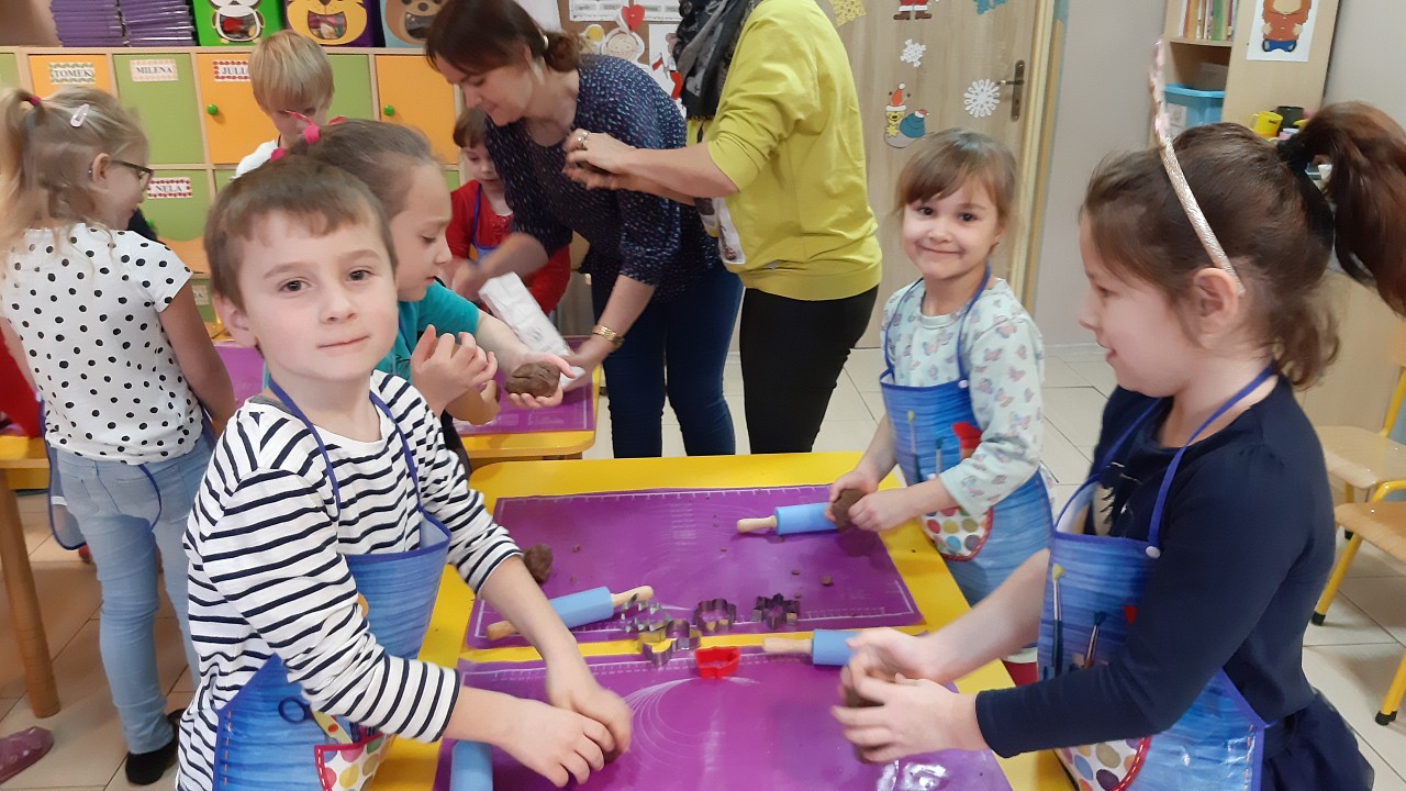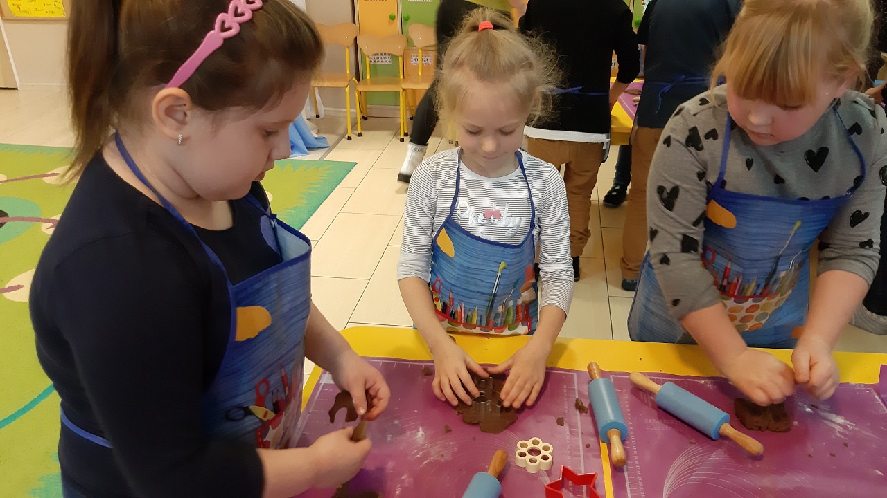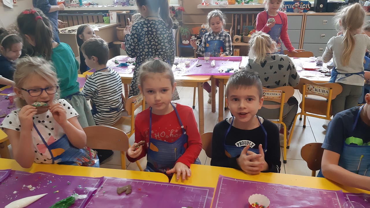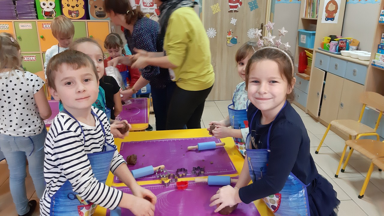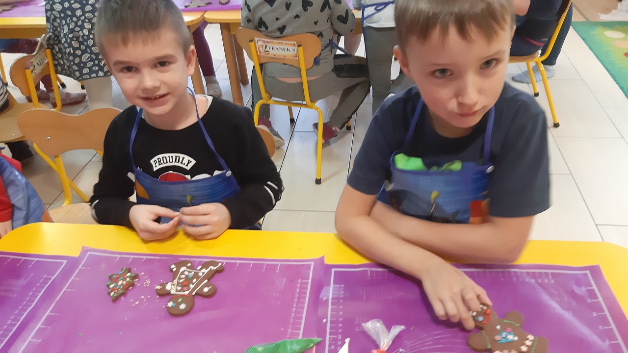Aby poczuć magię nadchodzących świąt, MISIAKI we wtorek urządziły sobie wielkie pieczenie pierniczków świątecznych. A to wszystko dzięki mamie Majeczki Brodalskiej ze SŁODKIEGO ZAKĄTKA, która przyniosła już gotowe ciasto piernikowe. Największą frajdę sprawiło dzieciom wałkowanie ciasta i wycinanie różnych kształtów foremkami. Później nasze pierniczki zostały upieczone, a ich aromatyczny zapach roznosił się po całym przedszkolu. Pozostało jeszcze je ozdobić lukrem oraz kolorowymi posypkami i gotowe. Zabawa była doskonała, a udekorowane pierniczki wyglądały bardzo ładnie i pysznie.