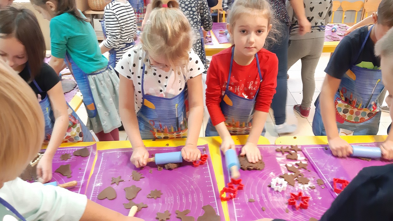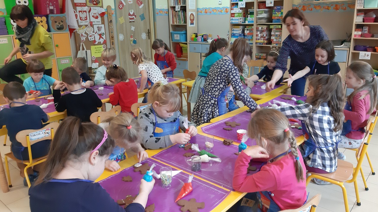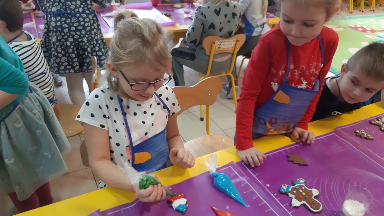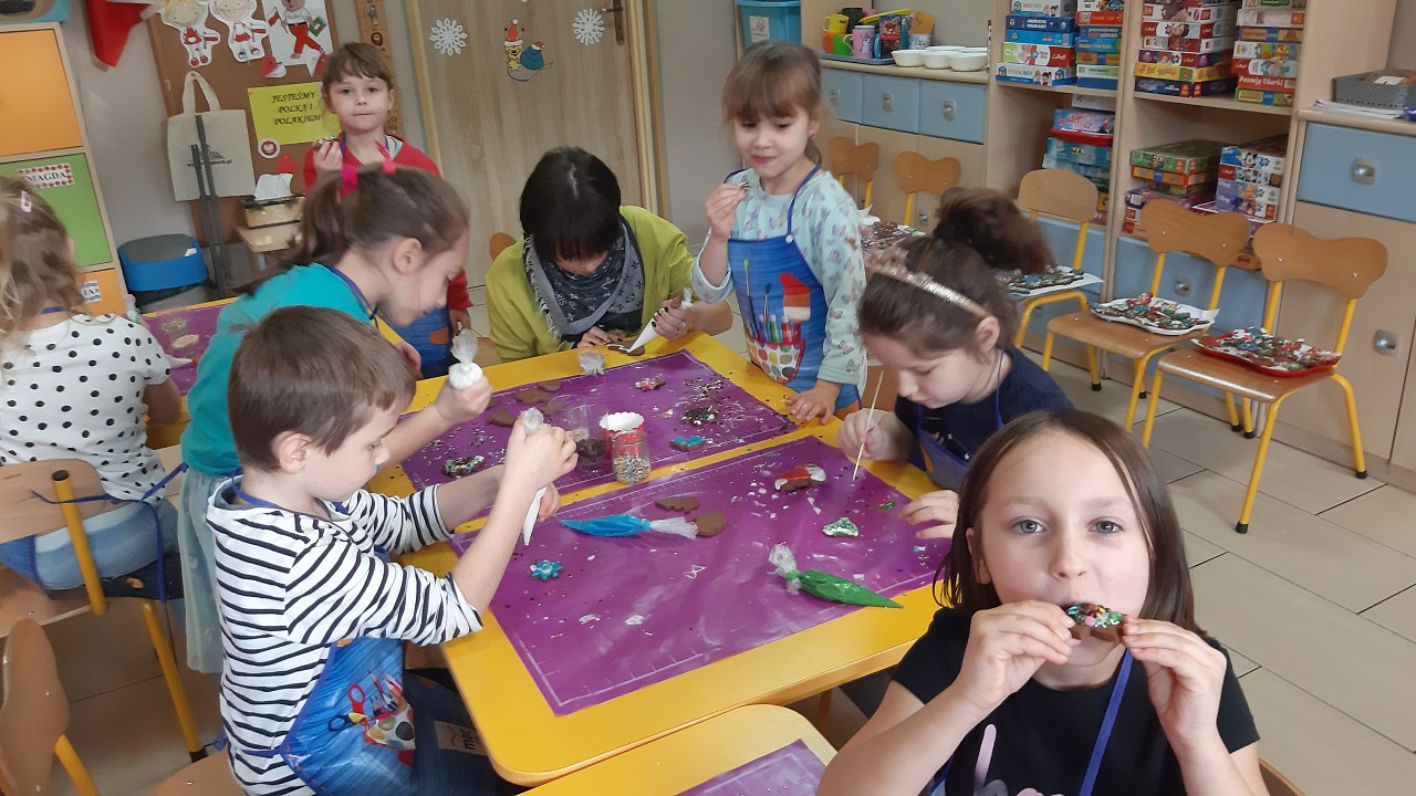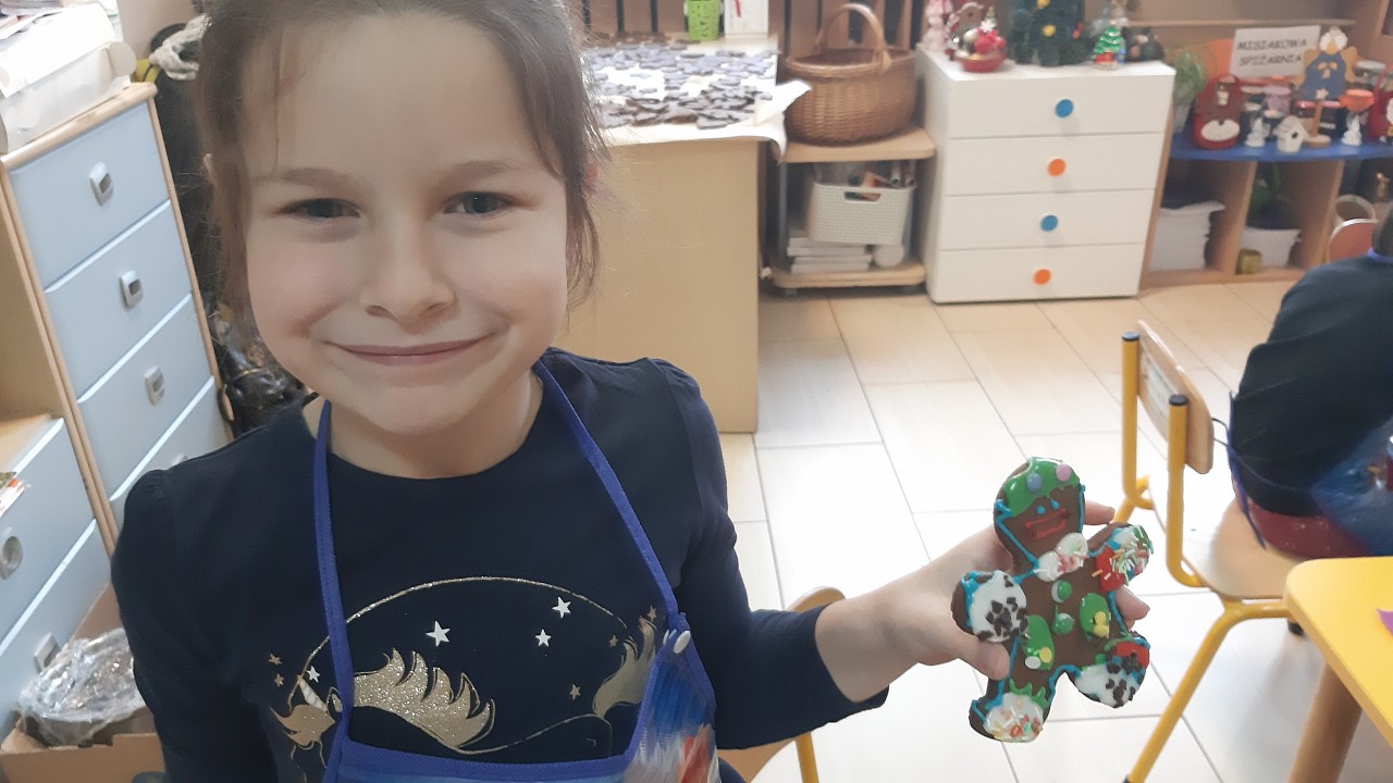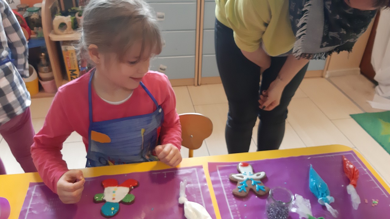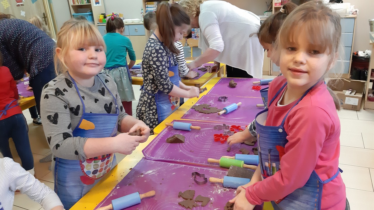 Aby poczuć magię nadchodzących świąt, MISIAKI we wtorek urządziły sobie wielkie pieczenie pierniczków świątecznych. A to wszystko dzięki mamie Majeczki Brodalskiej ze SŁODKIEGO ZAKĄTKA, która przyniosła już gotowe ciasto piernikowe. Największą frajdę sprawiło dzieciom wałkowanie ciasta i wycinanie różnych kształtów foremkami. Później nasze pierniczki zostały upieczone, a ich aromatyczny zapach roznosił się po całym przedszkolu. Pozostało jeszcze je ozdobić lukrem oraz kolorowymi posypkami i gotowe. Zabawa była doskonała, a udekorowane pierniczki wyglądały bardzo ładnie i pysznie.