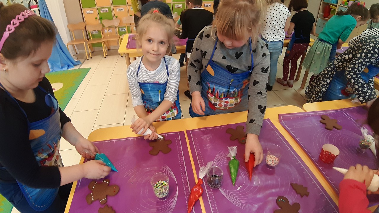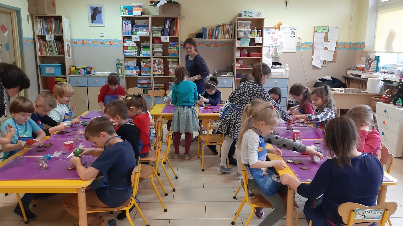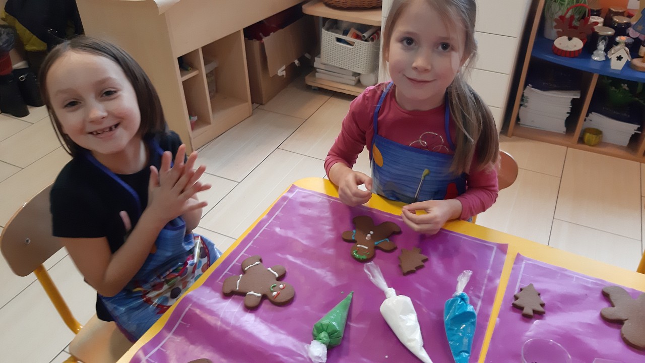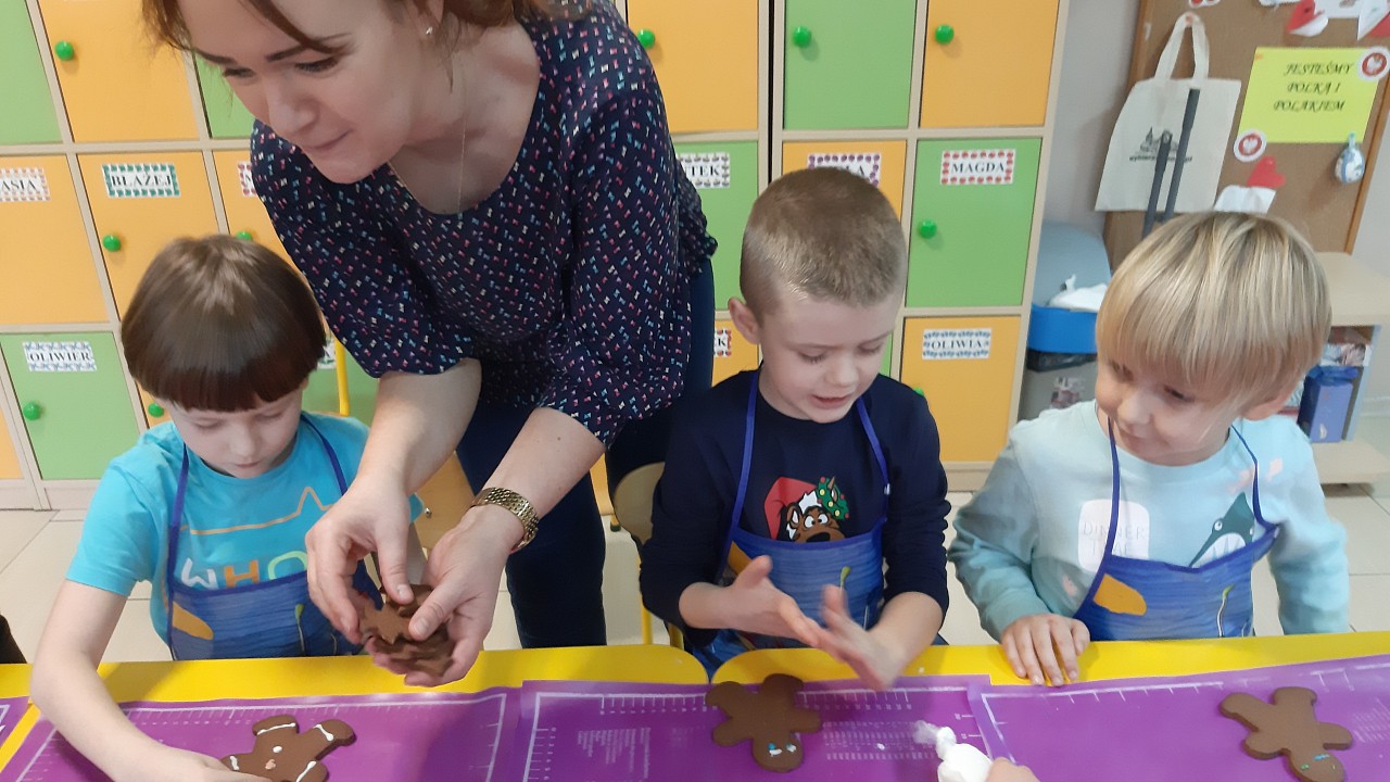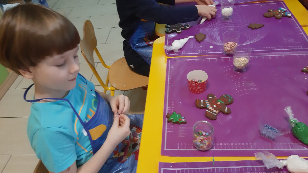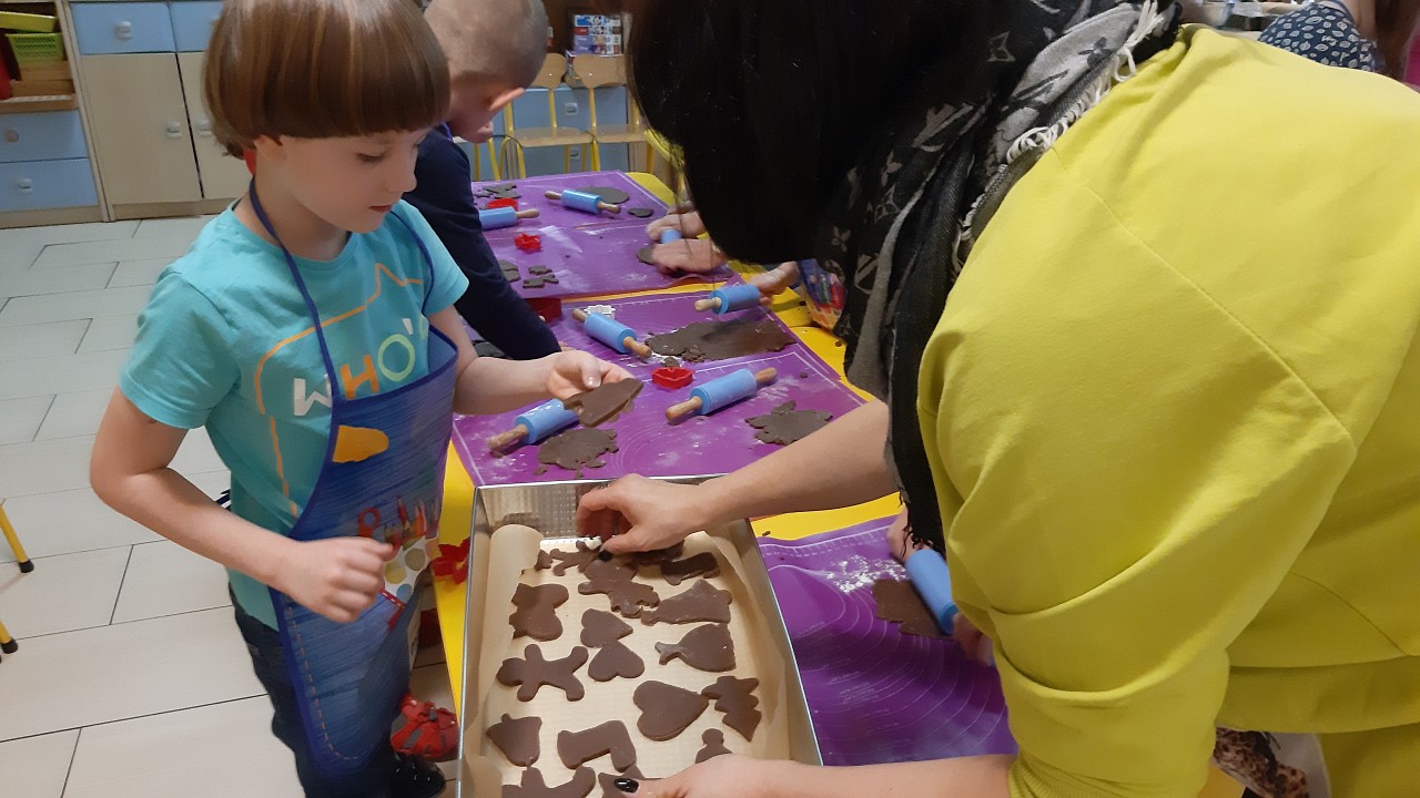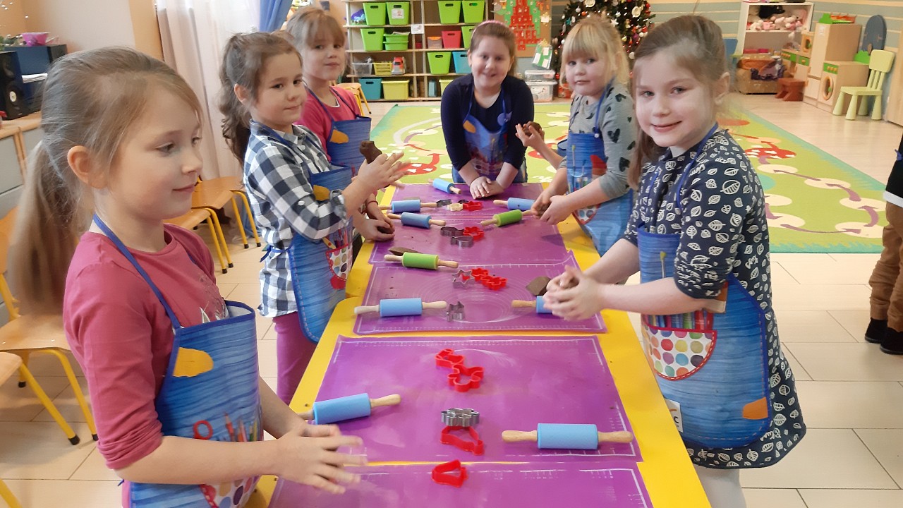 Aby poczuć magię nadchodzących świąt, MISIAKI we wtorek urządziły sobie wielkie pieczenie pierniczków świątecznych. A to wszystko dzięki mamie Majeczki Brodalskiej ze SŁODKIEGO ZAKĄTKA, która przyniosła już gotowe ciasto piernikowe. Największą frajdę sprawiło dzieciom wałkowanie ciasta i wycinanie różnych kształtów foremkami. Później nasze pierniczki zostały upieczone, a ich aromatyczny zapach roznosił się po całym przedszkolu. Pozostało jeszcze je ozdobić lukrem oraz kolorowymi posypkami i gotowe. Zabawa była doskonała, a udekorowane pierniczki wyglądały bardzo ładnie i pysznie.