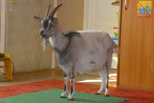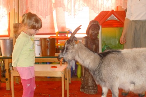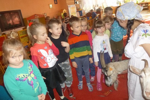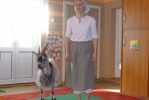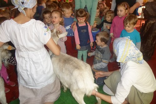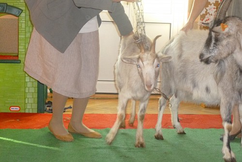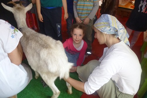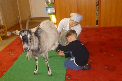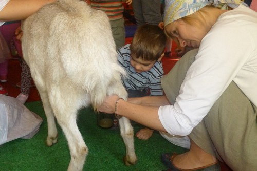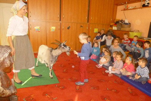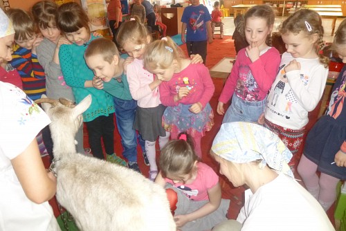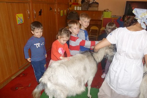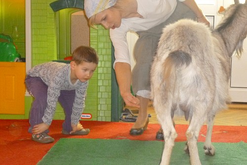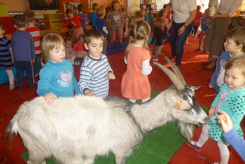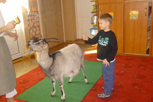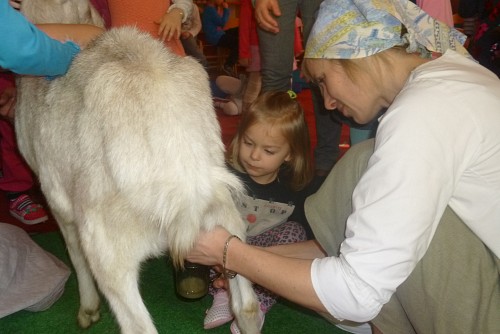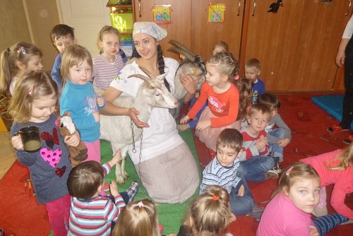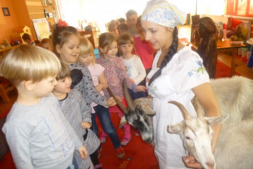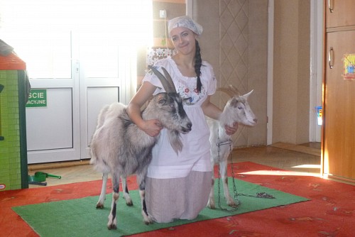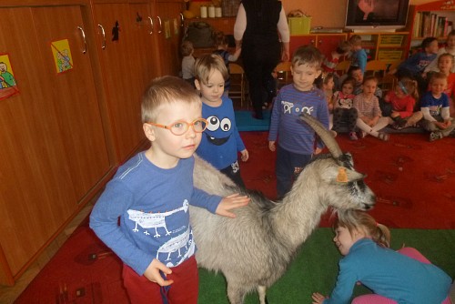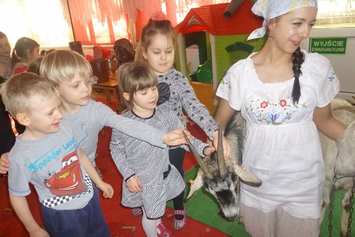 Niezwykłą atrakcją dla wszystkich było spotkanie z kozą Magdą oraz jej młodszą koleżanką Elą. Przedszkolaki z bliska poznały te sympatyczne i pożyteczne zwierzęta. Mogły je poobserwować i pogłaskać. Koza Magda - piękna ,,aktorka\'\' naszego spotkania, pod czujnym okiem właścicielek, pozwoliła nawet śmiałkom - przedszkolakom na wydojenie się. Były to ekscytujące chwile, które zapewne na długo zapadną dzieciom w pamięci.
