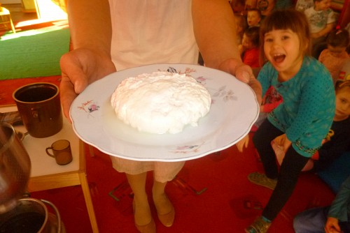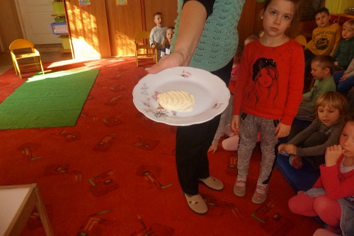 Radości nie było końca, a gdy przedszkolaki pożegnały kozy, zasiadły do degustacji swojskiego twarogu oraz chlebka z pysznym i świeżym masełkiem, które powstało właśnie w czasie naszego edukacyjnego spotkania.