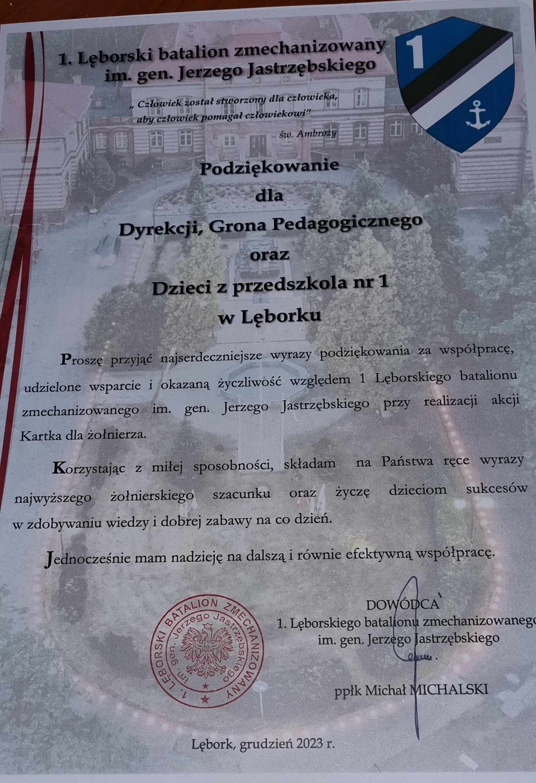 Po raz pierwszy w historii naszego przedszkola wzięliśmy udział w akcji KARTKA DLA ŻOŁNIERZA. Dzieci wspólnie z nauczycielkami wykonały przepiękne świąteczne kartki, do których zostały dołączone wzruszające życzenia. Za pośrednictwem Dowództwa 1. Lęborskiego batalionu zmechanizowanego im. gen. Jerzego Jastrzębskiego zostały one przekazane żołnierzom służącym na granicy naszego kraju.
