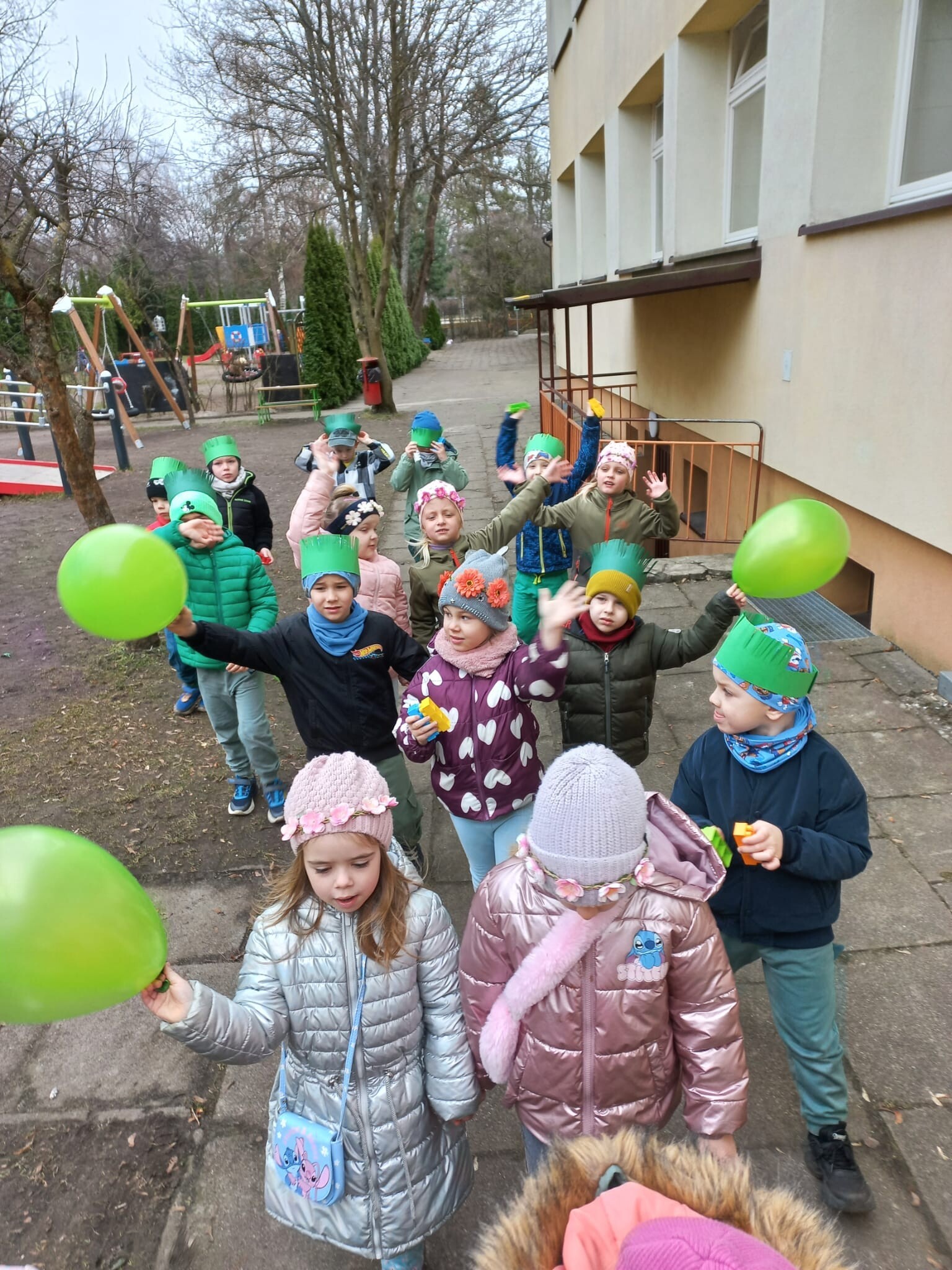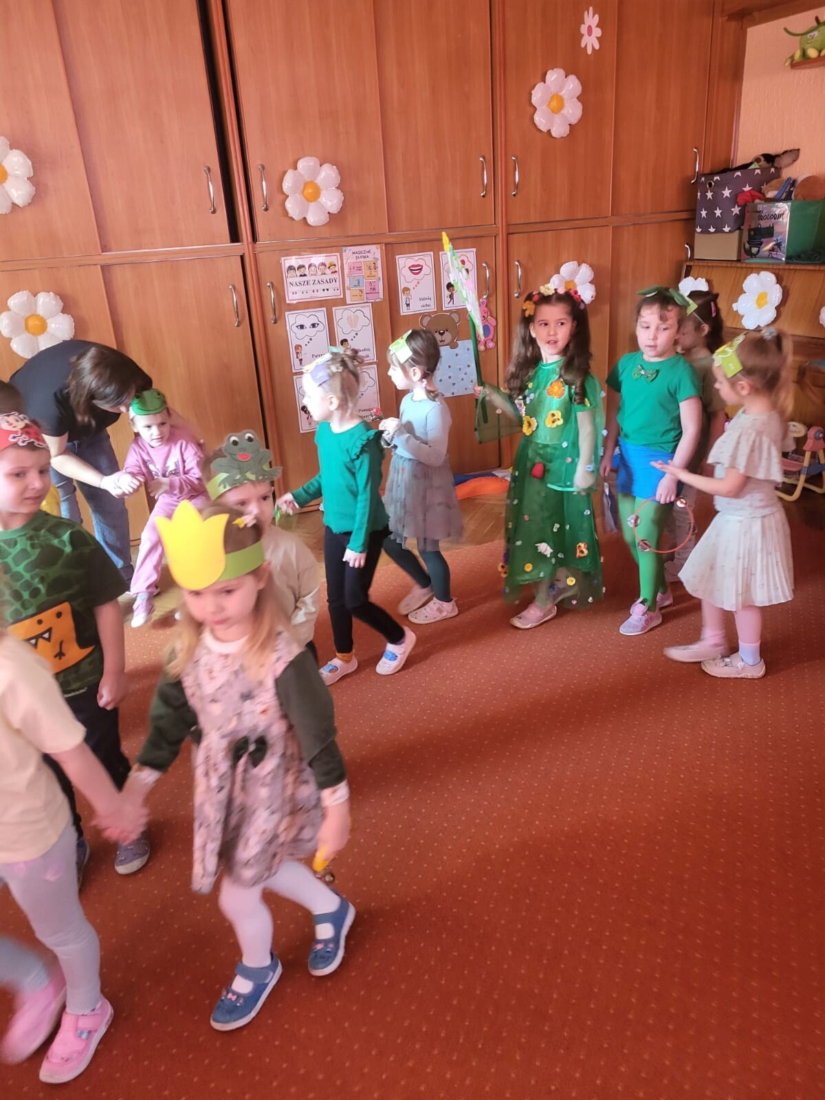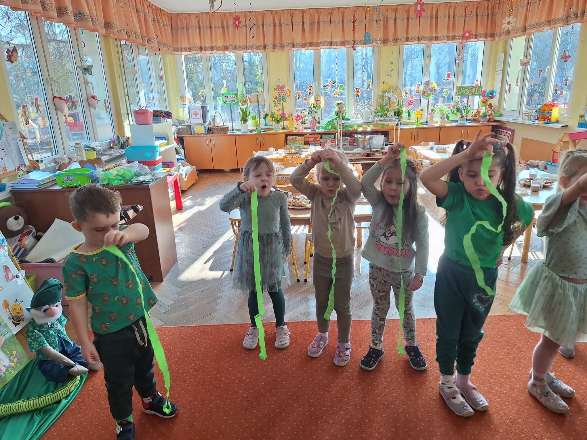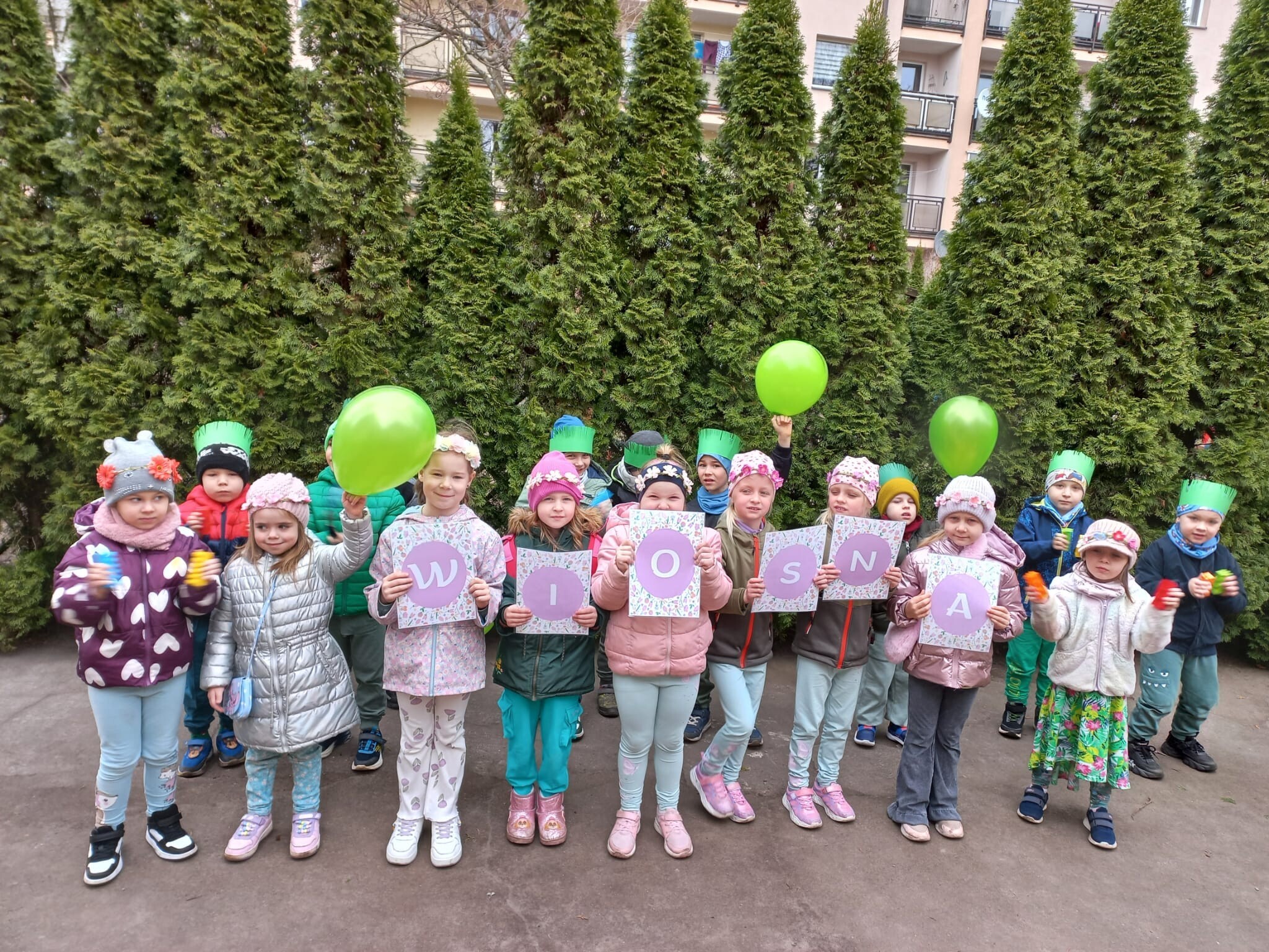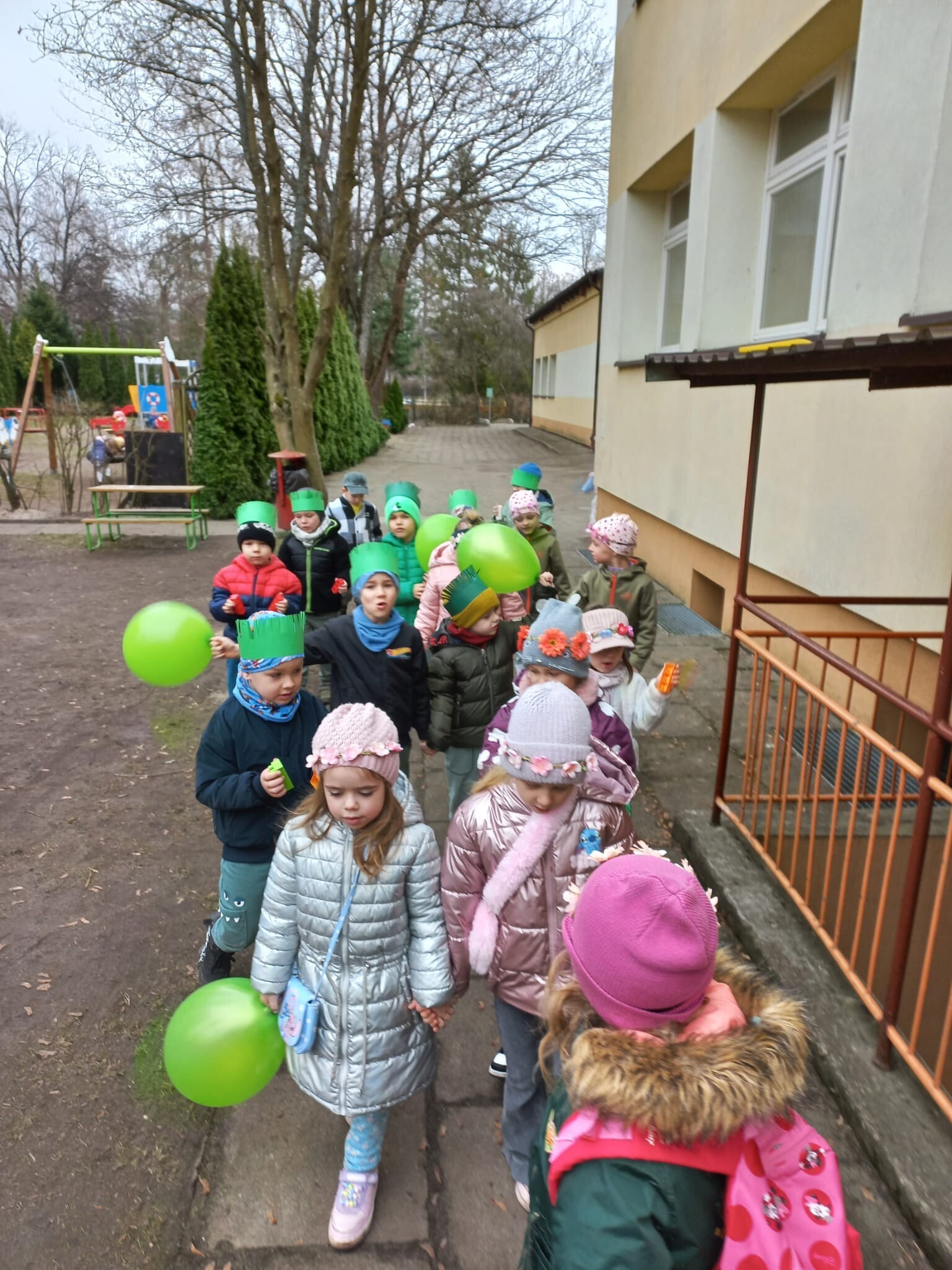 Tego dnia tradycyjnie - wszystkie przedszkolaki przyszły do przedszkola ubrane na zielono. Było baaardzo wesoło. Zabawy tematyczne zorganizowane z okazji zbliżającej się wiosny, sprawiły wszystkim wiele radości. Na uwagę zasługuje przedstawienie wiosenne w wykonaniu nauczycielek grup najmłodszych pt.,, Przyjście wiosny ''. Przedszkolaki odbyły również spacer po korytarzach przedszkola, ogrodu przedszkolnego oraz pobliskiego parku, który połączony był z poszukiwaniem śladów zostawionych przez Panią Wiosnę. Starszaki Marzanną udały się na Plac Pokoju i następnie przemaszerowały ulicą Staromiejską, zbierając od przechodniów nagromadzoną przez cały rok złą energię. Później wraz z Marzanną popłynęła ona do morza. Oczywiście nie zabrakło śpiewu oraz chóralnego odganiania zimy.