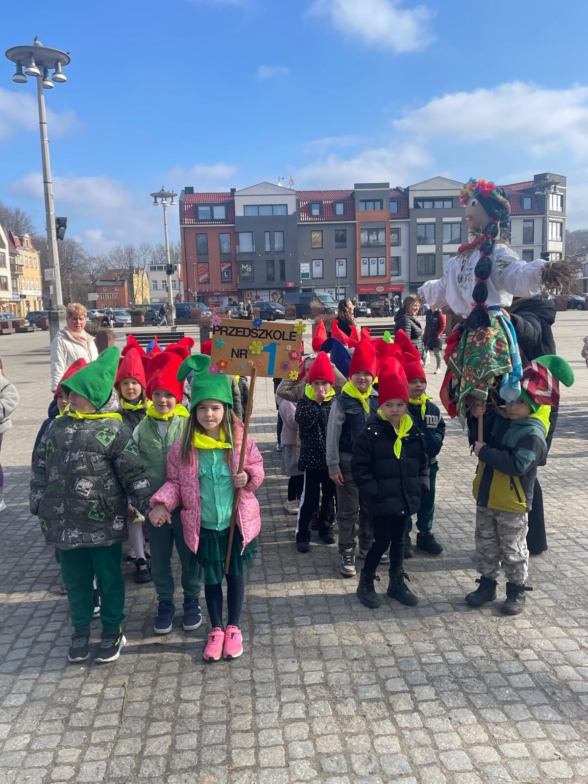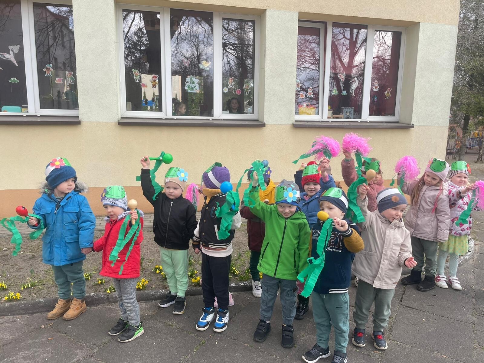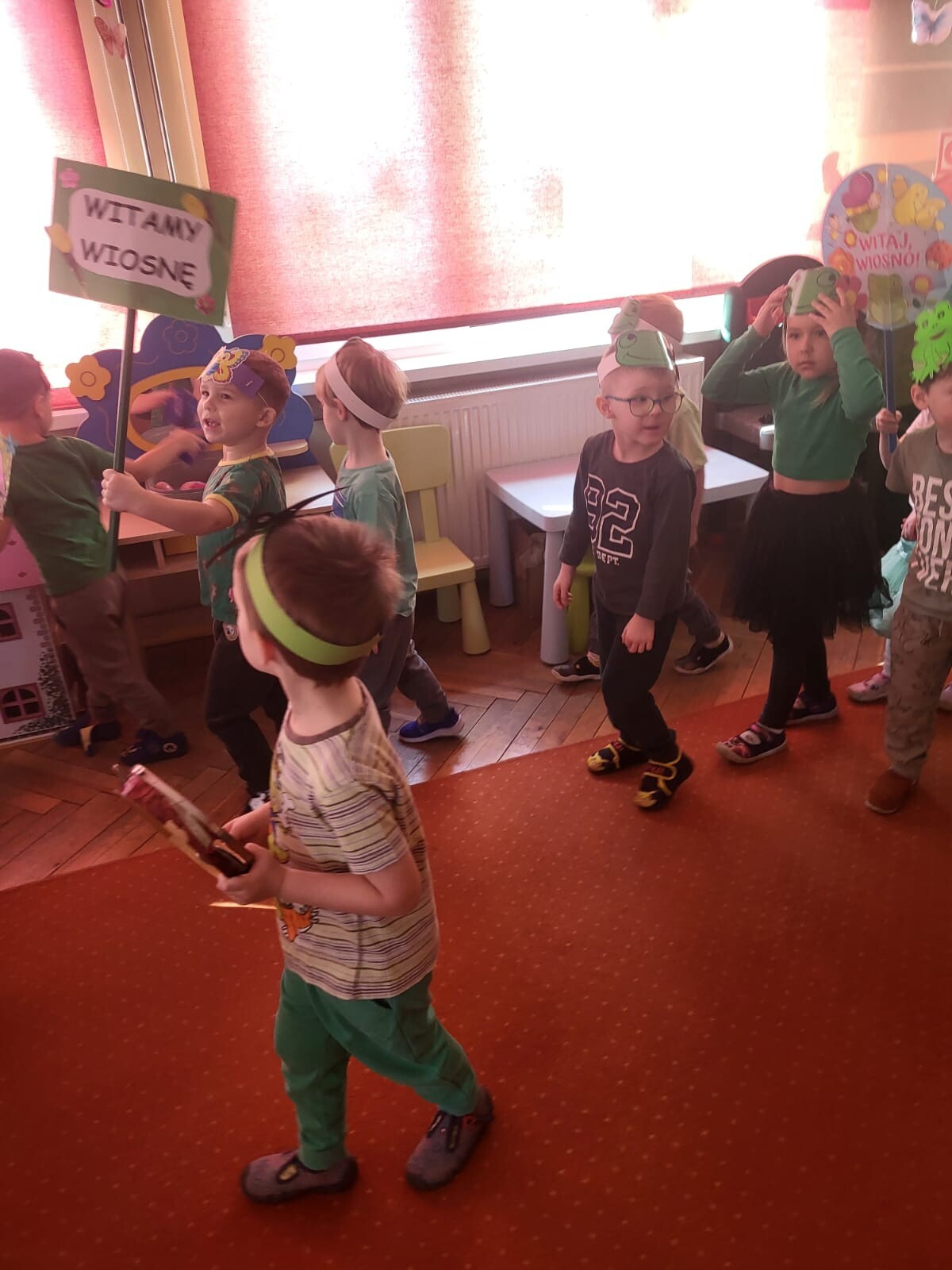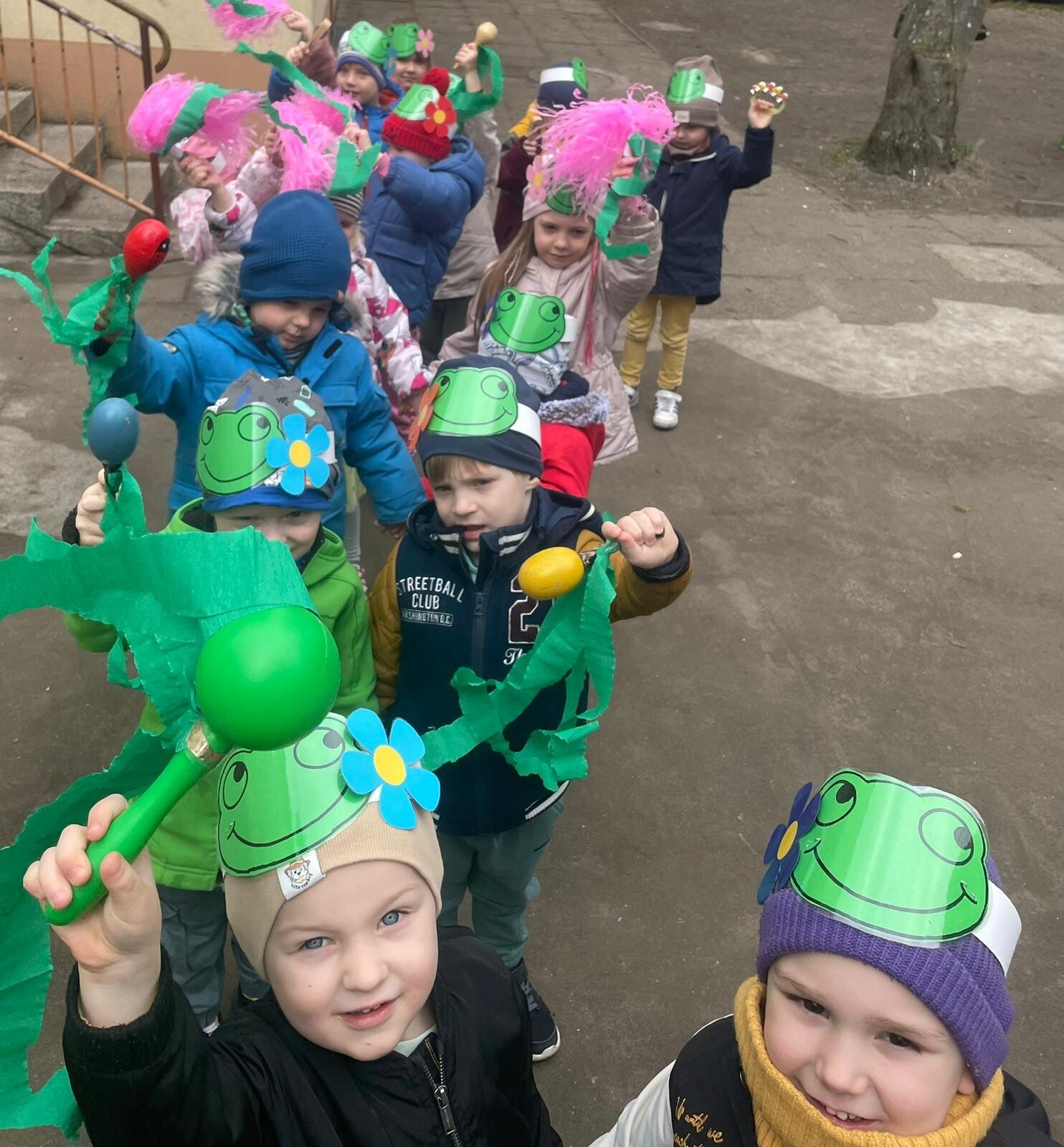 Tego dnia tradycyjnie - wszystkie przedszkolaki przyszły do przedszkola ubrane na zielono. Było baaardzo wesoło. Zabawy tematyczne zorganizowane z okazji zbliżającej się wiosny, sprawiły wszystkim wiele radości. Na uwagę zasługuje przedstawienie wiosenne w wykonaniu nauczycielek grup najmłodszych pt.,, Przyjście wiosny ''. Przedszkolaki odbyły również spacer po korytarzach przedszkola, ogrodu przedszkolnego oraz pobliskiego parku, który połączony był z poszukiwaniem śladów zostawionych przez Panią Wiosnę. Starszaki Marzanną udały się na Plac Pokoju i następnie przemaszerowały ulicą Staromiejską, zbierając od przechodniów nagromadzoną przez cały rok złą energię. Później wraz z Marzanną popłynęła ona do morza. Oczywiście nie zabrakło śpiewu oraz chóralnego odganiania zimy.