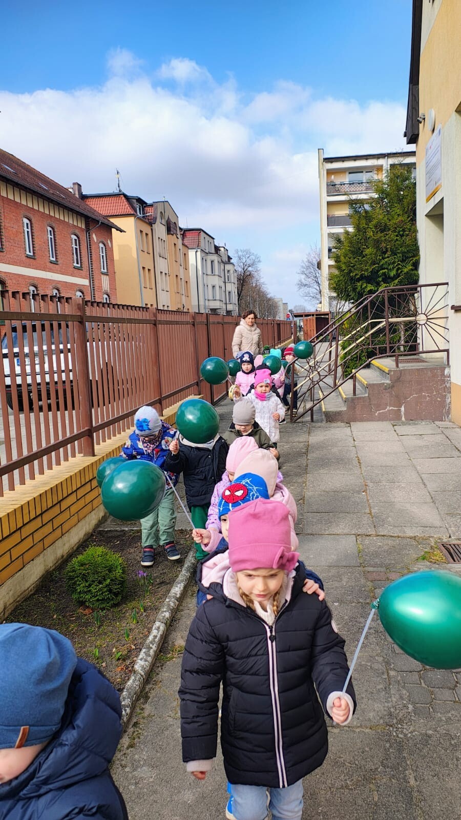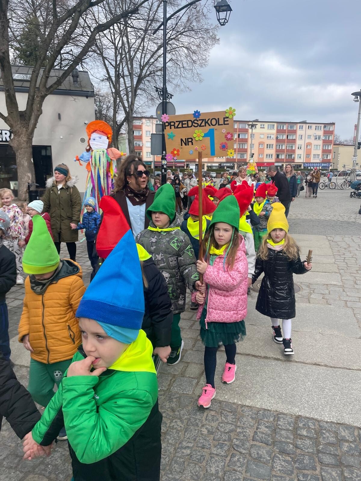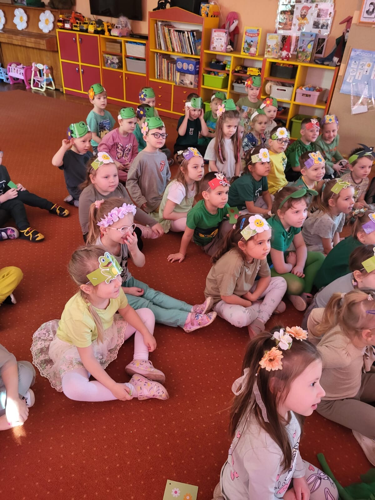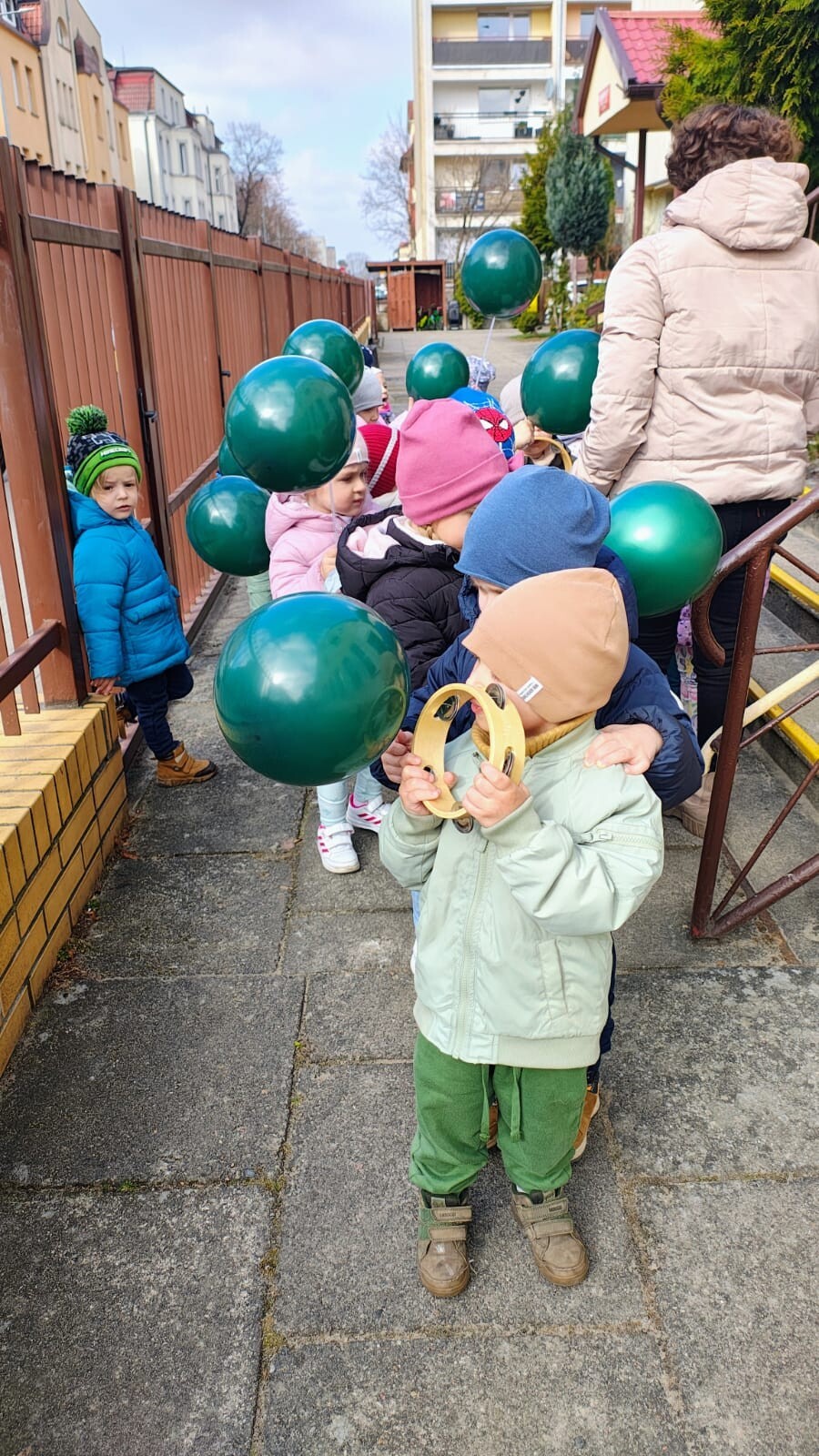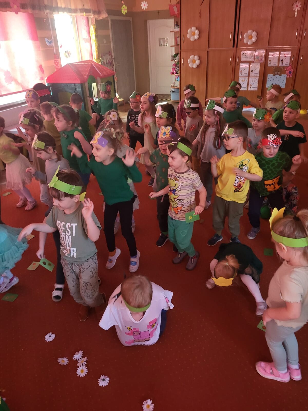 Tego dnia tradycyjnie - wszystkie przedszkolaki przyszły do przedszkola ubrane na zielono. Było baaardzo wesoło. Zabawy tematyczne zorganizowane z okazji zbliżającej się wiosny, sprawiły wszystkim wiele radości. Na uwagę zasługuje przedstawienie wiosenne w wykonaniu nauczycielek grup najmłodszych pt.,, Przyjście wiosny ''. Przedszkolaki odbyły również spacer po korytarzach przedszkola, ogrodu przedszkolnego oraz pobliskiego parku, który połączony był z poszukiwaniem śladów zostawionych przez Panią Wiosnę. Starszaki Marzanną udały się na Plac Pokoju i następnie przemaszerowały ulicą Staromiejską, zbierając od przechodniów nagromadzoną przez cały rok złą energię. Później wraz z Marzanną popłynęła ona do morza. Oczywiście nie zabrakło śpiewu oraz chóralnego odganiania zimy.