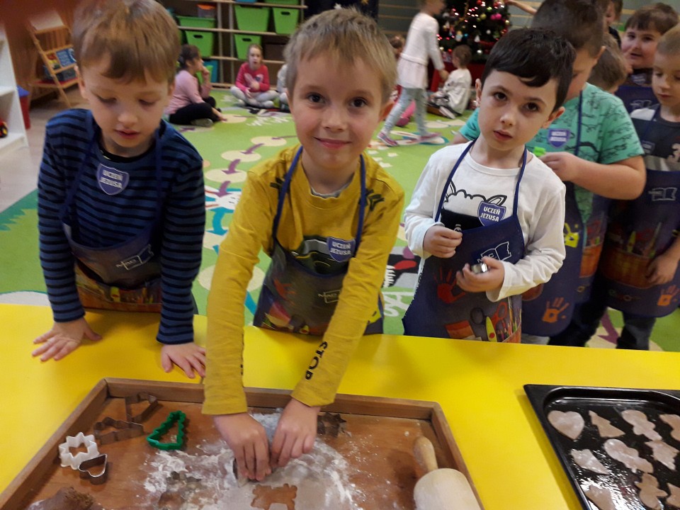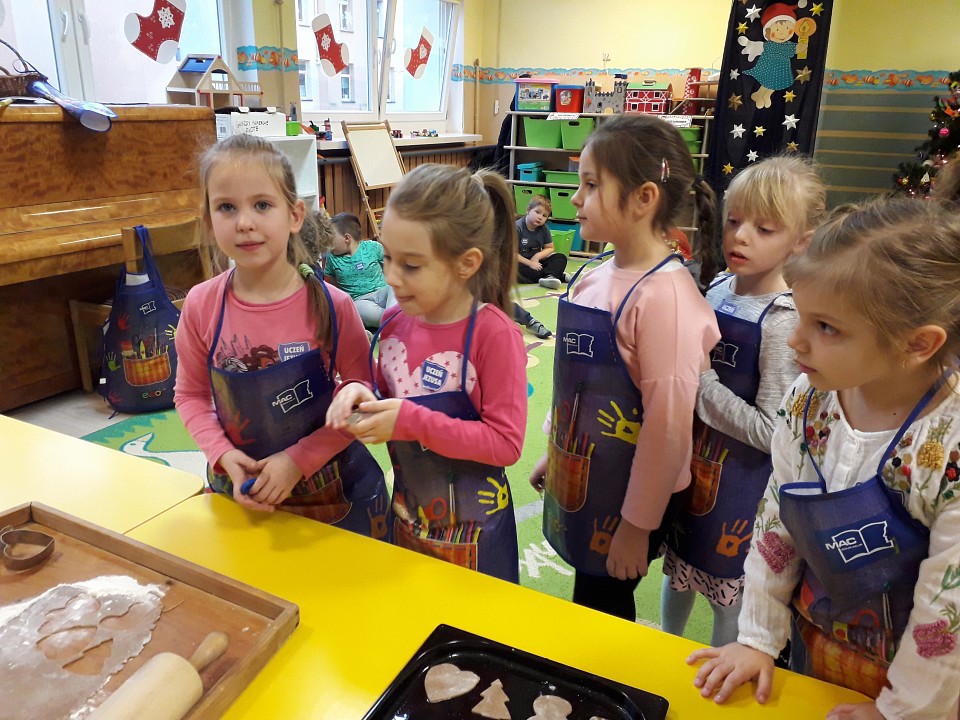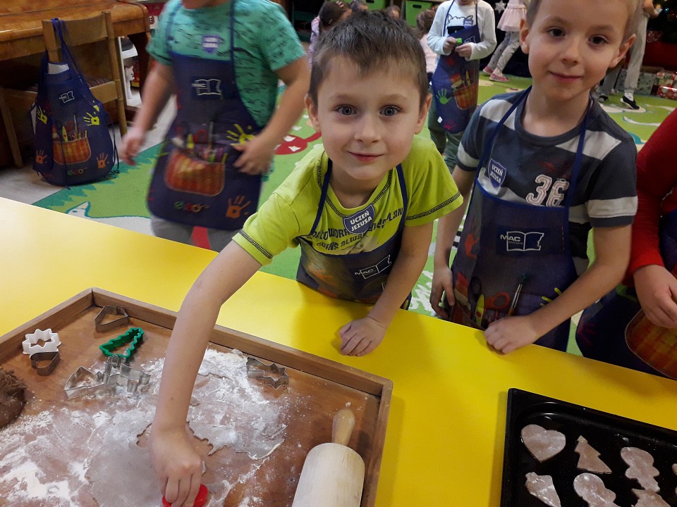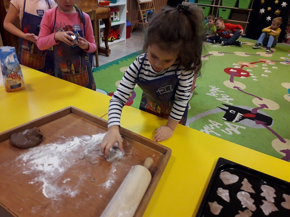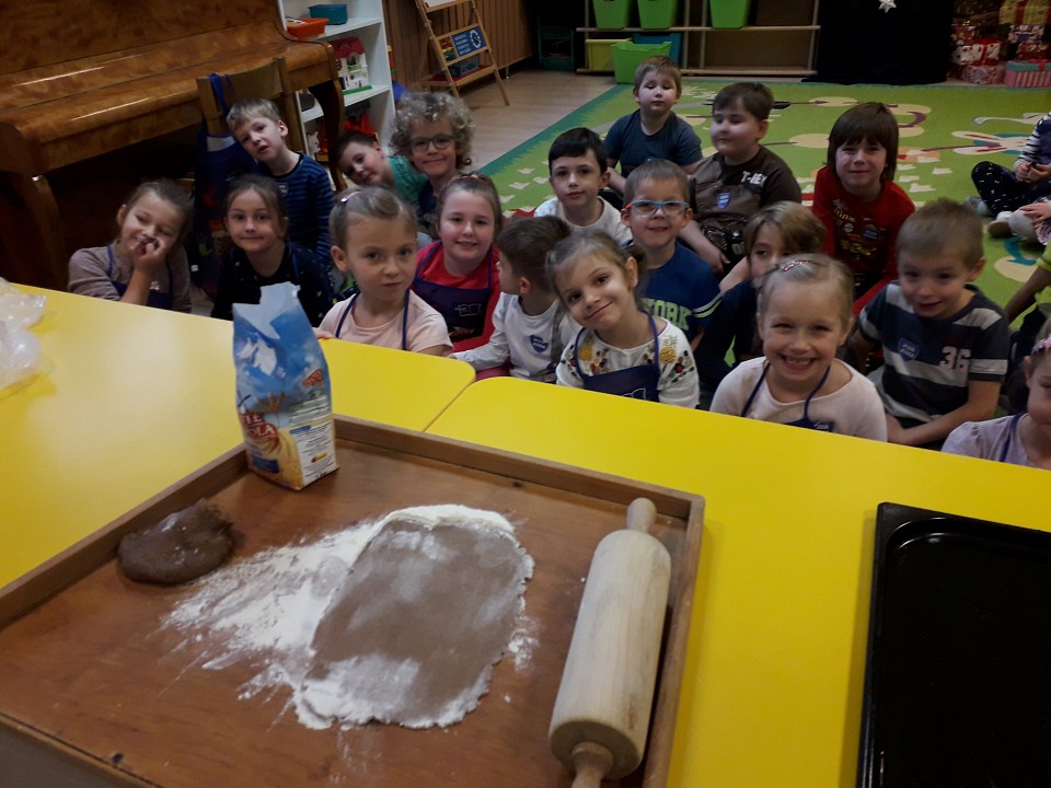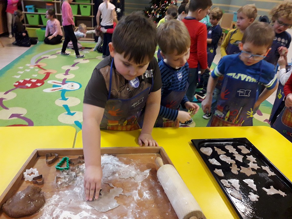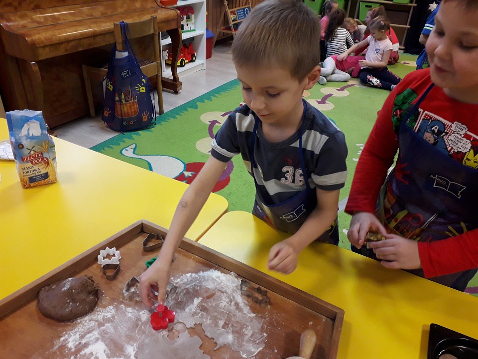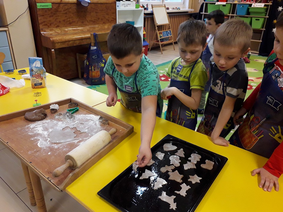 Aby poczuć magię nadchodzących świąt, Słoneczka urządziły sobie wielkie pieczenie pierniczków świątecznych. Najpierw przedszkolaki zapoznały się z przepisem i potrzebnymi składnikami, następnie wsypywały je do miski i z pomocą swojej pani zagniatały ciasto. Jednak największą frajdę sprawiło im wałkowanie ciasta i wycinanie różnych kształtów foremkami. Później nasze pierniczki zostały upieczone, a ich aromatyczny zapach roznosił się po całym przedszkolu. Pozostało jeszcze je ozdobić lukrem oraz kolorowymi posypkami i gotowe. Takie zajęcia bardzo spodobały się dzieciom, sprawiły wiele radości oraz rozbudziły potrzebę poznawczą.