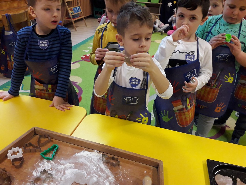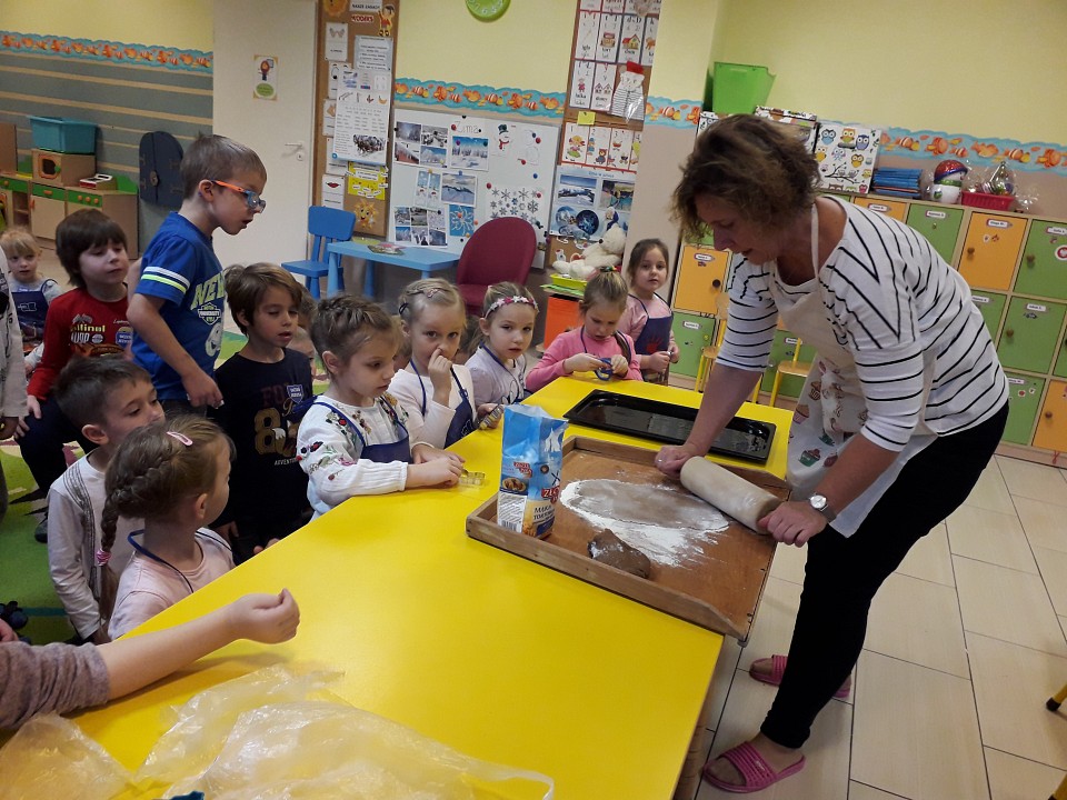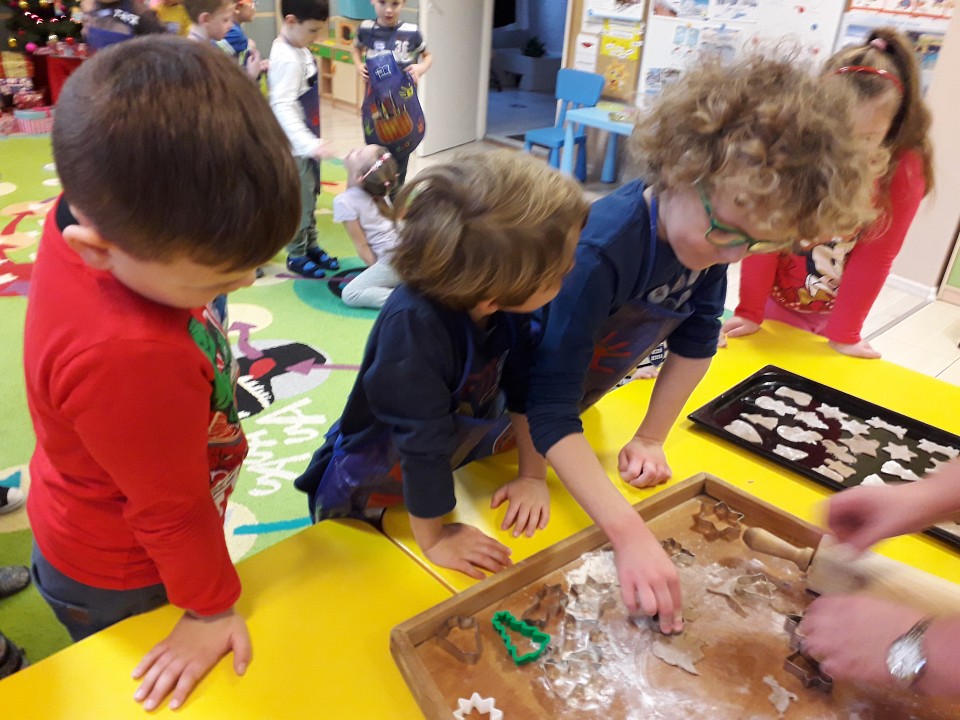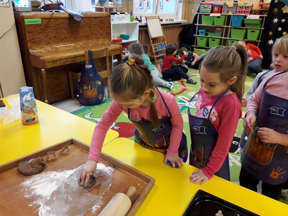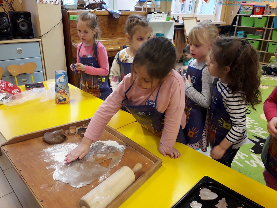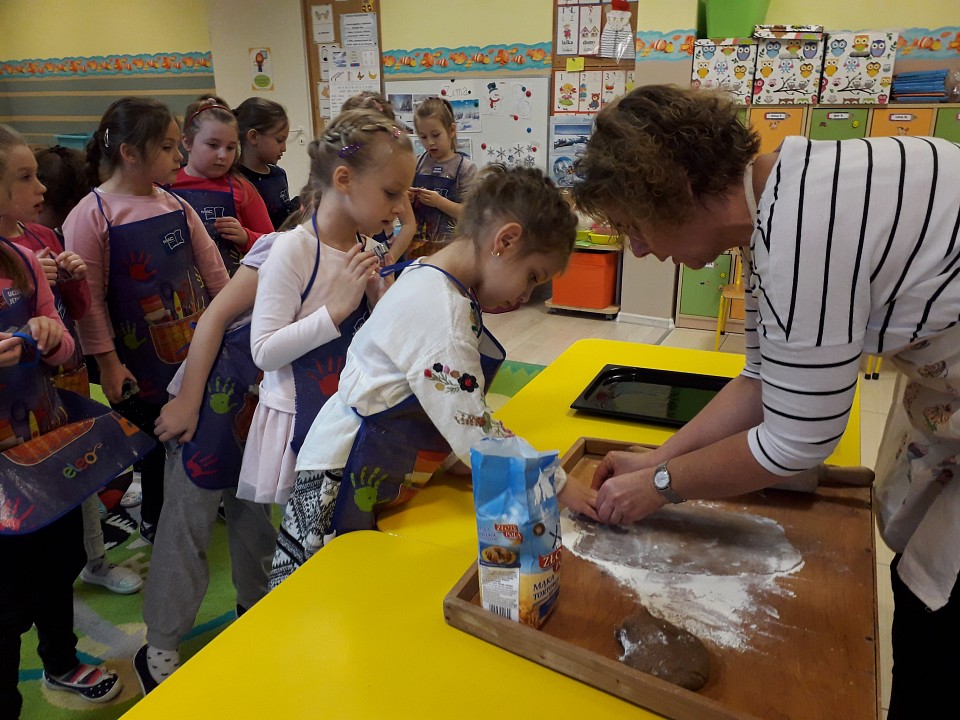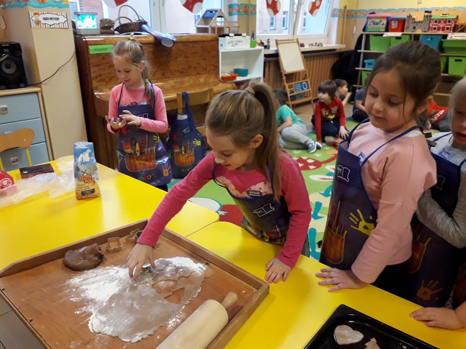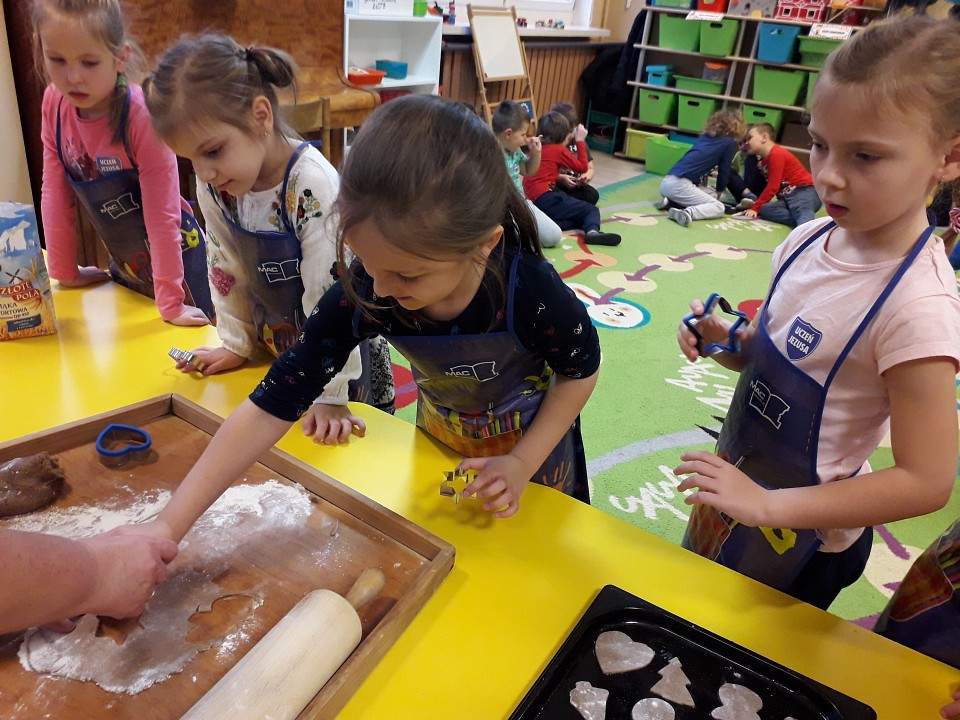 Aby poczuć magię nadchodzących świąt, Słoneczka urządziły sobie wielkie pieczenie pierniczków świątecznych. Najpierw przedszkolaki zapoznały się z przepisem i potrzebnymi składnikami, następnie wsypywały je do miski i z pomocą swojej pani zagniatały ciasto. Jednak największą frajdę sprawiło im wałkowanie ciasta i wycinanie różnych kształtów foremkami. Później nasze pierniczki zostały upieczone, a ich aromatyczny zapach roznosił się po całym przedszkolu. Pozostało jeszcze je ozdobić lukrem oraz kolorowymi posypkami i gotowe. Takie zajęcia bardzo spodobały się dzieciom, sprawiły wiele radości oraz rozbudziły potrzebę poznawczą.
