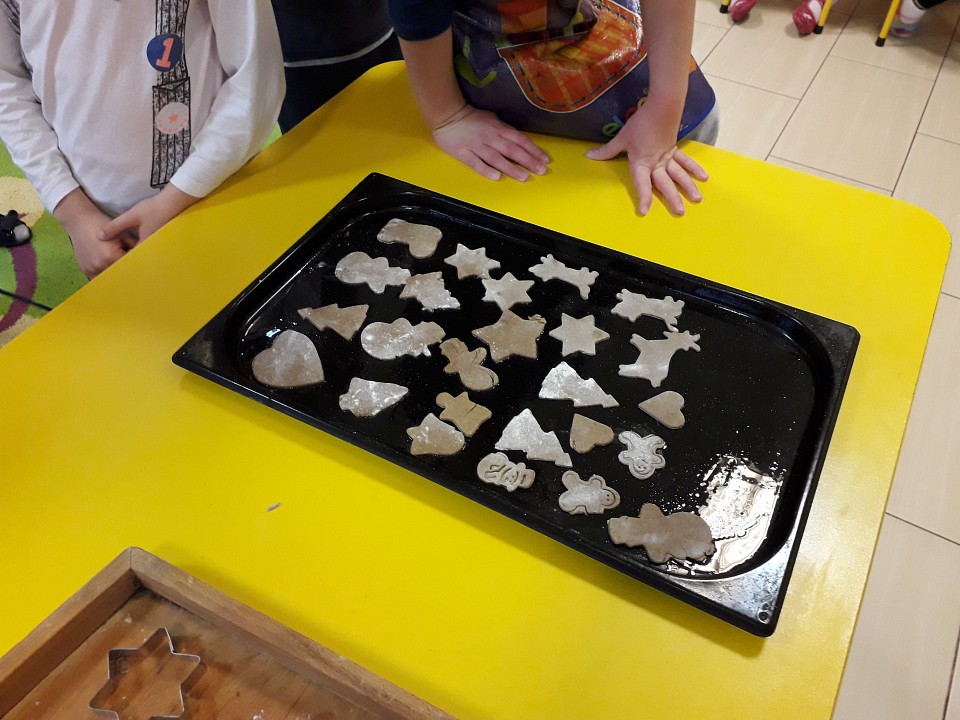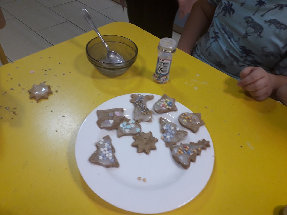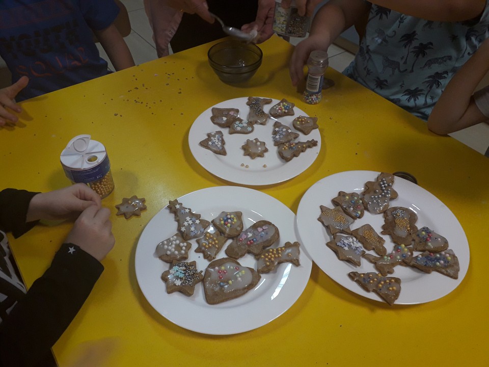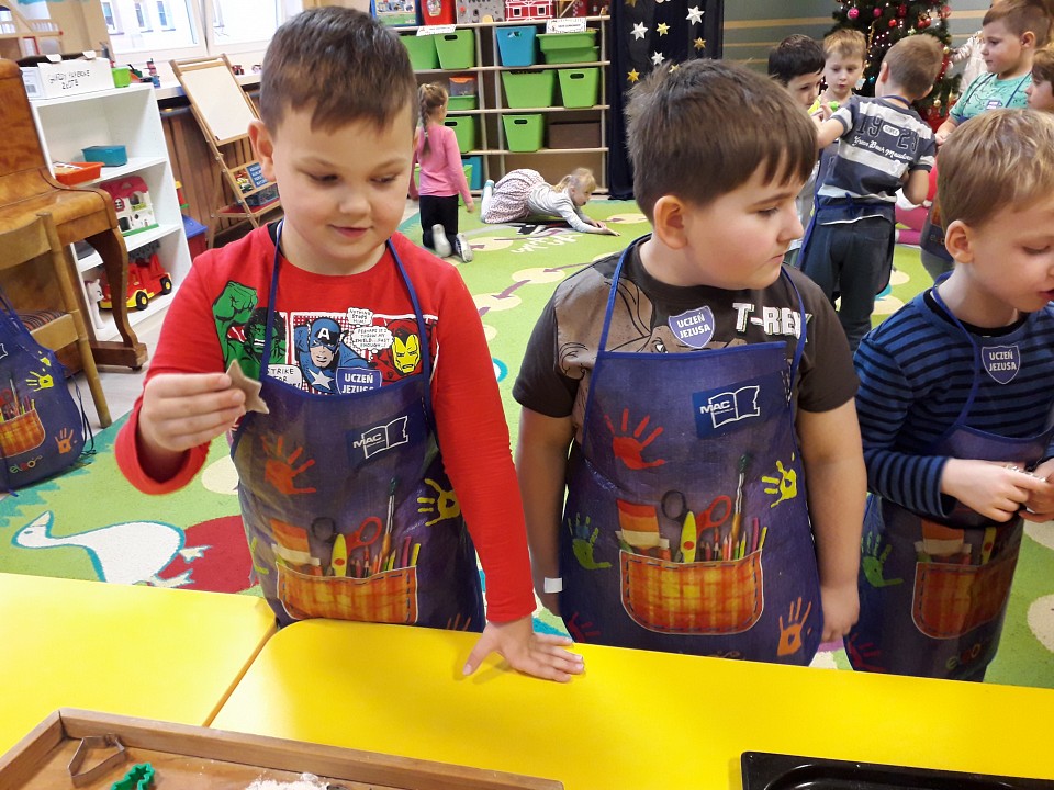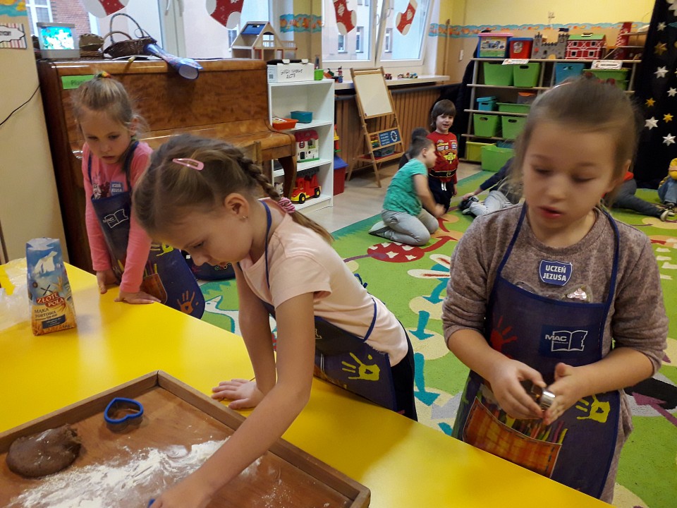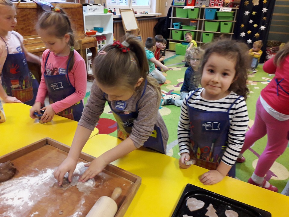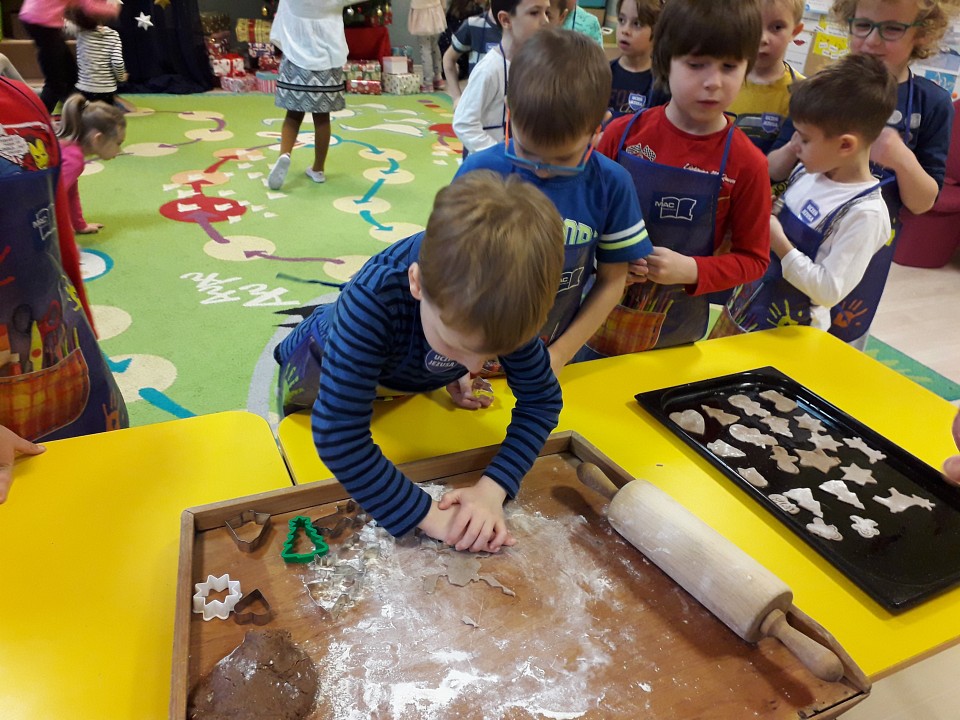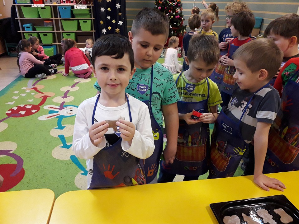 Aby poczuć magię nadchodzących świąt, Słoneczka urządziły sobie wielkie pieczenie pierniczków świątecznych. Najpierw przedszkolaki zapoznały się z przepisem i potrzebnymi składnikami, następnie wsypywały je do miski i z pomocą swojej pani zagniatały ciasto. Jednak największą frajdę sprawiło im wałkowanie ciasta i wycinanie różnych kształtów foremkami. Później nasze pierniczki zostały upieczone, a ich aromatyczny zapach roznosił się po całym przedszkolu. Pozostało jeszcze je ozdobić lukrem oraz kolorowymi posypkami i gotowe. Takie zajęcia bardzo spodobały się dzieciom, sprawiły wiele radości oraz rozbudziły potrzebę poznawczą.