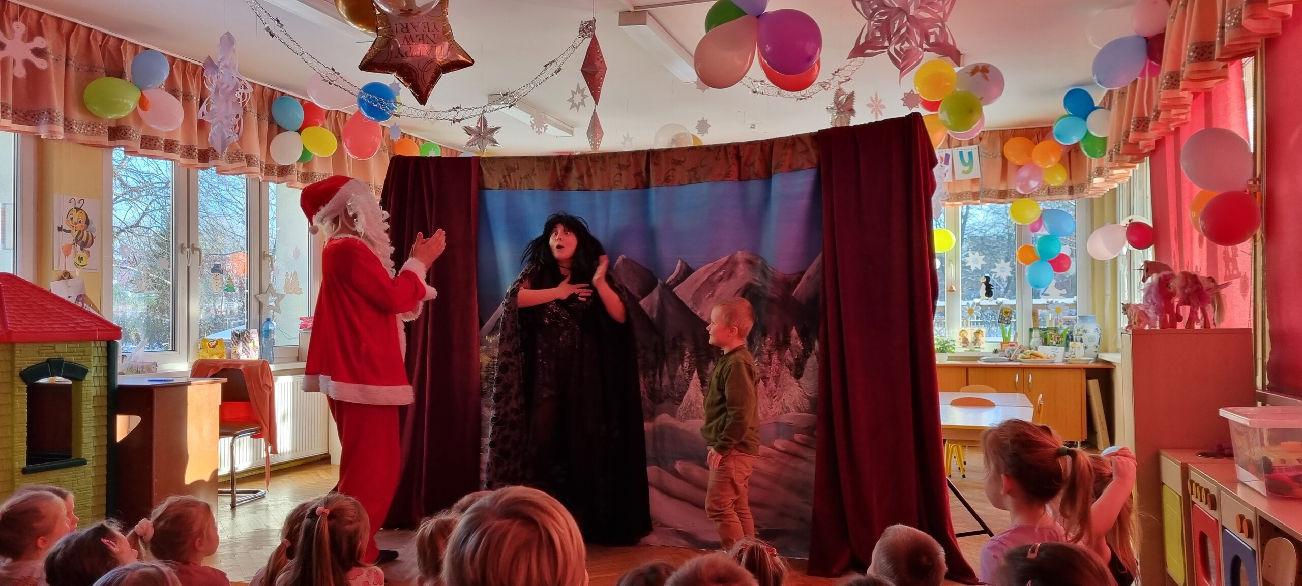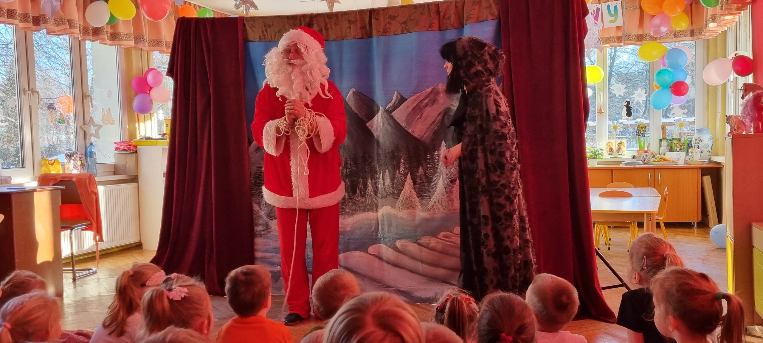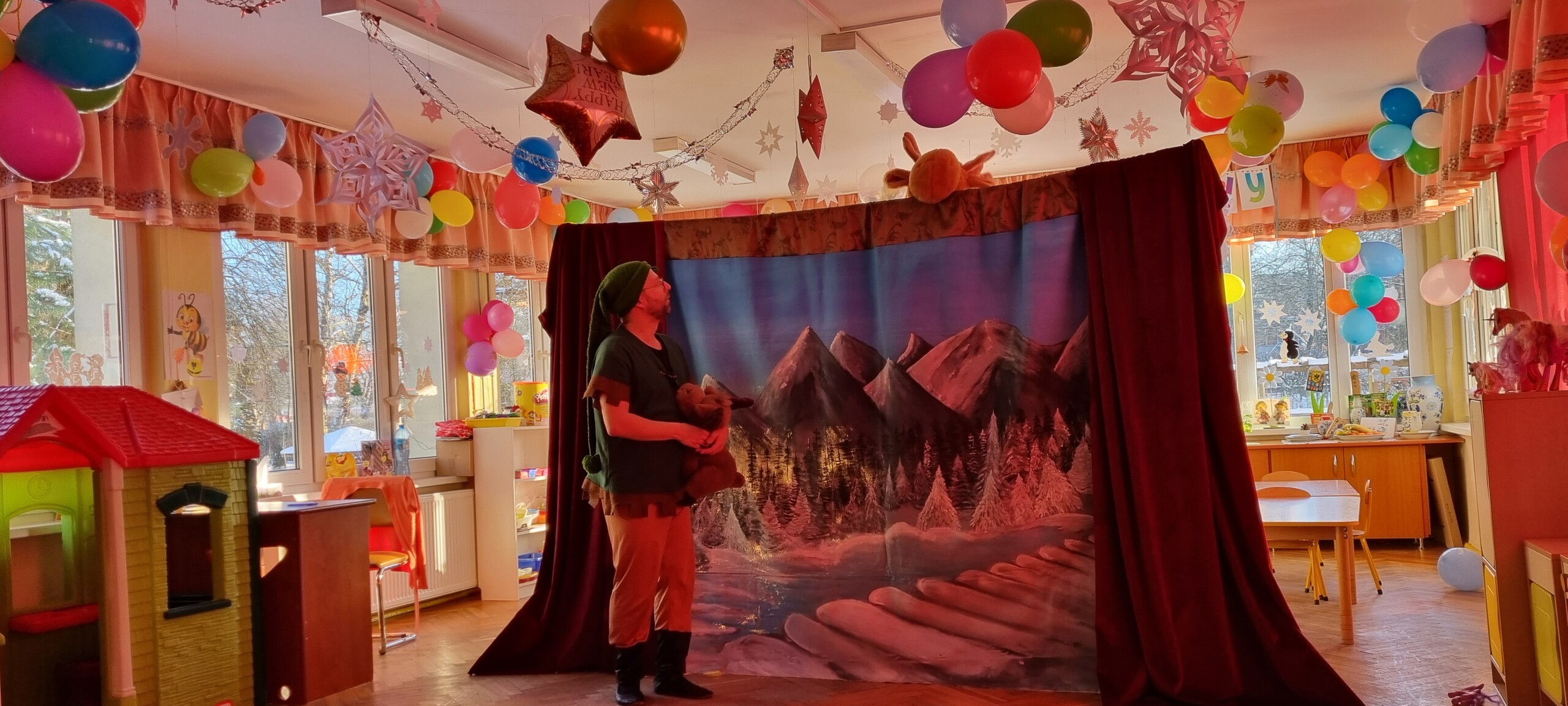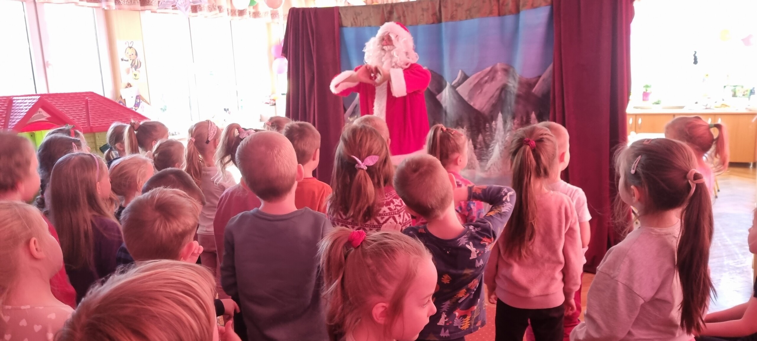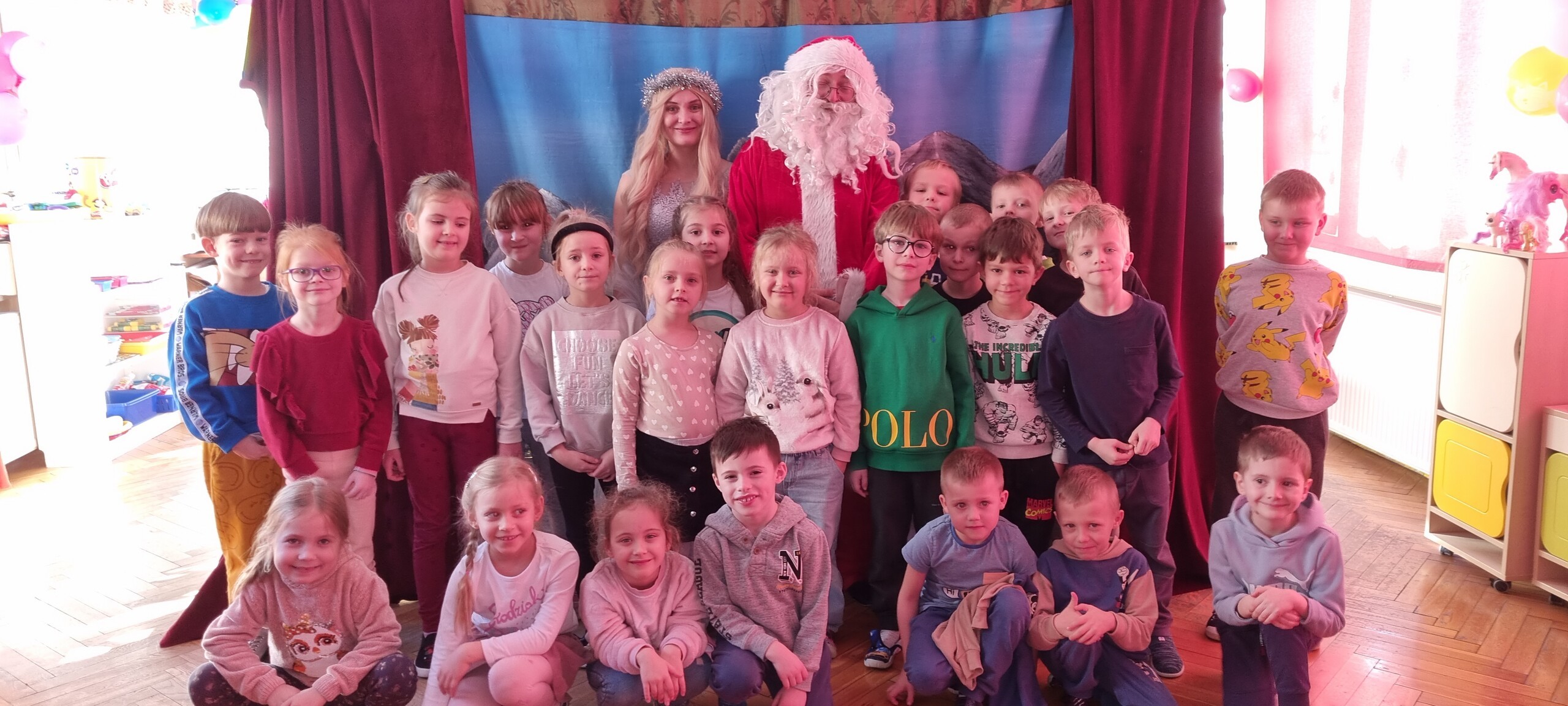 W poniedziałek 8 stycznia nasze przedszkole odwiedzili artyści z Teatru WIDOWISKO z Krakowa. Dzieci obejrzały przedstawienie świąteczne pt. ,, OPOWIEŚCI z LAPONII ''. Głównymi bohaterami był Elf i dziewczynka Zosia, którzy połączyli swoje siły w poszukiwaniu Mikołaja. Dzieci również wzięły aktywny udział w przedstawieniu, gdyż za sprawą serduszek przepełnionych miłością, udało się odnaleźć Świętego Mikołaja oraz magię Świąt.