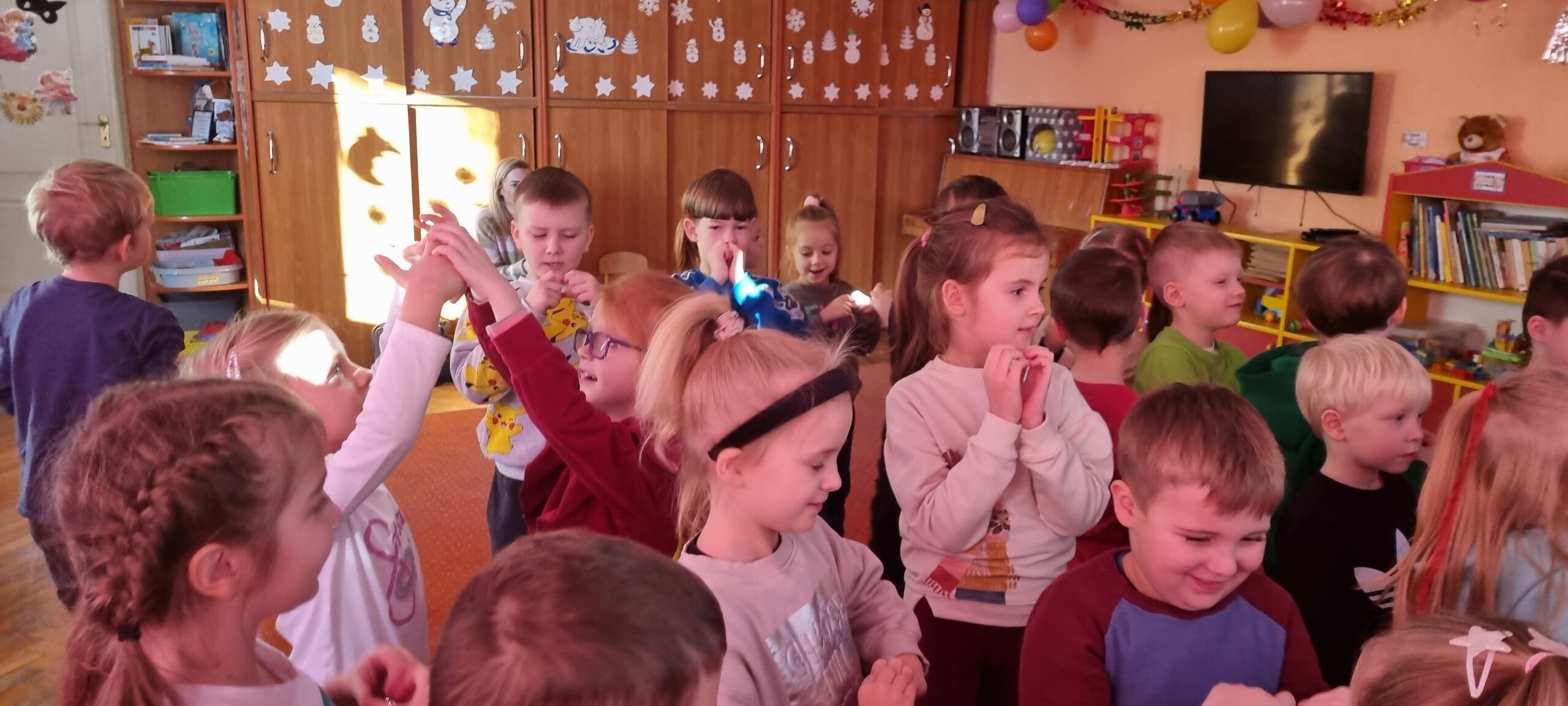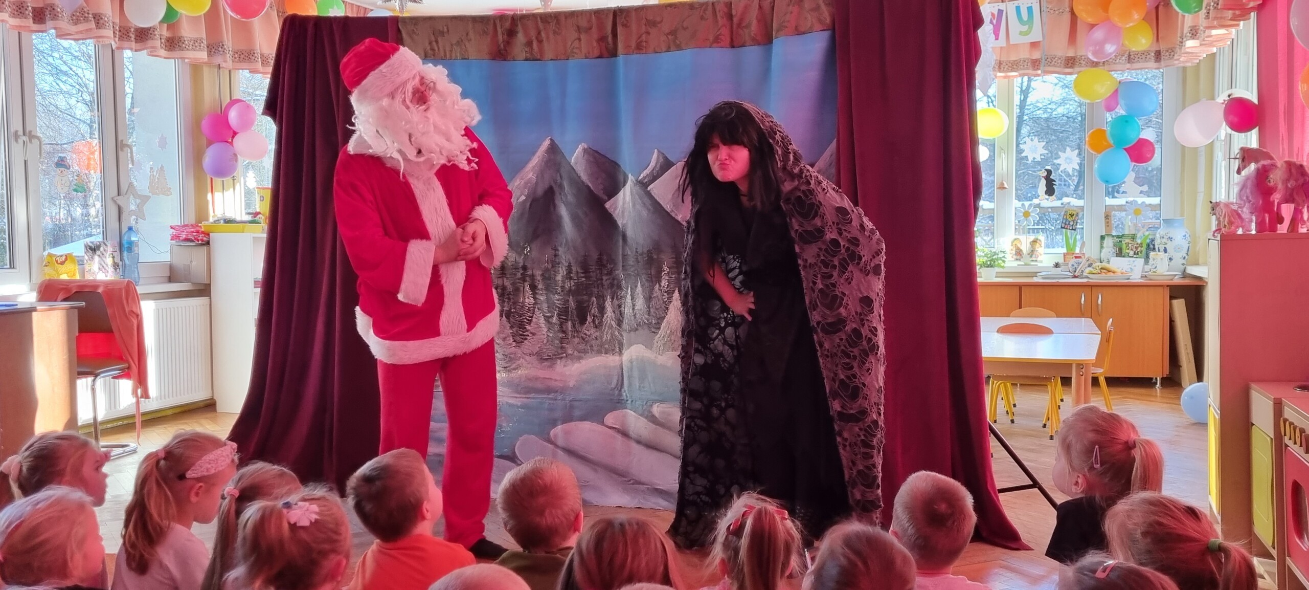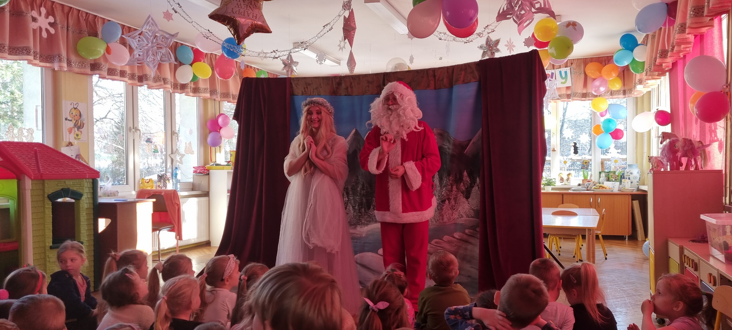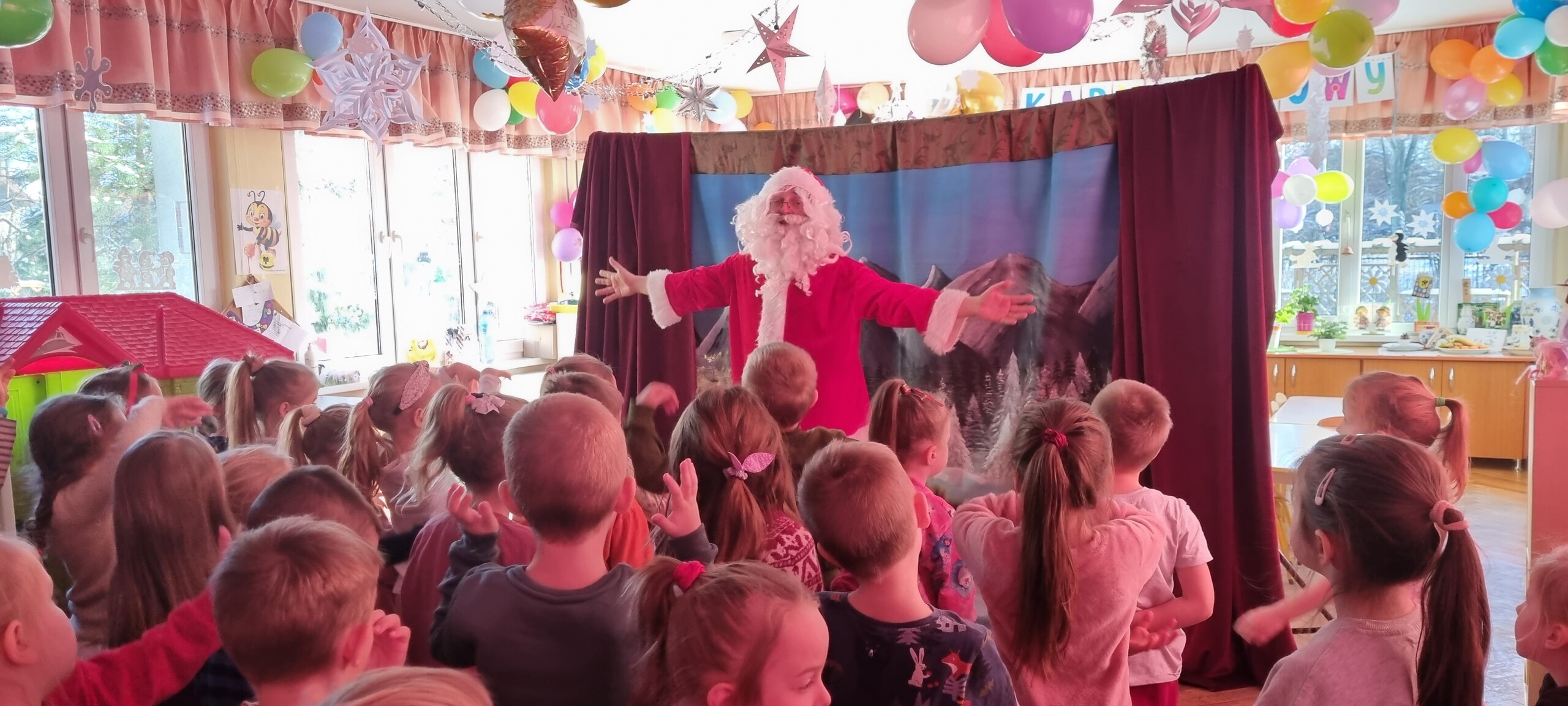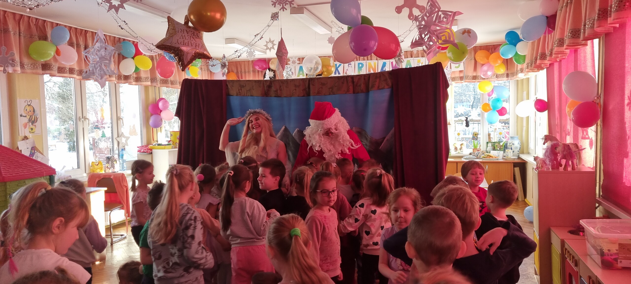 W poniedziałek 8 stycznia nasze przedszkole odwiedzili artyści z Teatru WIDOWISKO z Krakowa. Dzieci obejrzały przedstawienie świąteczne pt. ,, OPOWIEŚCI z LAPONII ''. Głównymi bohaterami był Elf i dziewczynka Zosia, którzy połączyli swoje siły w poszukiwaniu Mikołaja. Dzieci również wzięły aktywny udział w przedstawieniu, gdyż za sprawą serduszek przepełnionych miłością, udało się odnaleźć Świętego Mikołaja oraz magię Świąt.