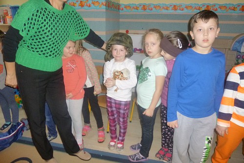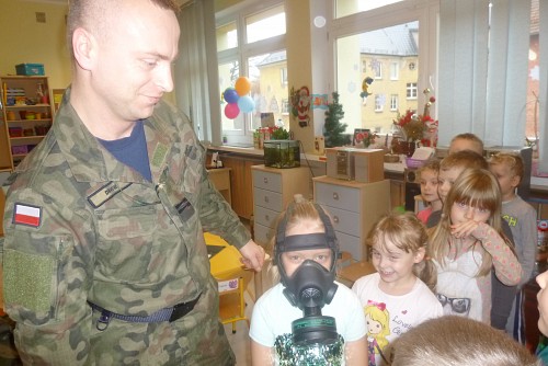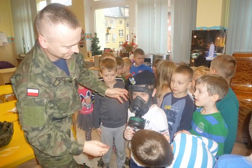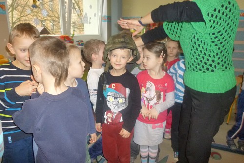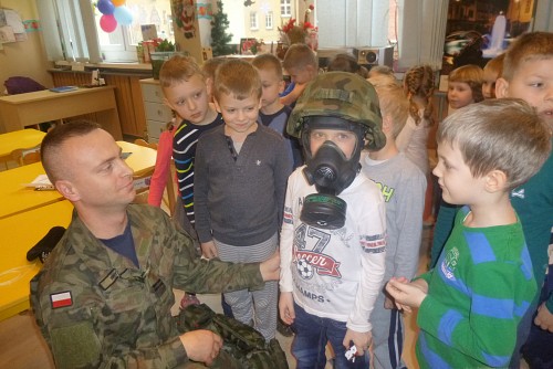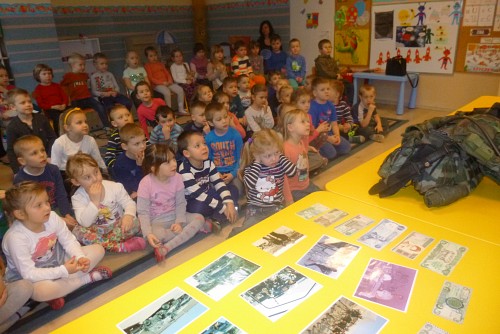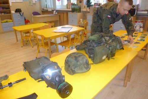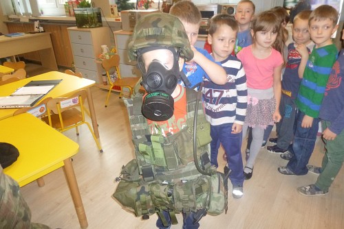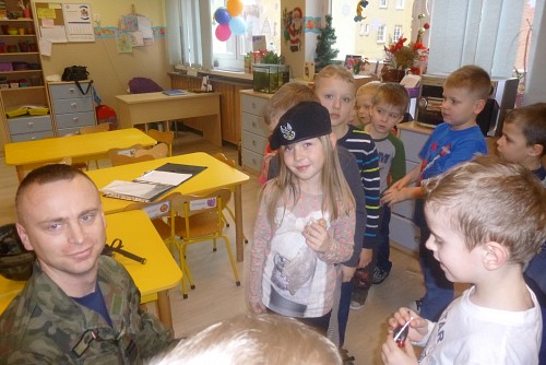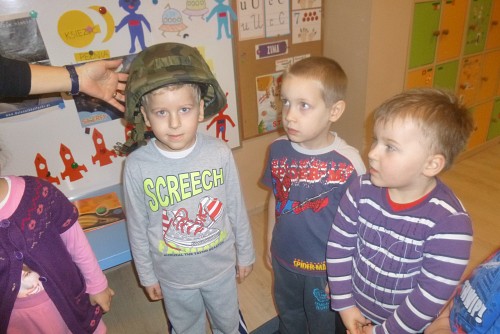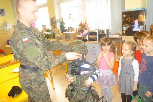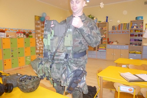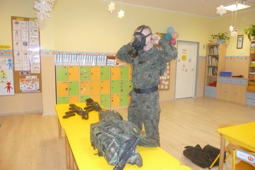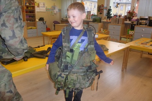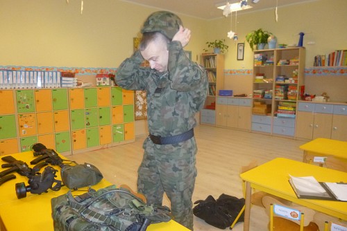 Tuż przed feriami 28 stycznia grupę SŁONECZEK, KRASNOLUDKÓW I TYGRYSKÓW odwiedził wyjątkowy gość - prawdziwy żołnierz mat Michał Dawid z Jednostki Wojskowej 4498 w Siemierowicach. Zaproszony gość - tata naszej Zuzi, opowiedział dzieciom o swoim zawodzie i o jednostce, w której służy. Zwrócił uwagę na bezpieczeństwo, a także zaznaczył, jak ważne jest dbanie o własne zdrowie i ruch. W związku z tym przeprowadził przedszkolakom żołnierski trening, czyli tzw. musztrę. Oczywiście najciekawszym momentem była prezentacja munduru polowego i jego wyposażenia, gdzie dzieci mogły przymierzyć hełm, maski, oglądać odznaczenia, pamiątkowe zdjęcia ze służby w kraju i poza jego granicami.