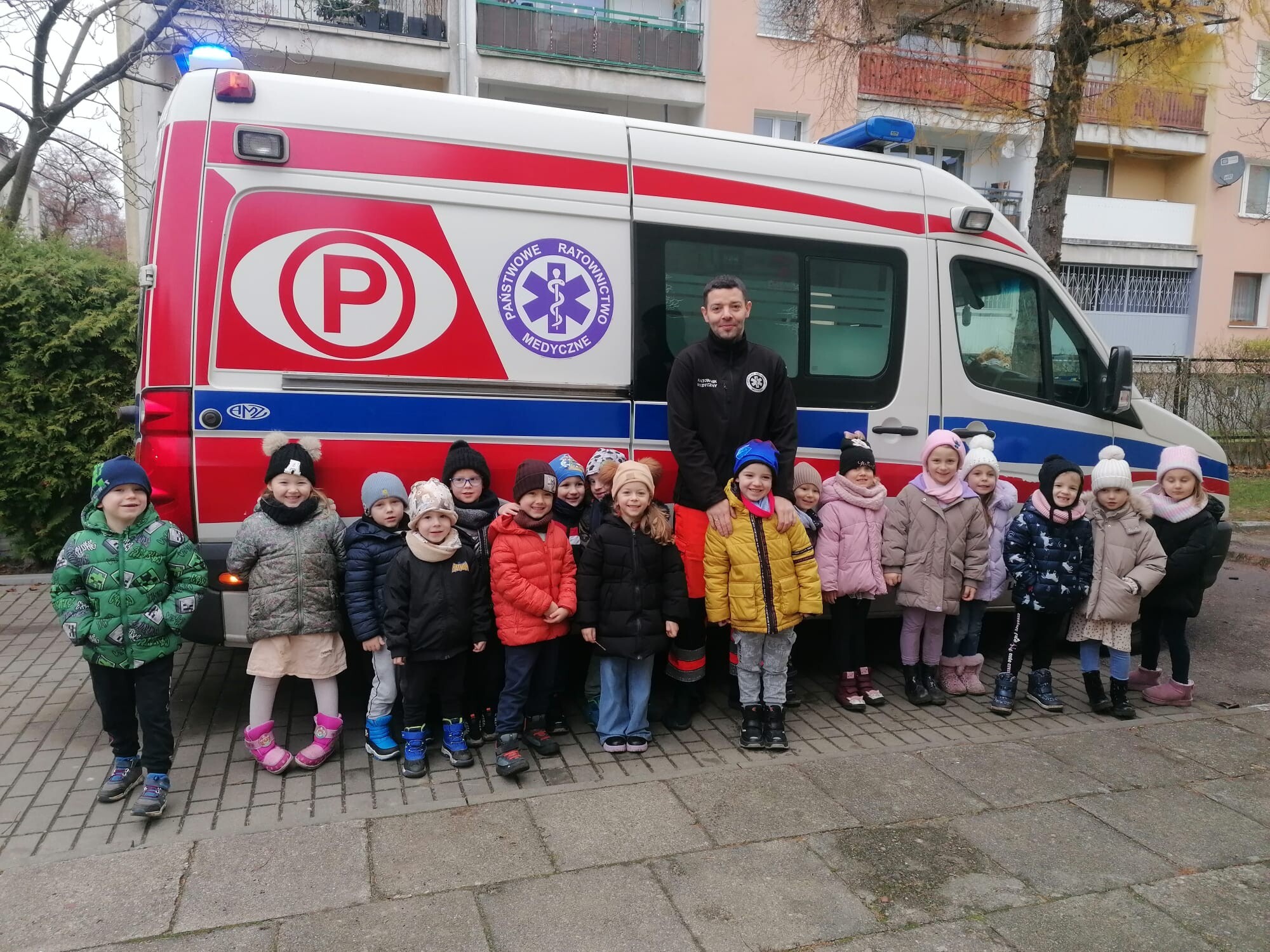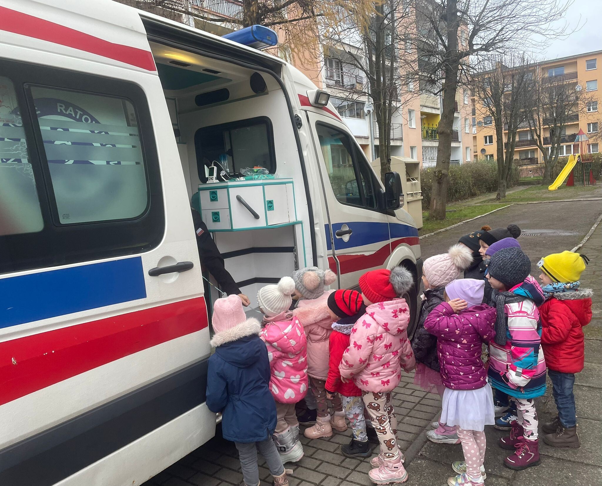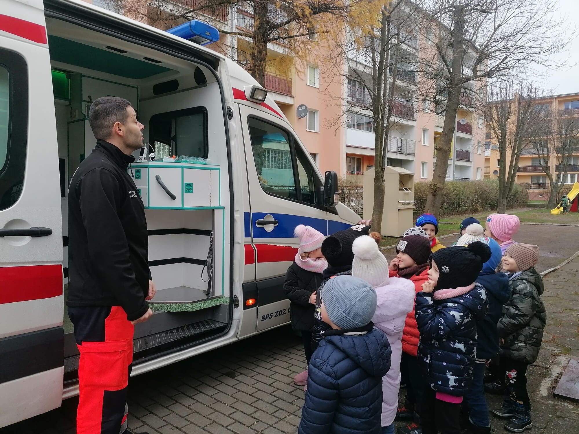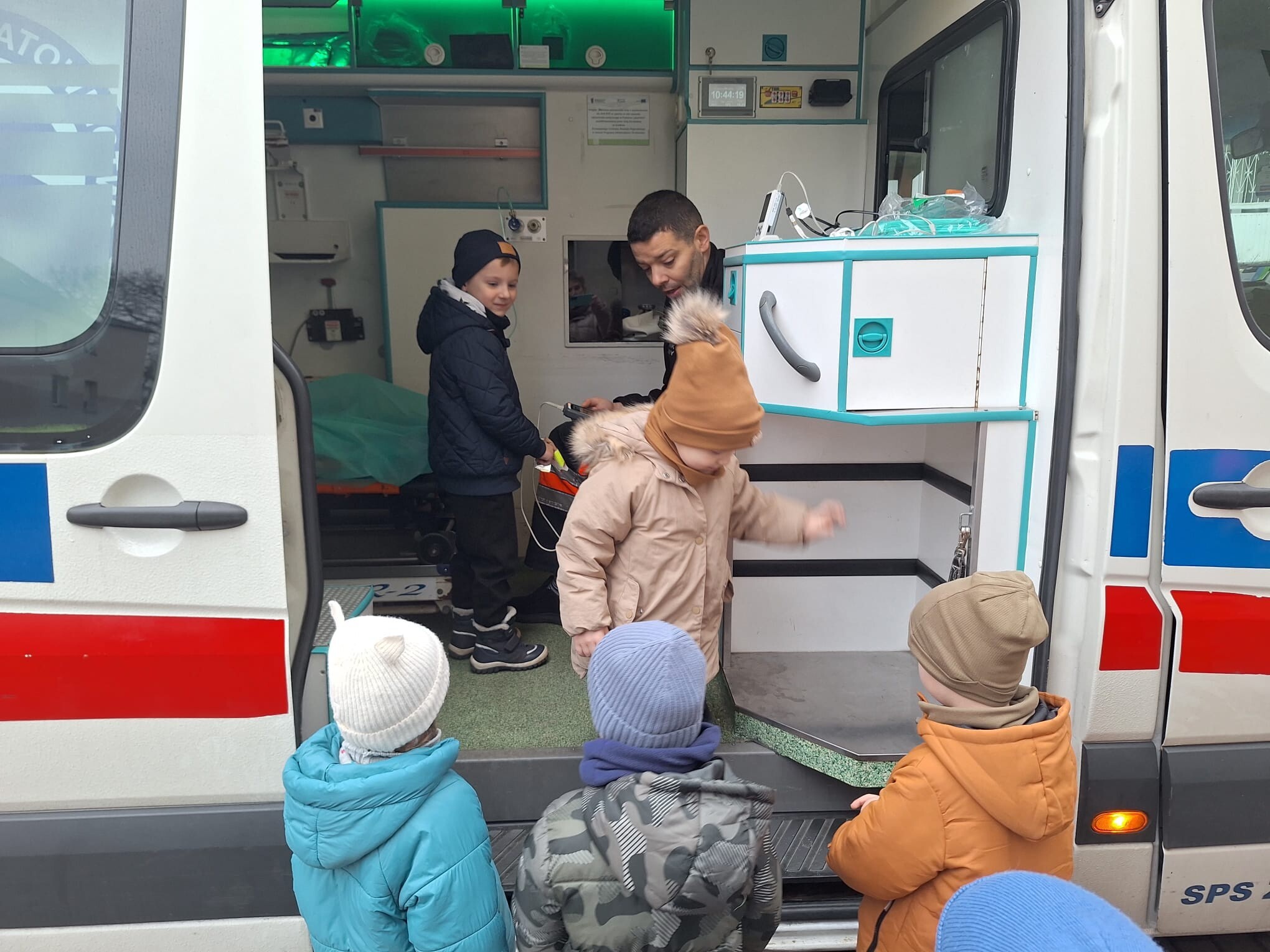 W piątkowe przedpołudnie 12 grudnia gościem w naszym przedszkolu był ratownik medyczny - Pan Robert Żółtowski, tata 5 - letniego Krzysia z grupy Słoneczek. To było nie tylko bardzo miłe, ale przede wszystkim bardzo ważne spotkanie, ponieważ na naszym przedszkolnym placu zabaw pojawiła się karetka pogotowia. Przedszkolaki mogły wejść do wnętrza pojazdu, zobaczyć, jak wyposażona jest karetka, poznać sprzęt medyczny, a co najważniejsze - nauczyć się, kiedy i jak dzwonić po pomoc. Dzieci mogły również posłuchać alarmowego sygnału dźwiękowego i poczuć się choć przez chwilę, jak ratownik medyczny podczas akcji ratowniczej.