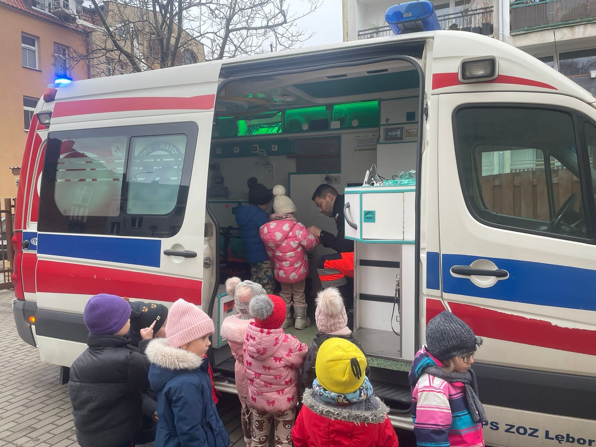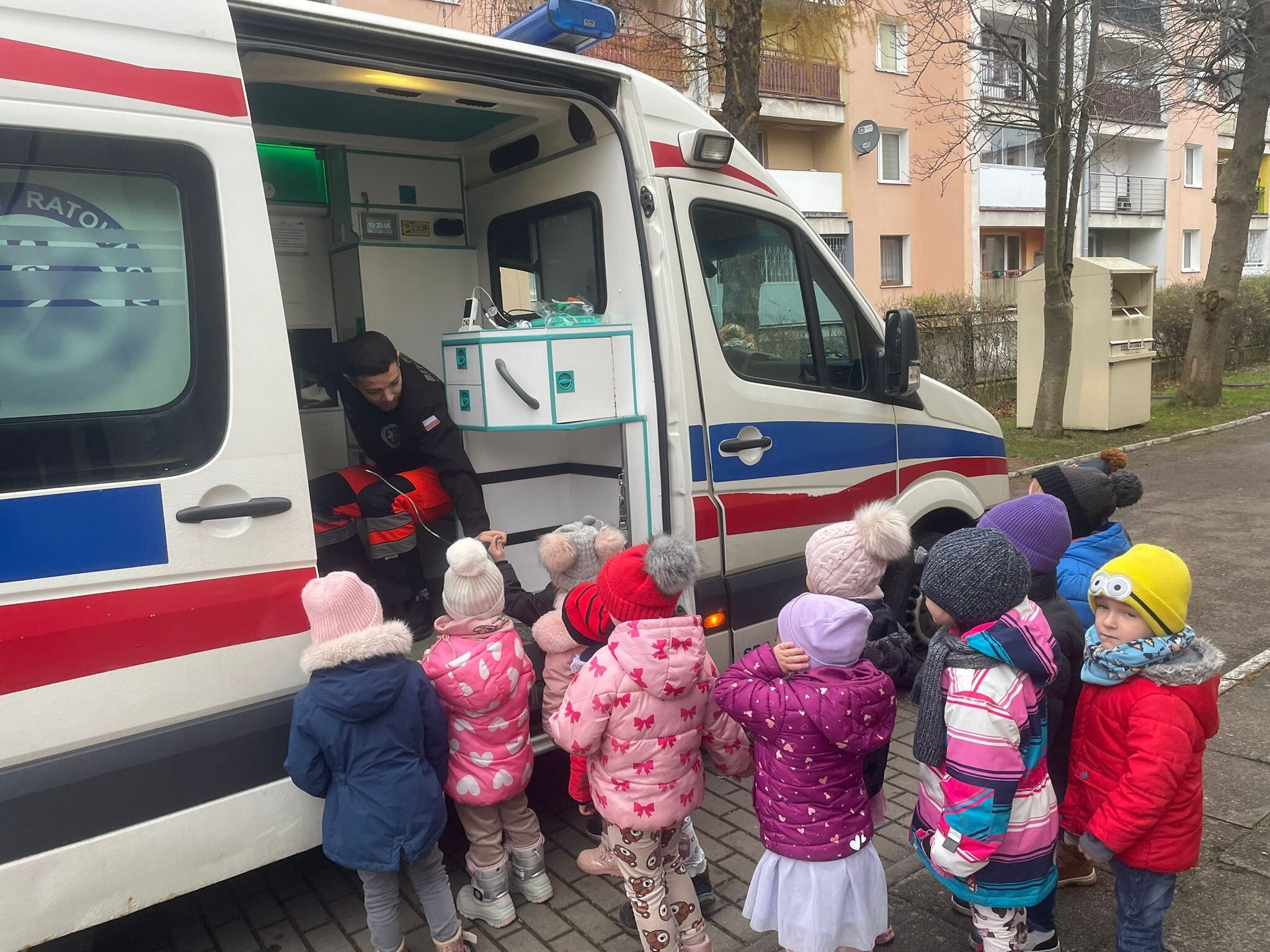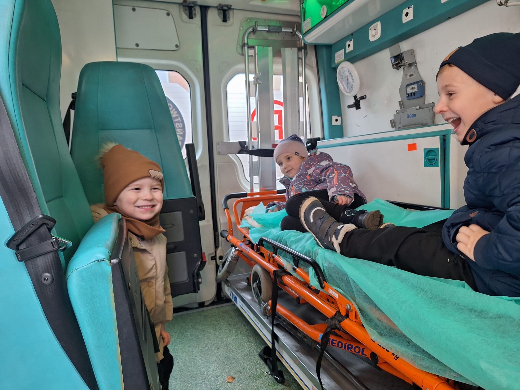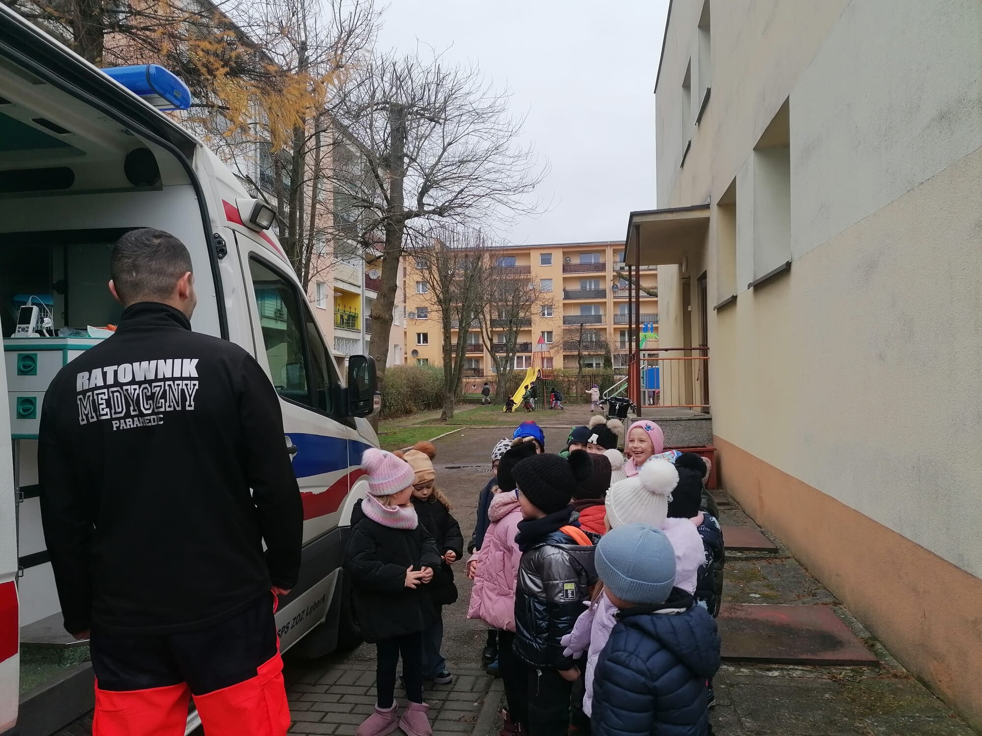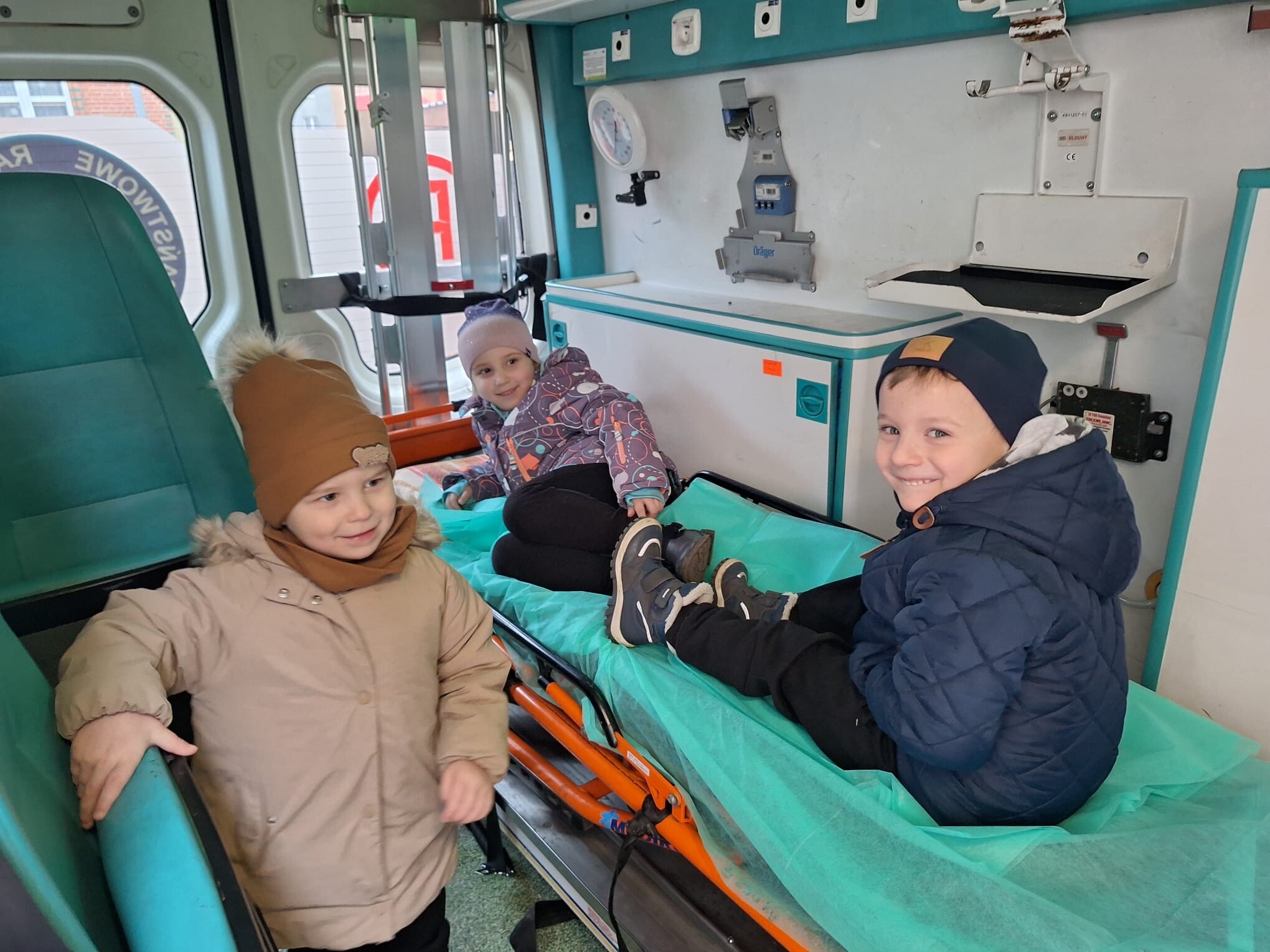 W piątkowe przedpołudnie 12 grudnia gościem w naszym przedszkolu był ratownik medyczny - Pan Robert Żółtowski, tata 5 - letniego Krzysia z grupy Słoneczek. To było nie tylko bardzo miłe, ale przede wszystkim bardzo ważne spotkanie, ponieważ na naszym przedszkolnym placu zabaw pojawiła się karetka pogotowia. Przedszkolaki mogły wejść do wnętrza pojazdu, zobaczyć, jak wyposażona jest karetka, poznać sprzęt medyczny, a co najważniejsze - nauczyć się, kiedy i jak dzwonić po pomoc. Dzieci mogły również posłuchać alarmowego sygnału dźwiękowego i poczuć się choć przez chwilę, jak ratownik medyczny podczas akcji ratowniczej.