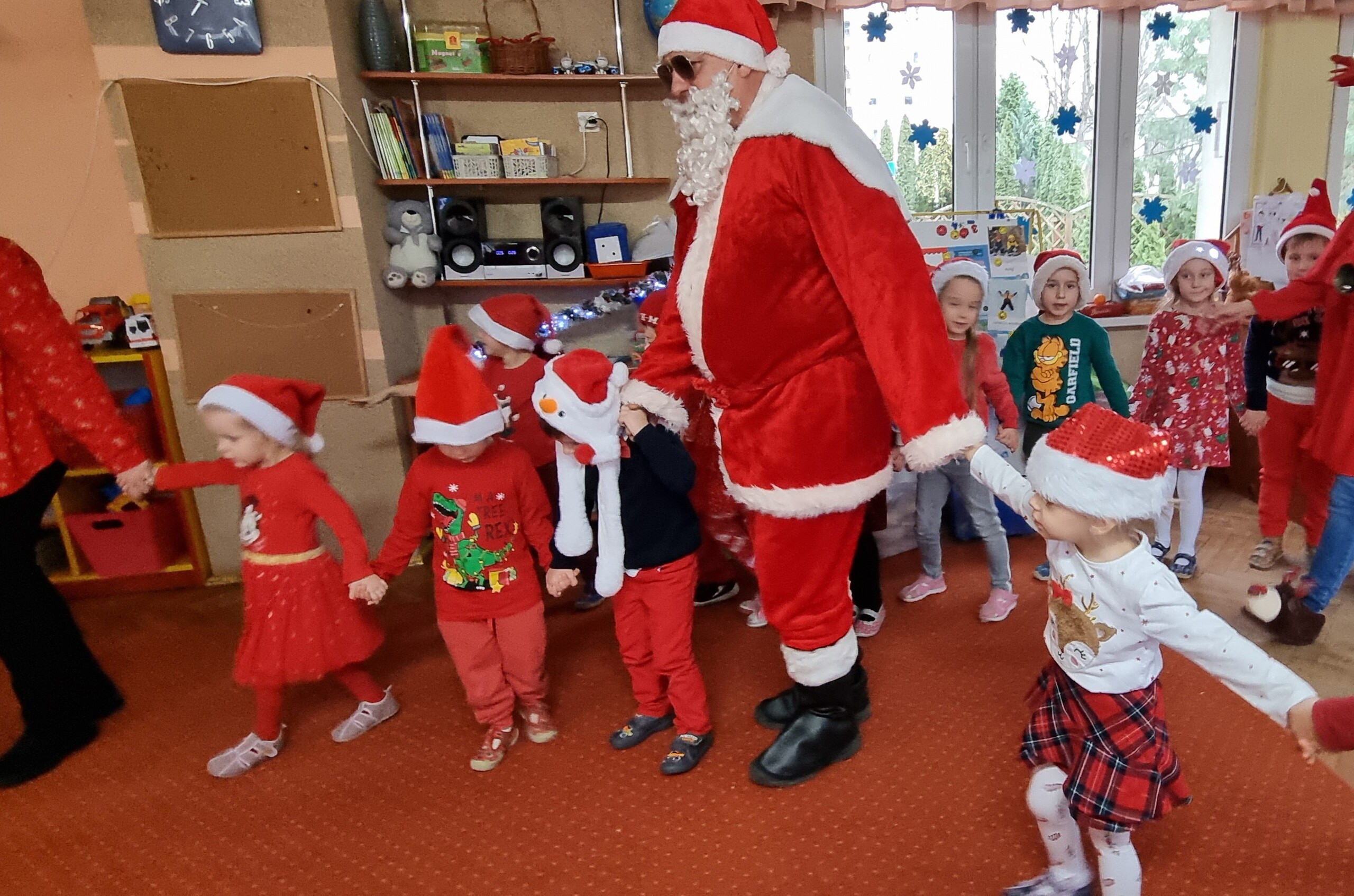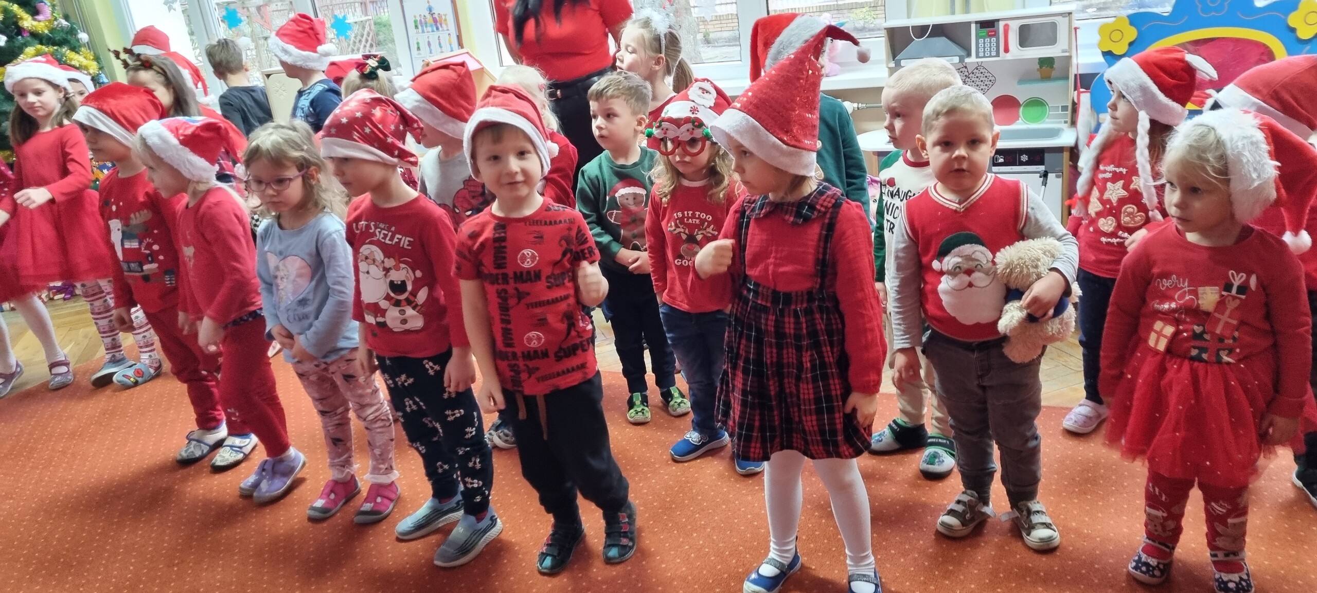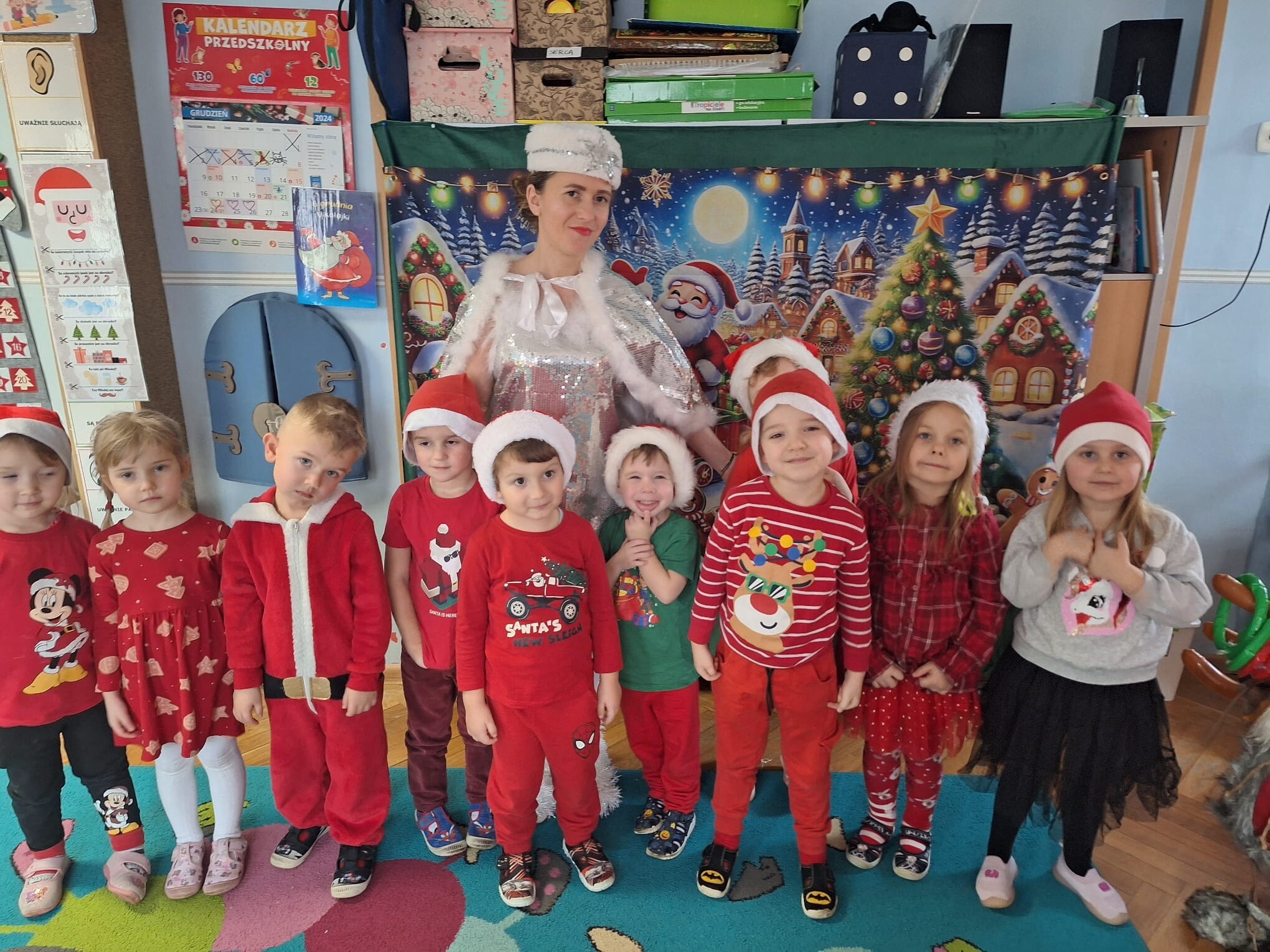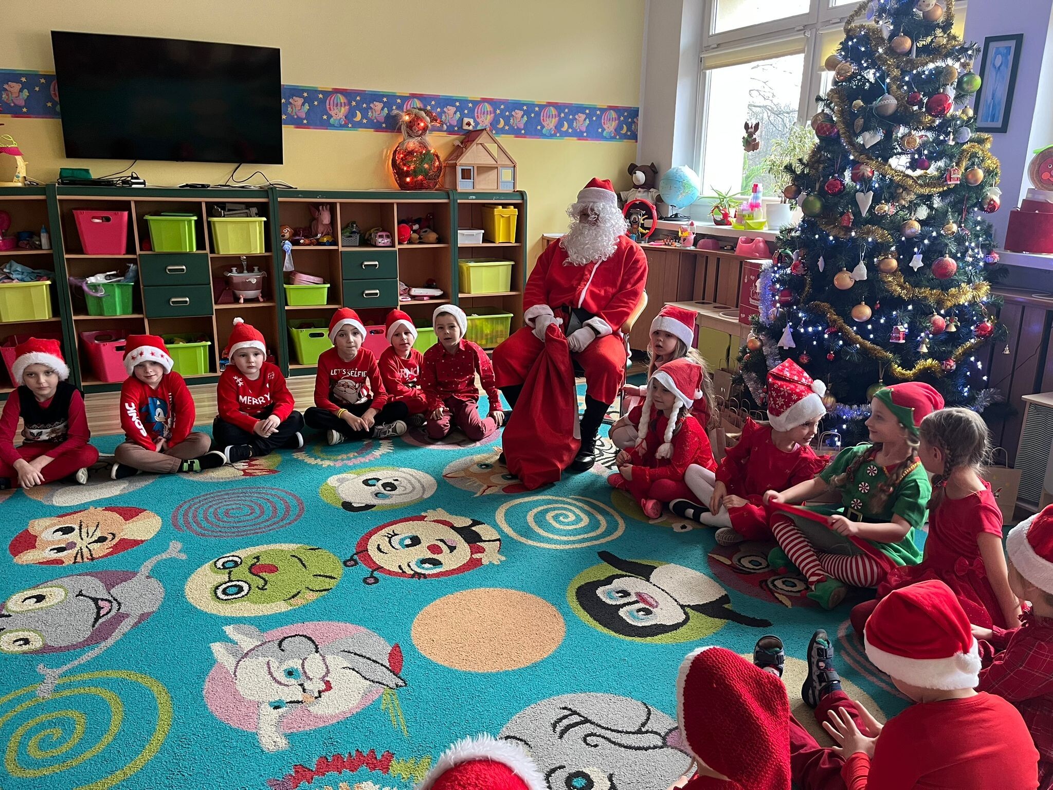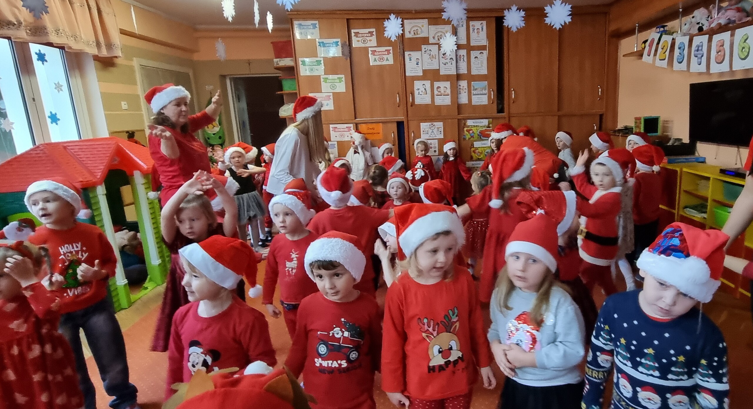 MIKOŁAJKOWA TRADYCJA jest naszym dzieciom dobrze znana. Jak co roku nasze jedynkowe przedszkole Święty Mikołaj odwiedził w piątek 6 grudnia. Wszystkie przedszkolaki w tym dniu ubrane w czerwone czapeczki i jak same bardzo często podkreślały - wyjątkowo grzeczne w tym roku, z niecierpliwością oczekiwały gościa z dalekiej i mroźnej Laponii. Oczywiście przybył razem ze swoją śnieżynką i elfami, mimo wielu, wielu przeszkód. Zmęczony daleką podróżą, ulubiony święty przedszkolaków usiadł na specjalnym fotelu, by wypić ciepłe mleczko, poczęstować się pysznymi ciasteczkami owsianymi, wysłuchać niespodzianek w postaci wierszyków, piosenek i świątecznych obrazków przygotowanych przez dzieci. Następnie zaprosiliśmy naszego specjalnego gościa do wspólnej zabawy.