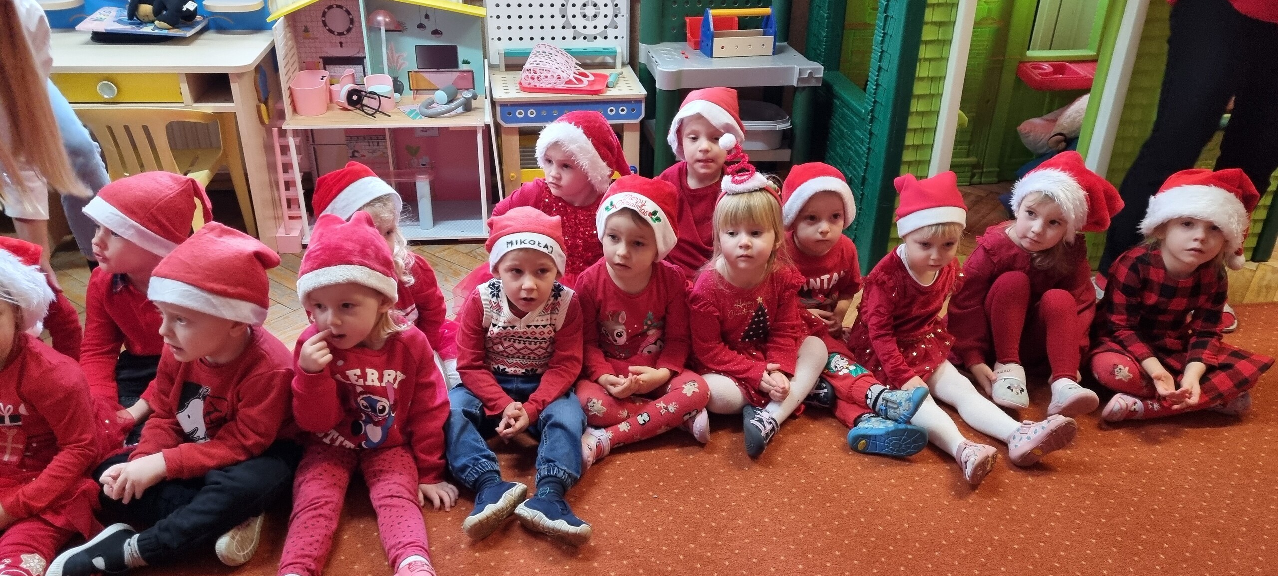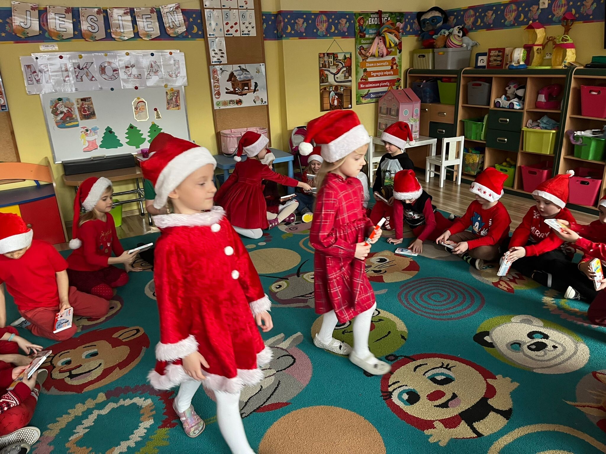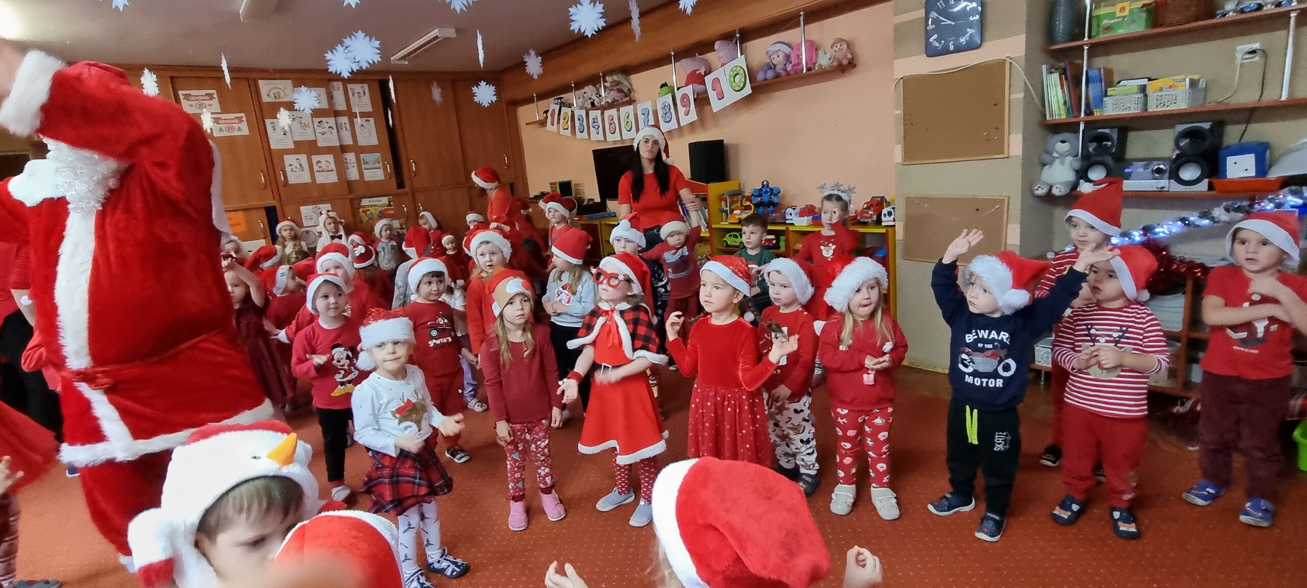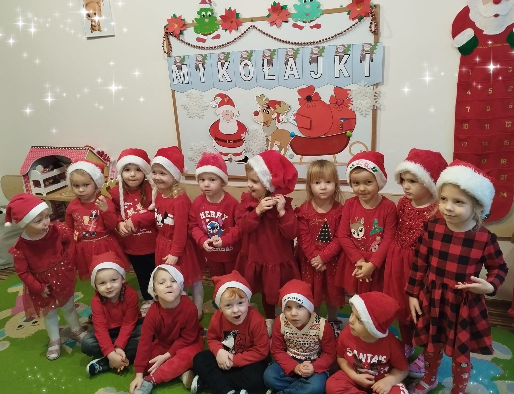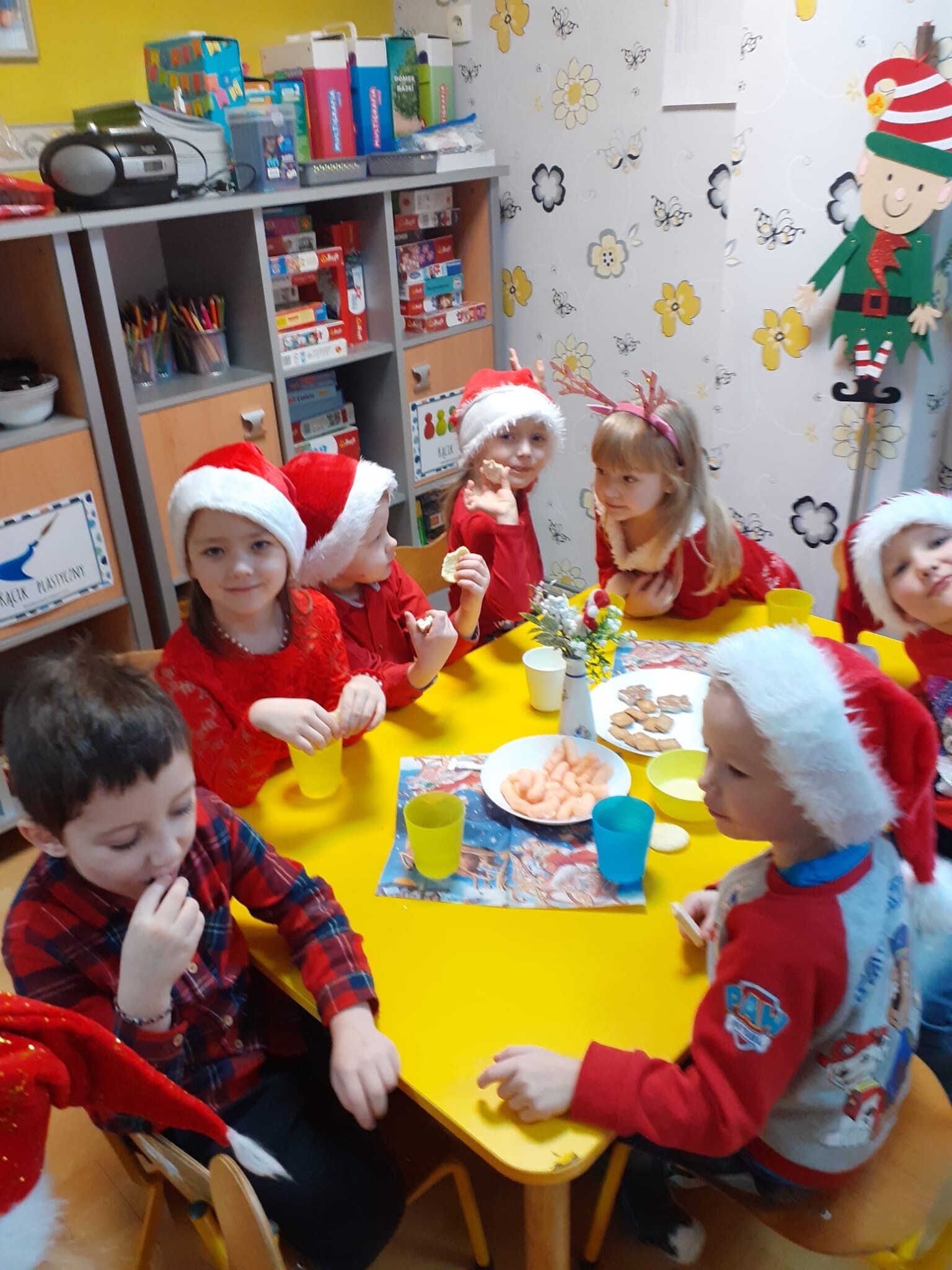 MIKOŁAJKOWA TRADYCJA jest naszym dzieciom dobrze znana. Jak co roku nasze jedynkowe przedszkole Święty Mikołaj odwiedził w piątek 6 grudnia. Wszystkie przedszkolaki w tym dniu ubrane w czerwone czapeczki i jak same bardzo często podkreślały - wyjątkowo grzeczne w tym roku, z niecierpliwością oczekiwały gościa z dalekiej i mroźnej Laponii. Oczywiście przybył razem ze swoją śnieżynką i elfami, mimo wielu, wielu przeszkód. Zmęczony daleką podróżą, ulubiony święty przedszkolaków usiadł na specjalnym fotelu, by wypić ciepłe mleczko, poczęstować się pysznymi ciasteczkami owsianymi, wysłuchać niespodzianek w postaci wierszyków, piosenek i świątecznych obrazków przygotowanych przez dzieci. Następnie zaprosiliśmy naszego specjalnego gościa do wspólnej zabawy.