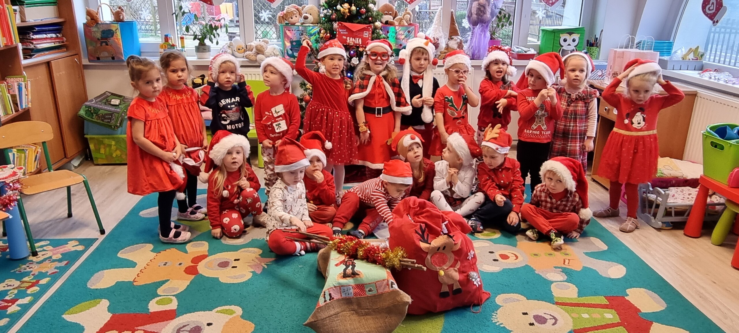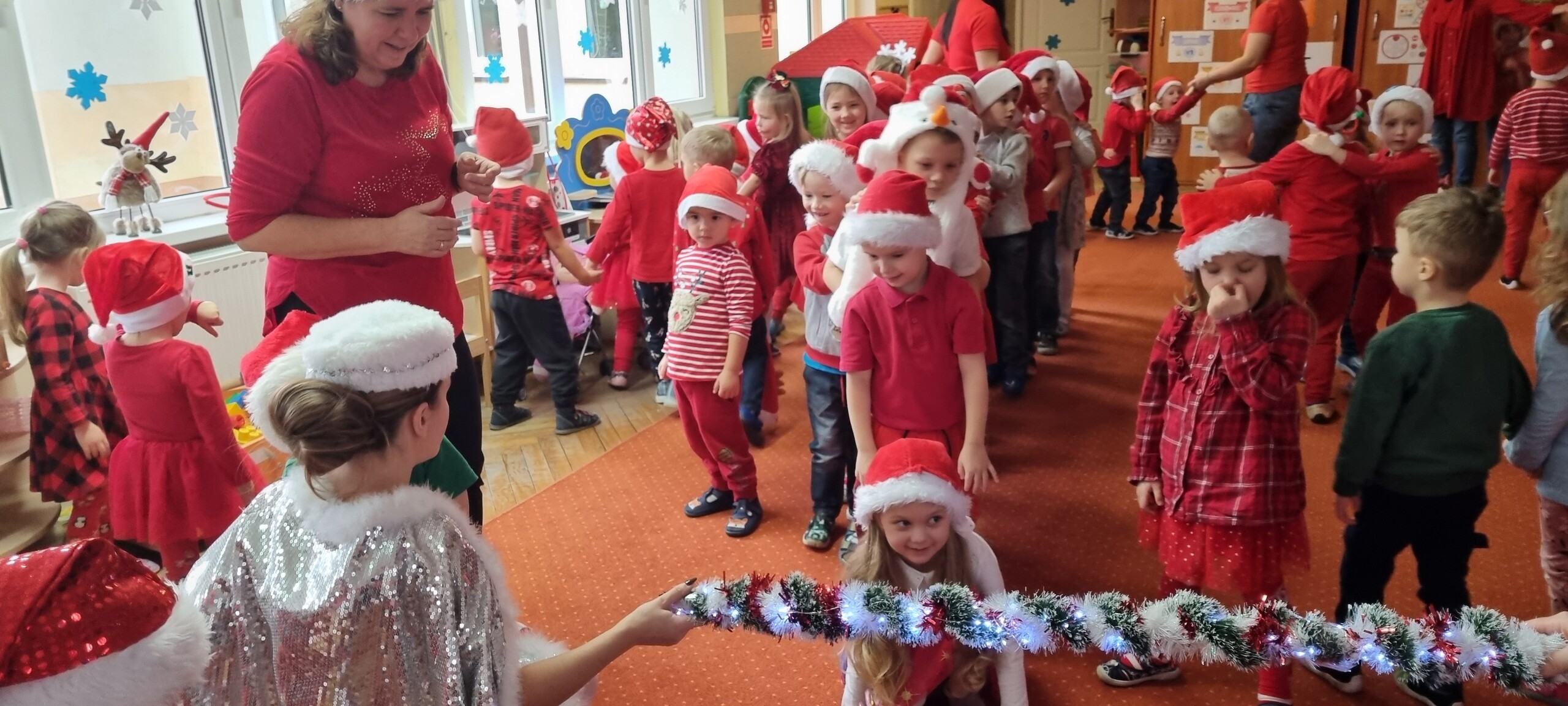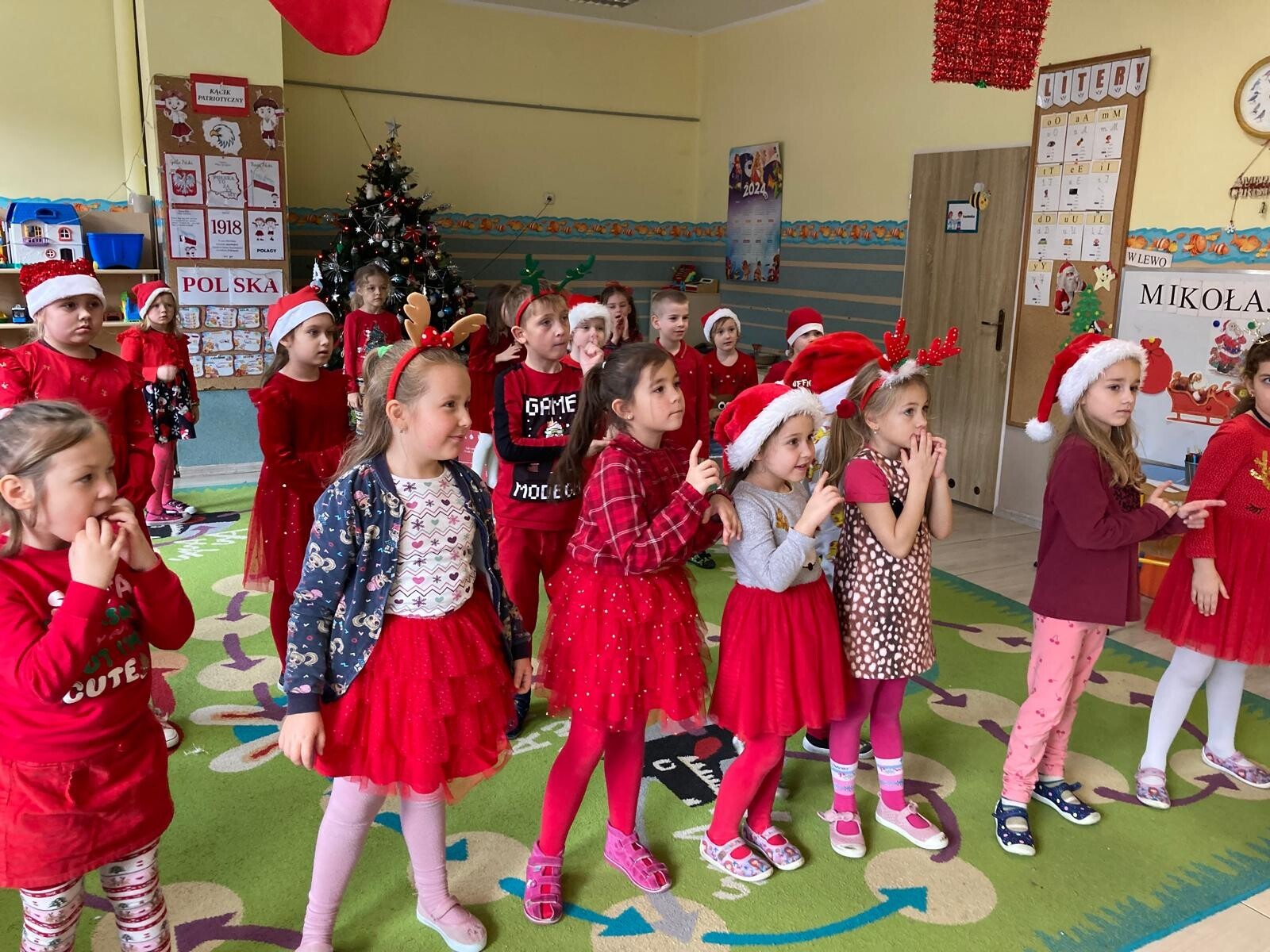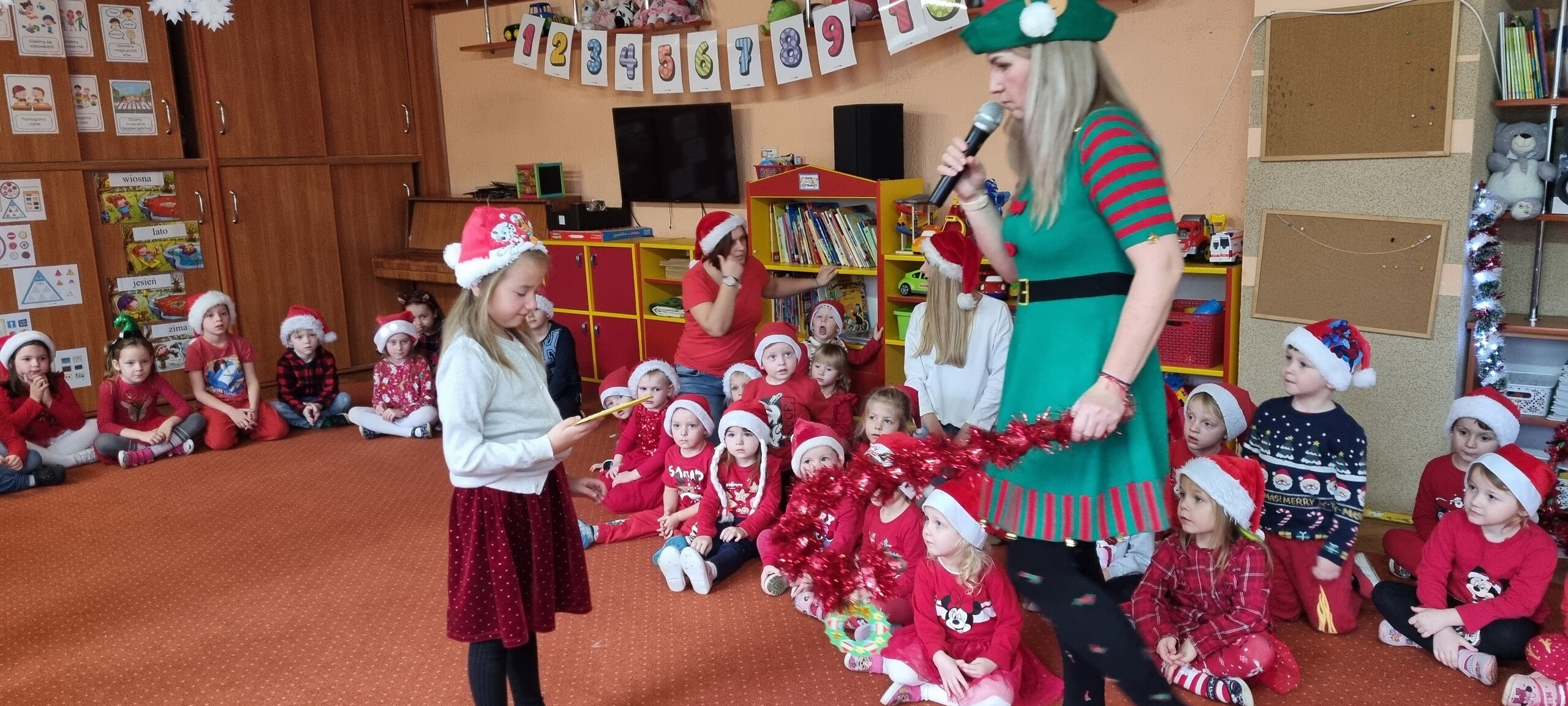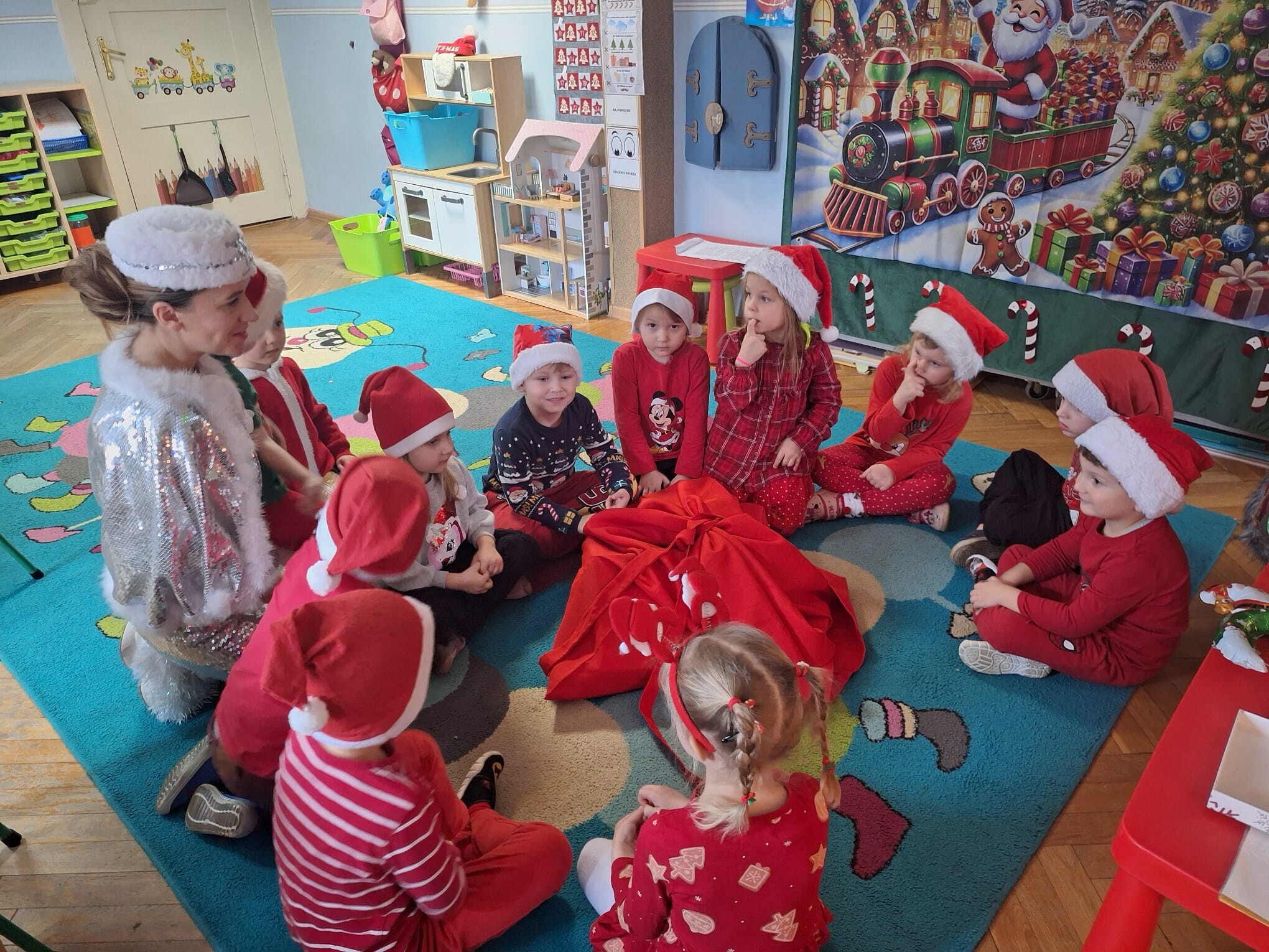 MIKOŁAJKOWA TRADYCJA jest naszym dzieciom dobrze znana. Jak co roku nasze jedynkowe przedszkole Święty Mikołaj odwiedził w piątek 6 grudnia. Wszystkie przedszkolaki w tym dniu ubrane w czerwone czapeczki i jak same bardzo często podkreślały - wyjątkowo grzeczne w tym roku, z niecierpliwością oczekiwały gościa z dalekiej i mroźnej Laponii. Oczywiście przybył razem ze swoją śnieżynką i elfami, mimo wielu, wielu przeszkód. Zmęczony daleką podróżą, ulubiony święty przedszkolaków usiadł na specjalnym fotelu, by wypić ciepłe mleczko, poczęstować się pysznymi ciasteczkami owsianymi, wysłuchać niespodzianek w postaci wierszyków, piosenek i świątecznych obrazków przygotowanych przez dzieci. Następnie zaprosiliśmy naszego specjalnego gościa do wspólnej zabawy.