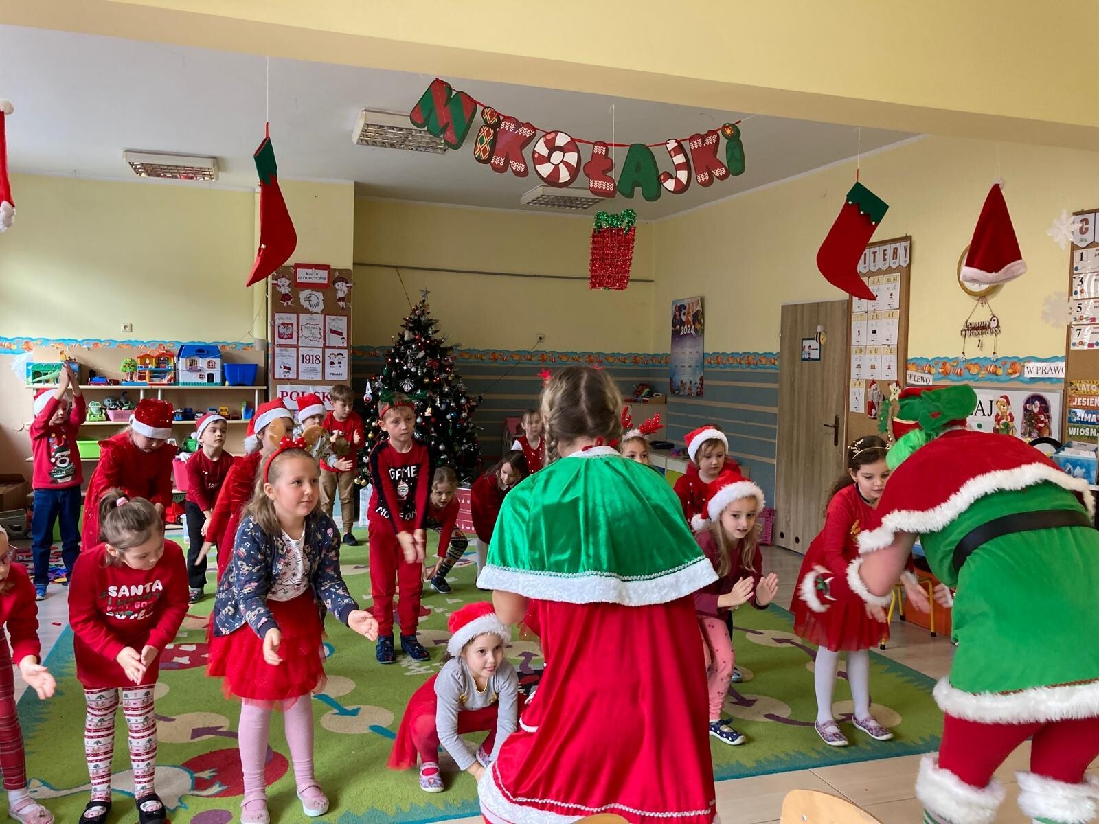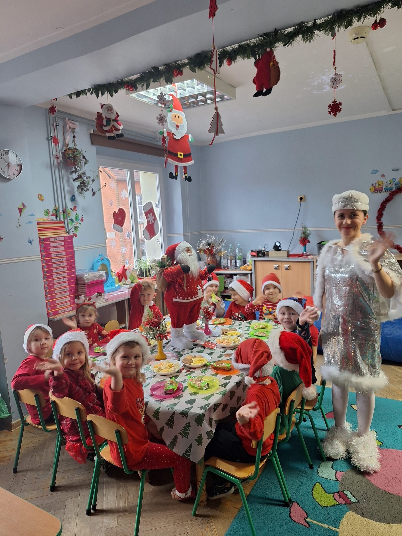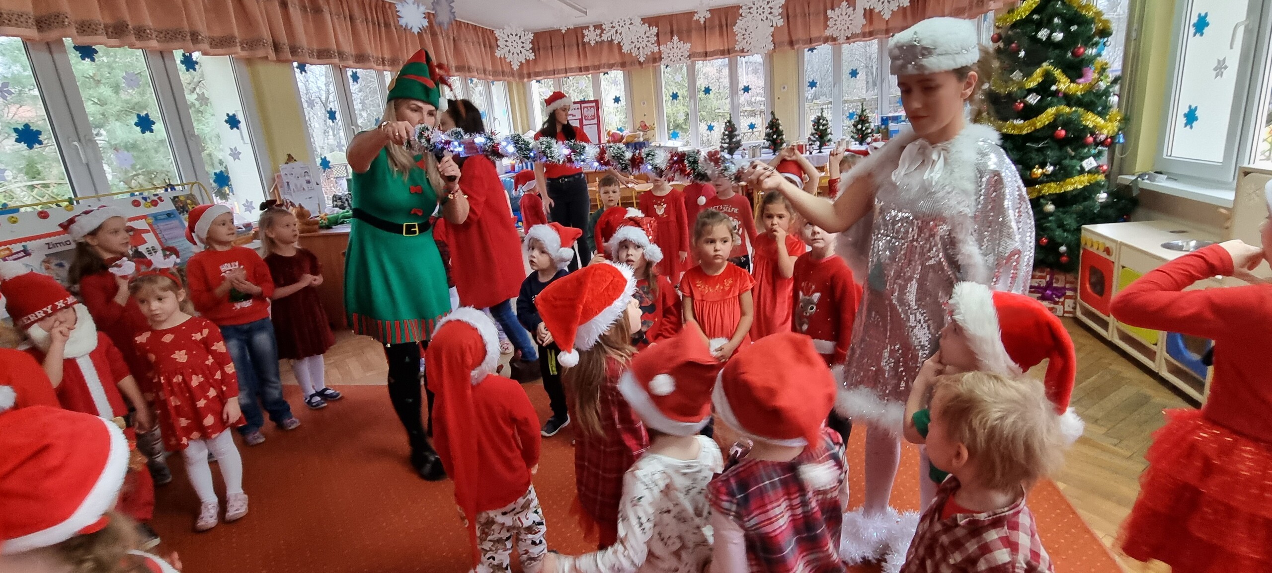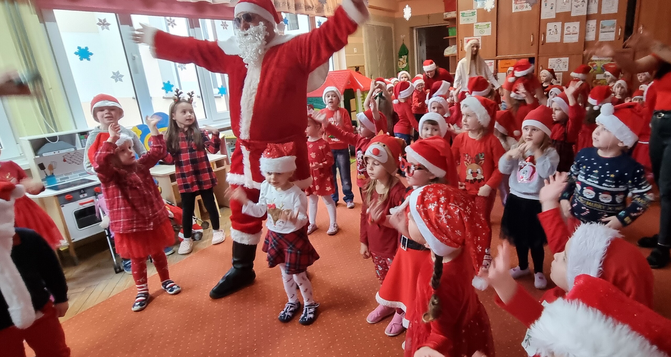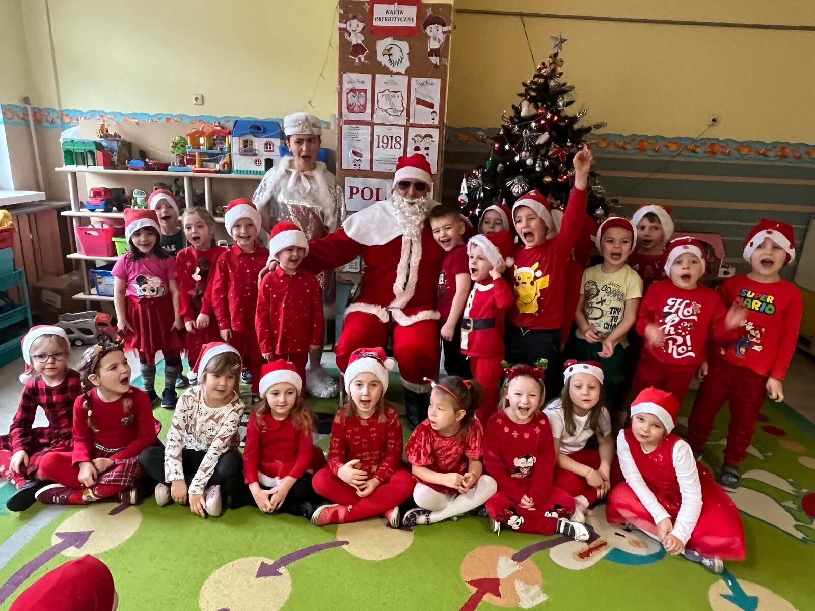 MIKOŁAJKOWA TRADYCJA jest naszym dzieciom dobrze znana. Jak co roku nasze jedynkowe przedszkole Święty Mikołaj odwiedził w piątek 6 grudnia. Wszystkie przedszkolaki w tym dniu ubrane w czerwone czapeczki i jak same bardzo często podkreślały - wyjątkowo grzeczne w tym roku, z niecierpliwością oczekiwały gościa z dalekiej i mroźnej Laponii. Oczywiście przybył razem ze swoją śnieżynką i elfami, mimo wielu, wielu przeszkód. Zmęczony daleką podróżą, ulubiony święty przedszkolaków usiadł na specjalnym fotelu, by wypić ciepłe mleczko, poczęstować się pysznymi ciasteczkami owsianymi, wysłuchać niespodzianek w postaci wierszyków, piosenek i świątecznych obrazków przygotowanych przez dzieci. Następnie zaprosiliśmy naszego specjalnego gościa do wspólnej zabawy.
