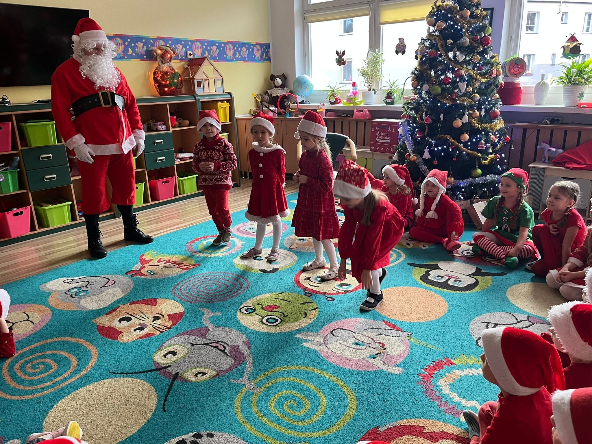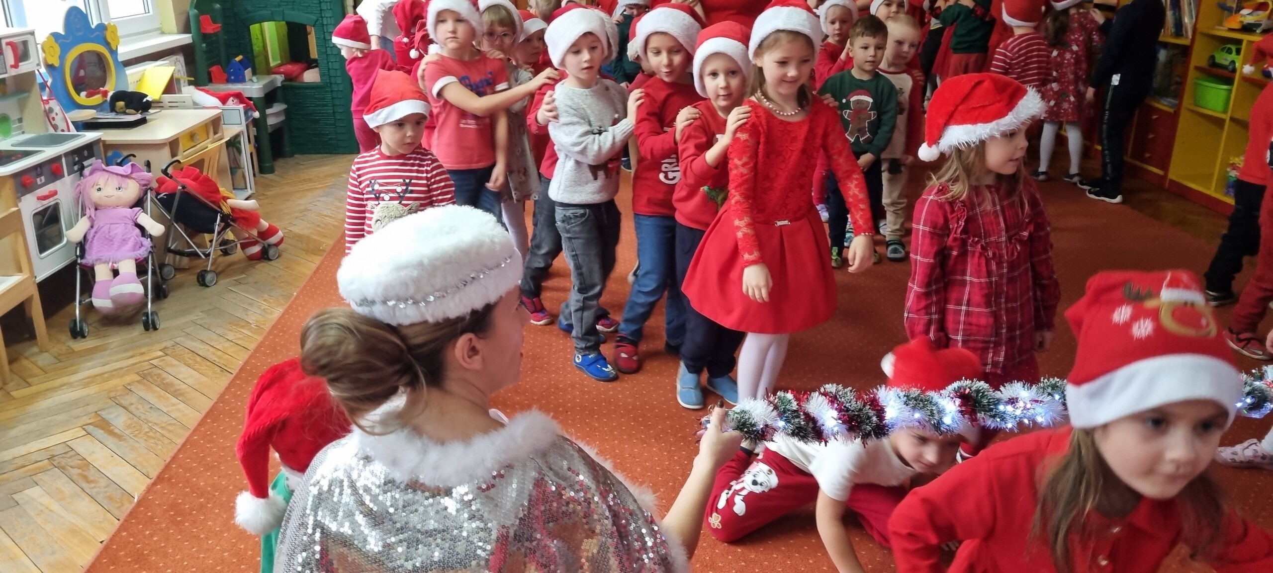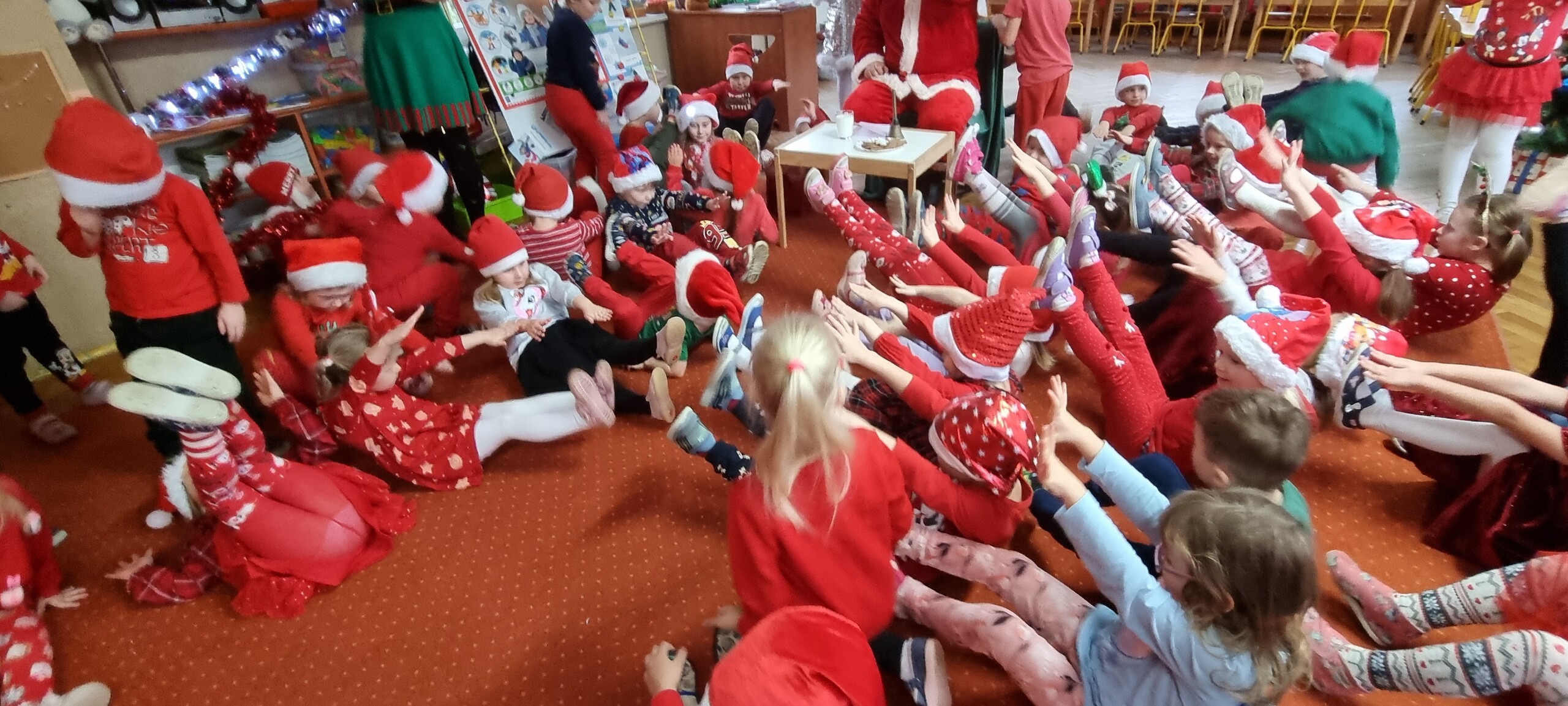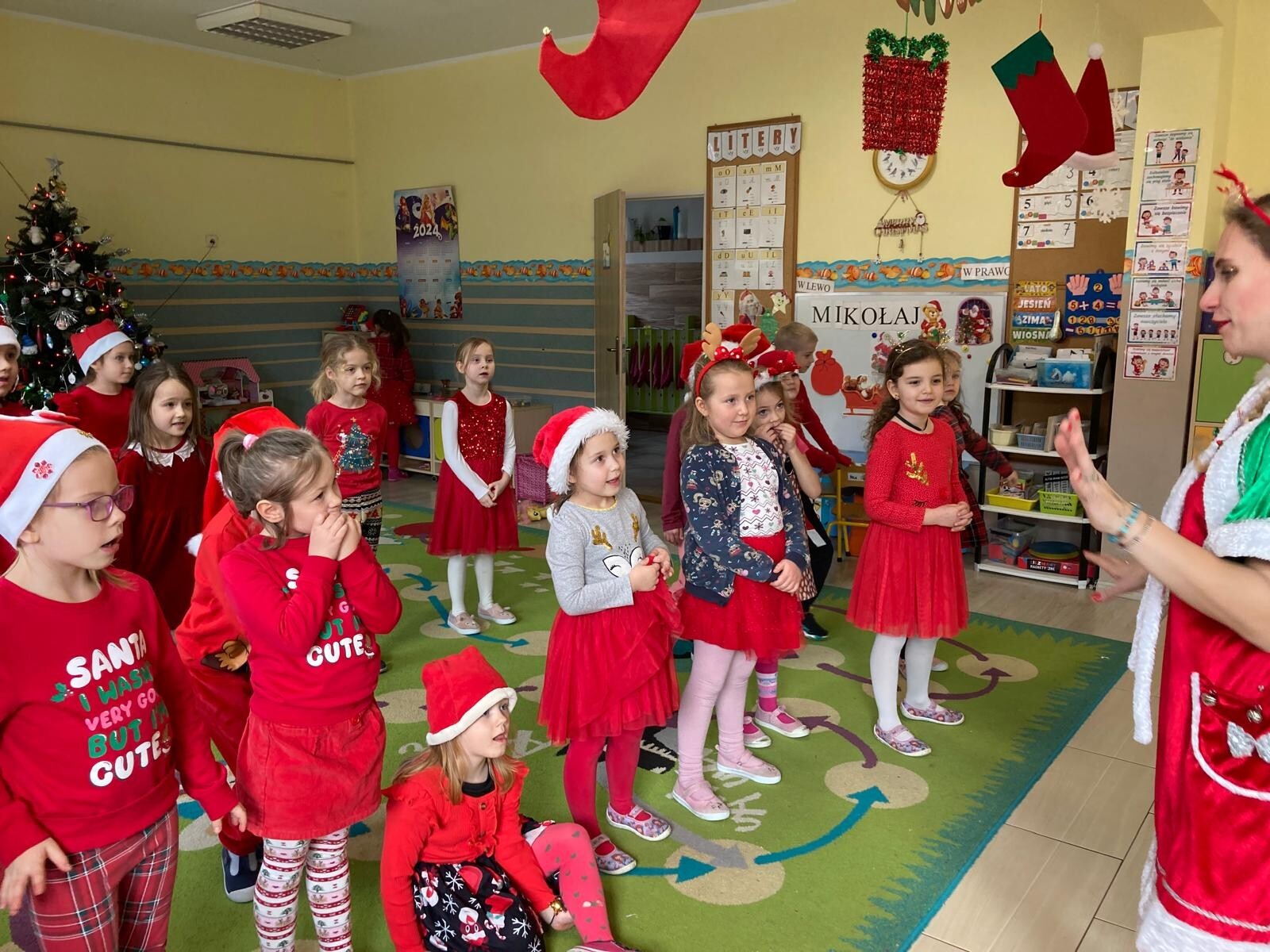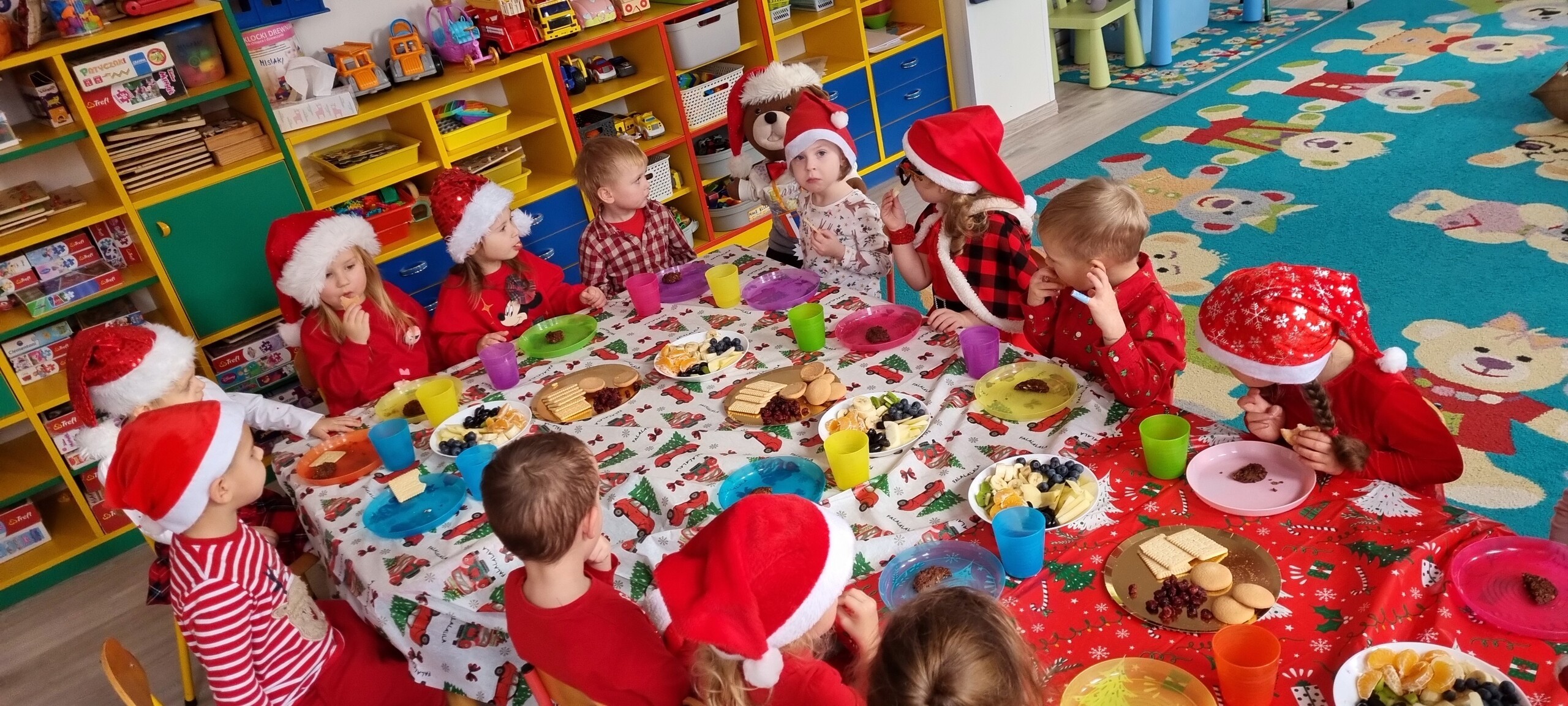 MIKOŁAJKOWA TRADYCJA jest naszym dzieciom dobrze znana. Jak co roku nasze jedynkowe przedszkole Święty Mikołaj odwiedził w piątek 6 grudnia. Wszystkie przedszkolaki w tym dniu ubrane w czerwone czapeczki i jak same bardzo często podkreślały - wyjątkowo grzeczne w tym roku, z niecierpliwością oczekiwały gościa z dalekiej i mroźnej Laponii. Oczywiście przybył razem ze swoją śnieżynką i elfami, mimo wielu, wielu przeszkód. Zmęczony daleką podróżą, ulubiony święty przedszkolaków usiadł na specjalnym fotelu, by wypić ciepłe mleczko, poczęstować się pysznymi ciasteczkami owsianymi, wysłuchać niespodzianek w postaci wierszyków, piosenek i świątecznych obrazków przygotowanych przez dzieci. Następnie zaprosiliśmy naszego specjalnego gościa do wspólnej zabawy.