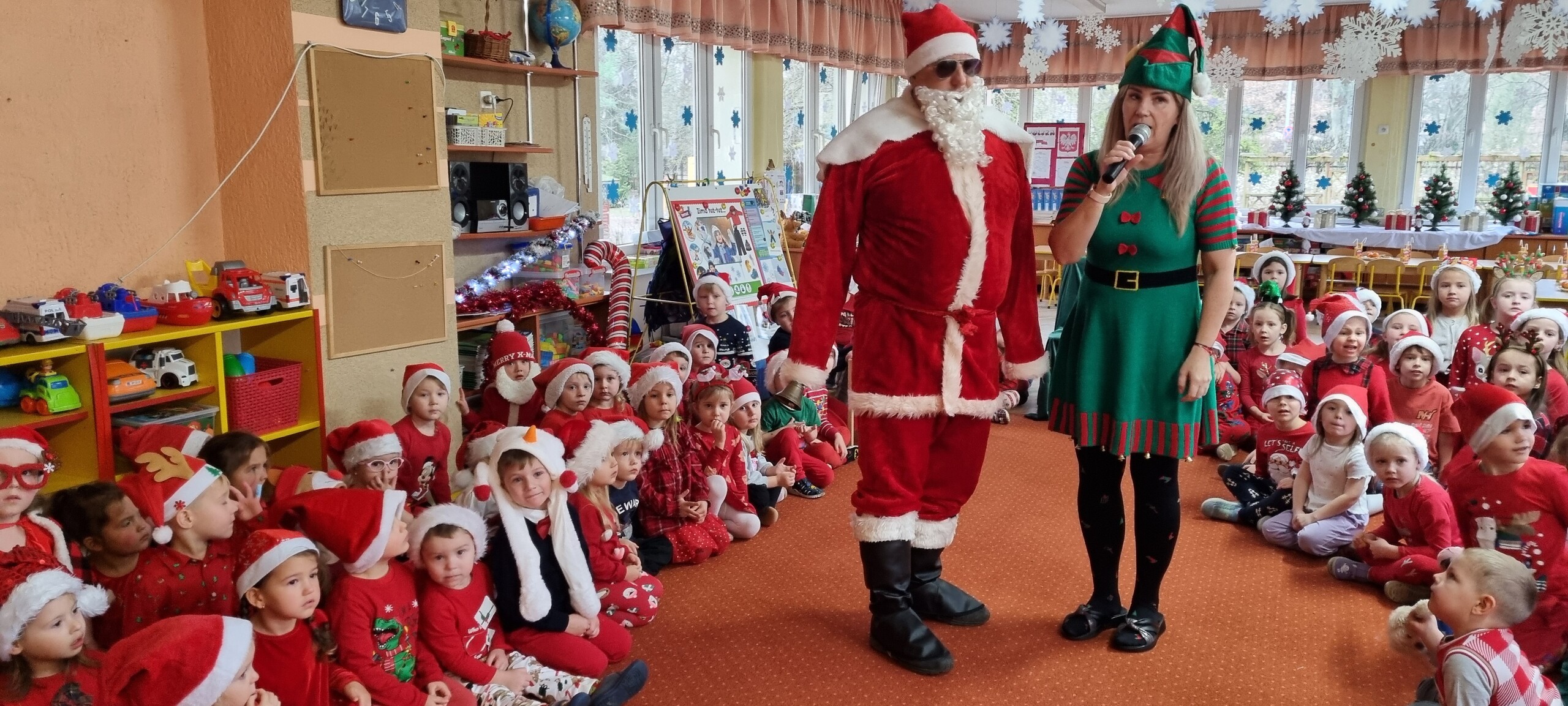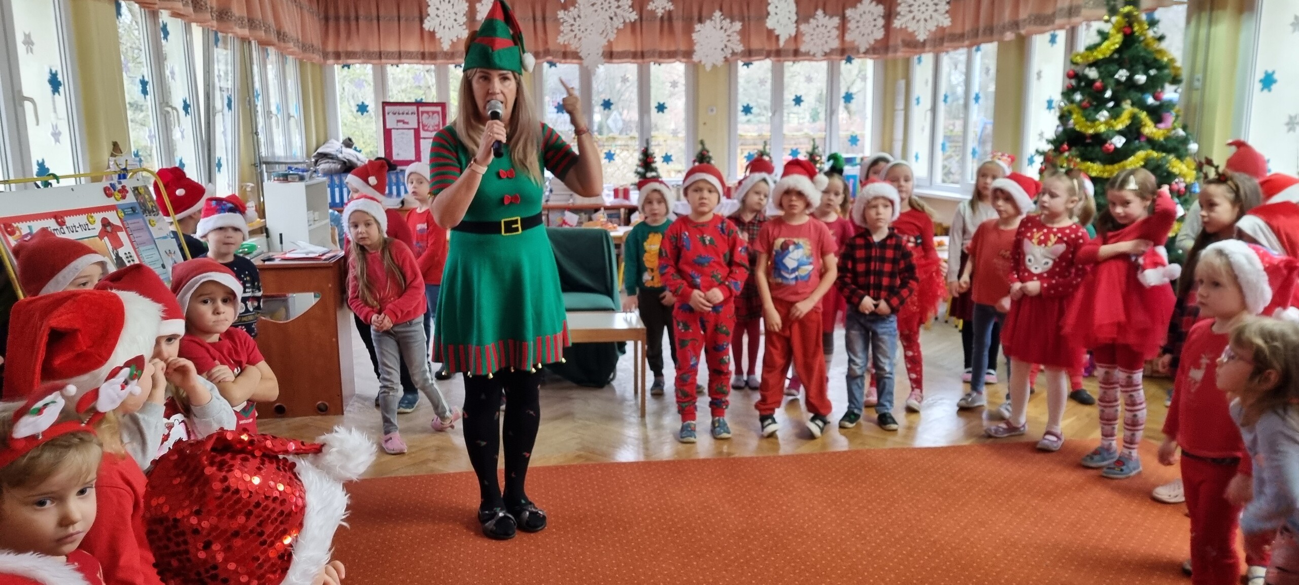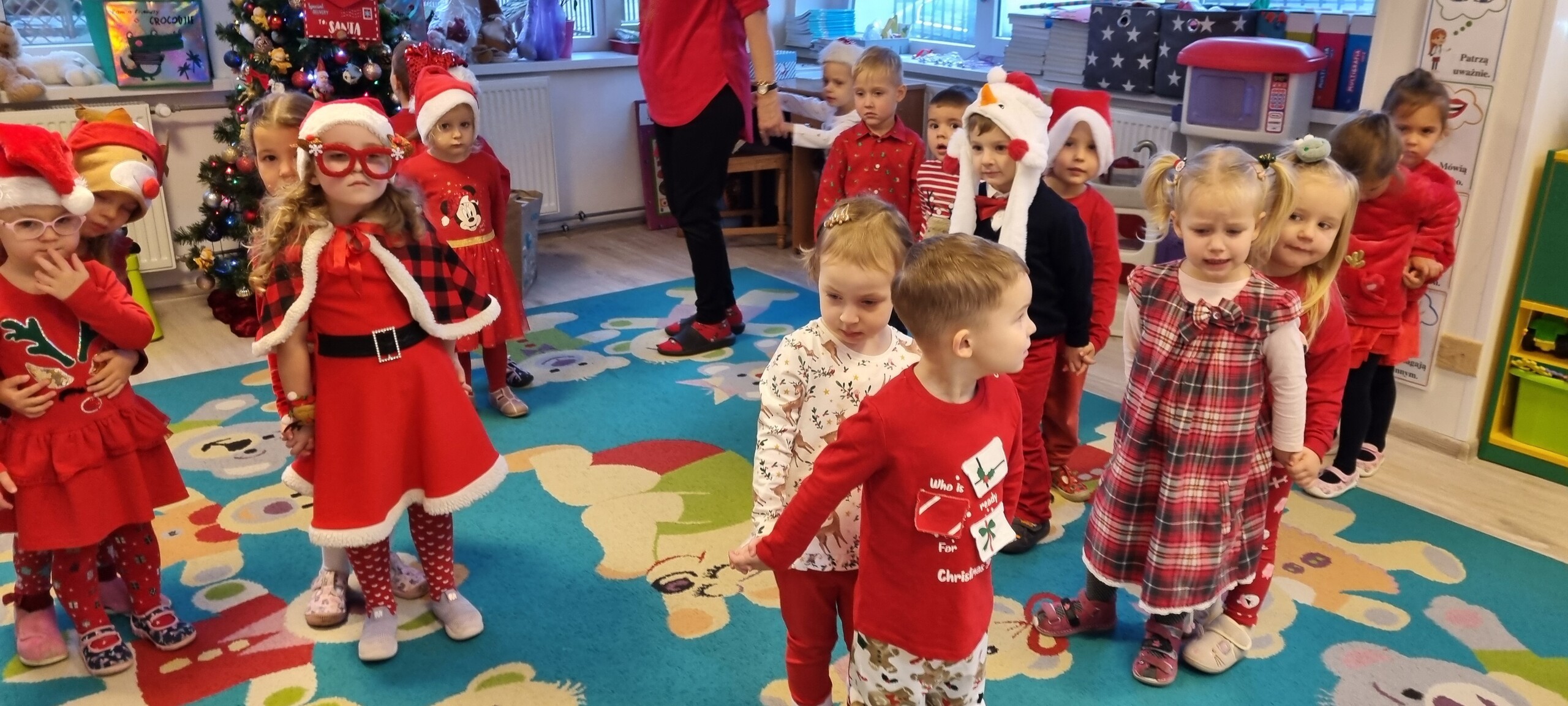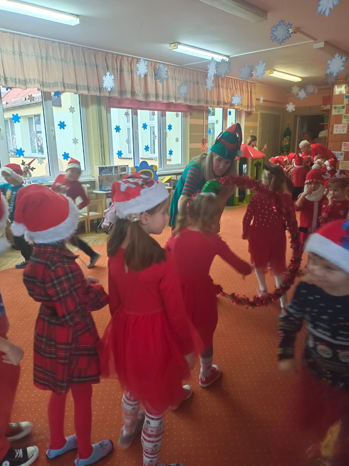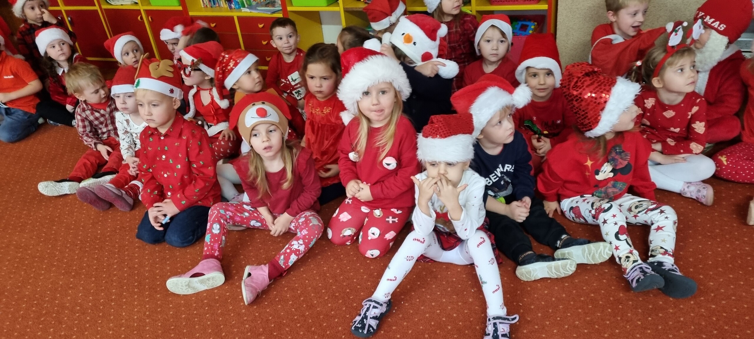 MIKOŁAJKOWA TRADYCJA jest naszym dzieciom dobrze znana. Jak co roku nasze jedynkowe przedszkole Święty Mikołaj odwiedził w piątek 6 grudnia. Wszystkie przedszkolaki w tym dniu ubrane w czerwone czapeczki i jak same bardzo często podkreślały - wyjątkowo grzeczne w tym roku, z niecierpliwością oczekiwały gościa z dalekiej i mroźnej Laponii. Oczywiście przybył razem ze swoją śnieżynką i elfami, mimo wielu, wielu przeszkód. Zmęczony daleką podróżą, ulubiony święty przedszkolaków usiadł na specjalnym fotelu, by wypić ciepłe mleczko, poczęstować się pysznymi ciasteczkami owsianymi, wysłuchać niespodzianek w postaci wierszyków, piosenek i świątecznych obrazków przygotowanych przez dzieci. Następnie zaprosiliśmy naszego specjalnego gościa do wspólnej zabawy.