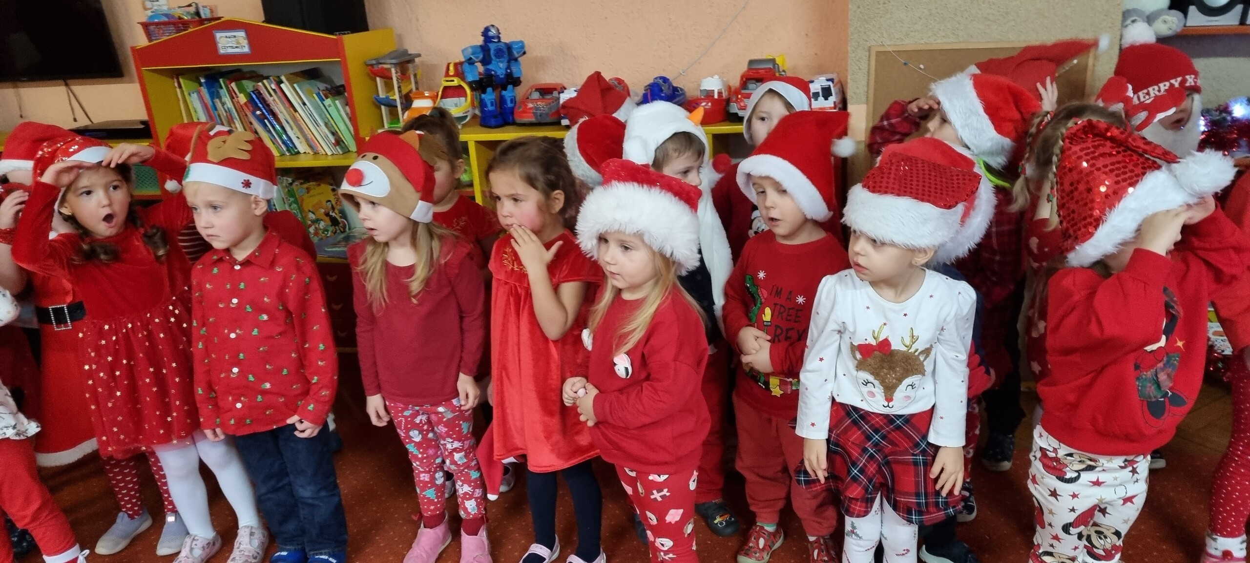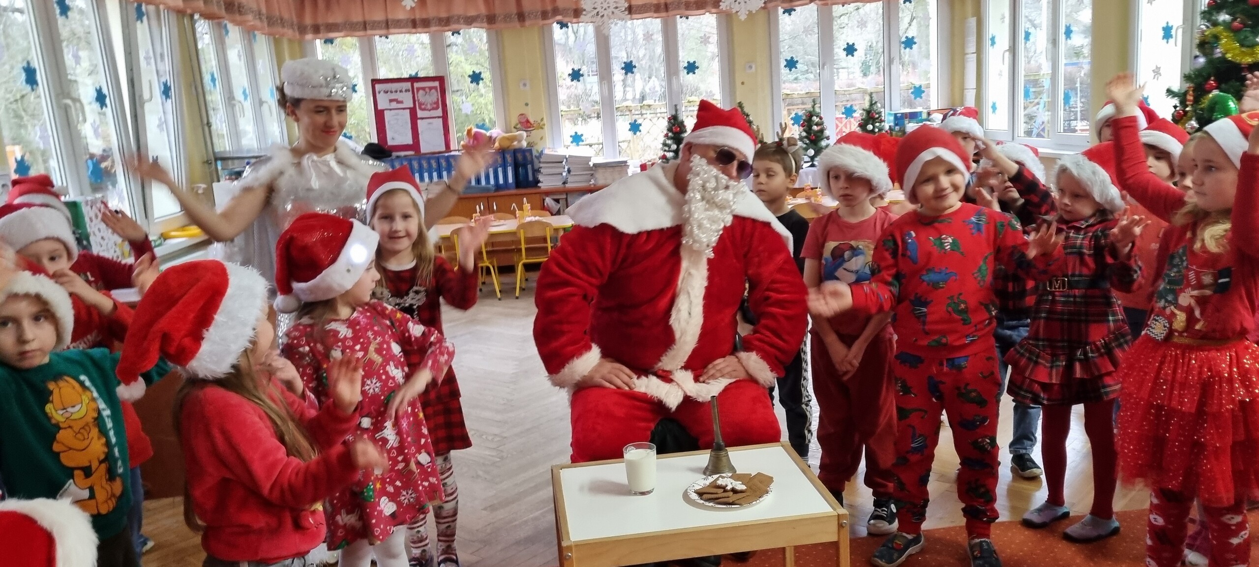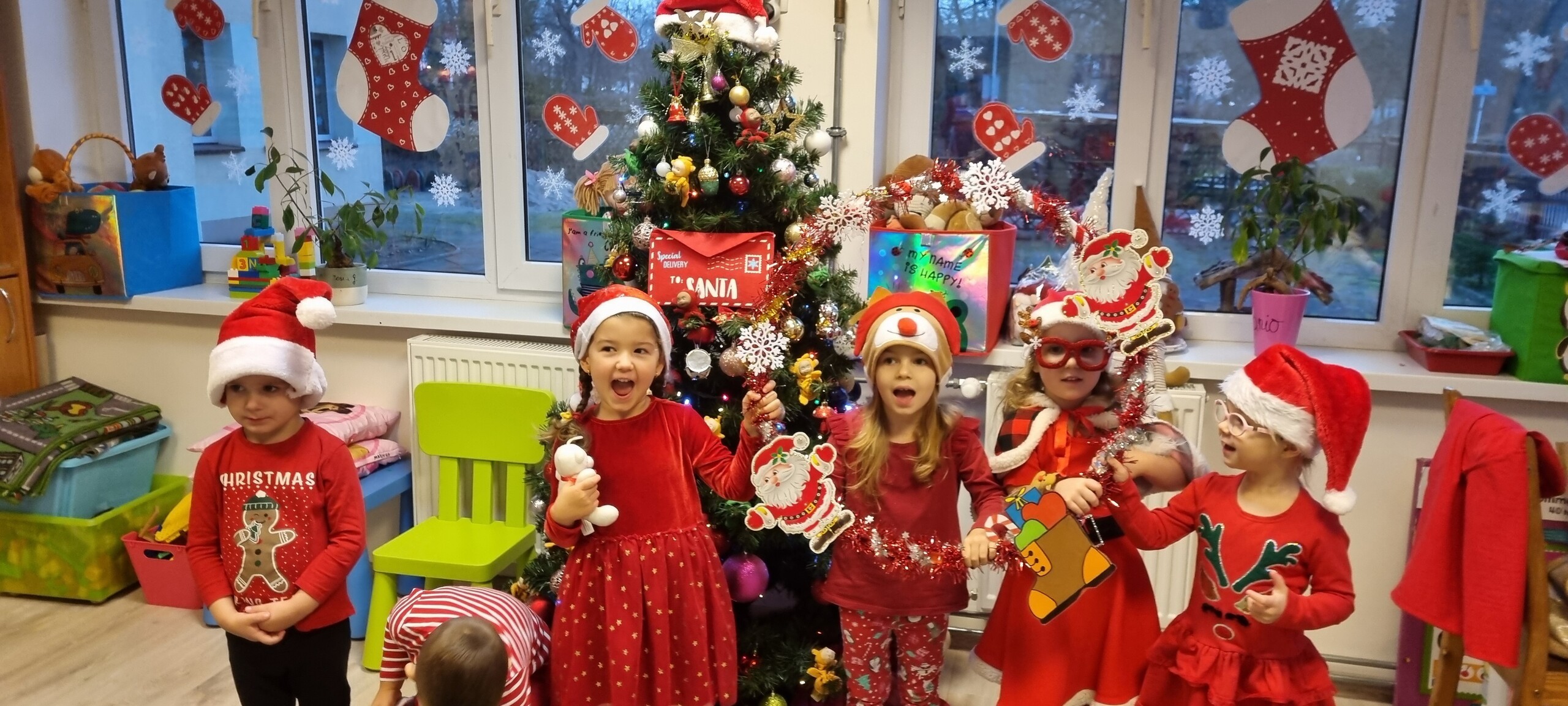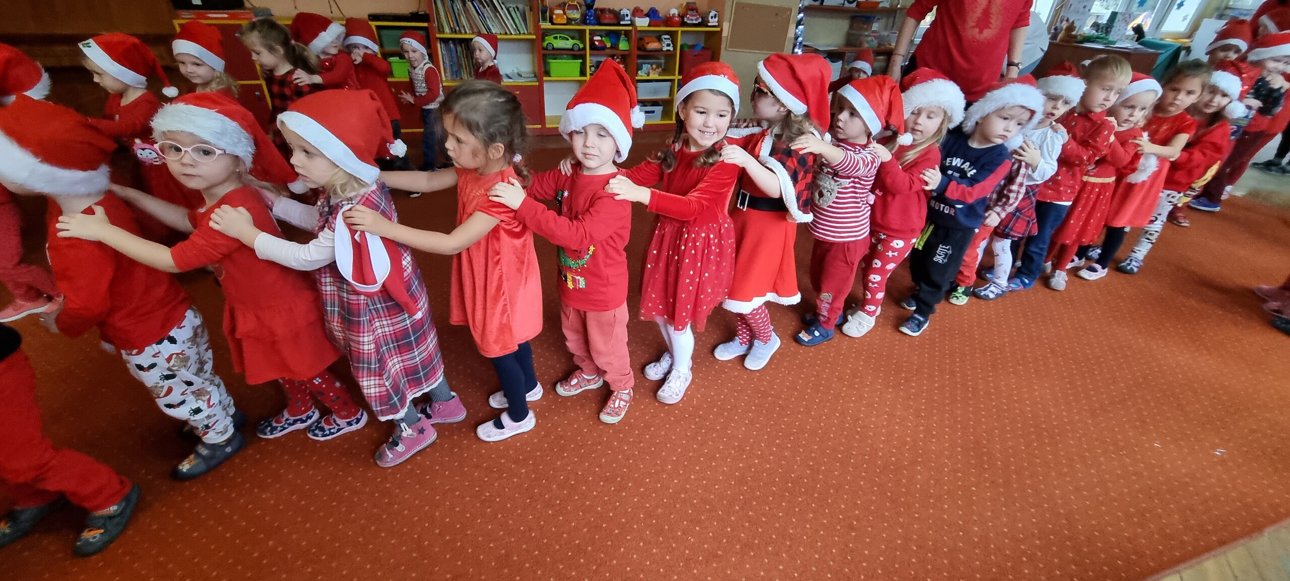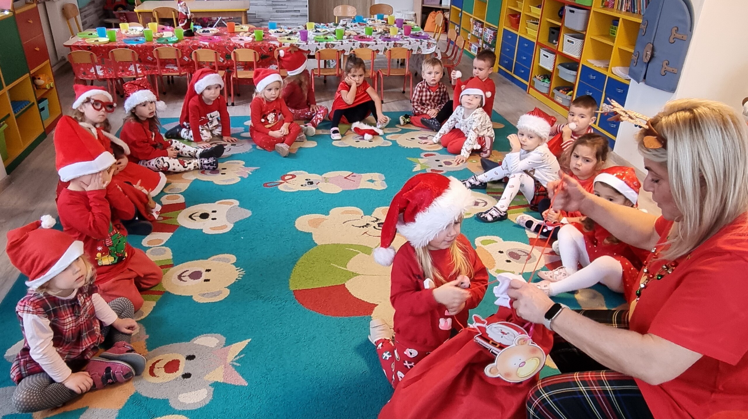 MIKOŁAJKOWA TRADYCJA jest naszym dzieciom dobrze znana. Jak co roku nasze jedynkowe przedszkole Święty Mikołaj odwiedził w piątek 6 grudnia. Wszystkie przedszkolaki w tym dniu ubrane w czerwone czapeczki i jak same bardzo często podkreślały - wyjątkowo grzeczne w tym roku, z niecierpliwością oczekiwały gościa z dalekiej i mroźnej Laponii. Oczywiście przybył razem ze swoją śnieżynką i elfami, mimo wielu, wielu przeszkód. Zmęczony daleką podróżą, ulubiony święty przedszkolaków usiadł na specjalnym fotelu, by wypić ciepłe mleczko, poczęstować się pysznymi ciasteczkami owsianymi, wysłuchać niespodzianek w postaci wierszyków, piosenek i świątecznych obrazków przygotowanych przez dzieci. Następnie zaprosiliśmy naszego specjalnego gościa do wspólnej zabawy.
