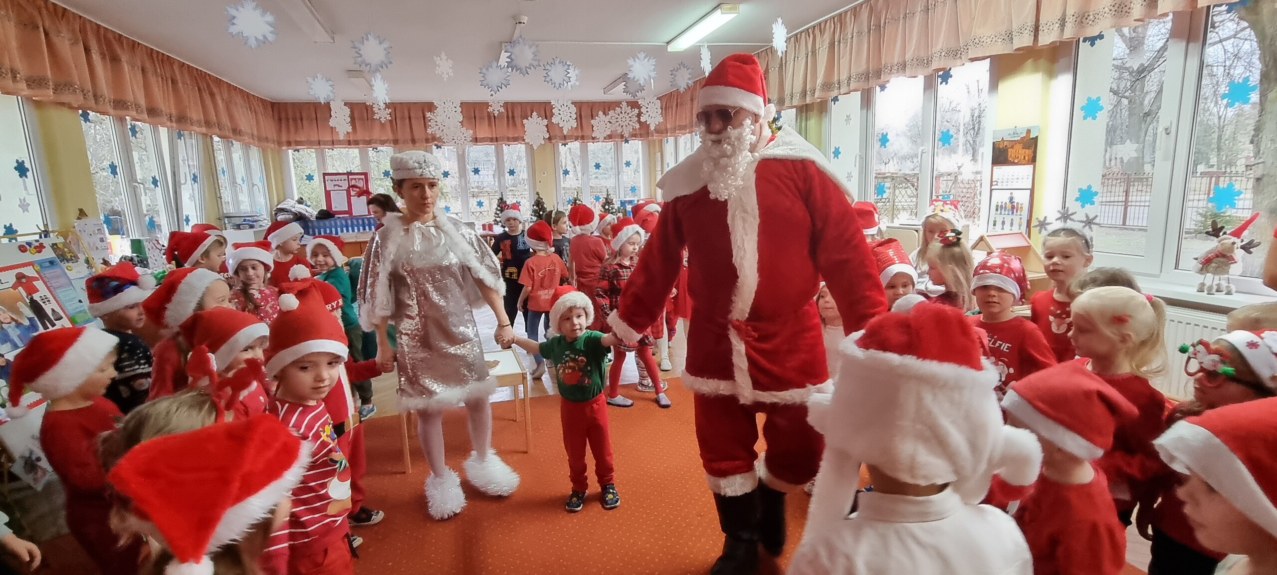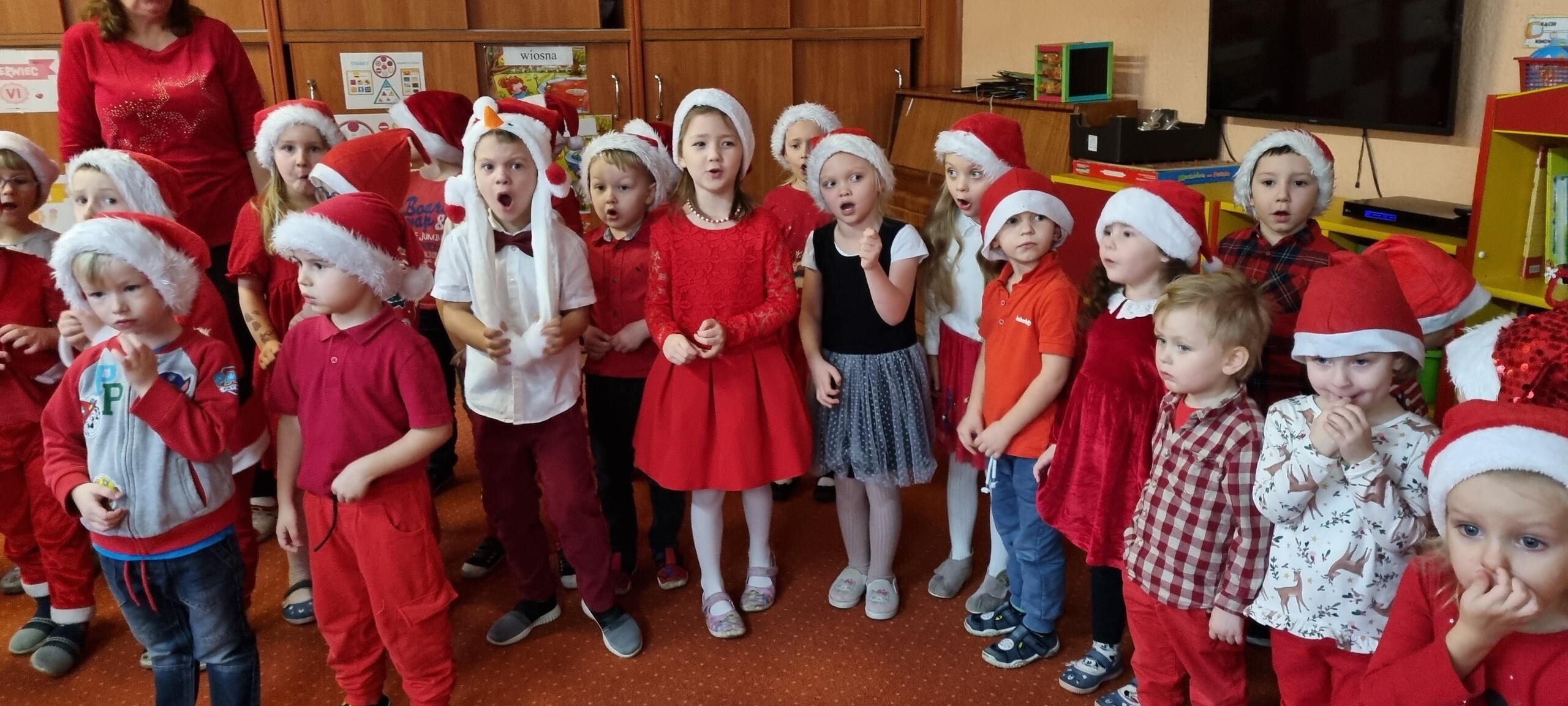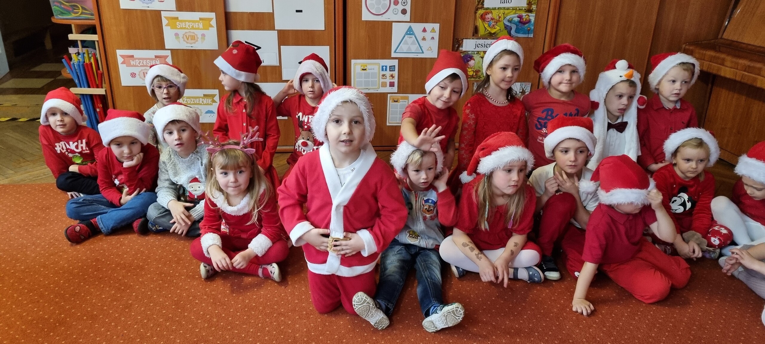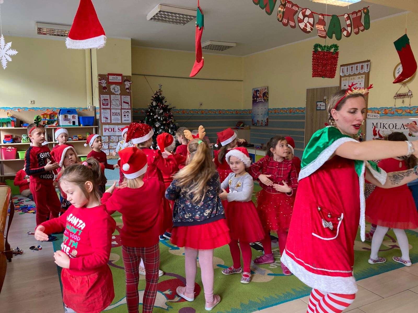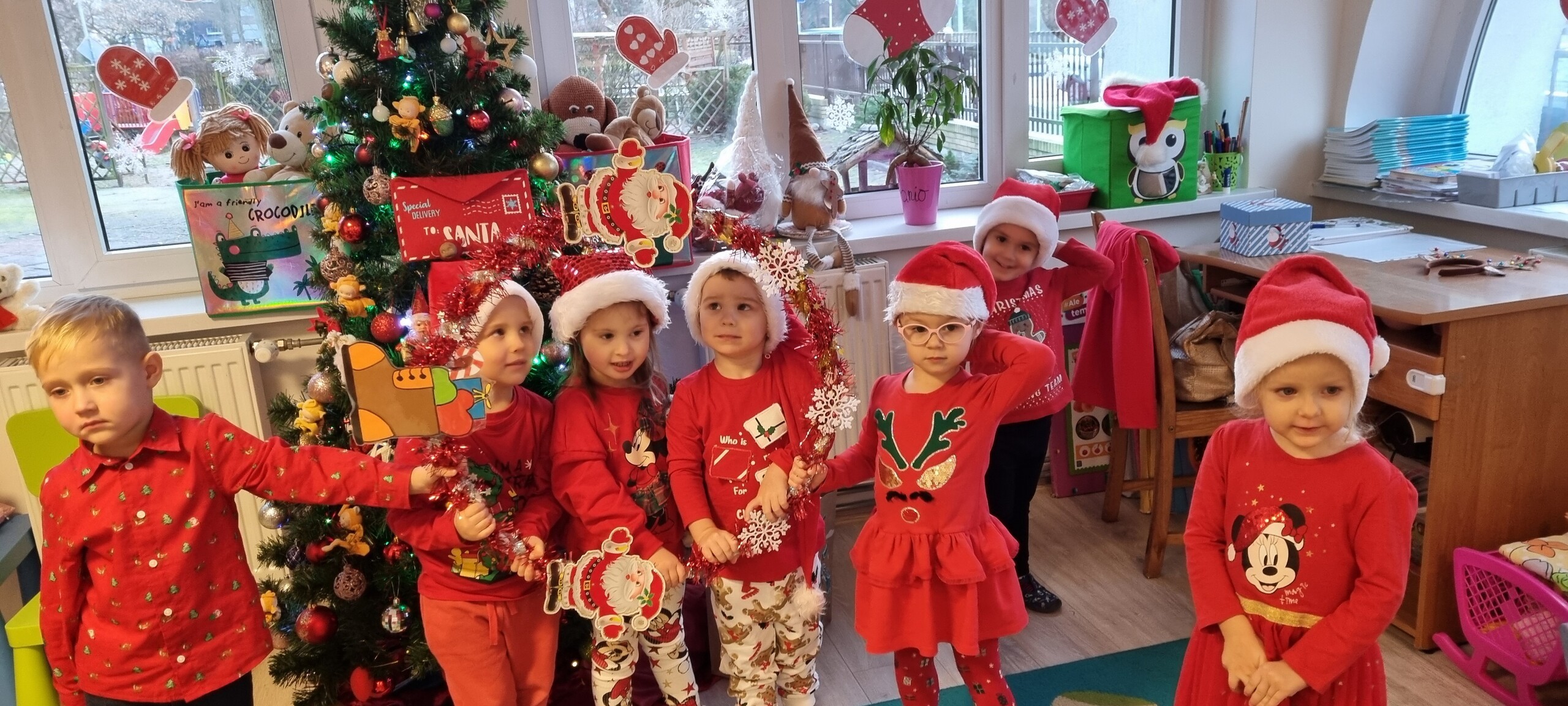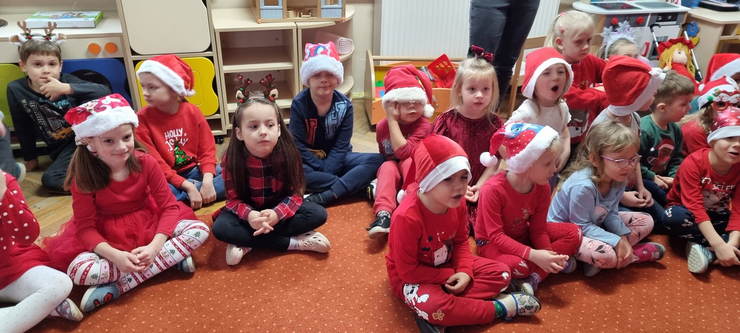 MIKOŁAJKOWA TRADYCJA jest naszym dzieciom dobrze znana. Jak co roku nasze jedynkowe przedszkole Święty Mikołaj odwiedził w piątek 6 grudnia. Wszystkie przedszkolaki w tym dniu ubrane w czerwone czapeczki i jak same bardzo często podkreślały - wyjątkowo grzeczne w tym roku, z niecierpliwością oczekiwały gościa z dalekiej i mroźnej Laponii. Oczywiście przybył razem ze swoją śnieżynką i elfami, mimo wielu, wielu przeszkód. Zmęczony daleką podróżą, ulubiony święty przedszkolaków usiadł na specjalnym fotelu, by wypić ciepłe mleczko, poczęstować się pysznymi ciasteczkami owsianymi, wysłuchać niespodzianek w postaci wierszyków, piosenek i świątecznych obrazków przygotowanych przez dzieci. Następnie zaprosiliśmy naszego specjalnego gościa do wspólnej zabawy.