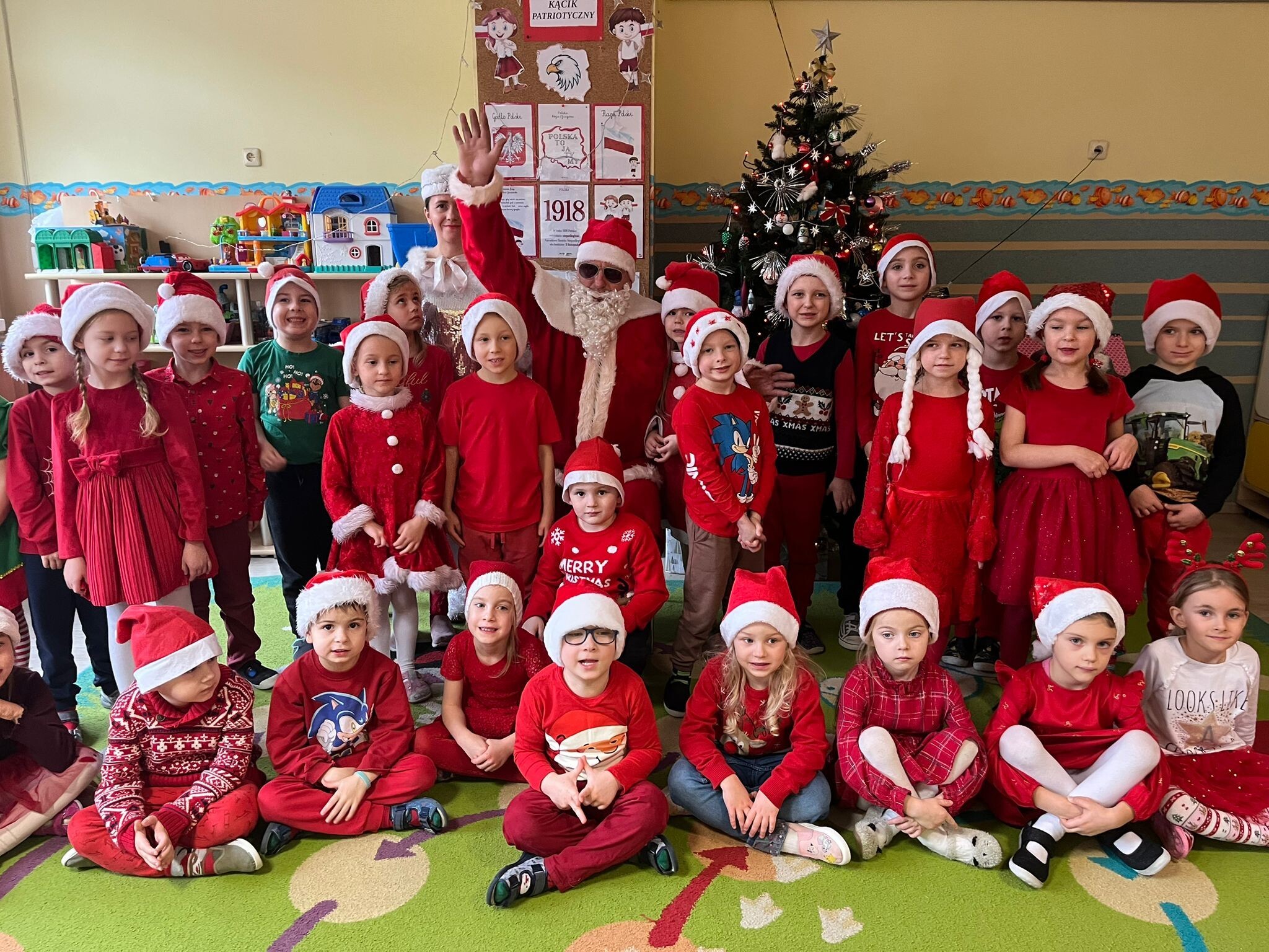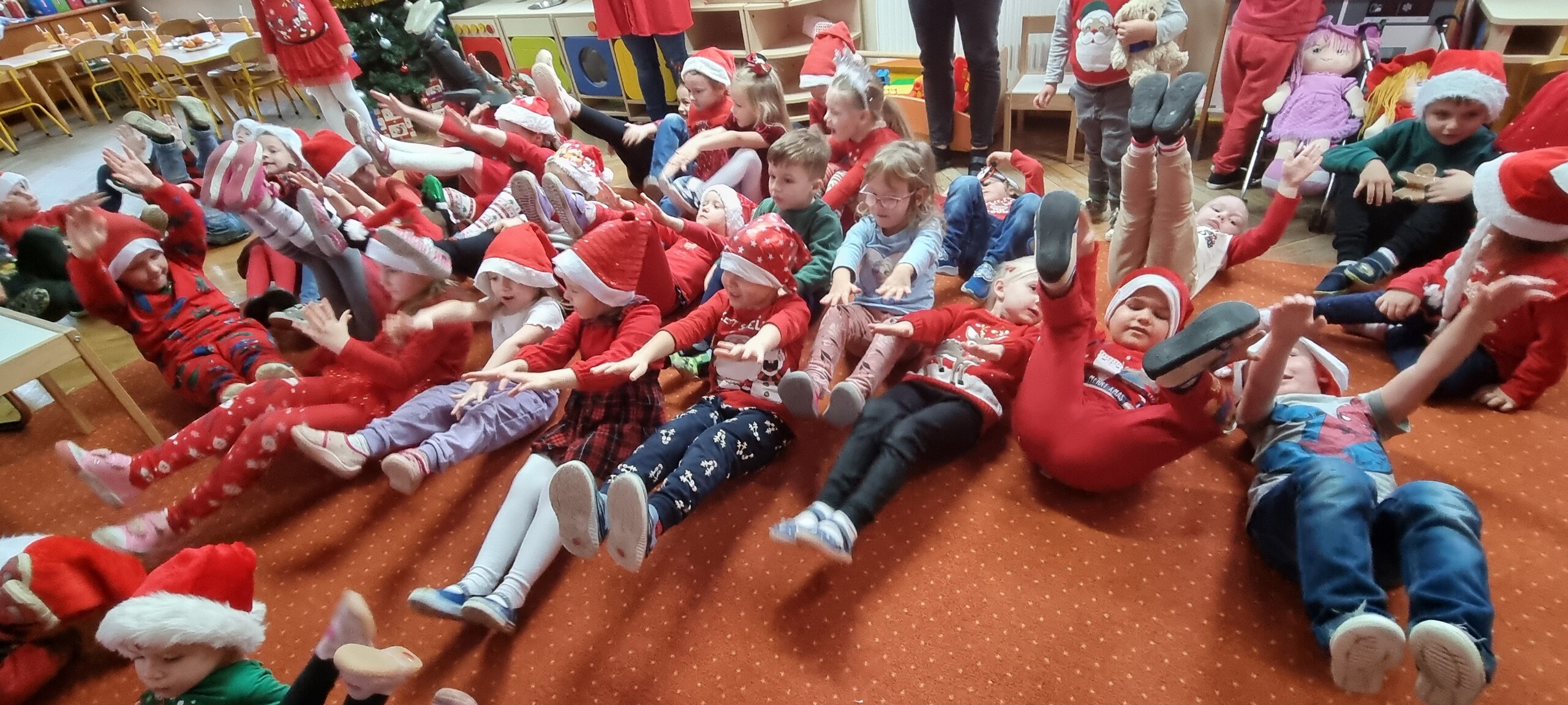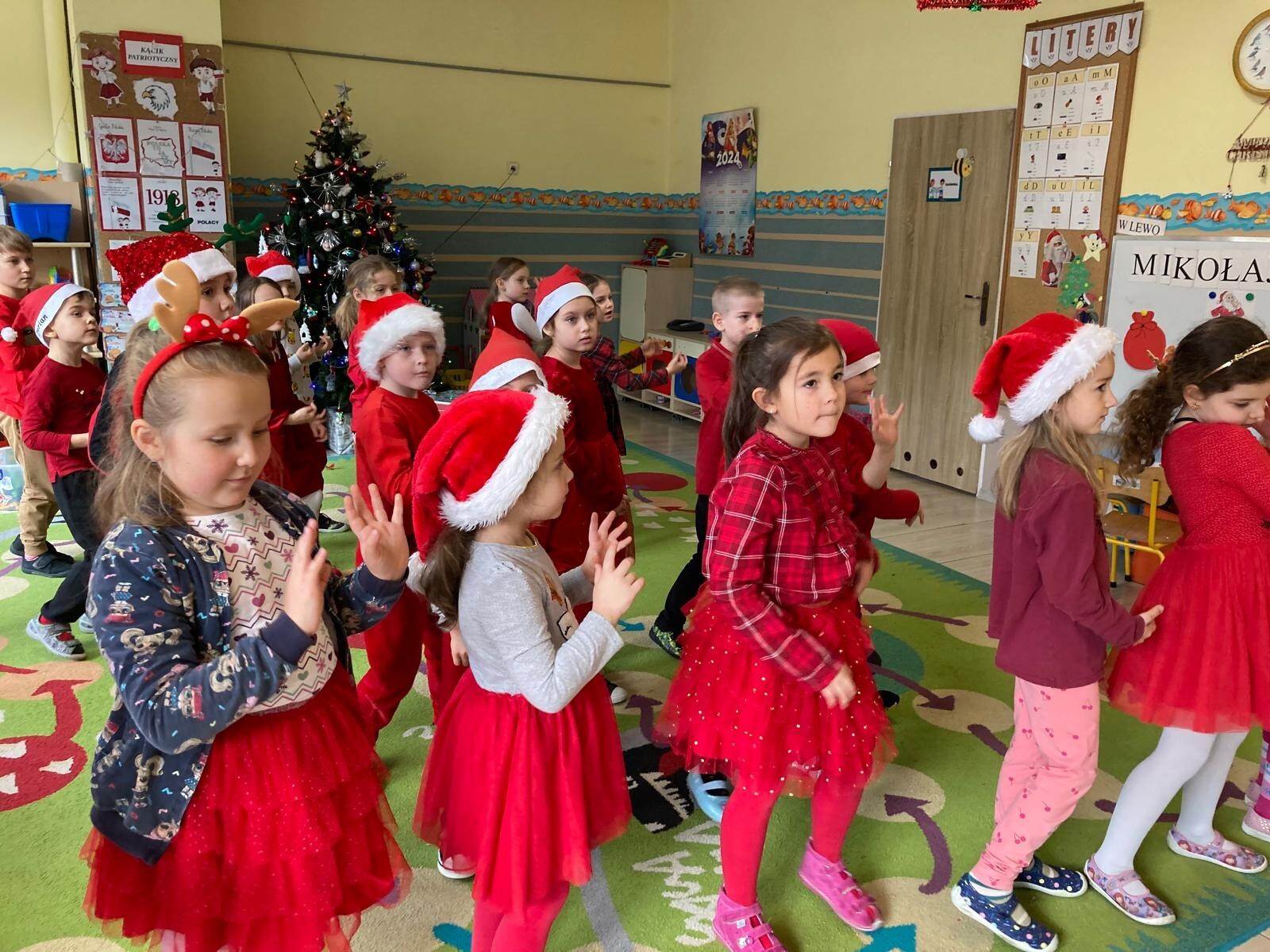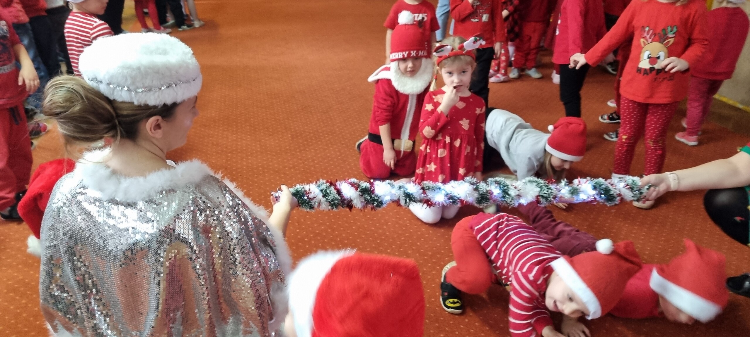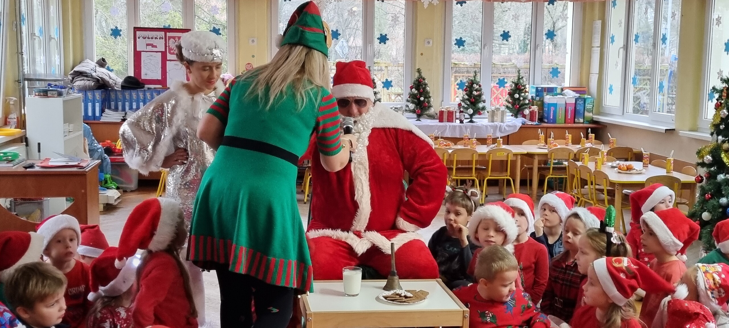 MIKOŁAJKOWA TRADYCJA jest naszym dzieciom dobrze znana. Jak co roku nasze jedynkowe przedszkole Święty Mikołaj odwiedził w piątek 6 grudnia. Wszystkie przedszkolaki w tym dniu ubrane w czerwone czapeczki i jak same bardzo często podkreślały - wyjątkowo grzeczne w tym roku, z niecierpliwością oczekiwały gościa z dalekiej i mroźnej Laponii. Oczywiście przybył razem ze swoją śnieżynką i elfami, mimo wielu, wielu przeszkód. Zmęczony daleką podróżą, ulubiony święty przedszkolaków usiadł na specjalnym fotelu, by wypić ciepłe mleczko, poczęstować się pysznymi ciasteczkami owsianymi, wysłuchać niespodzianek w postaci wierszyków, piosenek i świątecznych obrazków przygotowanych przez dzieci. Następnie zaprosiliśmy naszego specjalnego gościa do wspólnej zabawy.