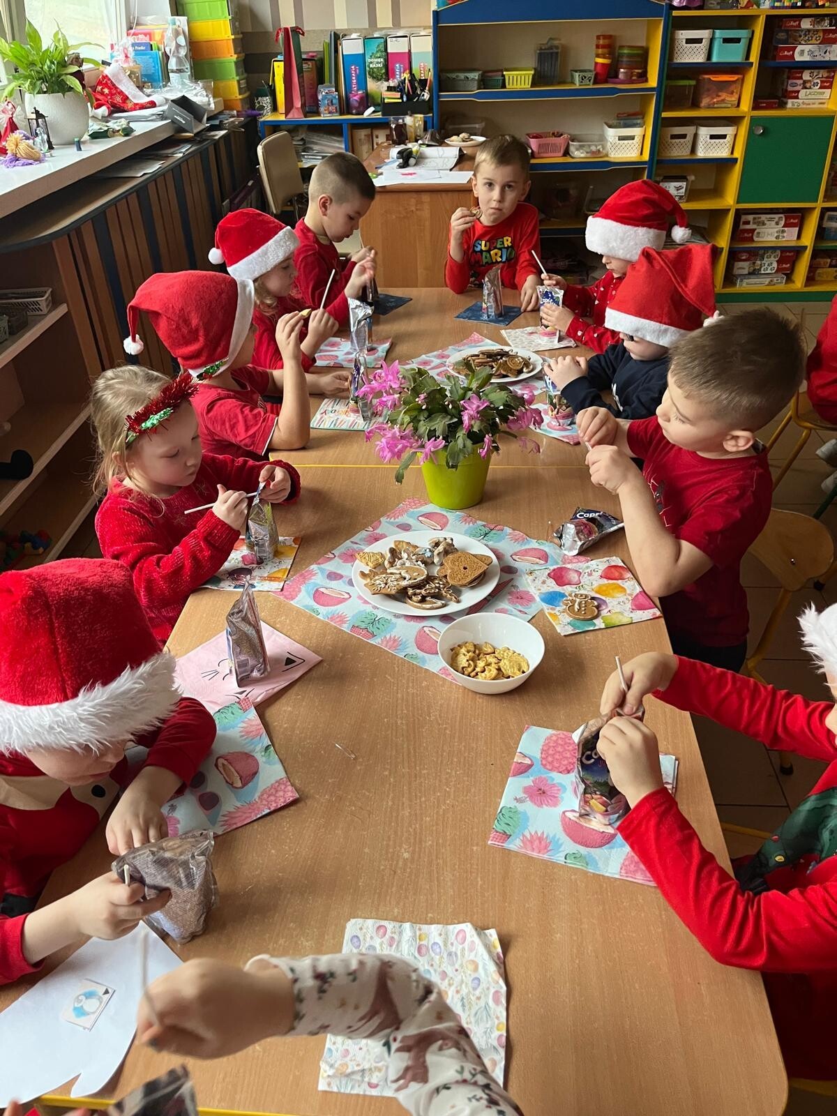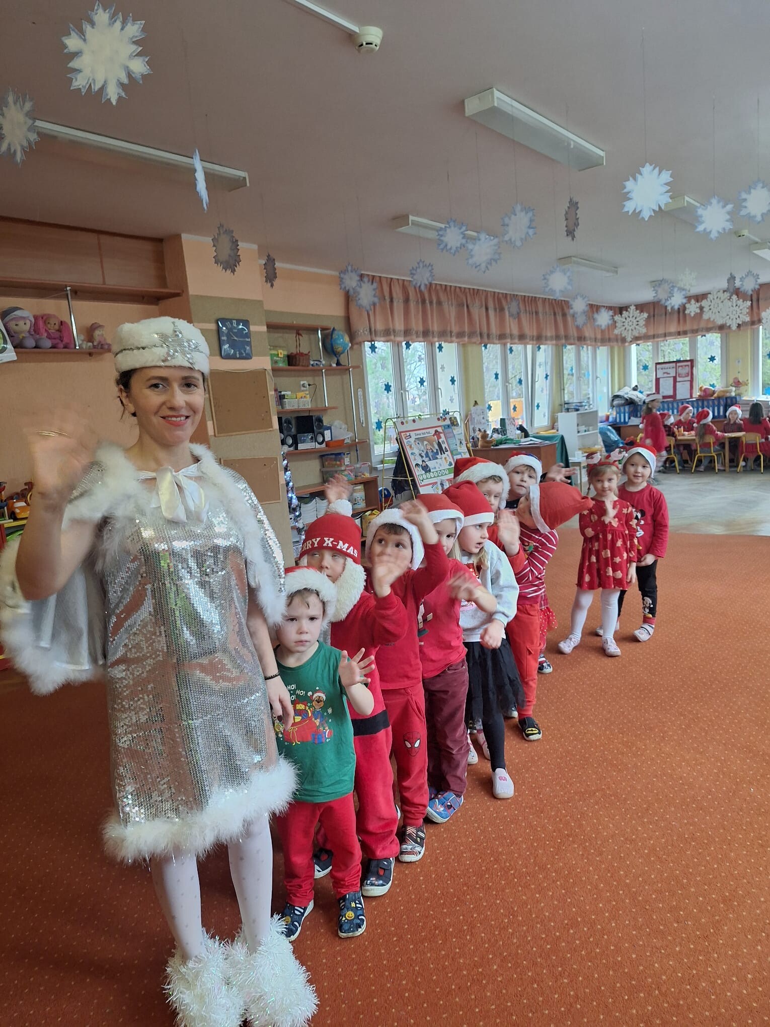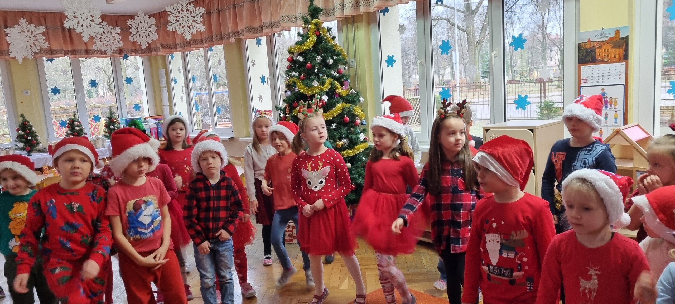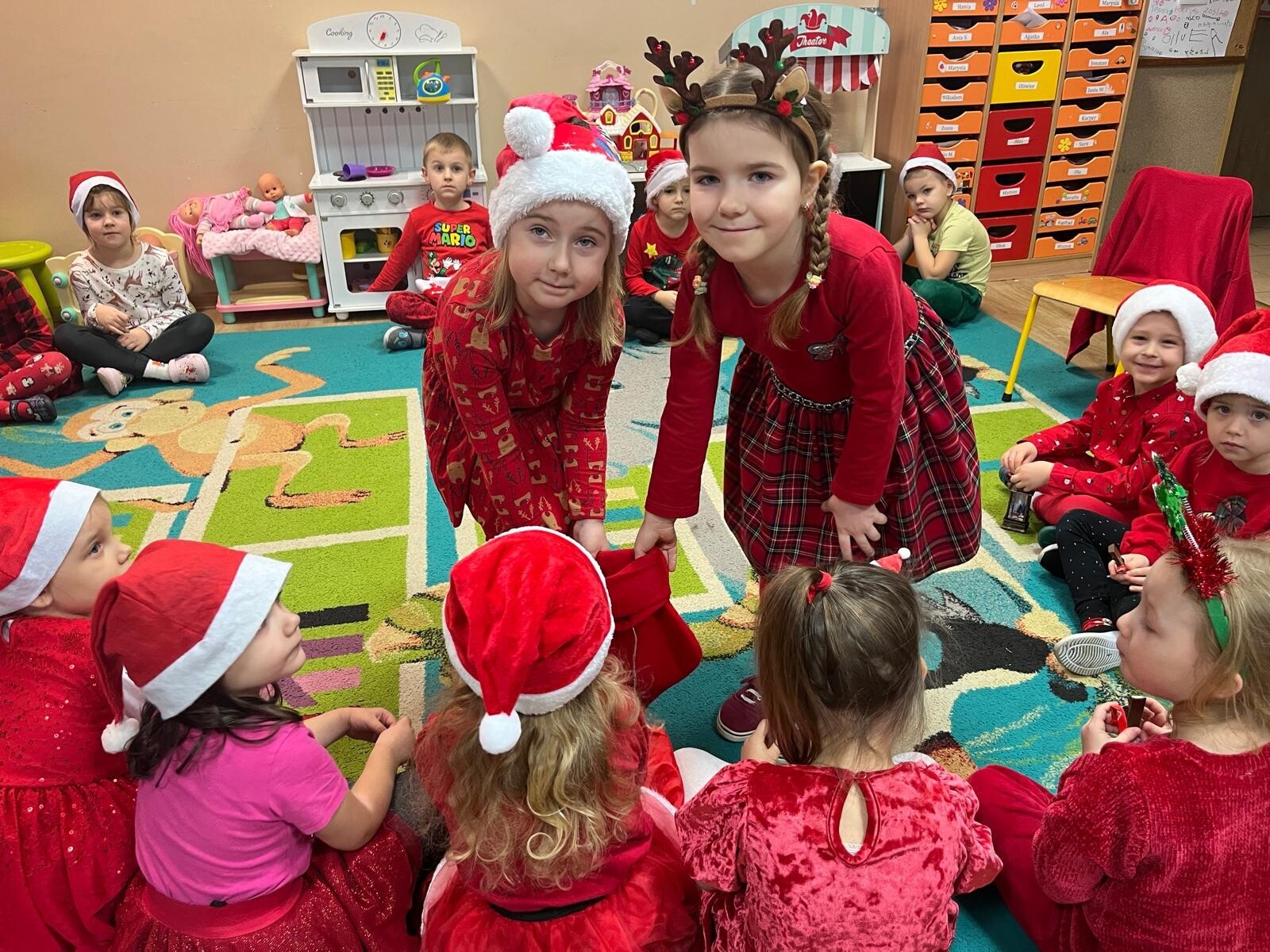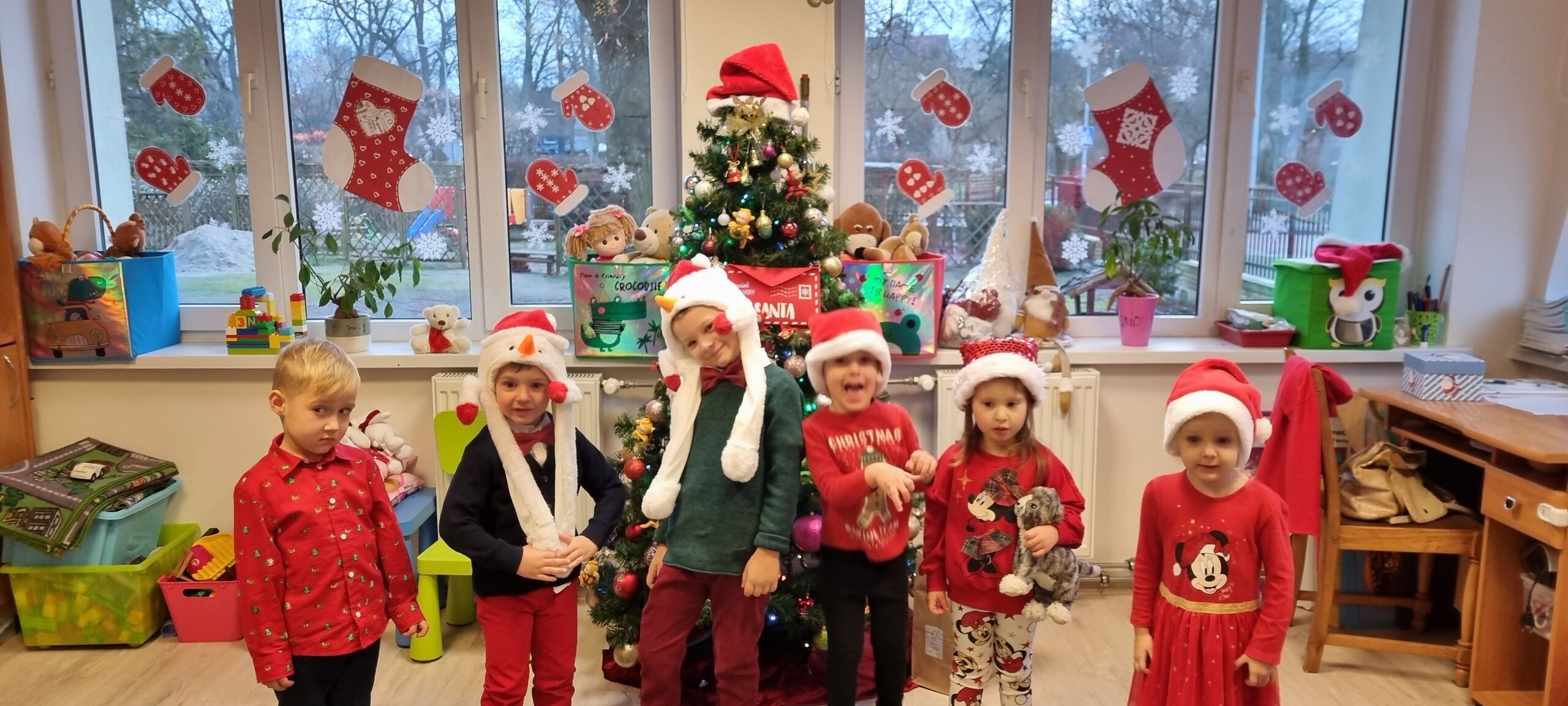 MIKOŁAJKOWA TRADYCJA jest naszym dzieciom dobrze znana. Jak co roku nasze jedynkowe przedszkole Święty Mikołaj odwiedził w piątek 6 grudnia. Wszystkie przedszkolaki w tym dniu ubrane w czerwone czapeczki i jak same bardzo często podkreślały - wyjątkowo grzeczne w tym roku, z niecierpliwością oczekiwały gościa z dalekiej i mroźnej Laponii. Oczywiście przybył razem ze swoją śnieżynką i elfami, mimo wielu, wielu przeszkód. Zmęczony daleką podróżą, ulubiony święty przedszkolaków usiadł na specjalnym fotelu, by wypić ciepłe mleczko, poczęstować się pysznymi ciasteczkami owsianymi, wysłuchać niespodzianek w postaci wierszyków, piosenek i świątecznych obrazków przygotowanych przez dzieci. Następnie zaprosiliśmy naszego specjalnego gościa do wspólnej zabawy.