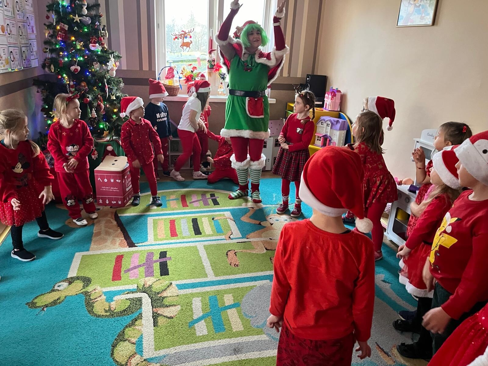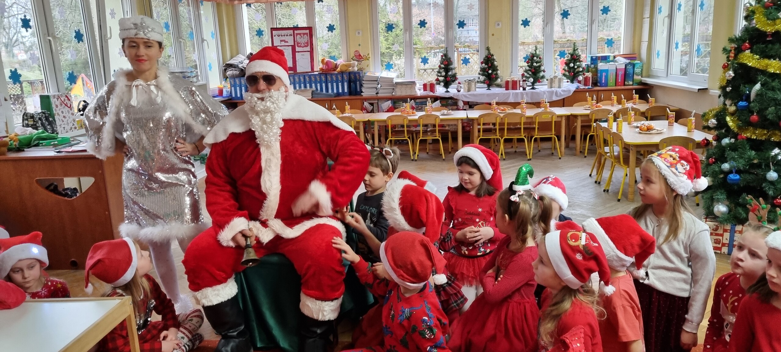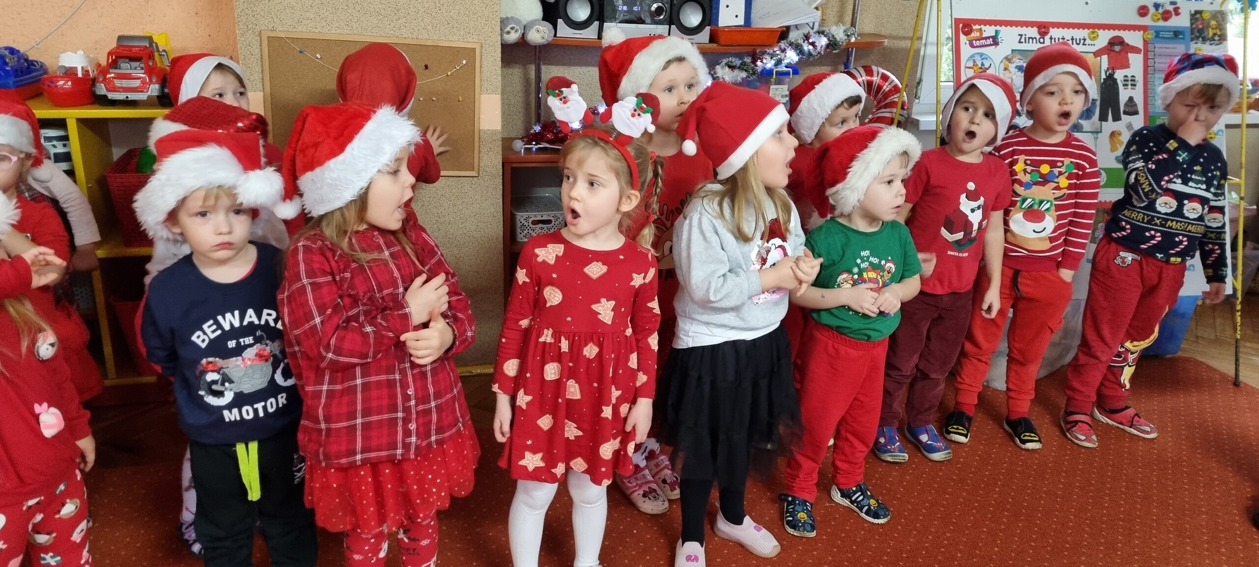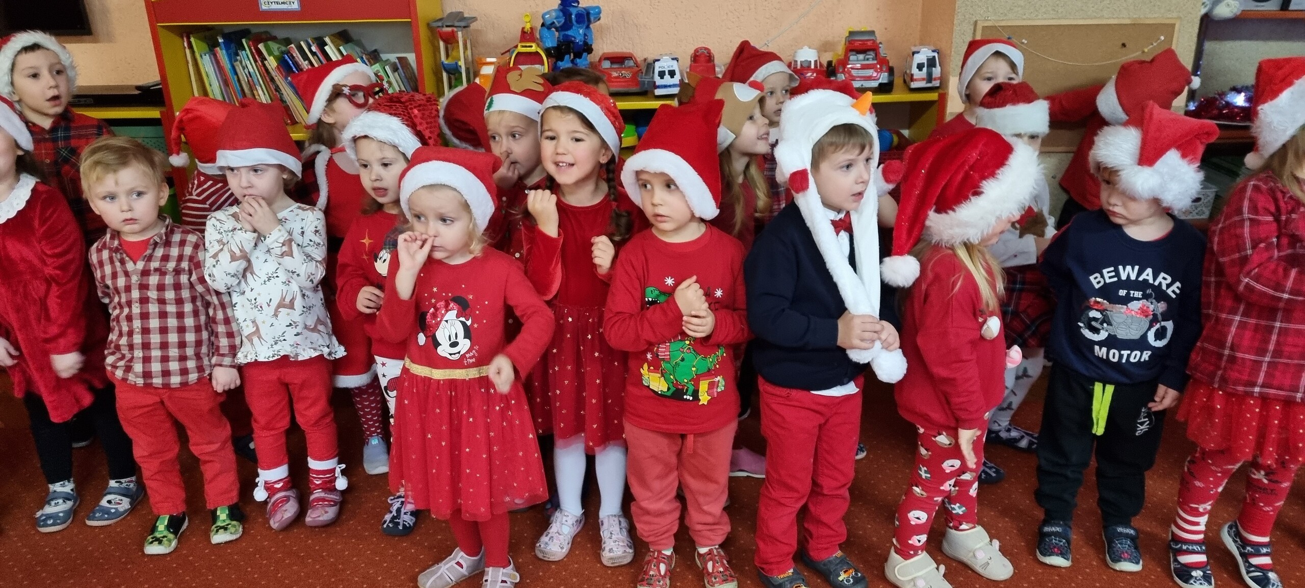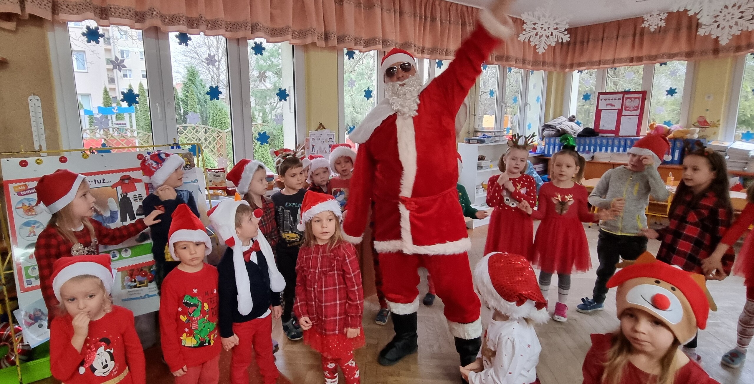 MIKOŁAJKOWA TRADYCJA jest naszym dzieciom dobrze znana. Jak co roku nasze jedynkowe przedszkole Święty Mikołaj odwiedził w piątek 6 grudnia. Wszystkie przedszkolaki w tym dniu ubrane w czerwone czapeczki i jak same bardzo często podkreślały - wyjątkowo grzeczne w tym roku, z niecierpliwością oczekiwały gościa z dalekiej i mroźnej Laponii. Oczywiście przybył razem ze swoją śnieżynką i elfami, mimo wielu, wielu przeszkód. Zmęczony daleką podróżą, ulubiony święty przedszkolaków usiadł na specjalnym fotelu, by wypić ciepłe mleczko, poczęstować się pysznymi ciasteczkami owsianymi, wysłuchać niespodzianek w postaci wierszyków, piosenek i świątecznych obrazków przygotowanych przez dzieci. Następnie zaprosiliśmy naszego specjalnego gościa do wspólnej zabawy.