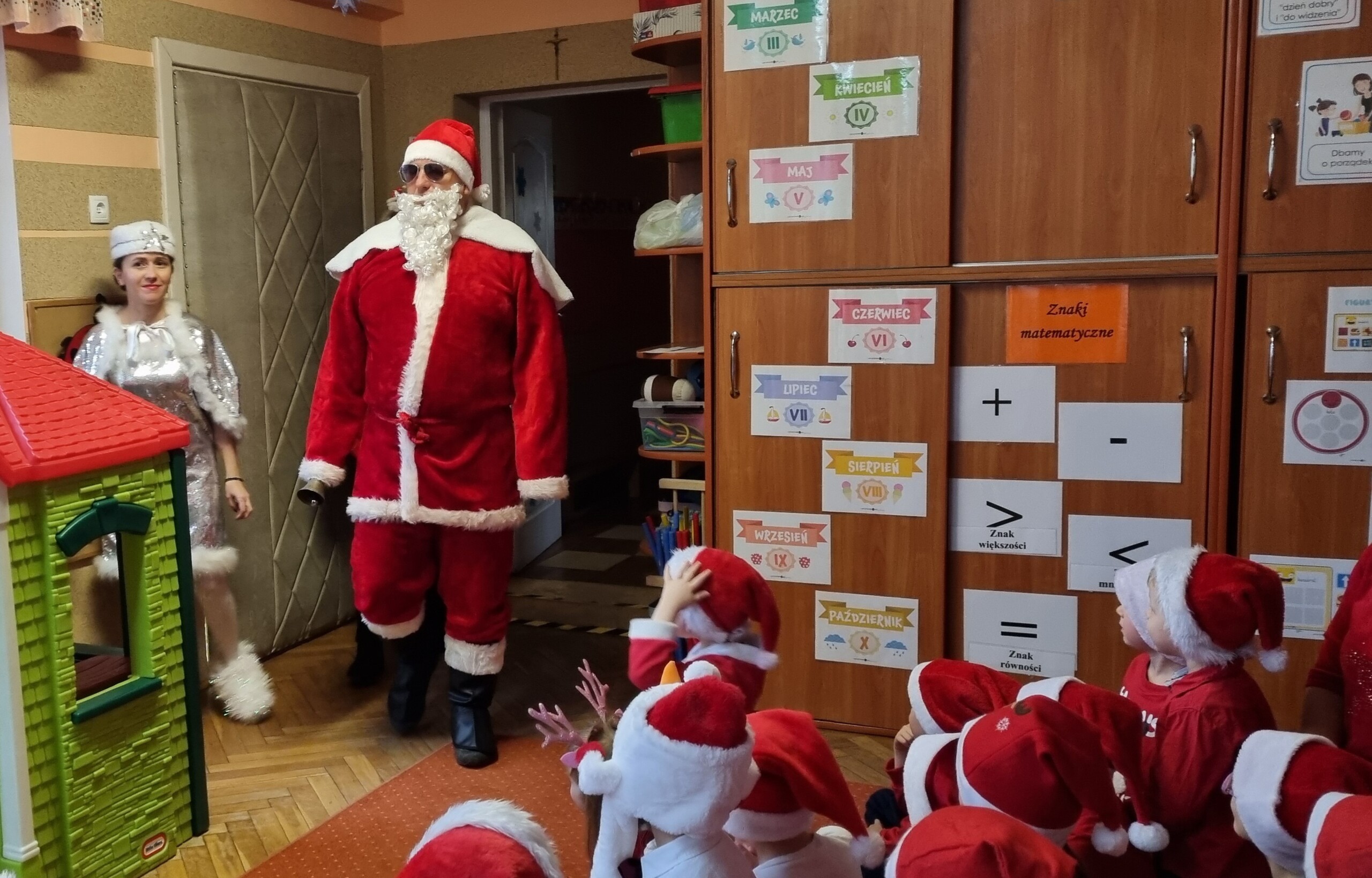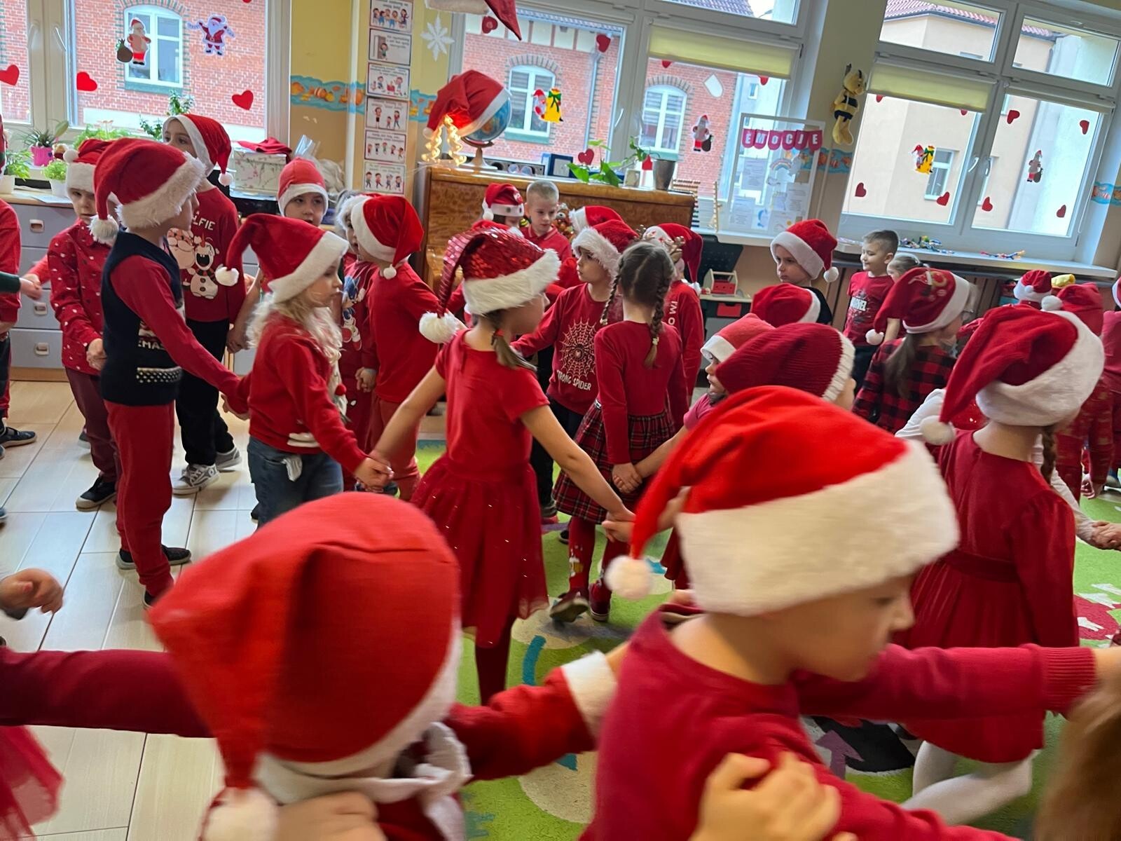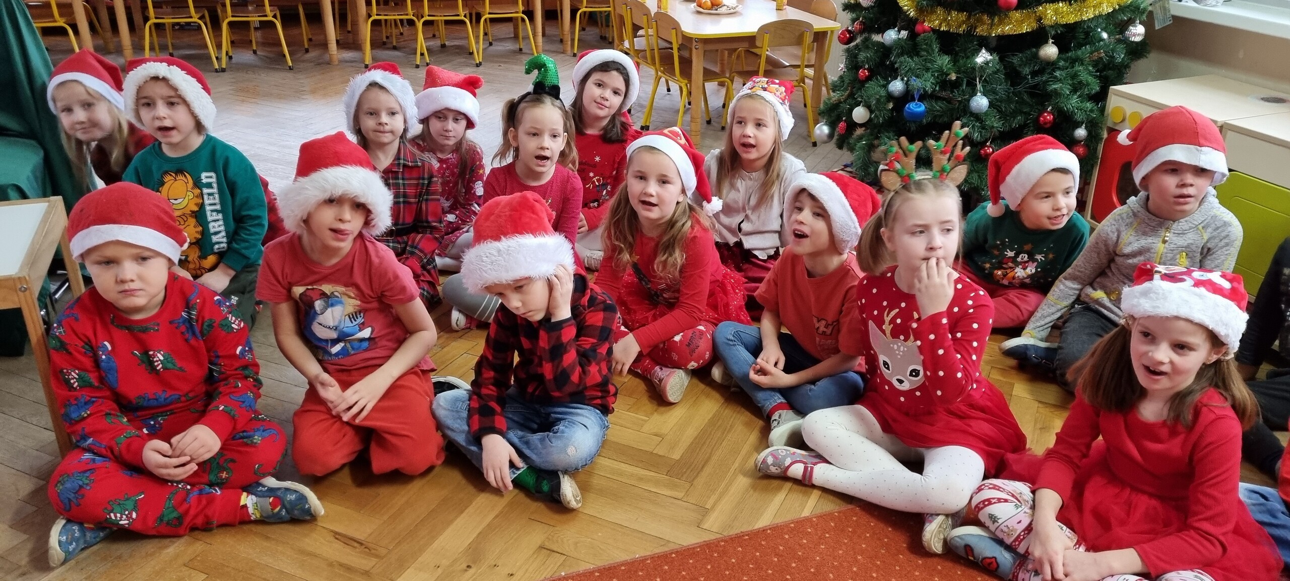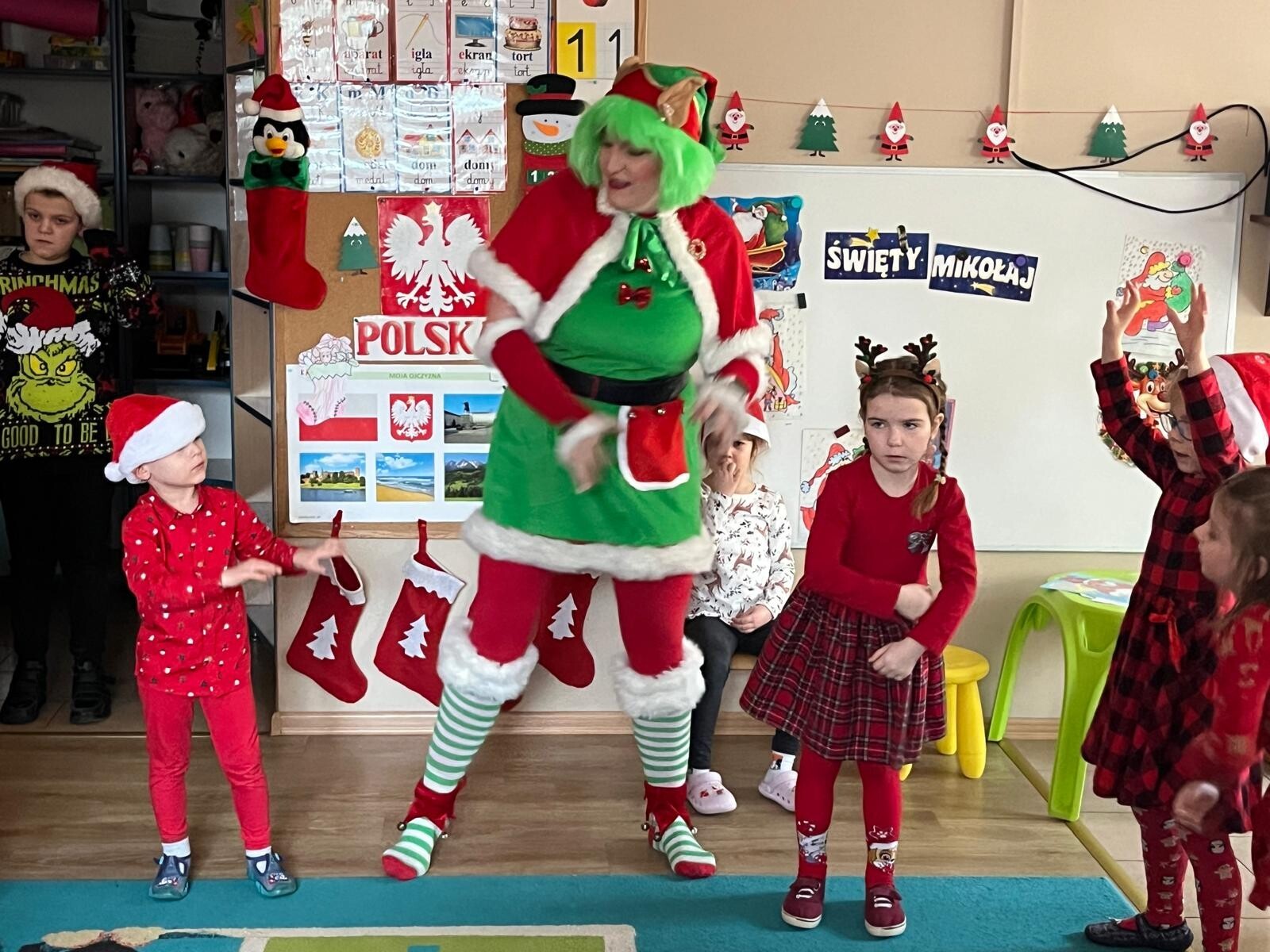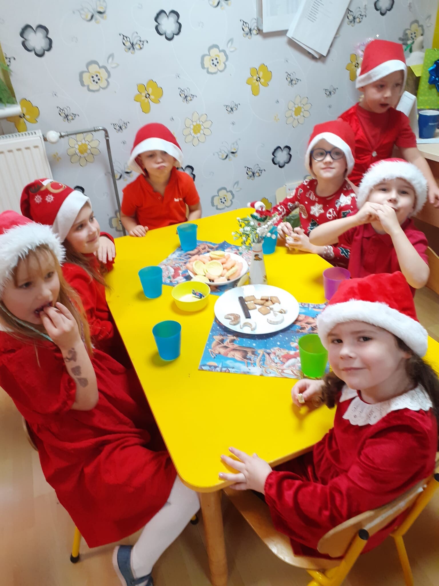 MIKOŁAJKOWA TRADYCJA jest naszym dzieciom dobrze znana. Jak co roku nasze jedynkowe przedszkole Święty Mikołaj odwiedził w piątek 6 grudnia. Wszystkie przedszkolaki w tym dniu ubrane w czerwone czapeczki i jak same bardzo często podkreślały - wyjątkowo grzeczne w tym roku, z niecierpliwością oczekiwały gościa z dalekiej i mroźnej Laponii. Oczywiście przybył razem ze swoją śnieżynką i elfami, mimo wielu, wielu przeszkód. Zmęczony daleką podróżą, ulubiony święty przedszkolaków usiadł na specjalnym fotelu, by wypić ciepłe mleczko, poczęstować się pysznymi ciasteczkami owsianymi, wysłuchać niespodzianek w postaci wierszyków, piosenek i świątecznych obrazków przygotowanych przez dzieci. Następnie zaprosiliśmy naszego specjalnego gościa do wspólnej zabawy.