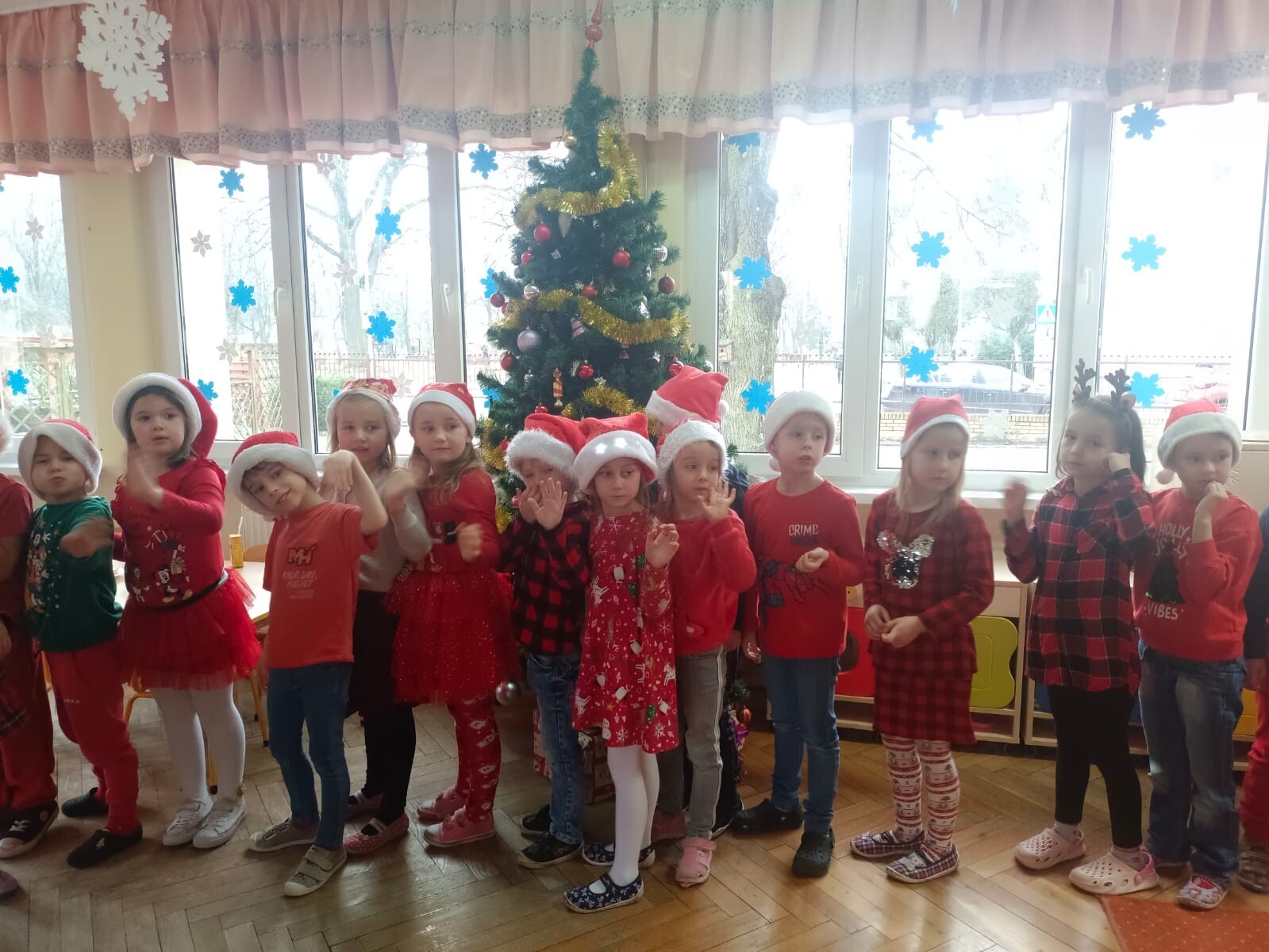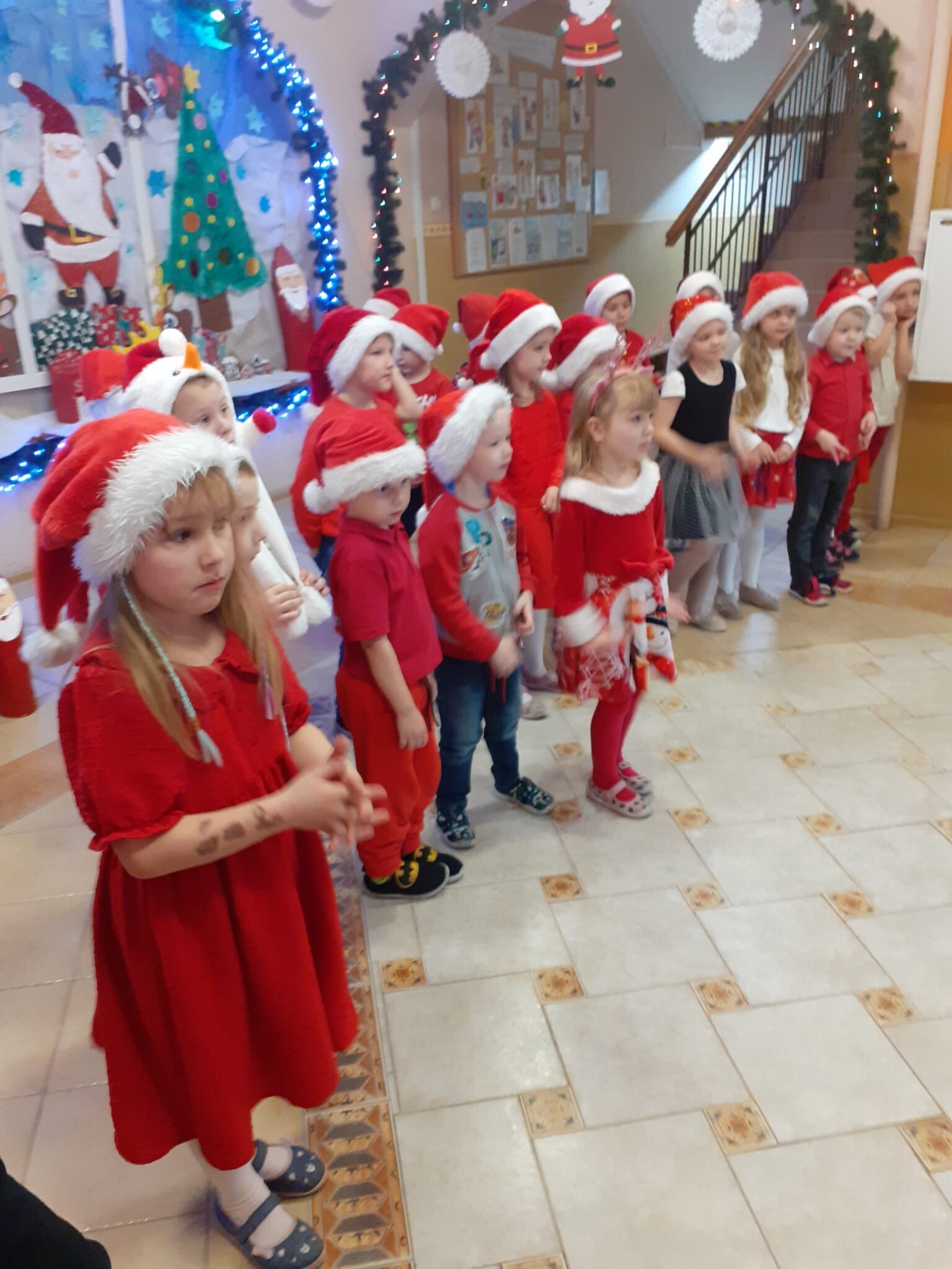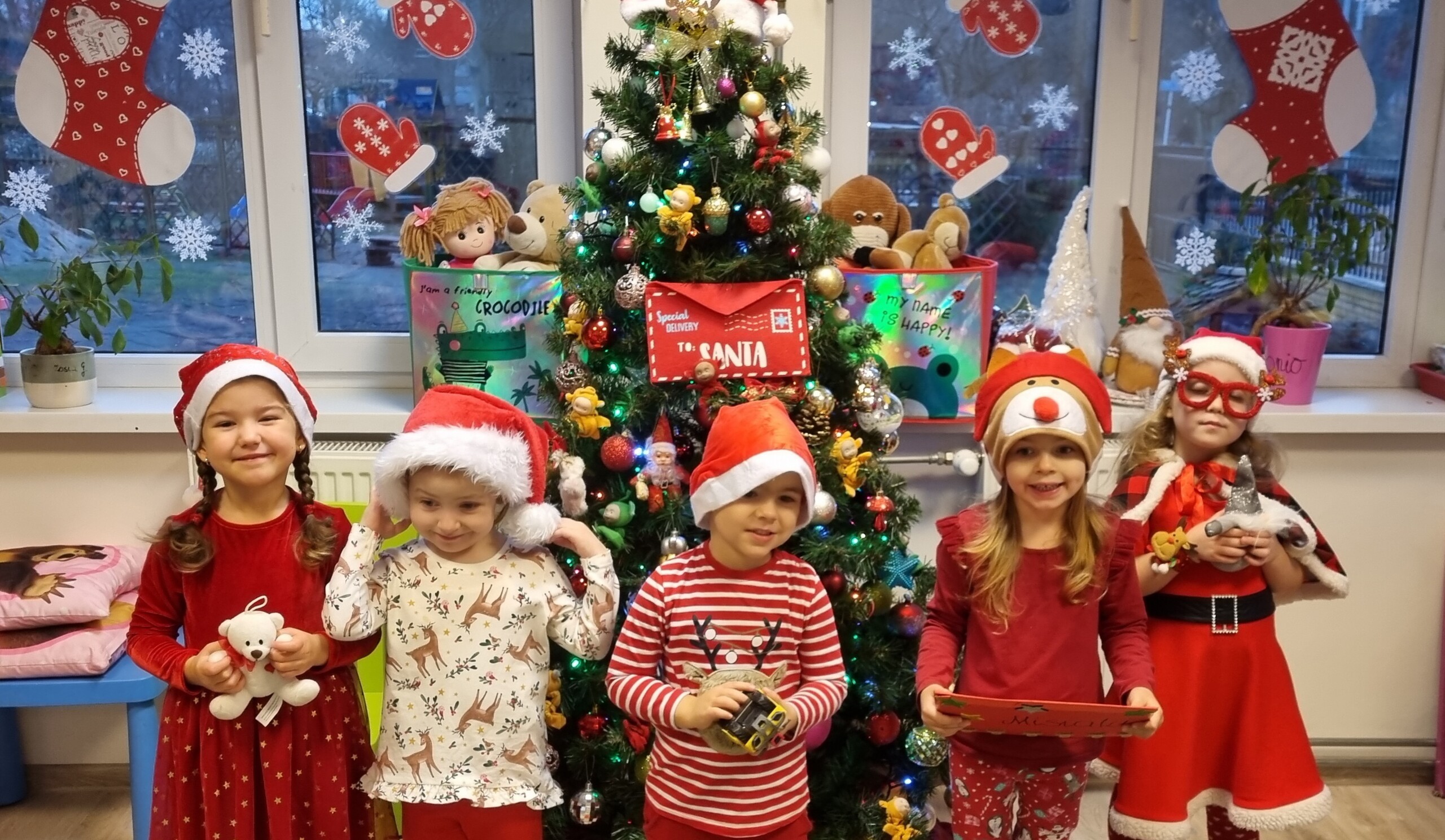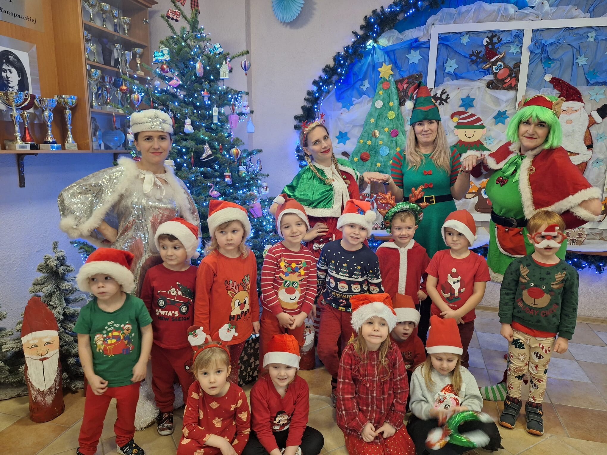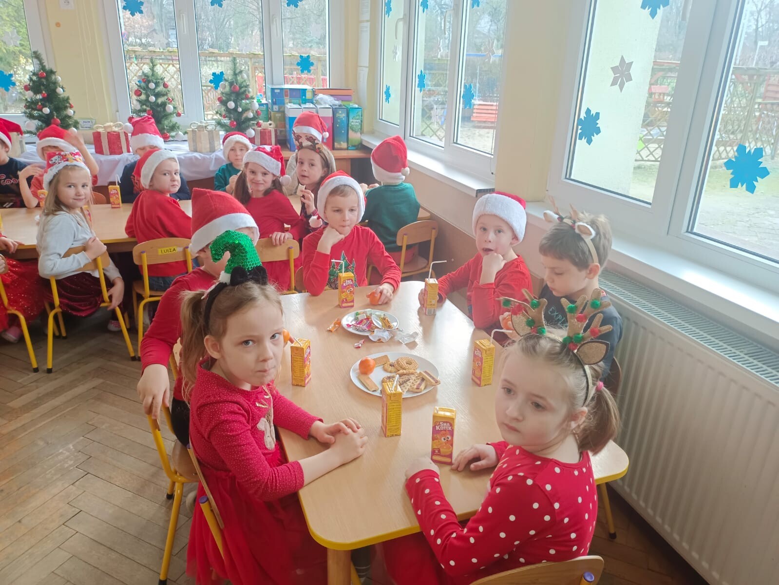 MIKOŁAJKOWA TRADYCJA jest naszym dzieciom dobrze znana. Jak co roku nasze jedynkowe przedszkole Święty Mikołaj odwiedził w piątek 6 grudnia. Wszystkie przedszkolaki w tym dniu ubrane w czerwone czapeczki i jak same bardzo często podkreślały - wyjątkowo grzeczne w tym roku, z niecierpliwością oczekiwały gościa z dalekiej i mroźnej Laponii. Oczywiście przybył razem ze swoją śnieżynką i elfami, mimo wielu, wielu przeszkód. Zmęczony daleką podróżą, ulubiony święty przedszkolaków usiadł na specjalnym fotelu, by wypić ciepłe mleczko, poczęstować się pysznymi ciasteczkami owsianymi, wysłuchać niespodzianek w postaci wierszyków, piosenek i świątecznych obrazków przygotowanych przez dzieci. Następnie zaprosiliśmy naszego specjalnego gościa do wspólnej zabawy.