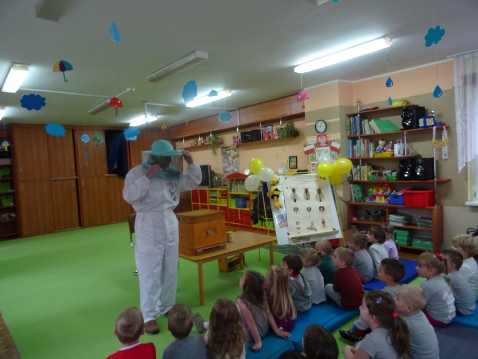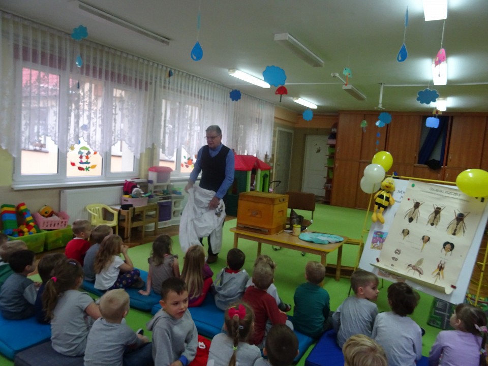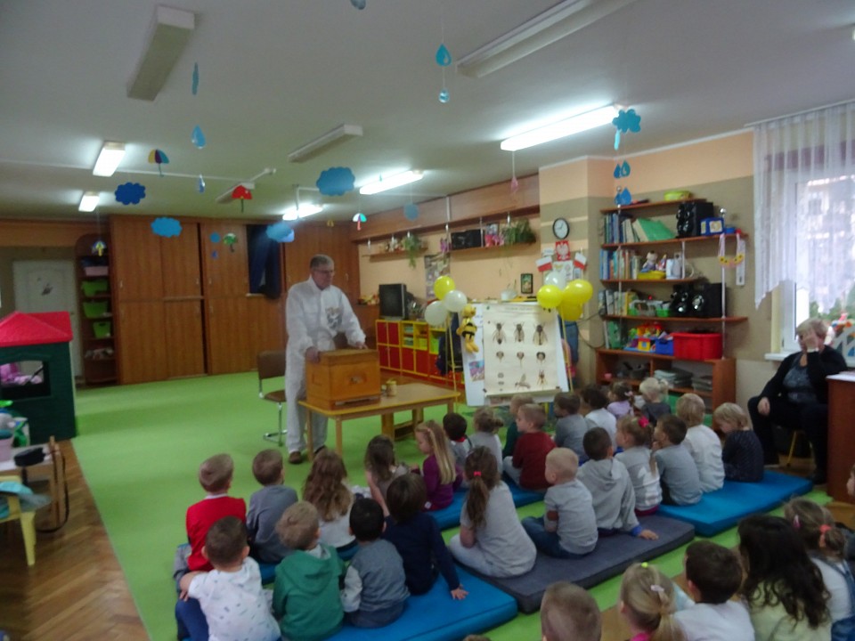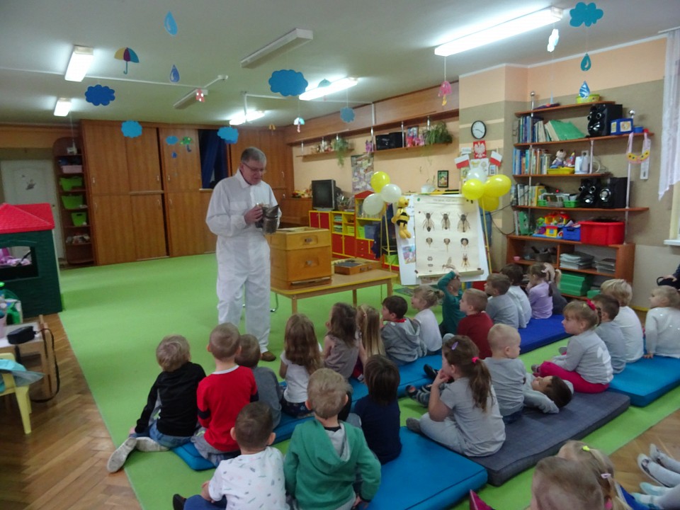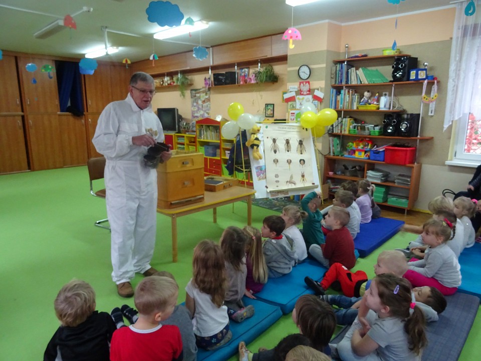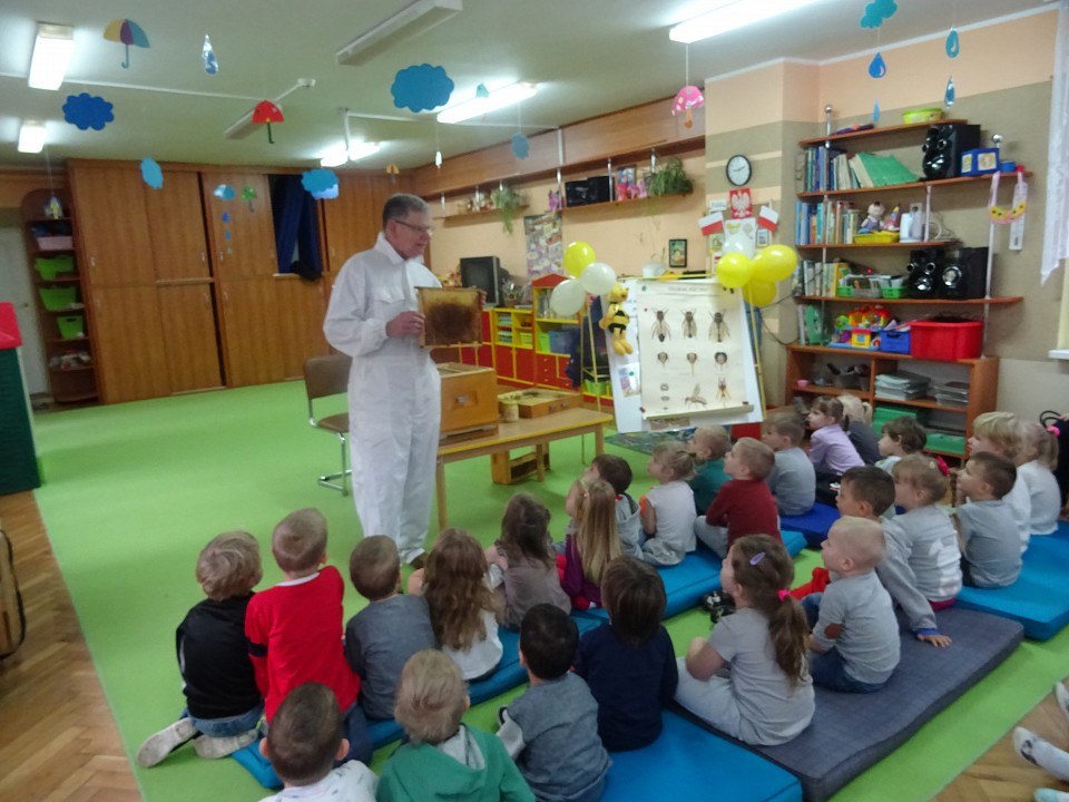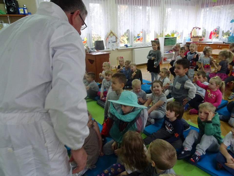 W środę 21 listopada BIEDRONKI, PSZCZÓŁKI i KOTKI, a kilka dni później MISIAKI, SŁONECZKA, KRASNOLUDKI i ŻABKI odwiedził Pan Pszczelarz Jan Przychoda.Opowiadał dzieciom o życiu i zwyczajach pszczół, wykonywanej przez nich pracy oraz znaczeniu w przyrodzie. Dzieci mogły z bliska obejrzeć przyrządy pszczelarza - kombinezon pszczelarski, ramkę na której pszczoły składają miód, dymkę, transportówkę oraz produkty wytworzone przez pszczoły - pyłek kwiatowy, kit pszczeli i posmakować miodu. Spotkanie poszerzyło wiedzę dzieci na temat pszczelarstwa oraz umożliwiło kontakt z produktami stworzonymi przez naturę.