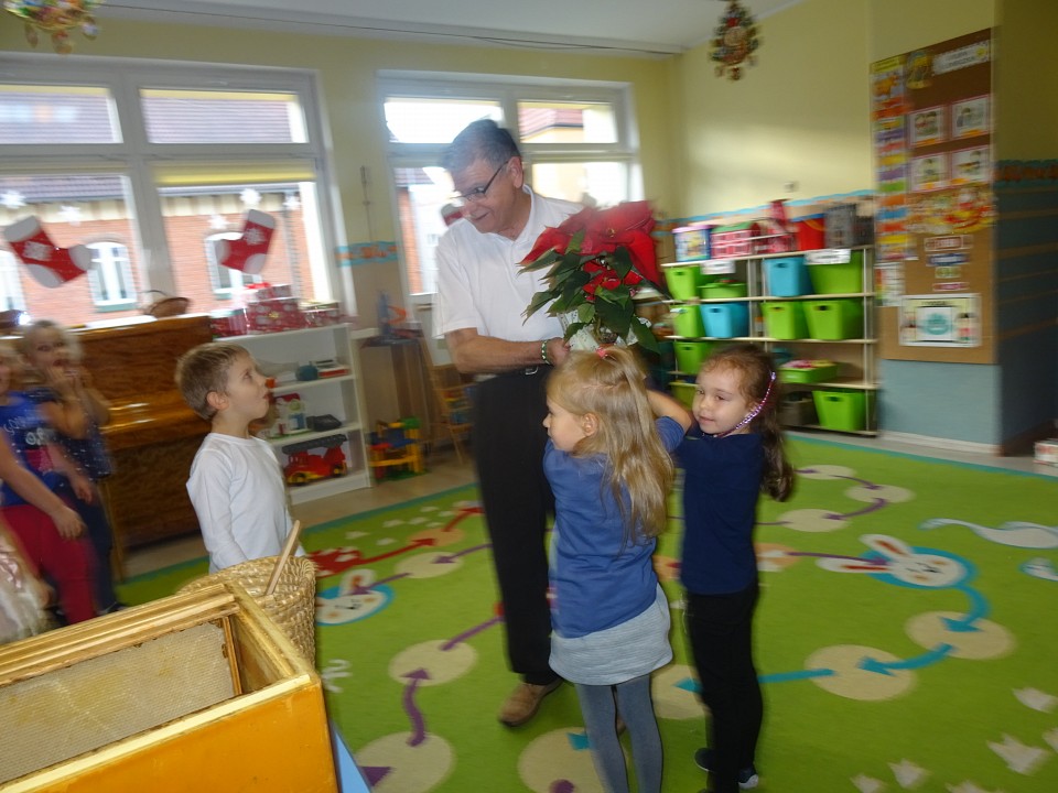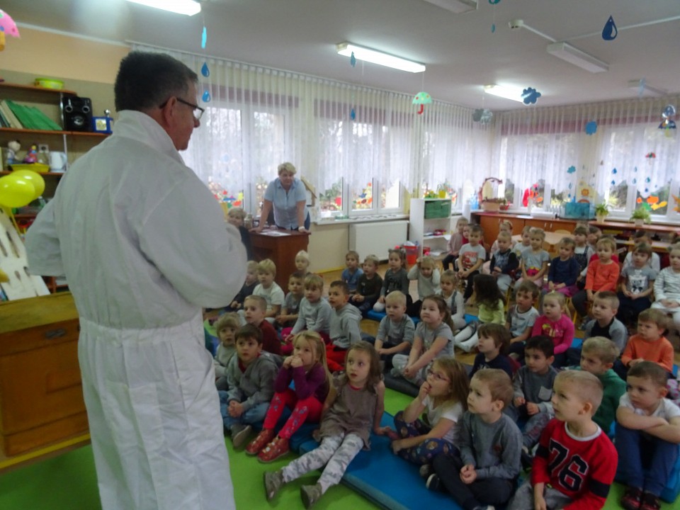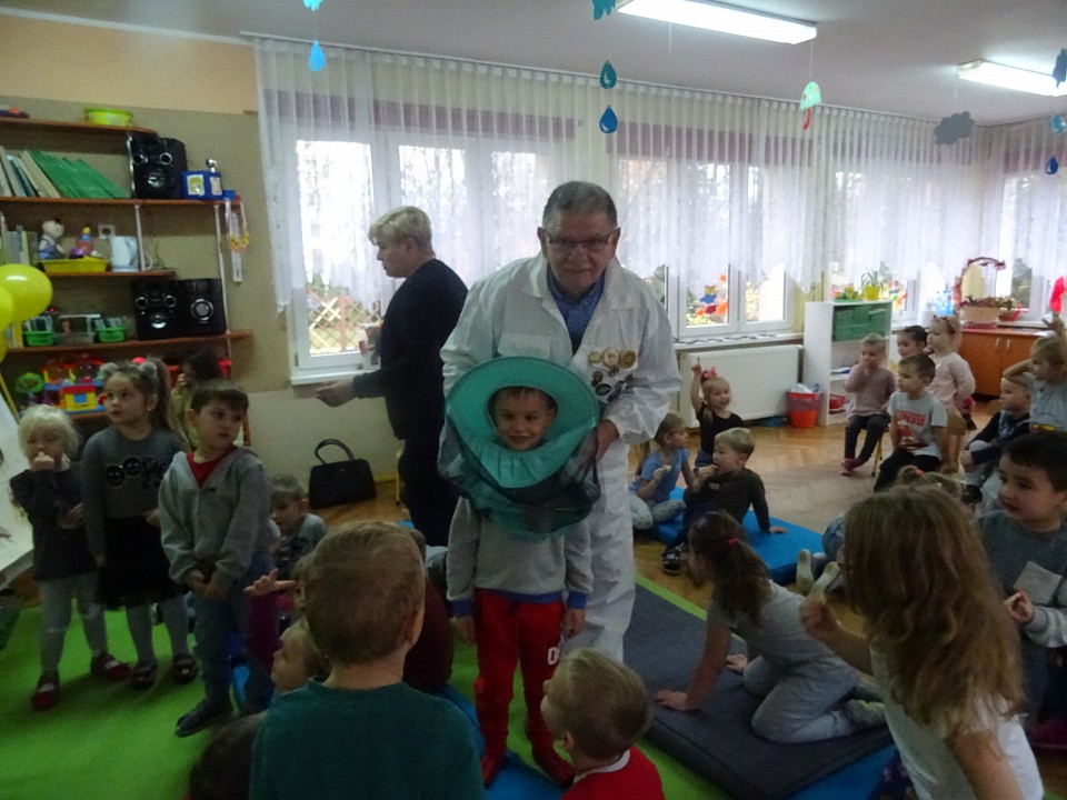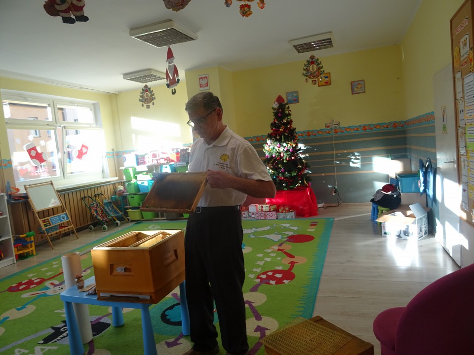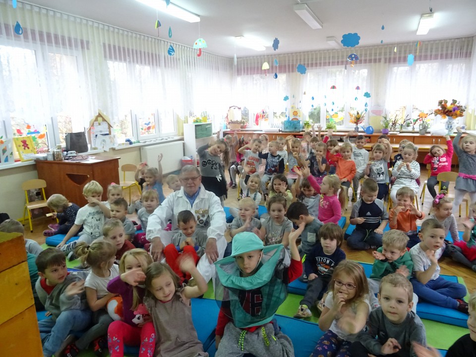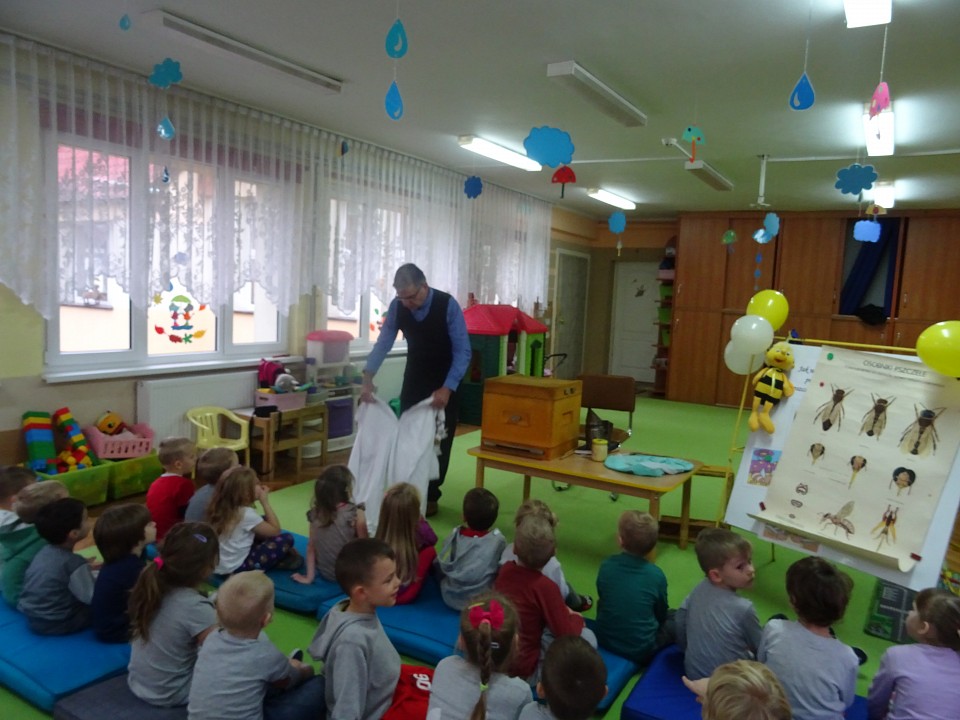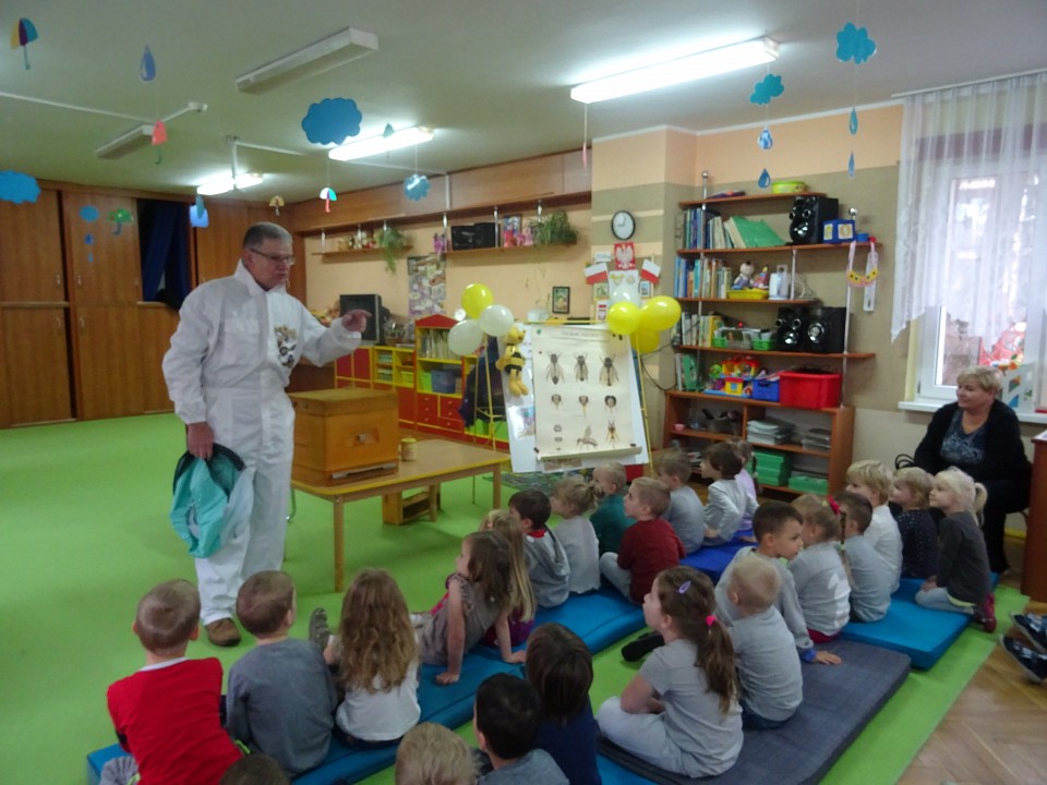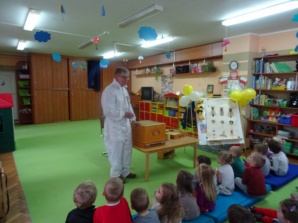 W środę 21 listopada BIEDRONKI, PSZCZÓŁKI i KOTKI, a kilka dni później MISIAKI, SŁONECZKA, KRASNOLUDKI i ŻABKI odwiedził Pan Pszczelarz Jan Przychoda.Opowiadał dzieciom o życiu i zwyczajach pszczół, wykonywanej przez nich pracy oraz znaczeniu w przyrodzie. Dzieci mogły z bliska obejrzeć przyrządy pszczelarza - kombinezon pszczelarski, ramkę na której pszczoły składają miód, dymkę, transportówkę oraz produkty wytworzone przez pszczoły - pyłek kwiatowy, kit pszczeli i posmakować miodu. Spotkanie poszerzyło wiedzę dzieci na temat pszczelarstwa oraz umożliwiło kontakt z produktami stworzonymi przez naturę.