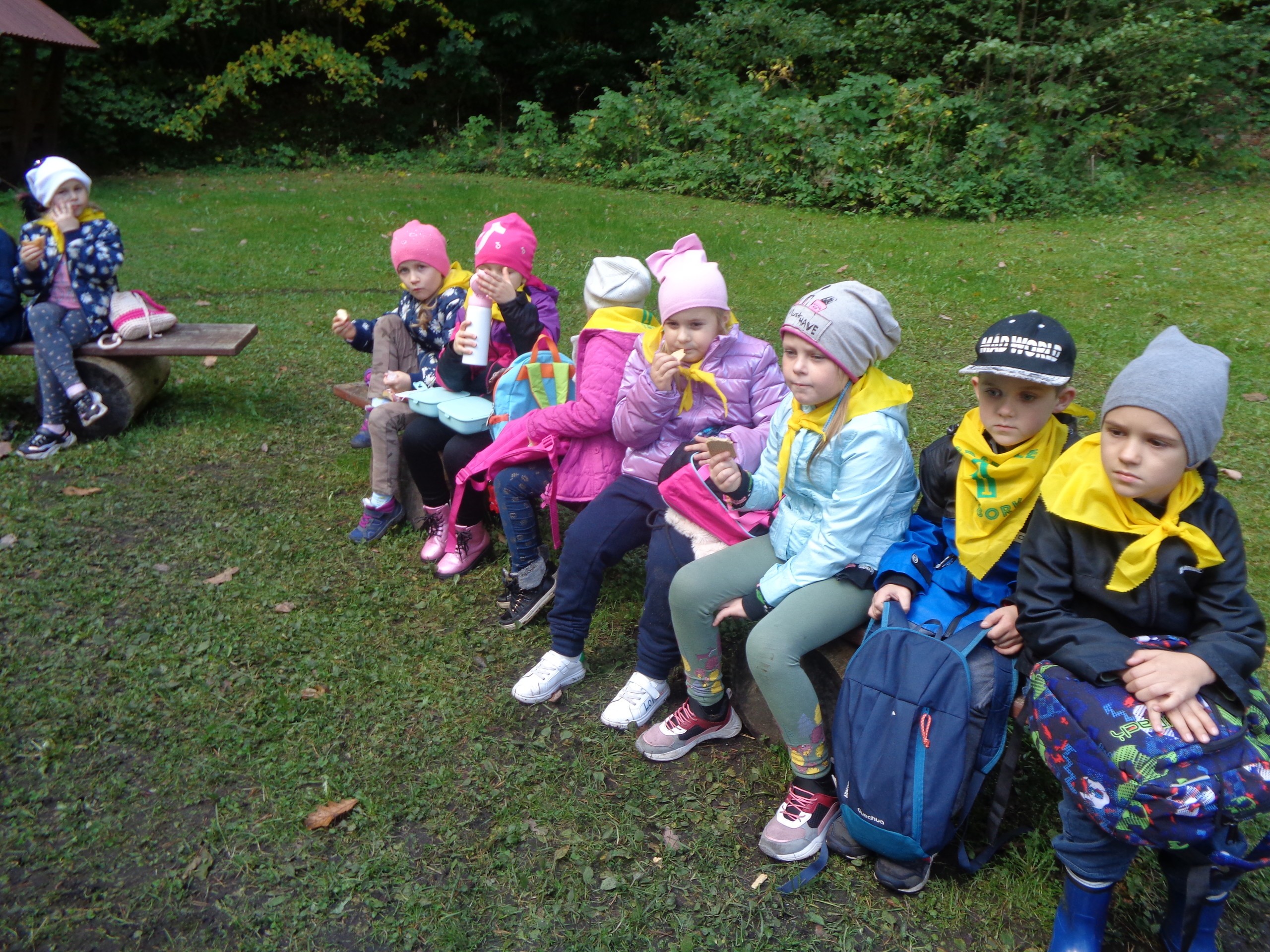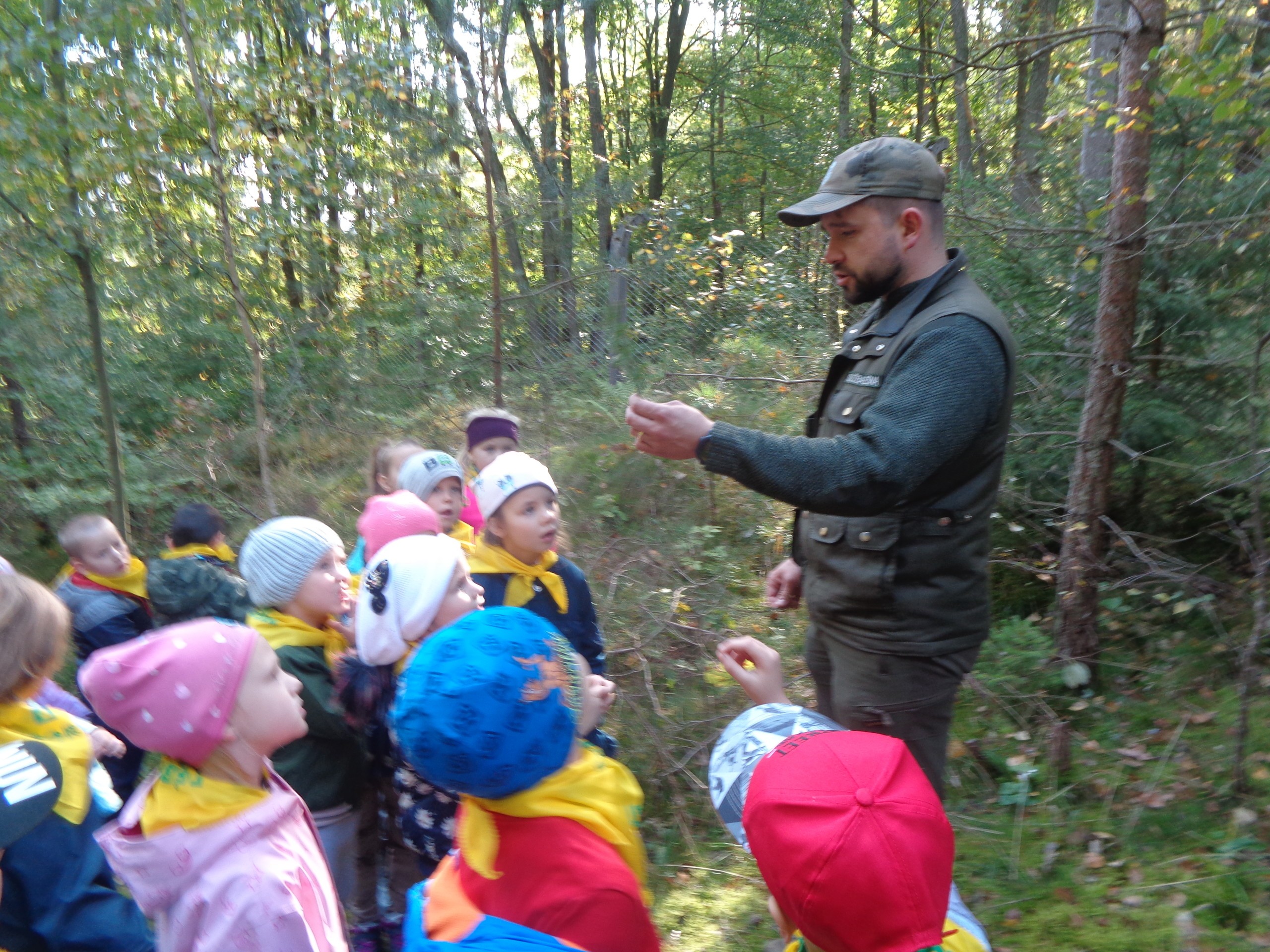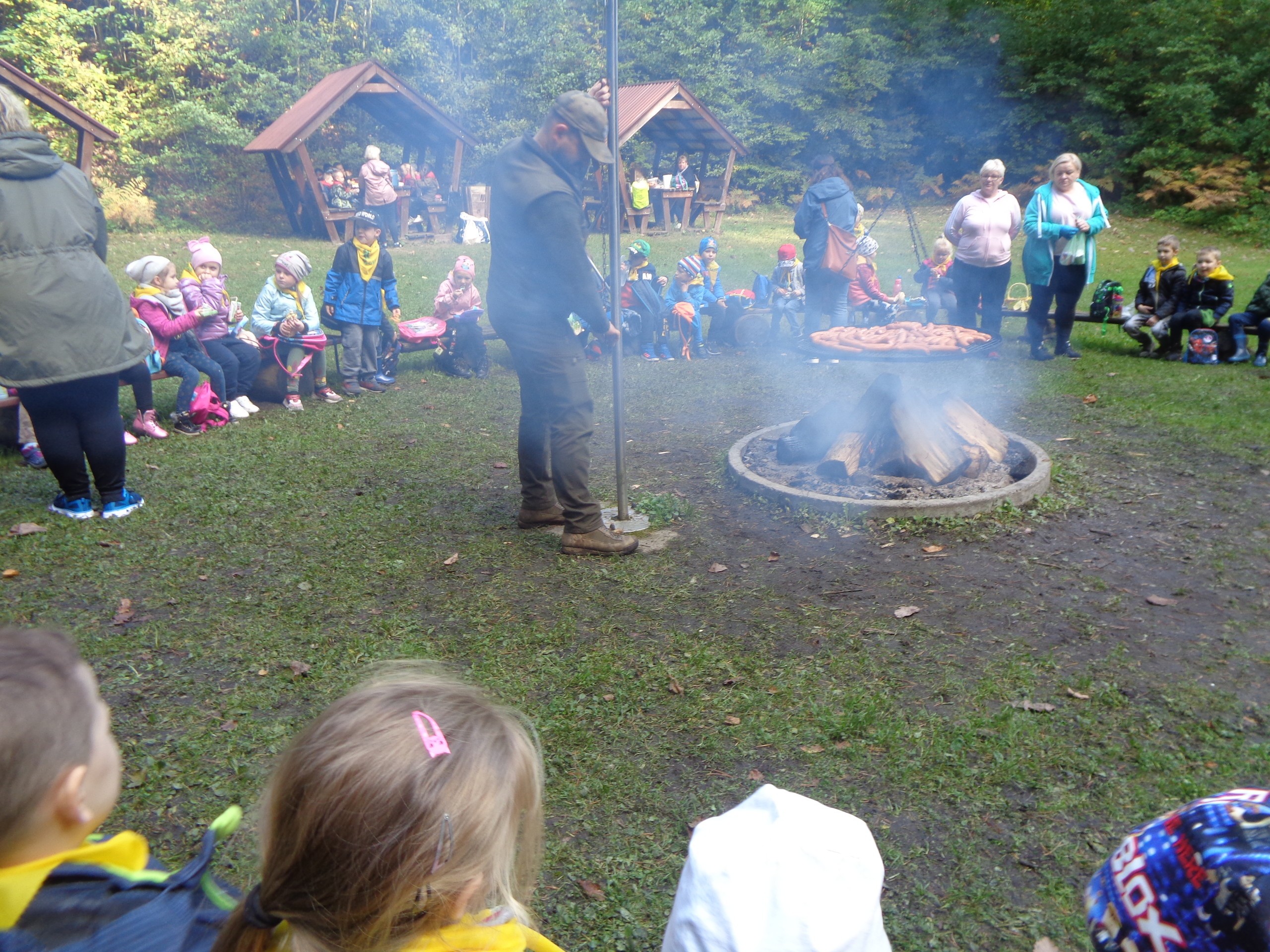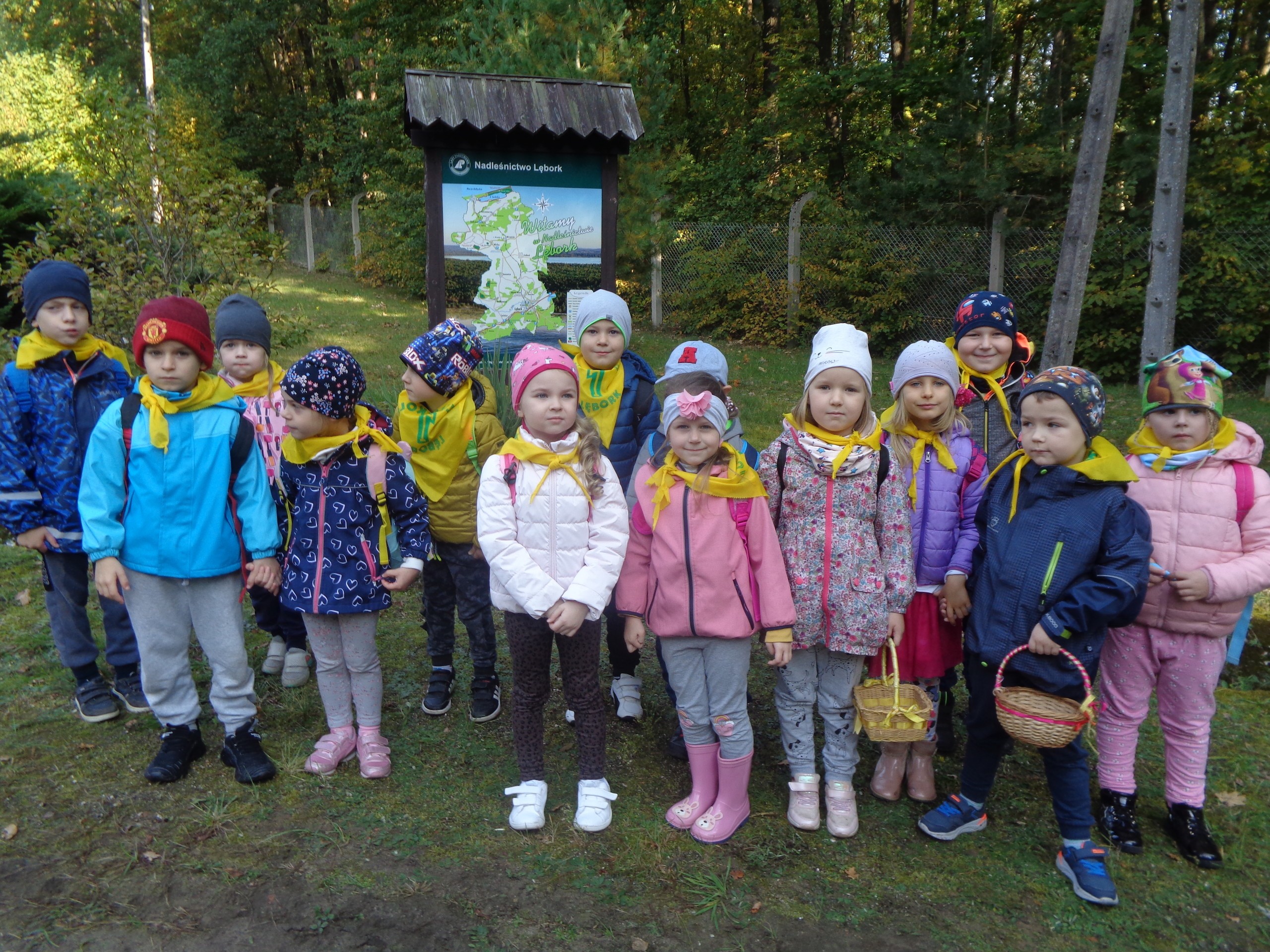Korzystając z pięknej jesiennej pogody, dzieci z grup 5-6 letnich wybrały się na wycieczkę do lasu UROCZYSKO DRĘTOWO- jest to centrum edukacji przyrodniczo -leśnej Nadleśnictwa Lębork. Na miejscu przedszkolaków przywitali pracownicy Nadleśnictwa Lębork, którzy opowiadali o swoim podstawowym obowiązku, jakim jest dbanie o las. Przypomnieli dzieciom jak należy zachowywać się w lesie. Wiele radości sprawiły dzieciom wędrówki po ścieżce edukacyjnej. Dzieci z zainteresowaniem obserwowały otaczającą przyrodę oraz gromadziły do koszyczków dary lasu. Wycieczkę zakończył wspólny piknik- ognisko oraz pieczenie kiełbasek.