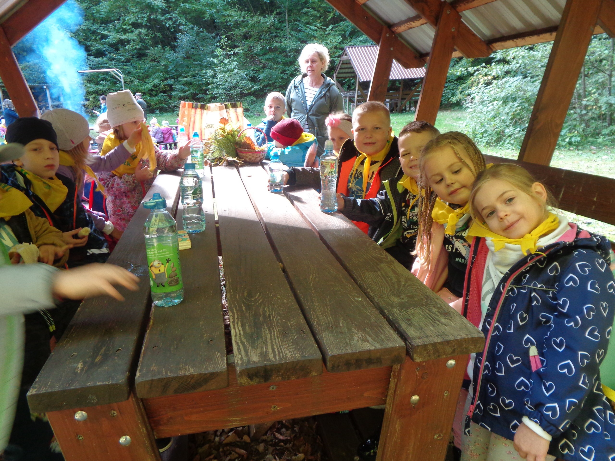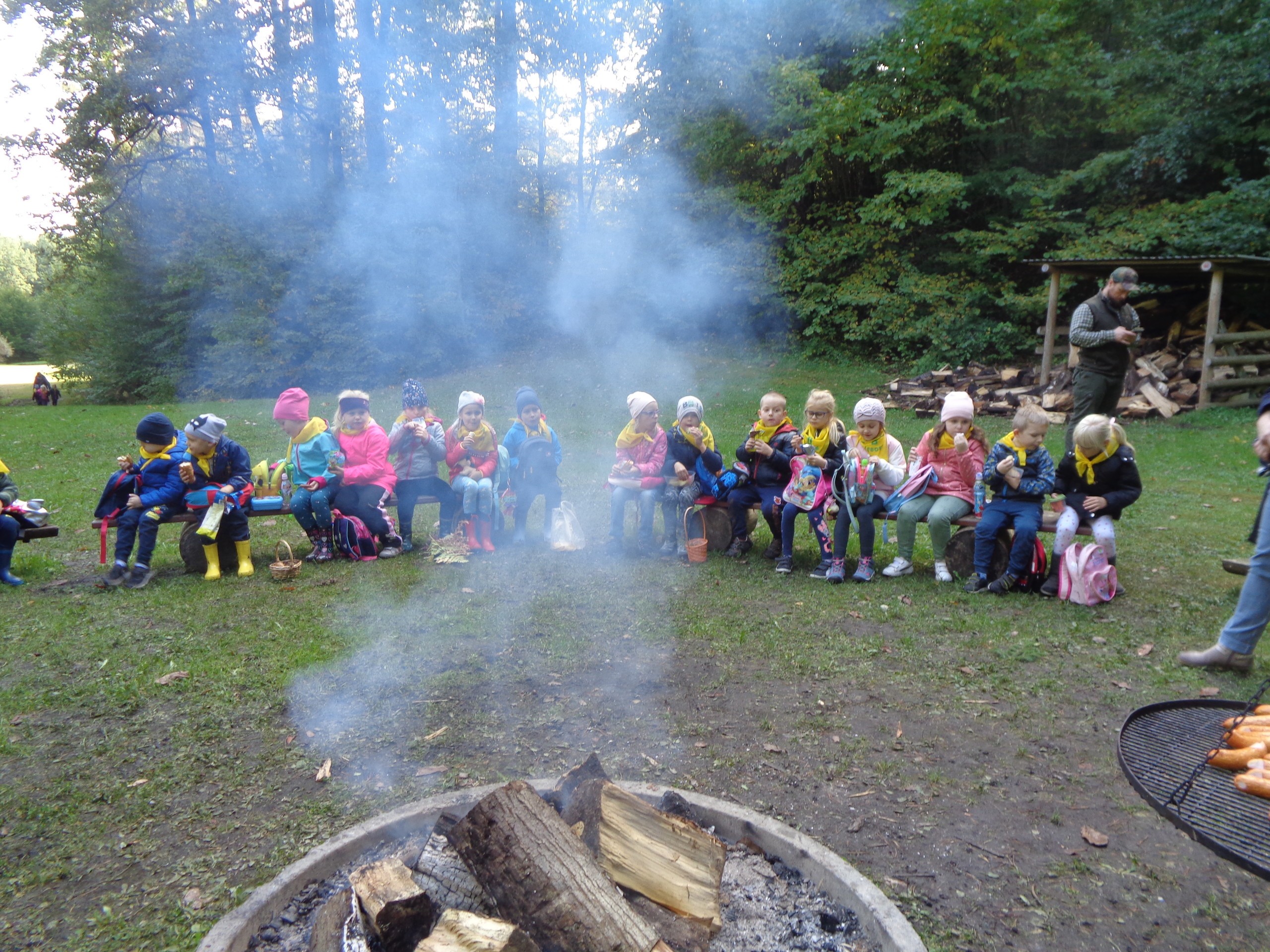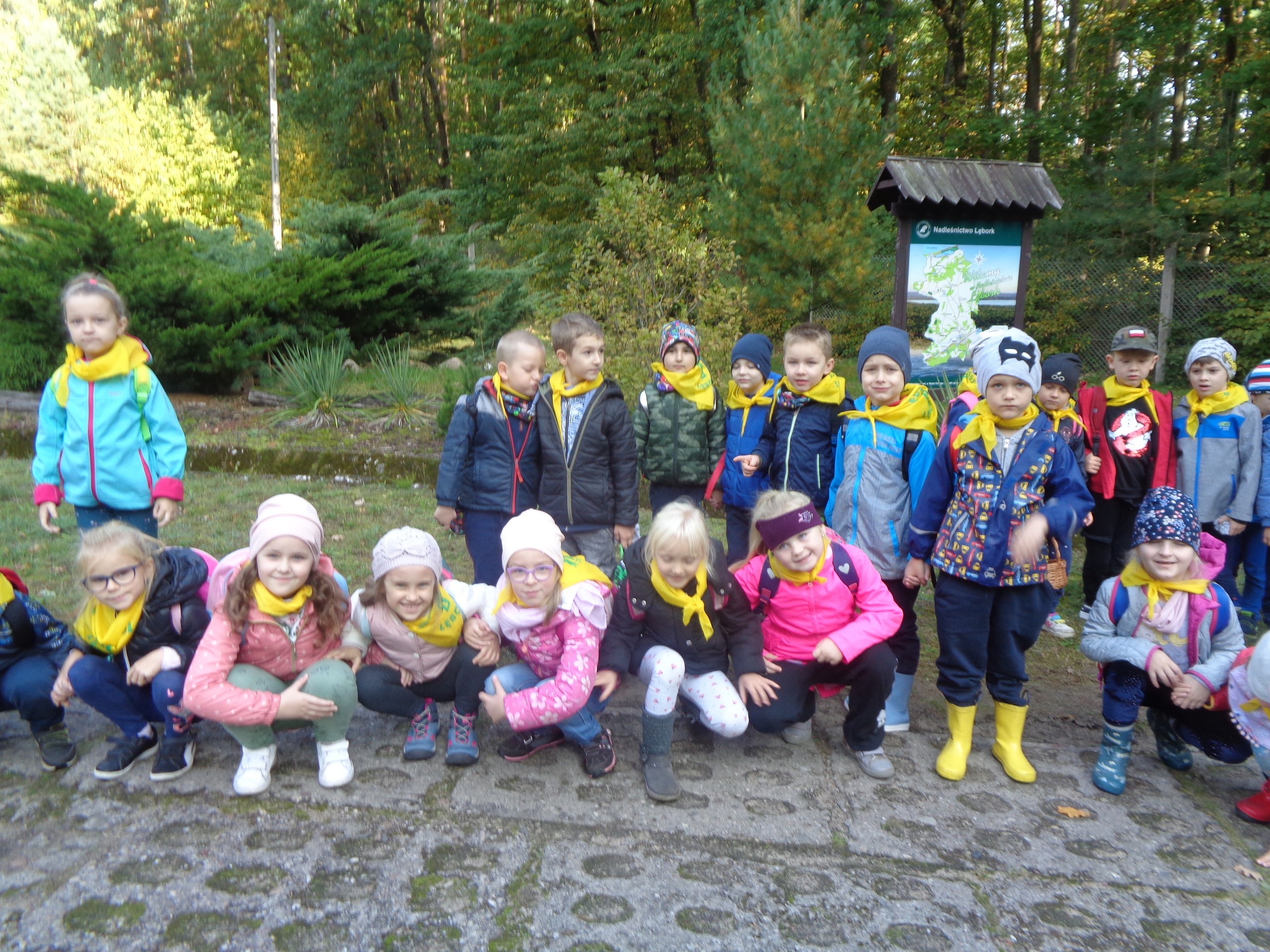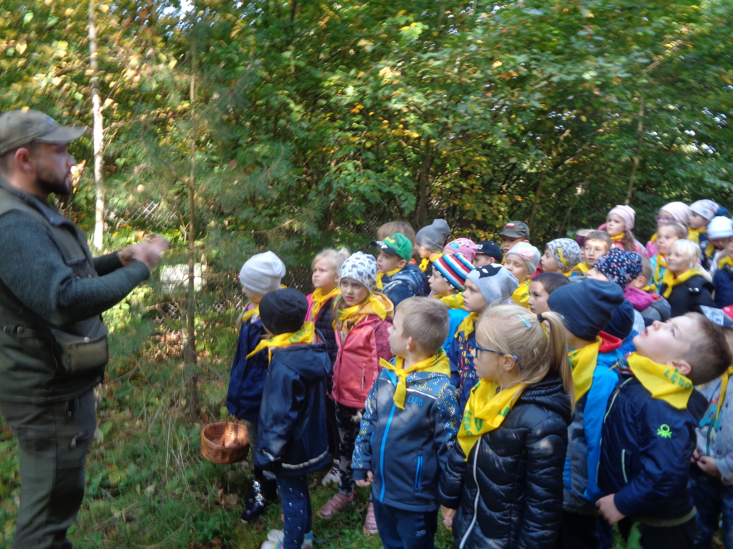 Korzystając z pięknej jesiennej pogody, dzieci z grup 5-6 letnich wybrały się na wycieczkę do lasu UROCZYSKO DRĘTOWO- jest to centrum edukacji przyrodniczo -leśnej Nadleśnictwa Lębork. Na miejscu przedszkolaków przywitali pracownicy Nadleśnictwa Lębork, którzy opowiadali o swoim podstawowym obowiązku, jakim jest dbanie o las. Przypomnieli dzieciom jak należy zachowywać się w lesie. Wiele radości sprawiły dzieciom wędrówki po ścieżce edukacyjnej. Dzieci z zainteresowaniem obserwowały otaczającą przyrodę oraz gromadziły do koszyczków dary lasu. Wycieczkę zakończył wspólny piknik- ognisko oraz pieczenie kiełbasek.