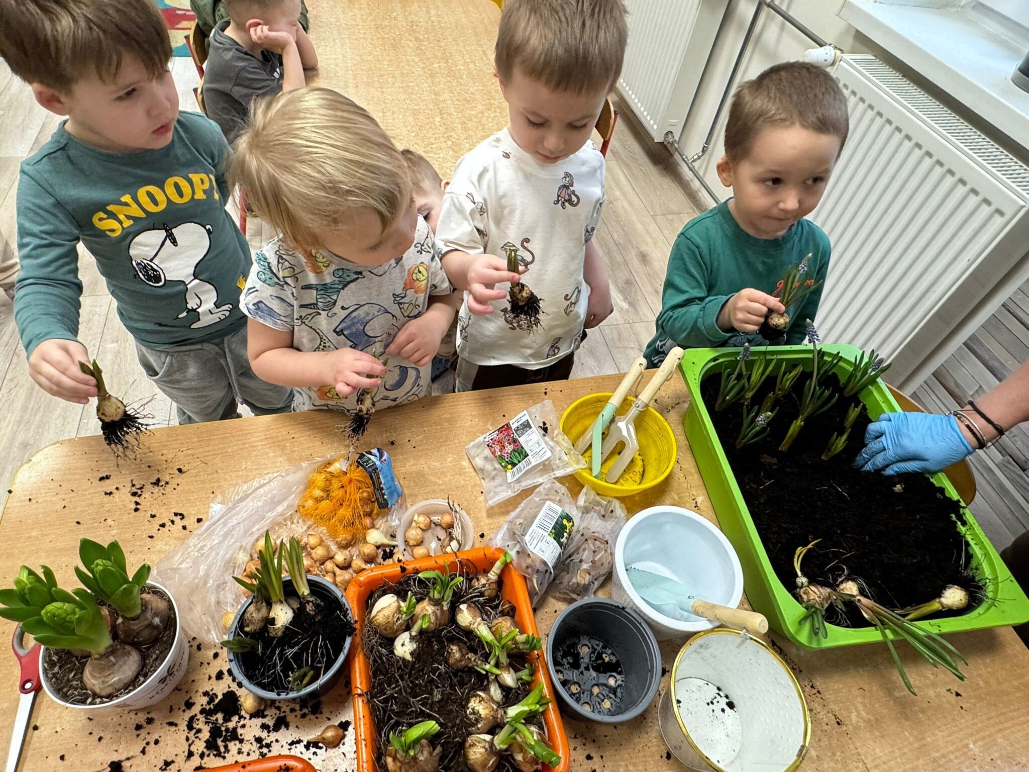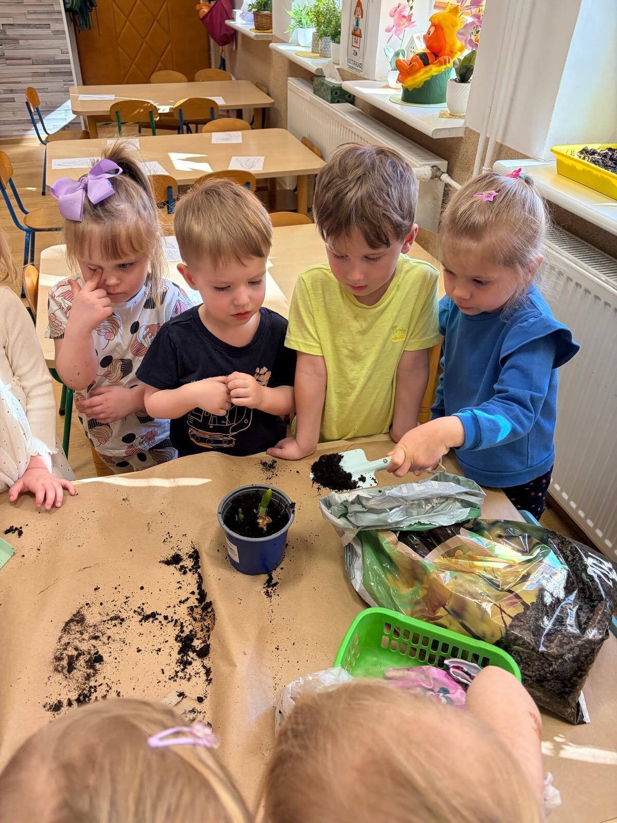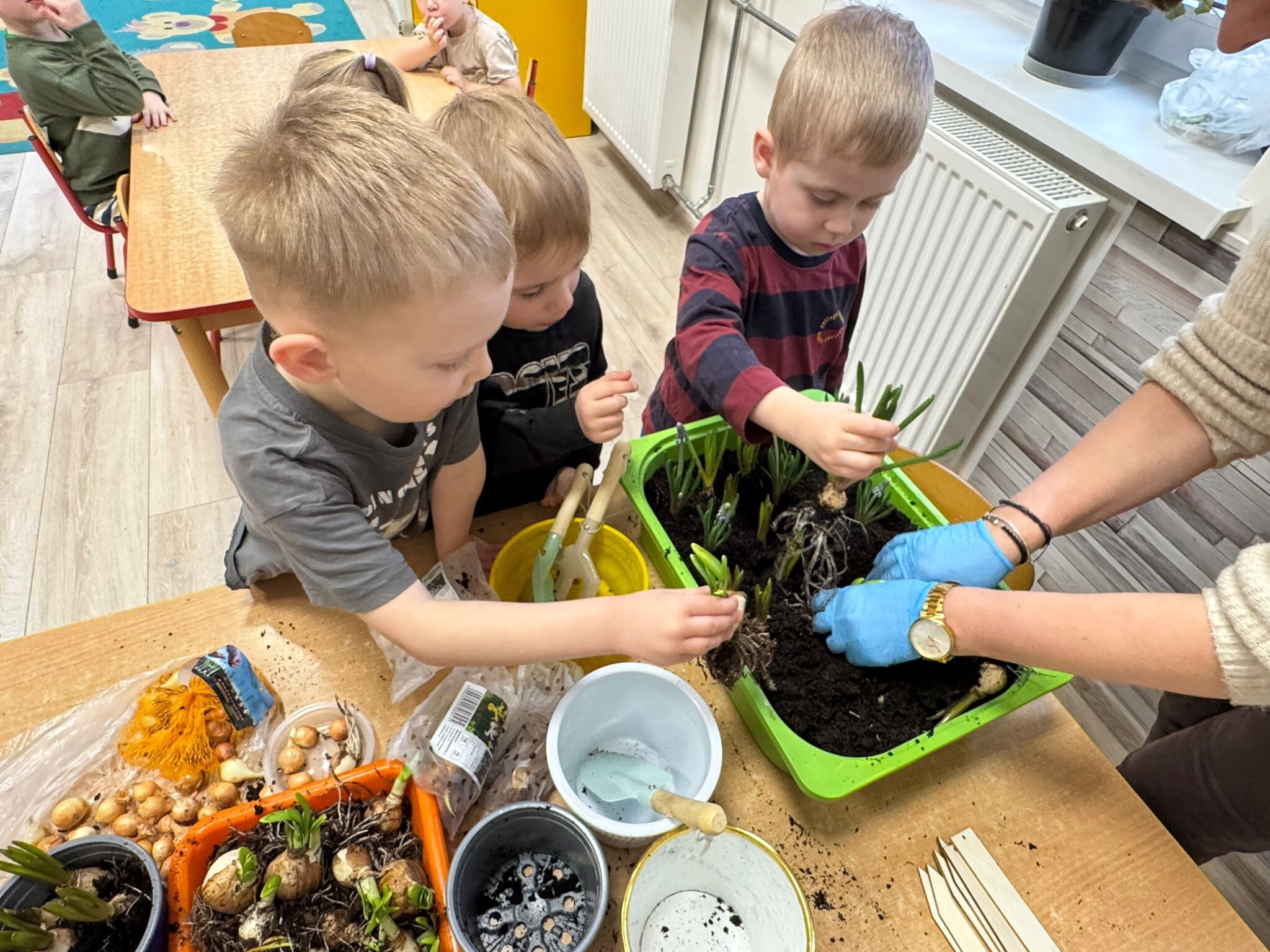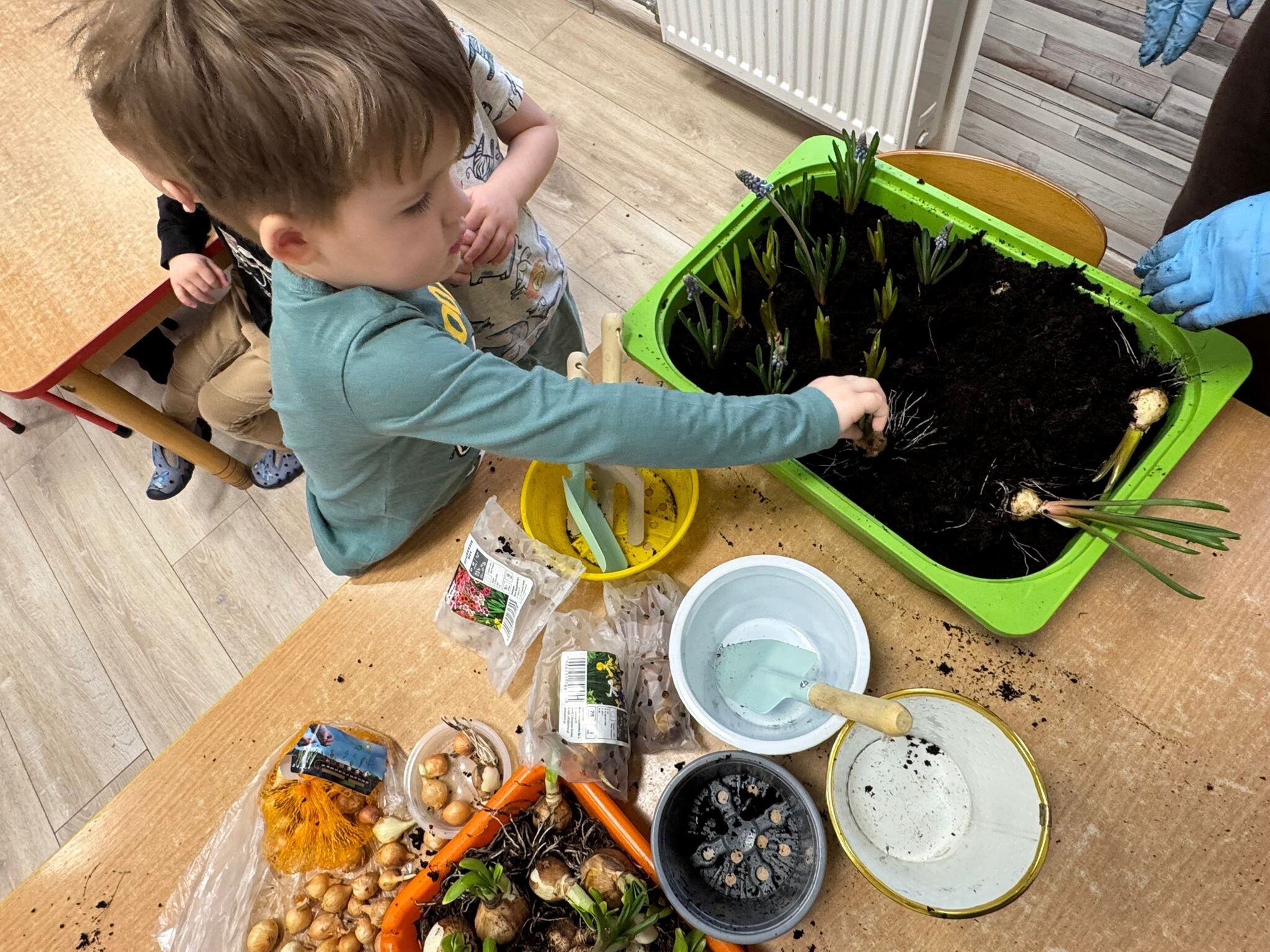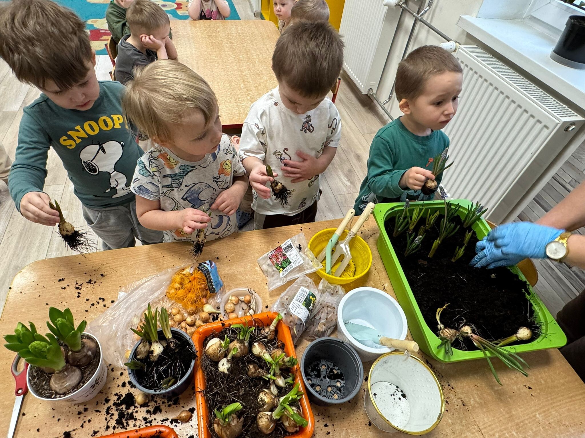 Dzieci z naszego przedszkola z wielkim zaangażowaniem założyły w salach wiosenne ogródki. Przedszkolaki samodzielnie przygotowały doniczki, nasypały ziemię oraz posadziły nasiona i cebulki roślin. Podczas zajęć dzieci dowiedziały się, czego potrzebują rośliny do wzrostu oraz jak należy o nie dbać.