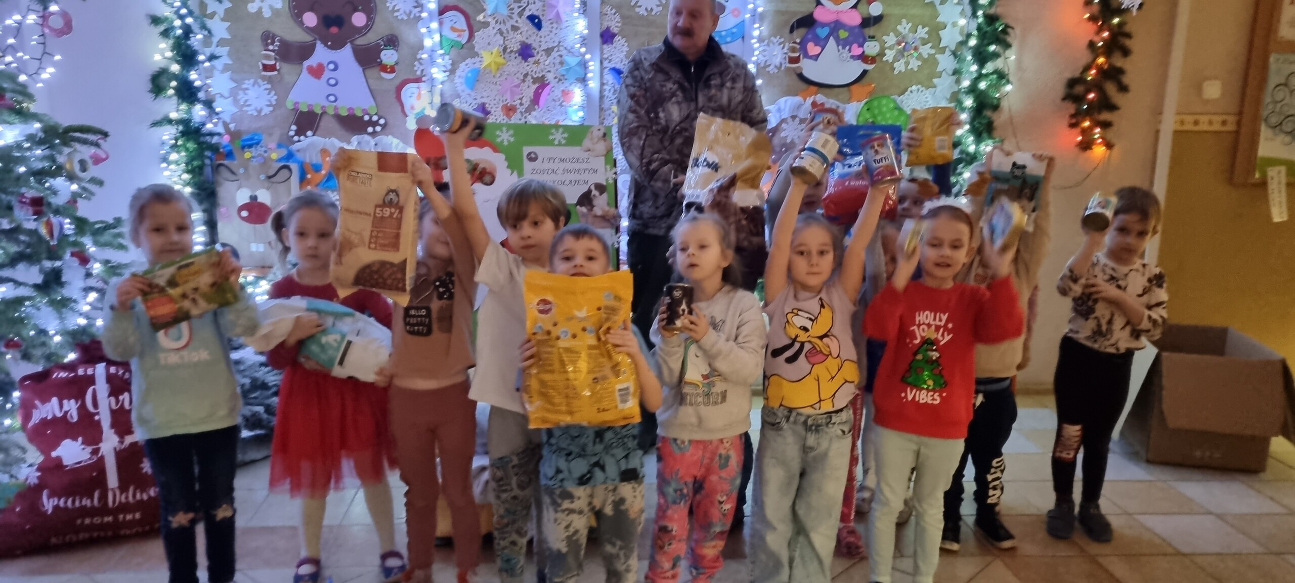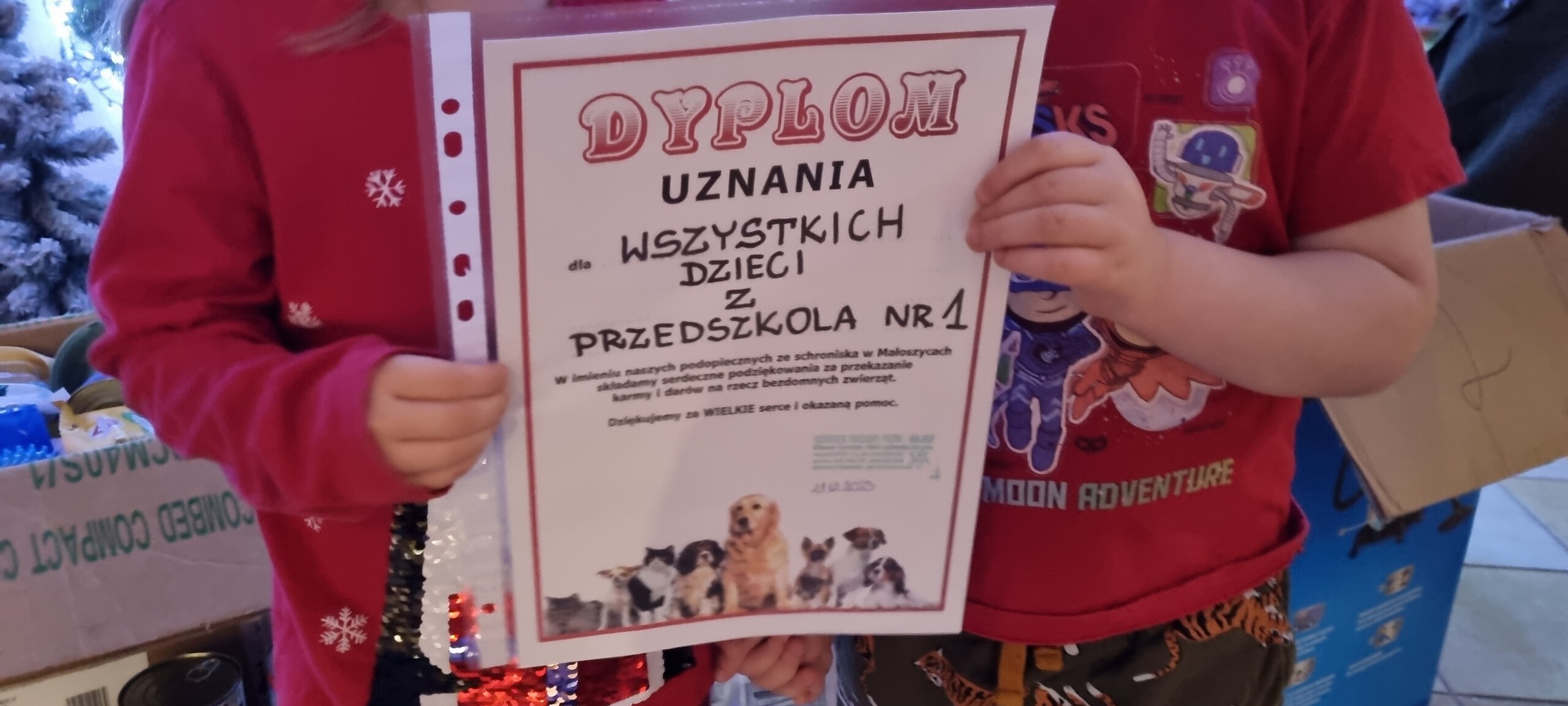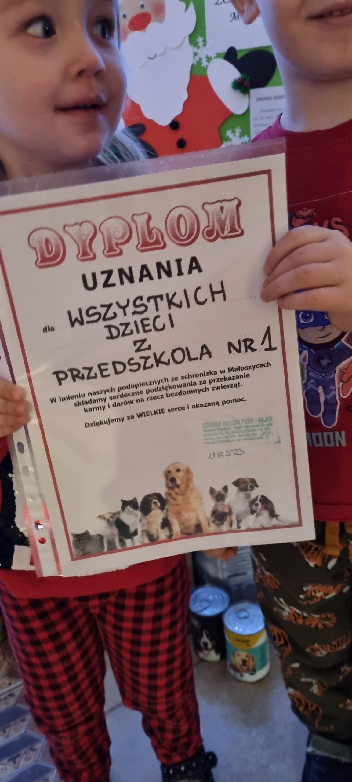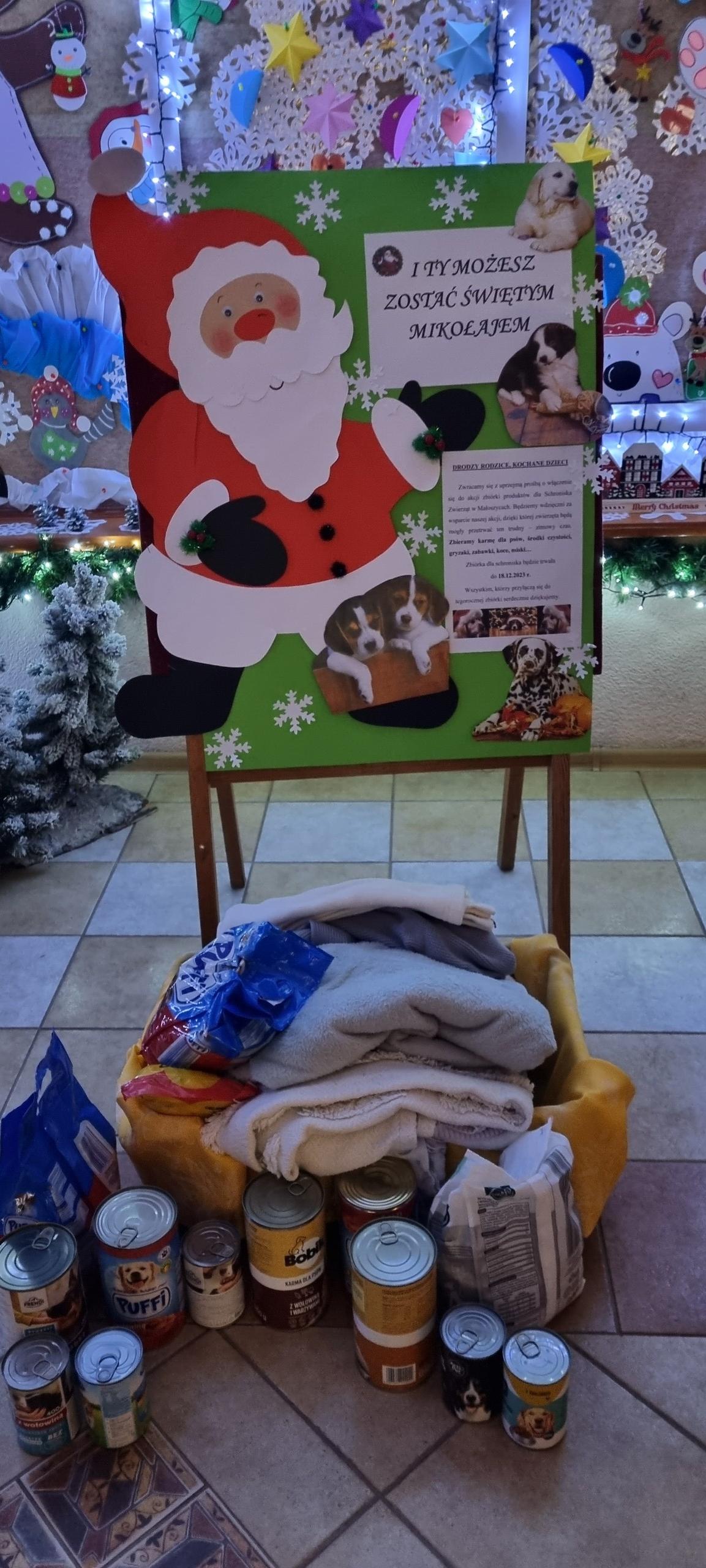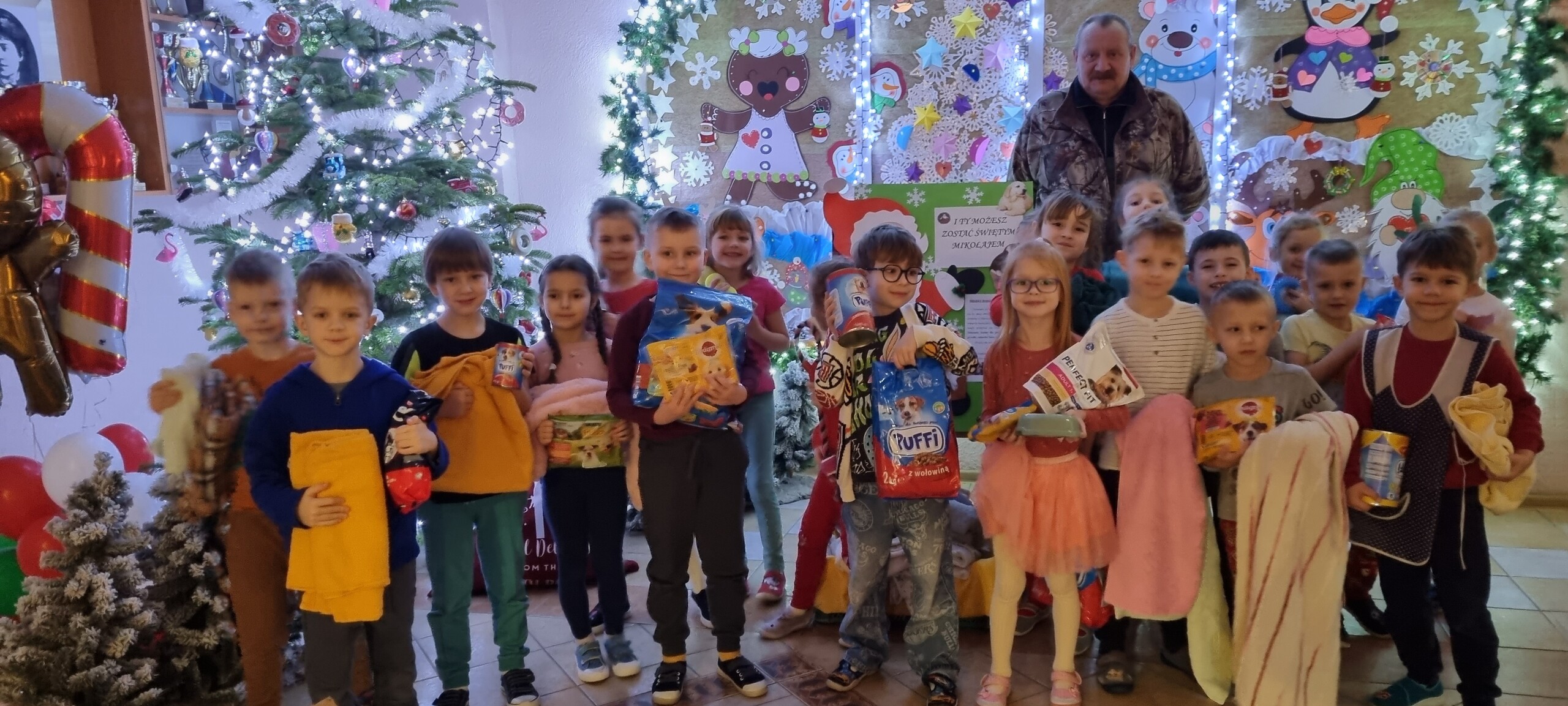 Tuż przed Świętami Bożego Narodzenia w naszym przedszkolu odbyło się zakończenie akcji charytatywnej ,, I TY MOŻESZ ZOSTAĆ ŚWIĘTYM MIKOŁAJEM '' na rzecz bezdomnych zwierząt, podopiecznych ze schroniska w Małoszycach. Dzięki wrażliwości i zaangażowaniu dzieci, rodziców i personelu przedszkolnego udało się zebrać dużą ilość mokrej i suchej karmy, zabawki, gryzaki , a nawet cieplutkie kocyki. Wszystkie dary zostały przekazane przedstawicielowi schroniska Panu Sławomirowi Twardziak . Uczestnicy zaś za okazanie ogromnego serca czworonożnym przyjaciołom i zaangażowanie, otrzymali pamiątkowy dyplom i wyrazy podziękowania.